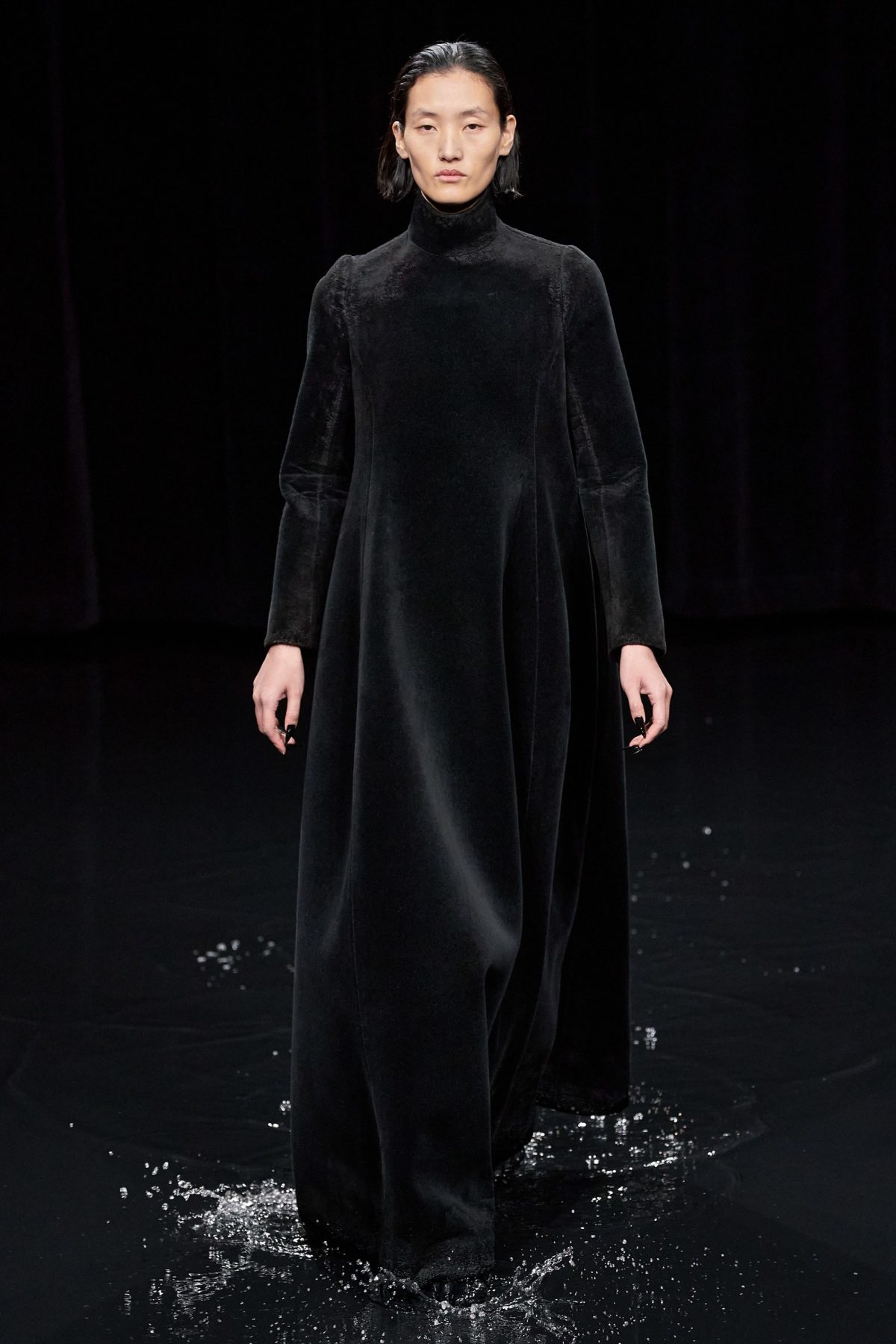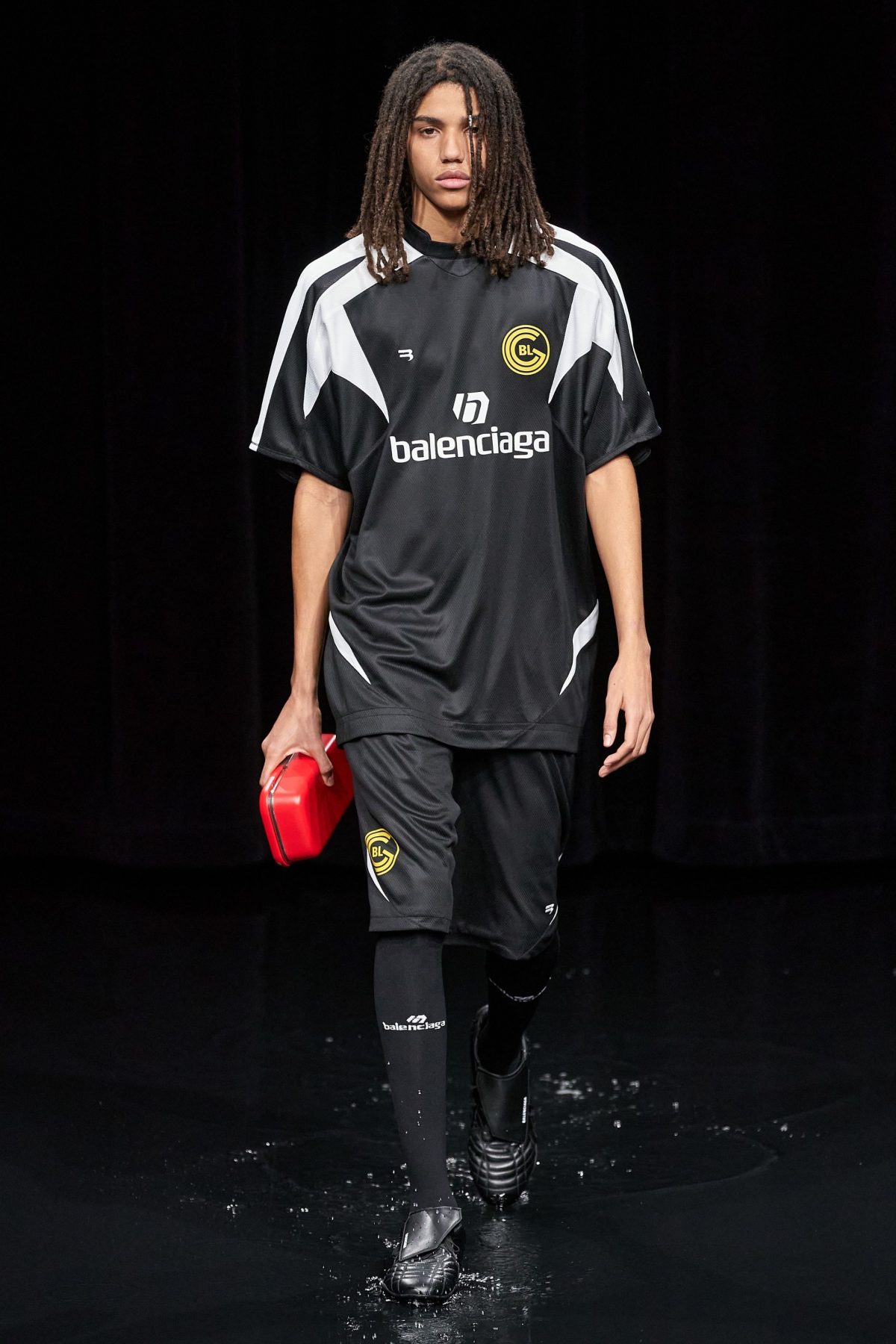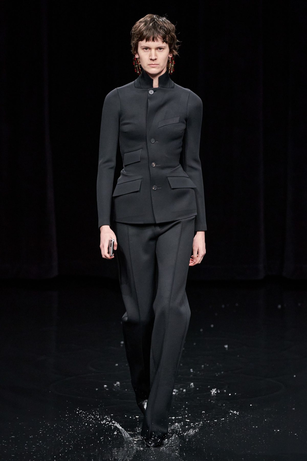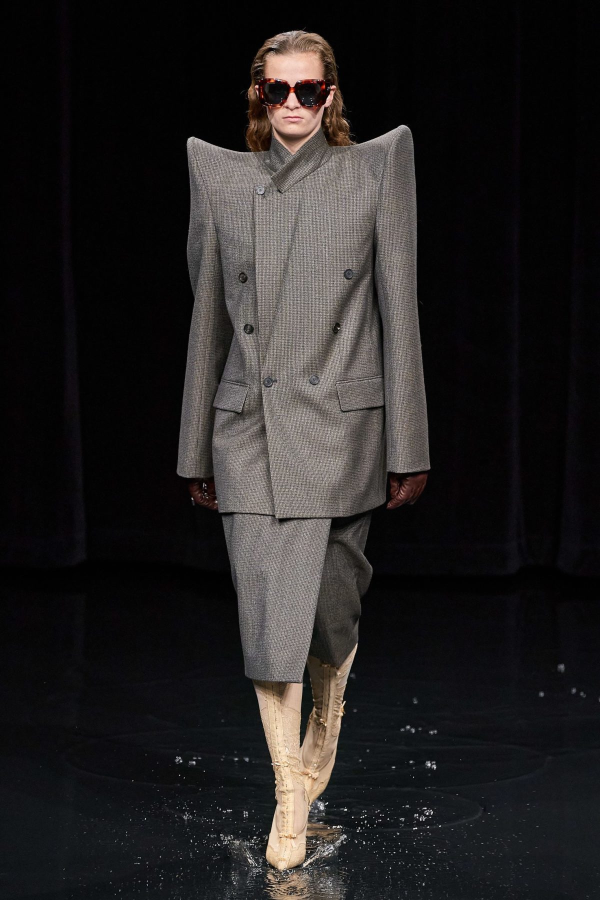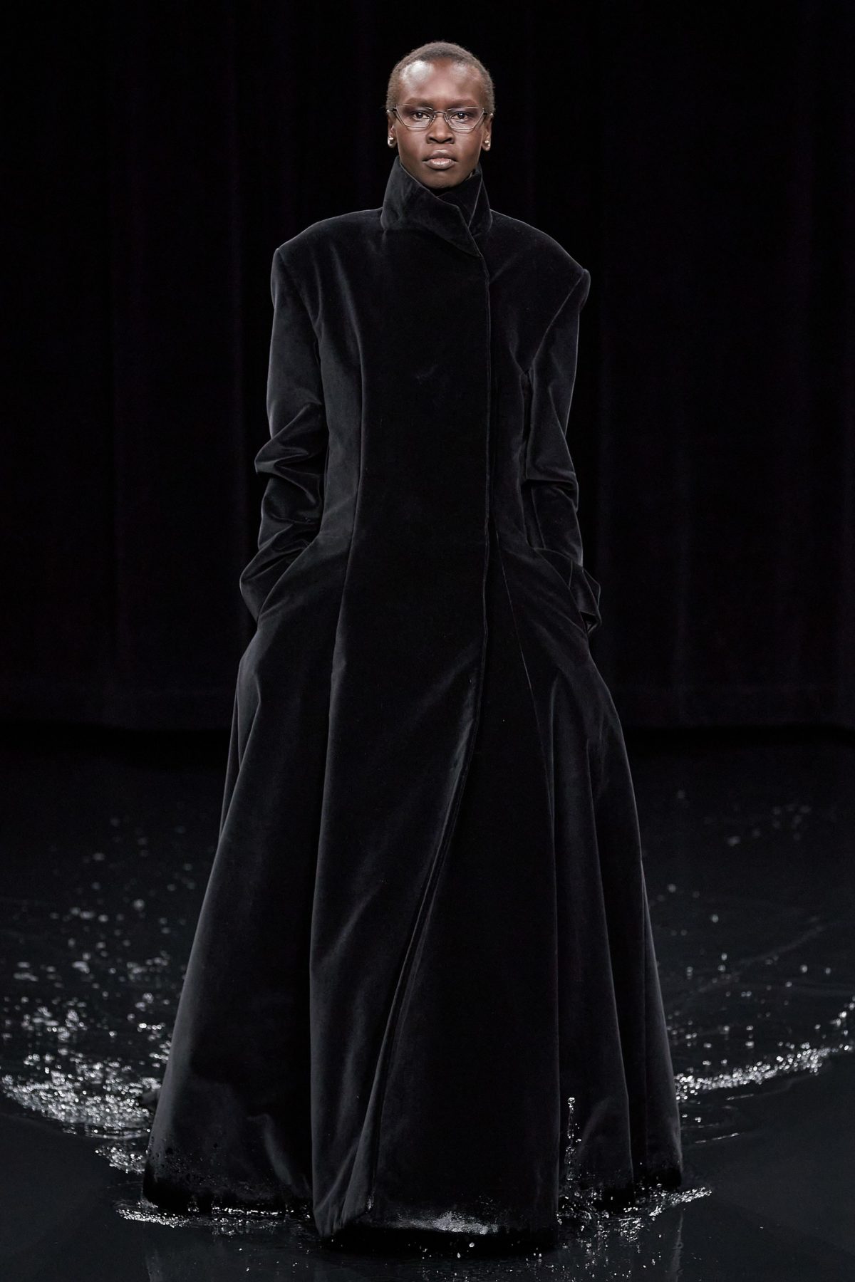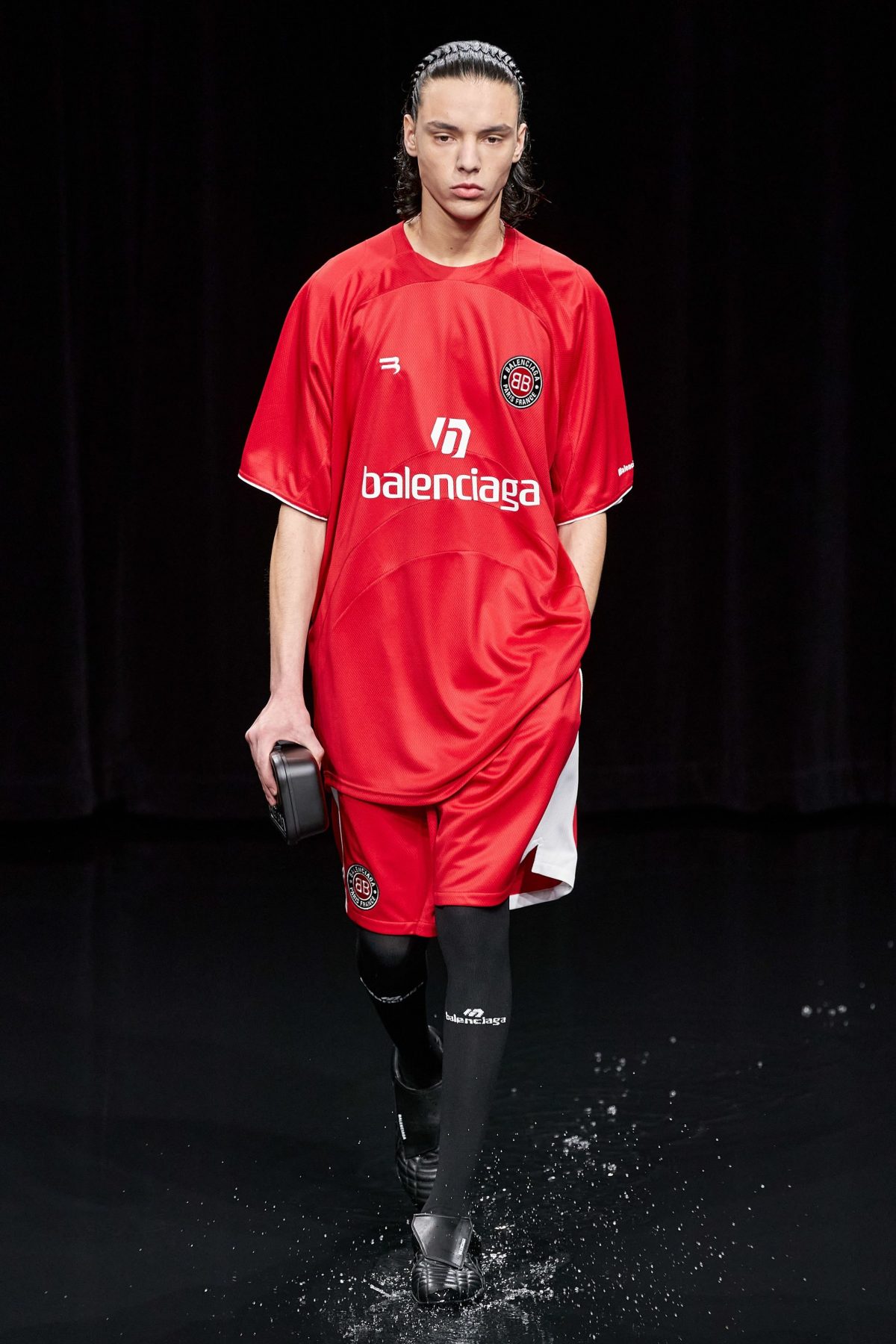 Set in a vast, almost pitch-black auditorium was an immense pool of water disguising the runway, with digital screens above depicting a hellish sky that flashed with lightening, red clouds, satellite shots of Earth, and then finally, a total eclipse. “It’s the blackest show I ever did,” said designer Demna Gvasalia.