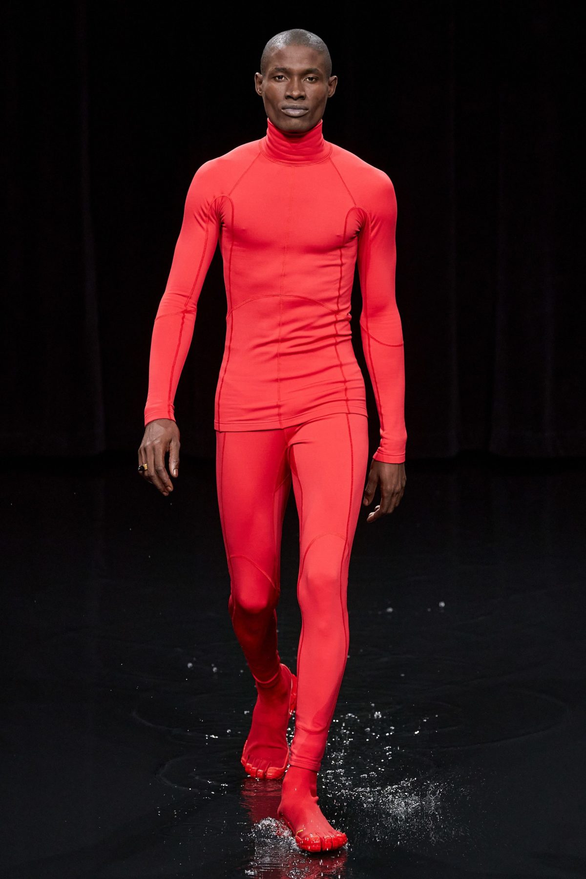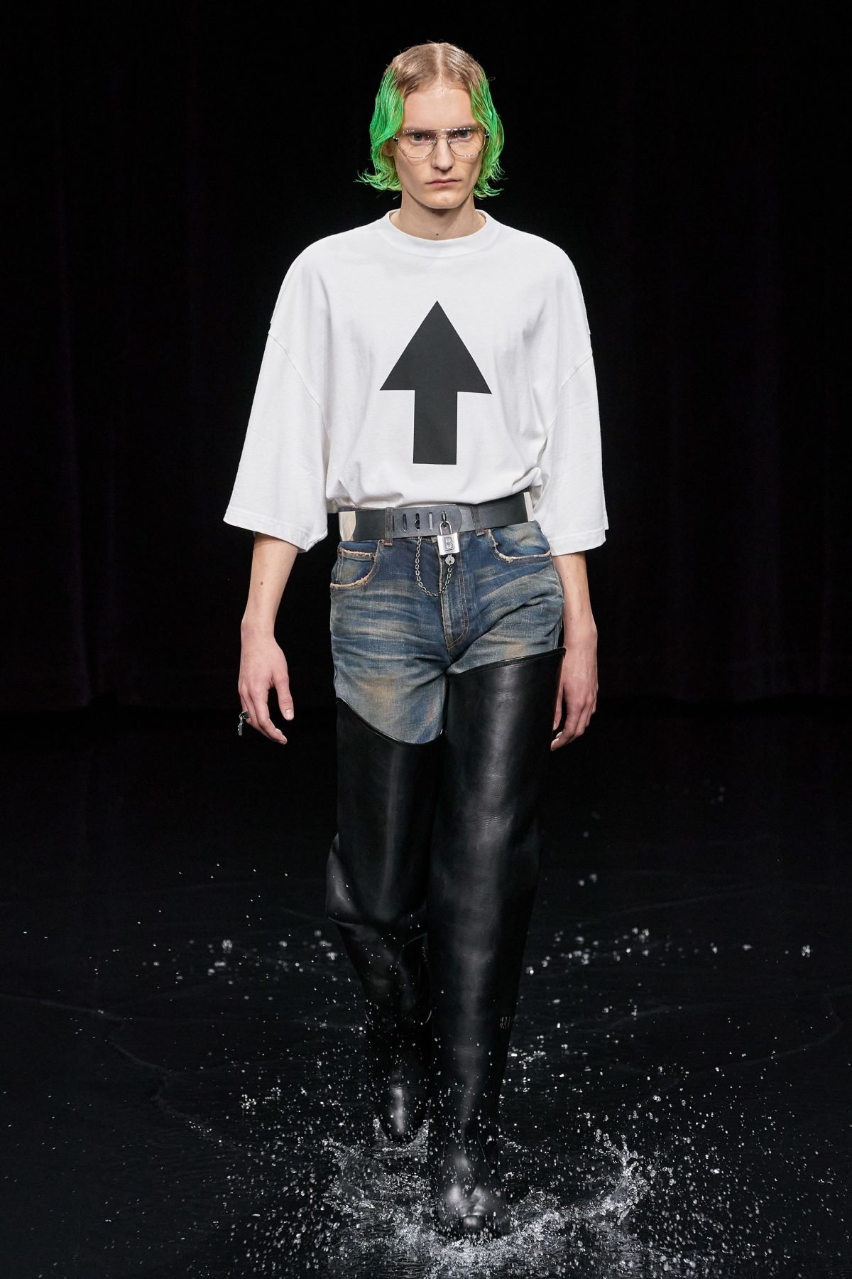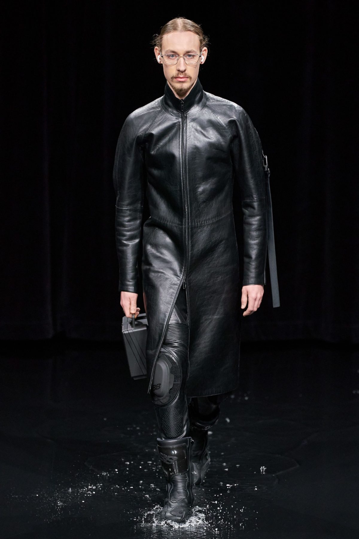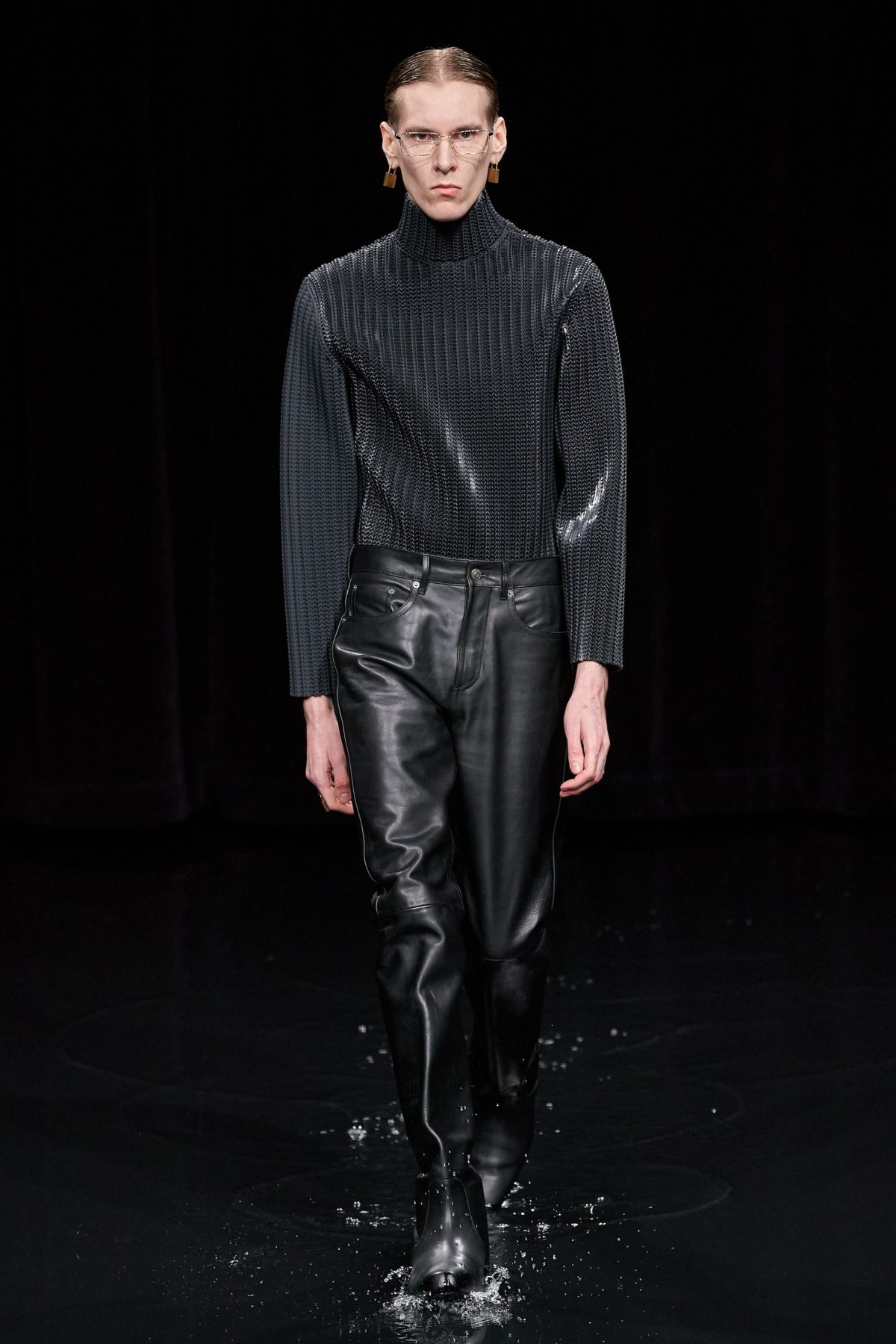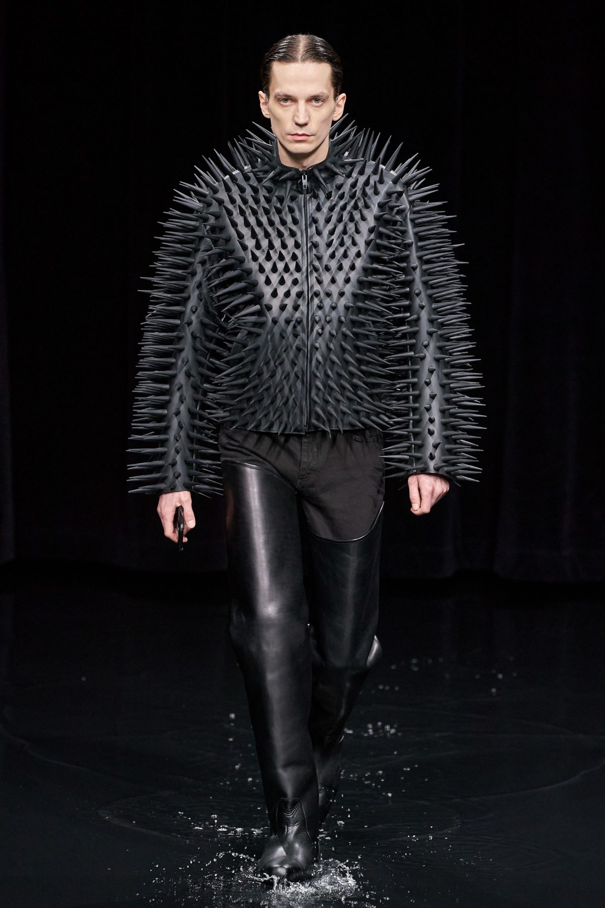 Set in a vast, almost pitch-black auditorium was an immense pool of water disguising the runway, with digital screens above depicting a hellish sky that flashed with lightening, red clouds, satellite shots of Earth, and then finally, a total eclipse. “It’s the blackest show I ever did,” said designer Demna Gvasalia.