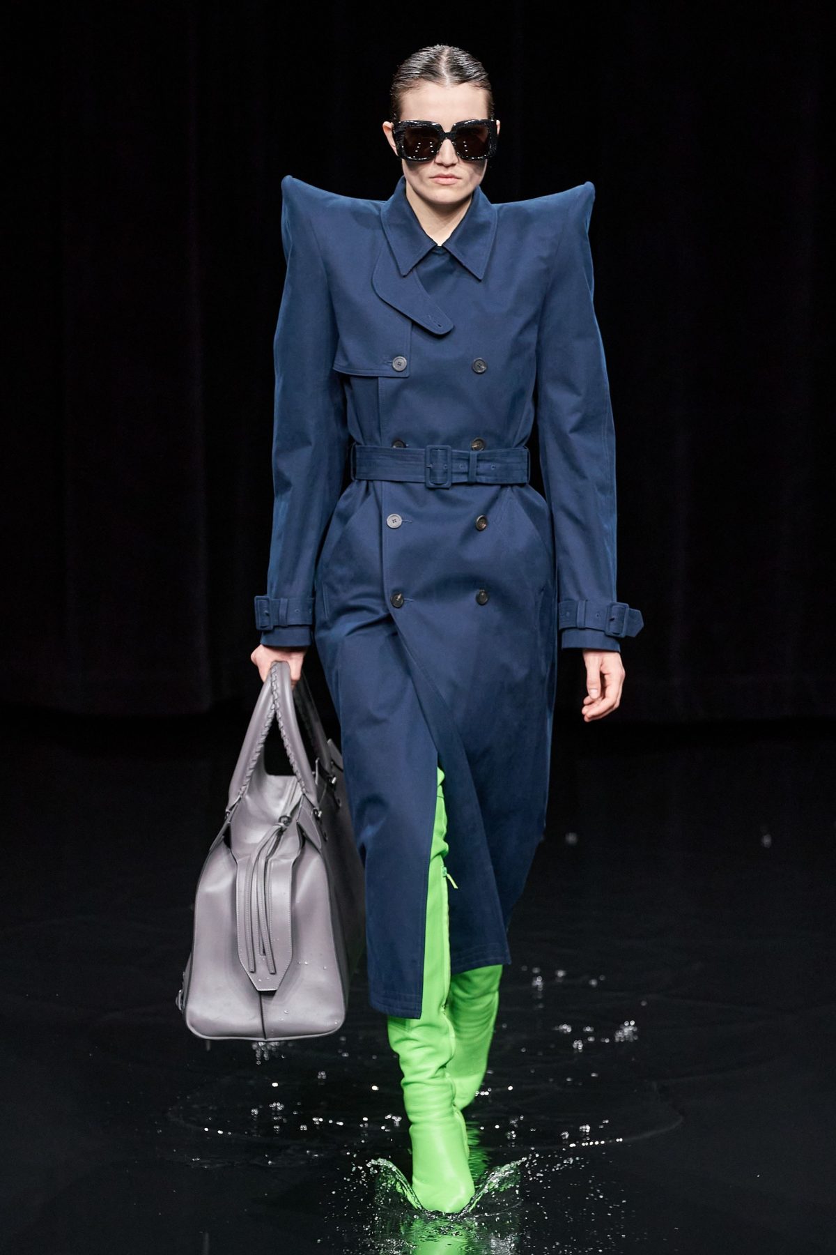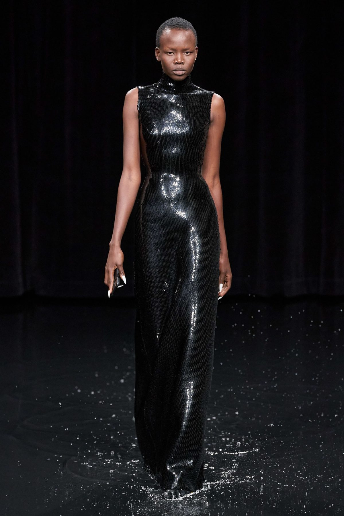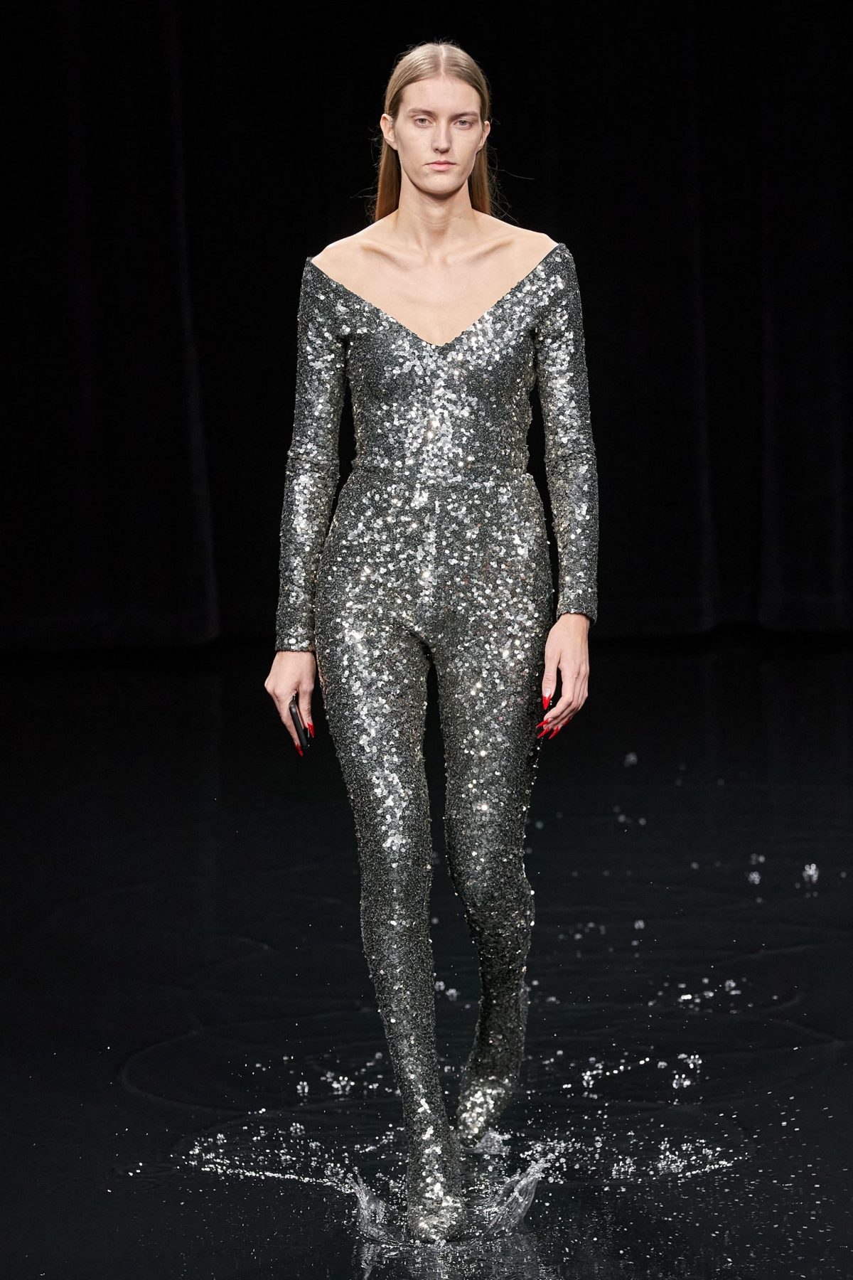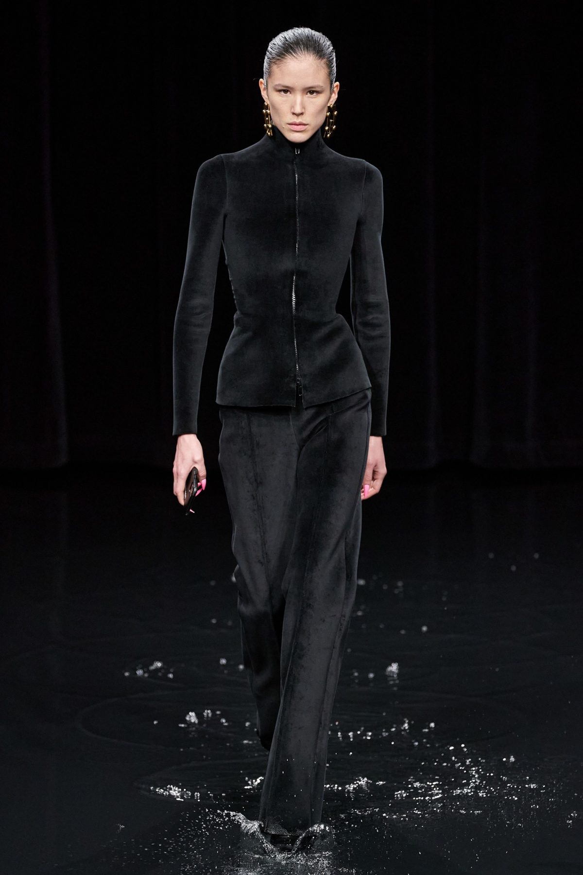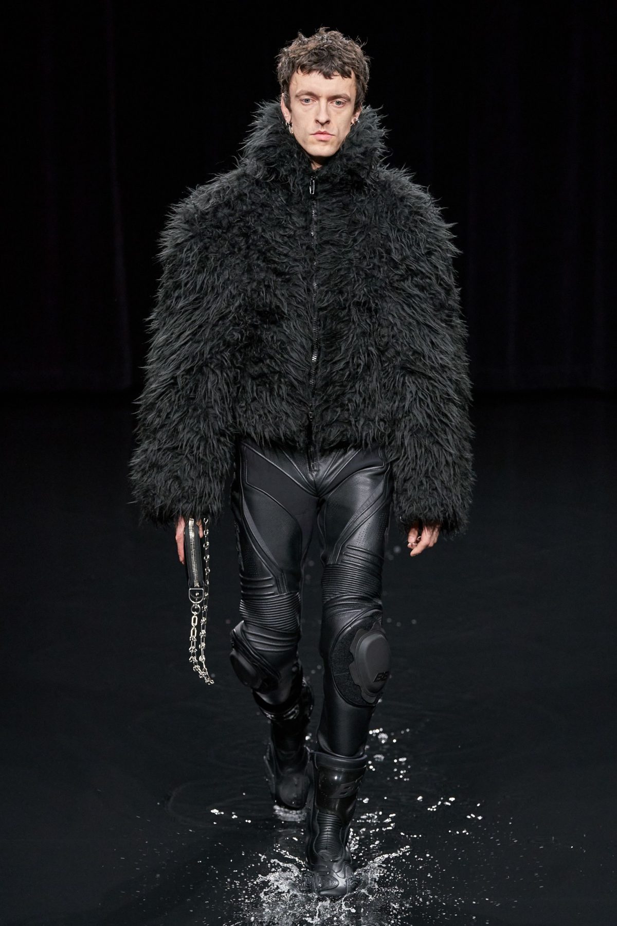 Set in a vast, almost pitch-black auditorium was an immense pool of water disguising the runway, with digital screens above depicting a hellish sky that flashed with lightening, red clouds, satellite shots of Earth, and then finally, a total eclipse. “It’s the blackest show I ever did,” said designer Demna Gvasalia.