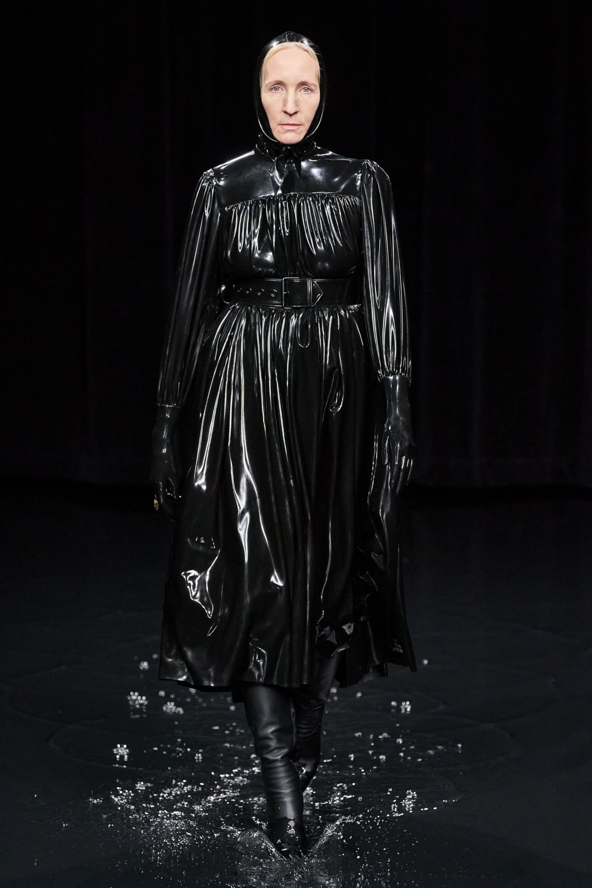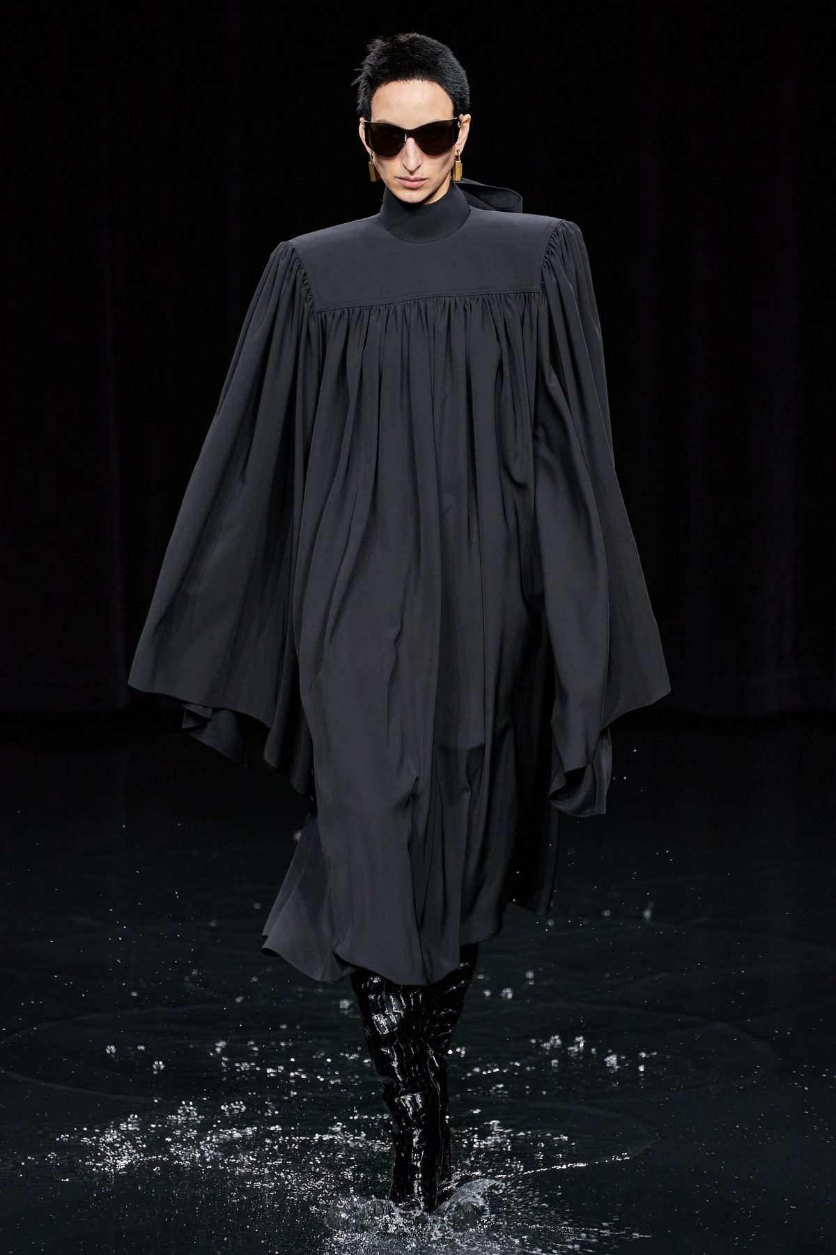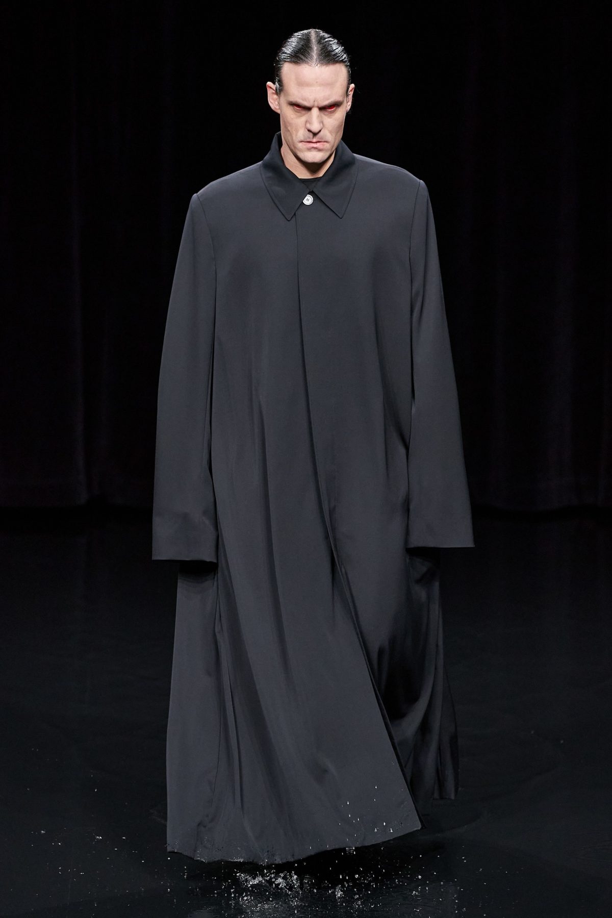This season, power dynamics shifted to the Church, commencing with an ominous classical soundtrack as models emerged in austere long black coats, splashing across the runway. “I had a lot of clerical wear in my research. I come from a country where the Orthodox religion has been so predominant,” Gvasalia said. “I went to Church to confess every Saturday. Back then, I remember looking at all these young priests and monks, wearing these long robes and thinking, ‘how beautiful.’”
