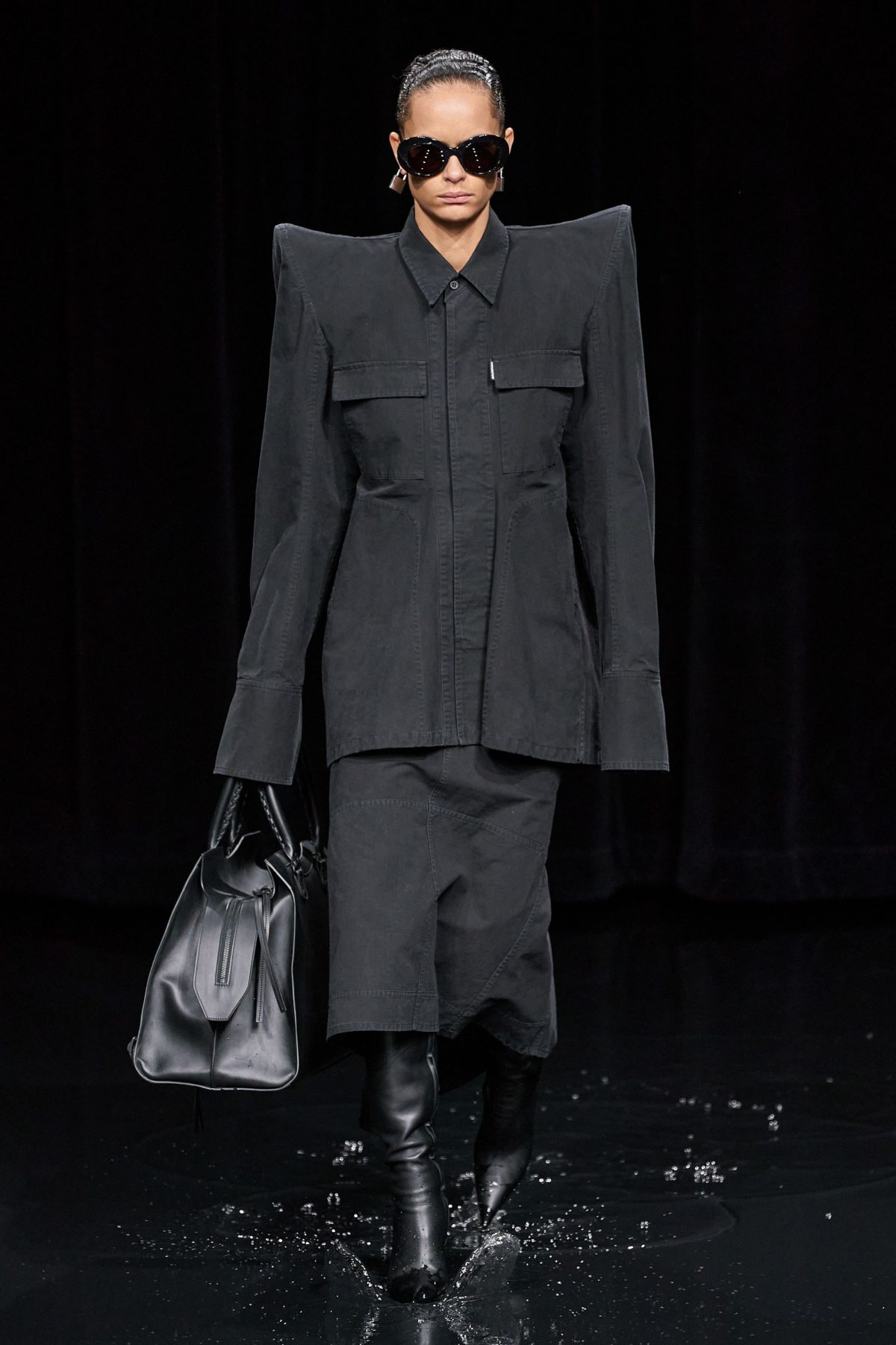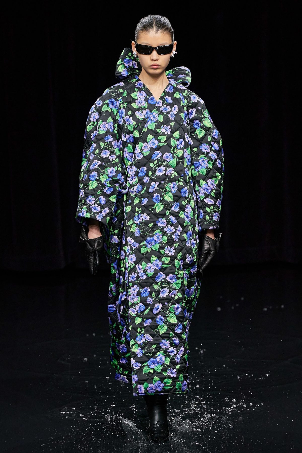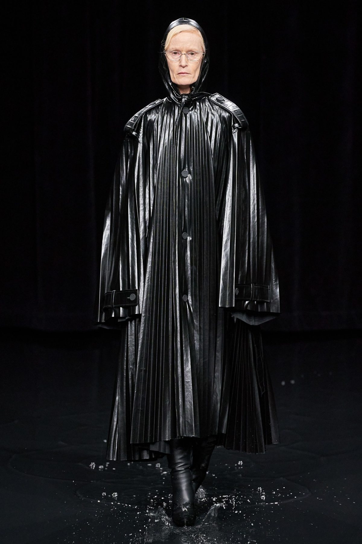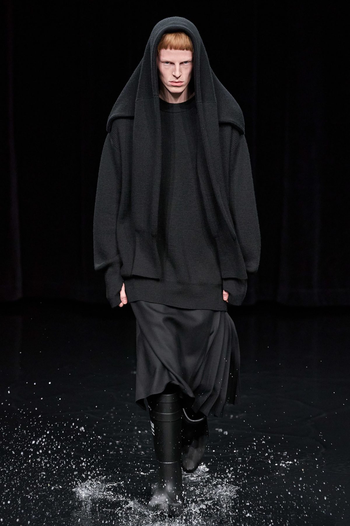 This season, power dynamics shifted to the Church, commencing with an ominous classical soundtrack as models emerged in austere long black coats, splashing across the runway. “I had a lot of clerical wear in my research. I come from a country where the Orthodox religion has been so predominant,” Gvasalia said. “I went to Church to confess every Saturday. Back then, I remember looking at all these young priests and monks, wearing these long robes and thinking, ‘how beautiful.’”