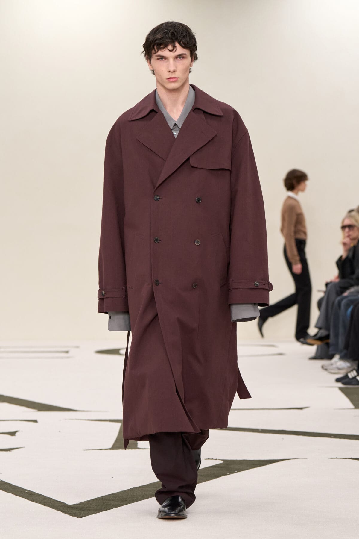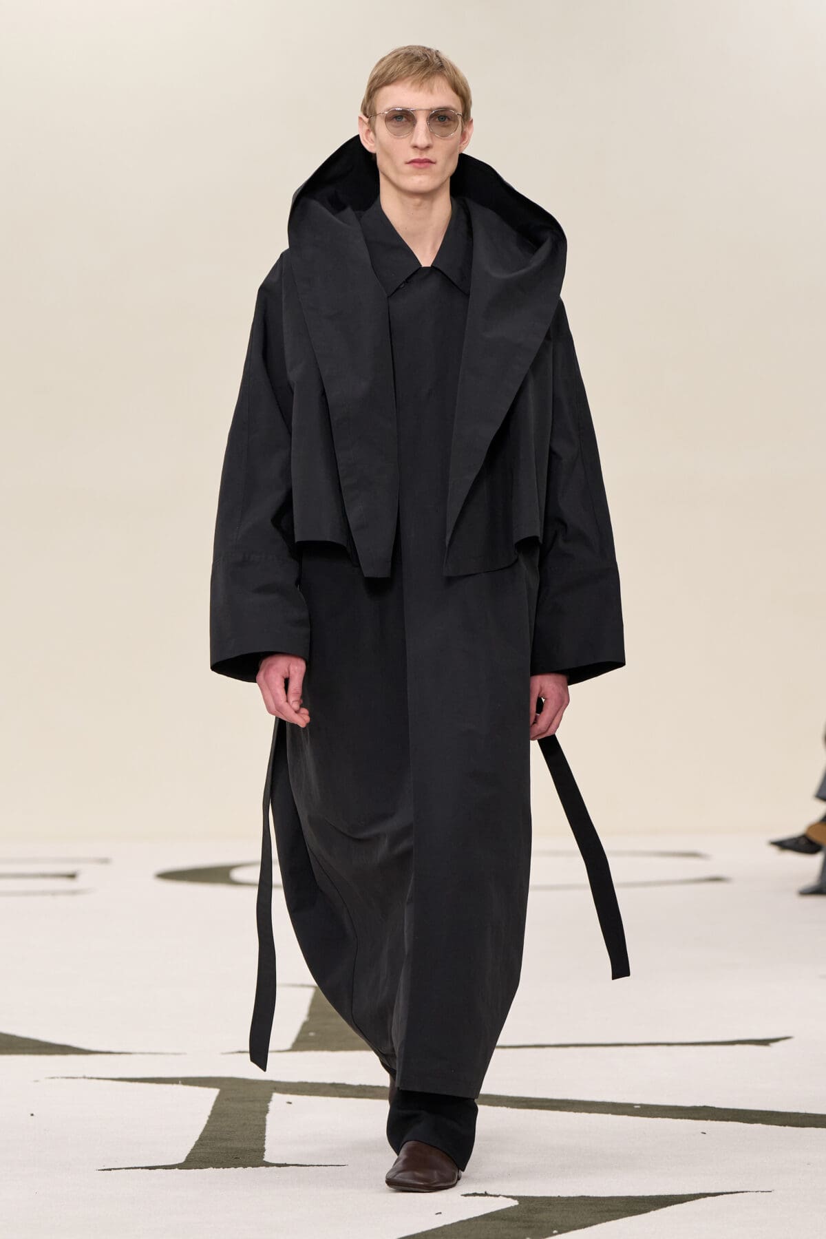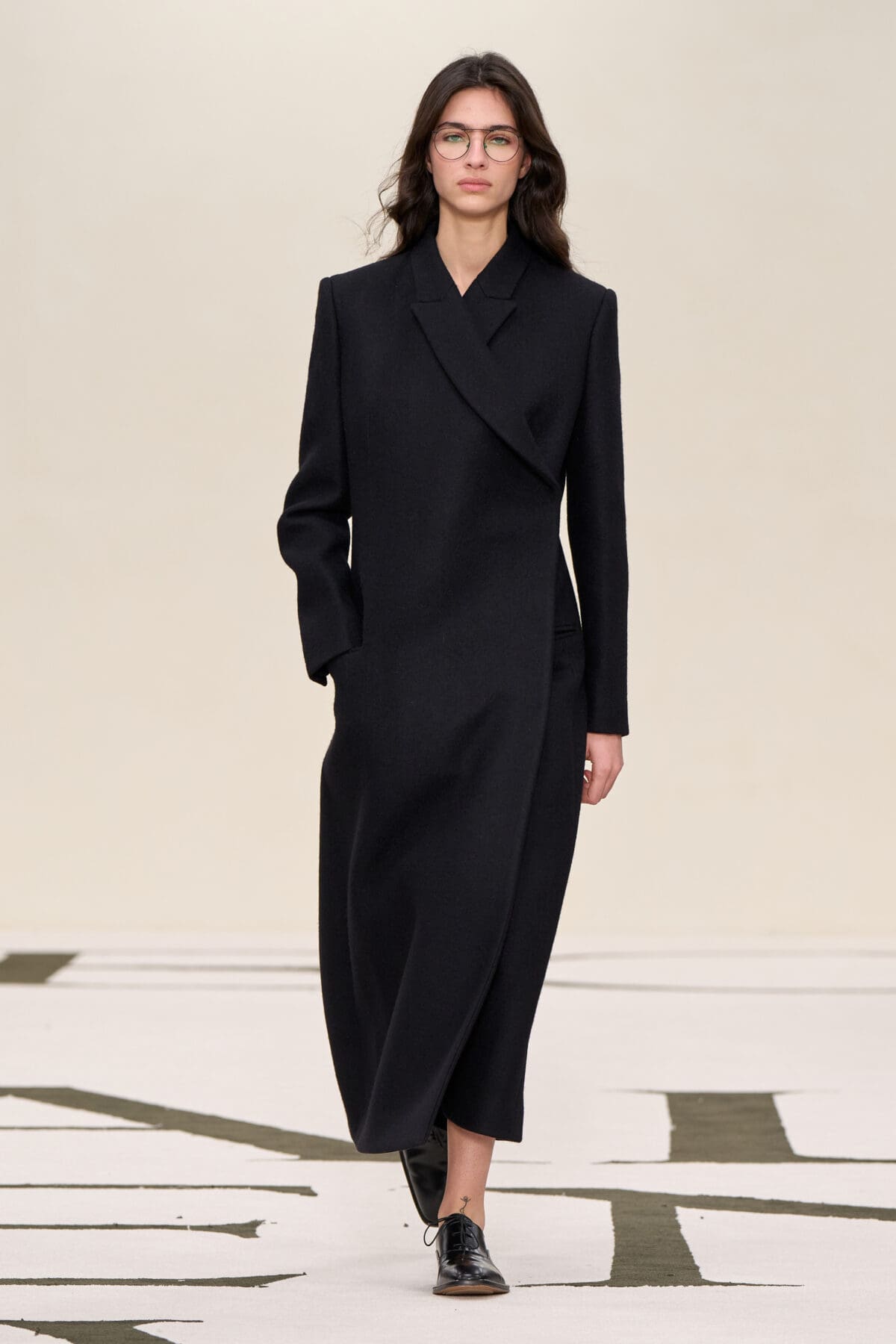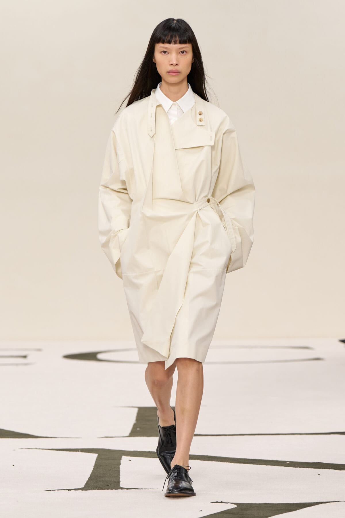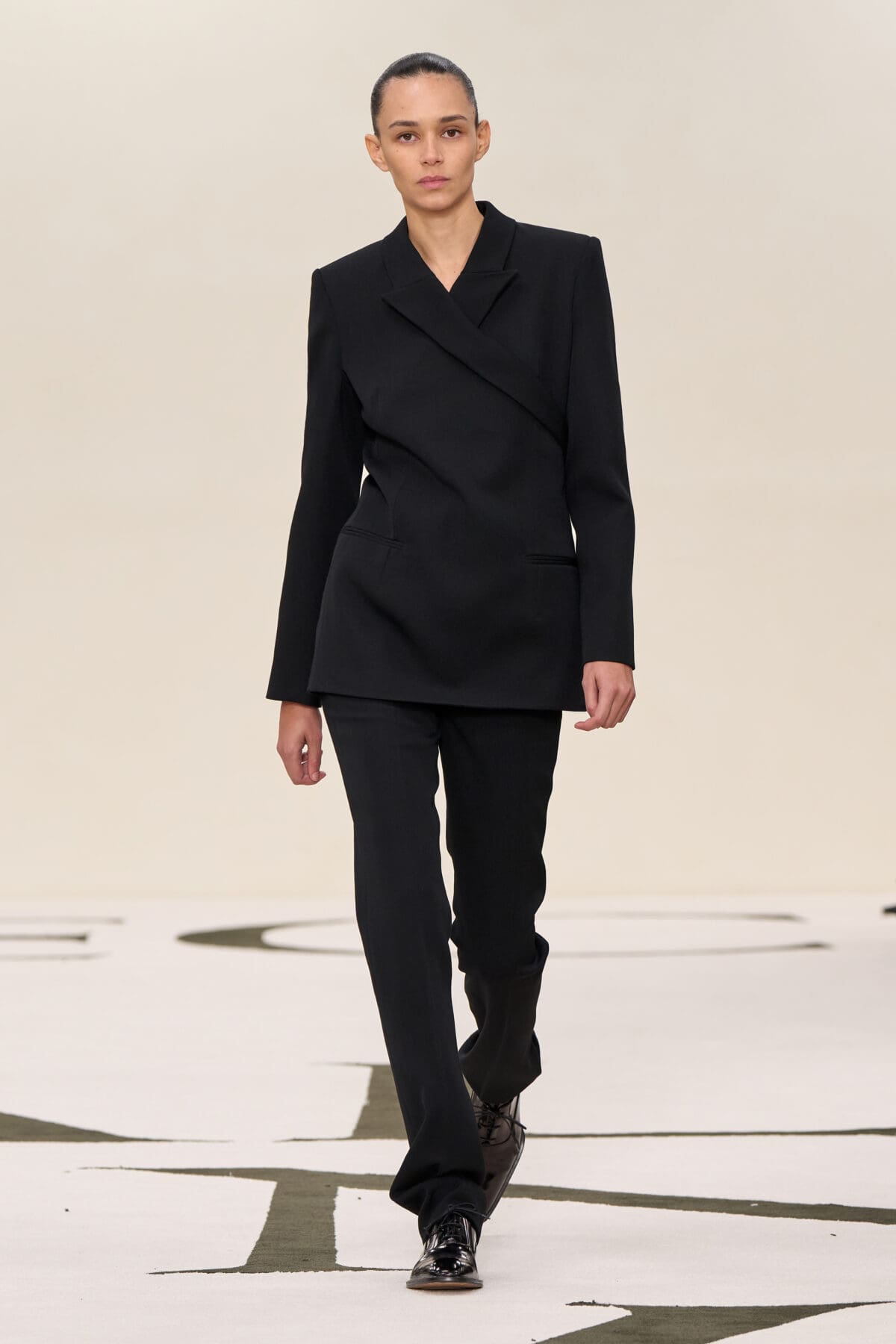 “I really tried to connect with his original energy, and we really tried to explore a 24/7 wardrobe, to give it a cinematic and a real reality,” she said at a preview. She opened with tailoring that glanced back at the 1990s, like a dove gray collarless jacket and matching pencil skirt cut to the knee, and worked her way through essentials for both women and men—sturdy mackintoshes and trenches, a neat little crewneck and button-down tucked into skinny pants, and relaxed denim—before concluding with voluminous drapey jersey dresses and a wrap-front tuxedo for evening.