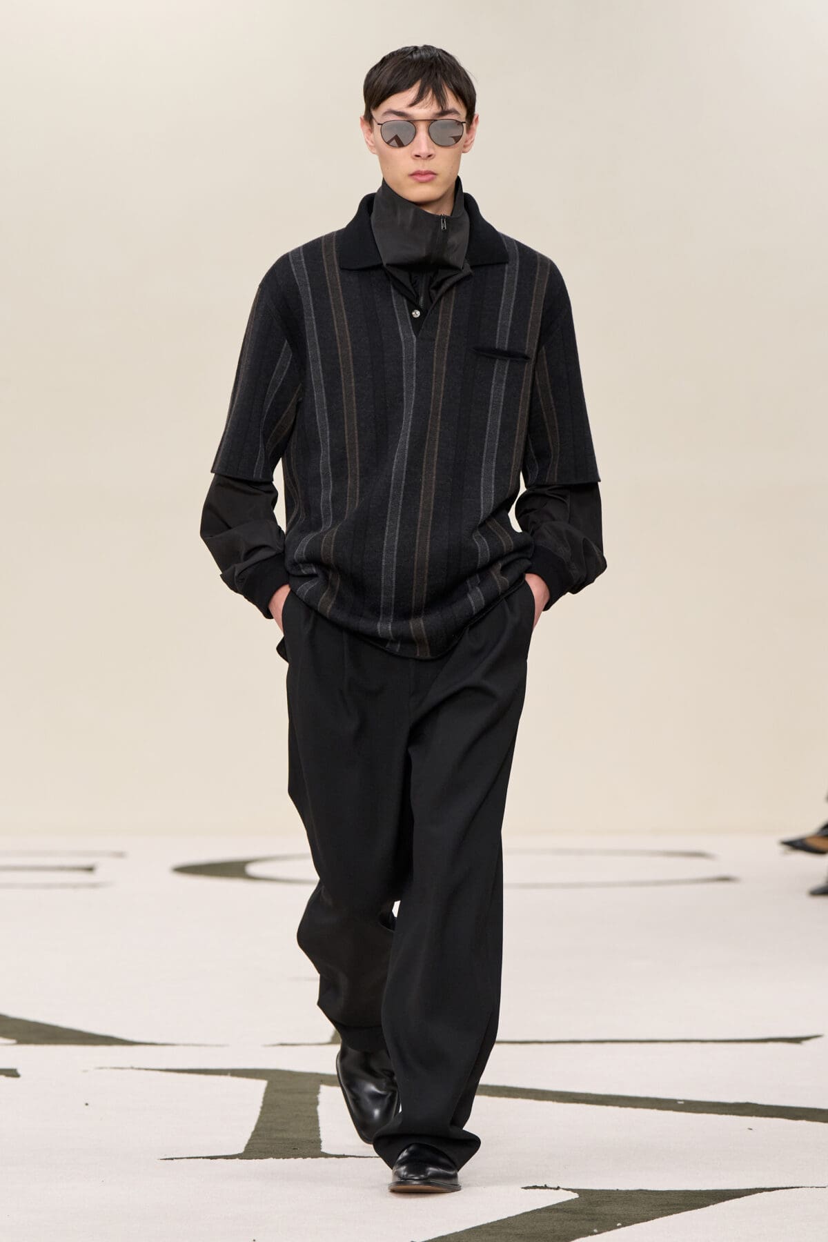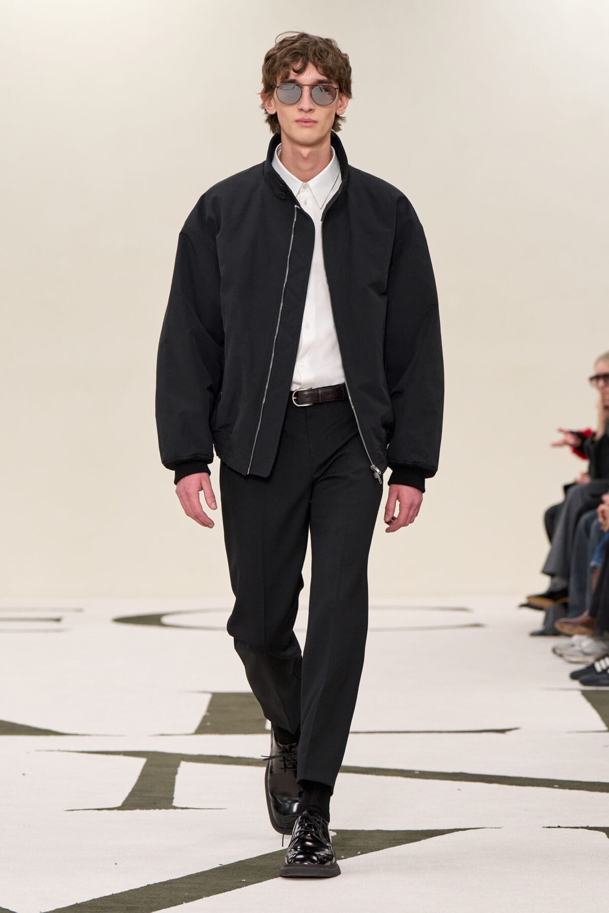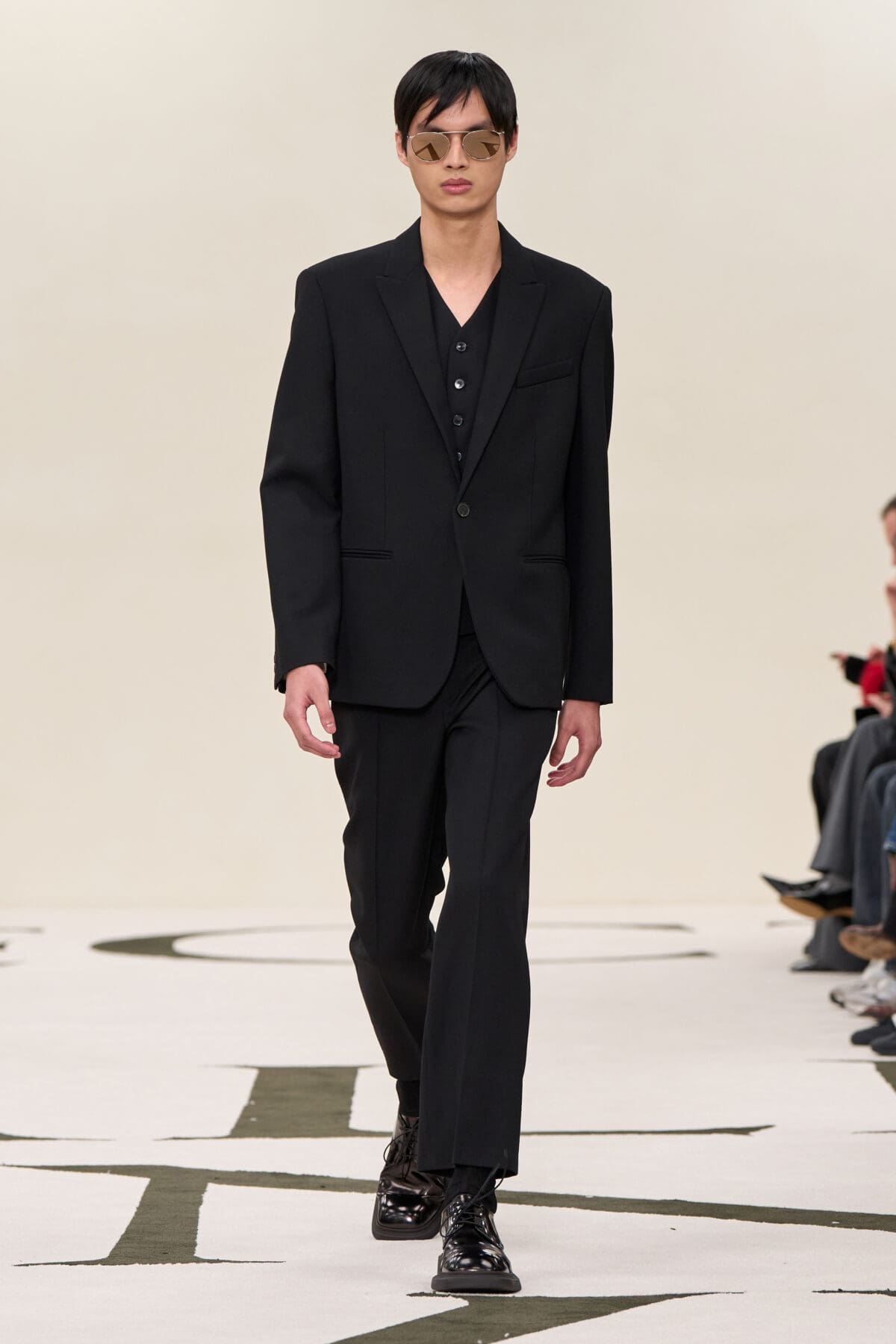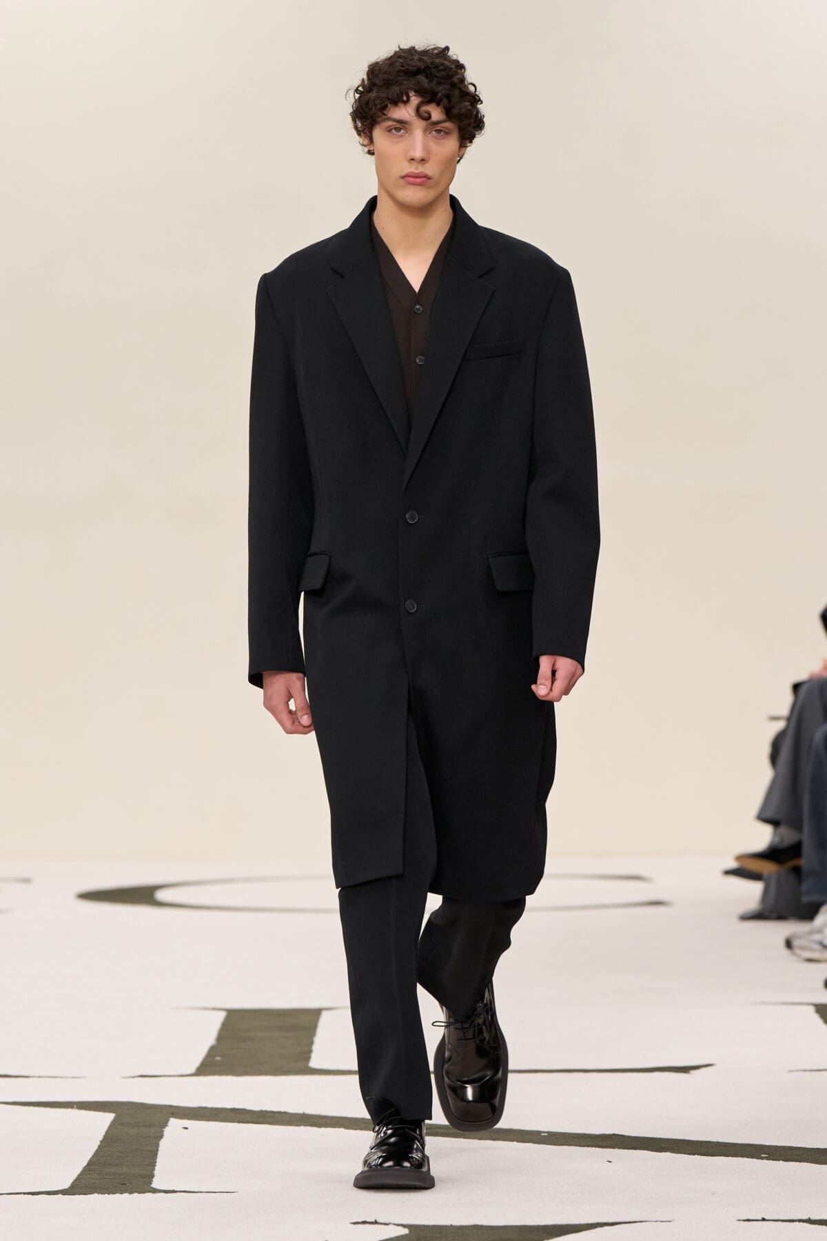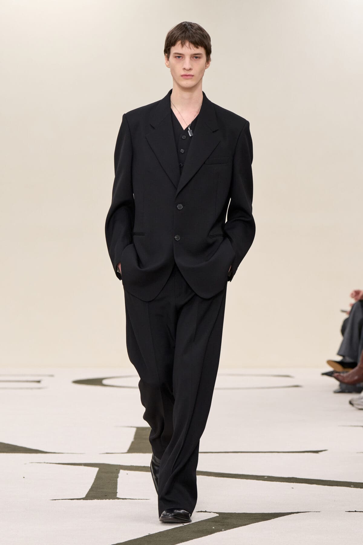 “I really tried to connect with his original energy, and we really tried to explore a 24/7 wardrobe, to give it a cinematic and a real reality,” she said at a preview. She opened with tailoring that glanced back at the 1990s, like a dove gray collarless jacket and matching pencil skirt cut to the knee, and worked her way through essentials for both women and men—sturdy mackintoshes and trenches, a neat little crewneck and button-down tucked into skinny pants, and relaxed denim—before concluding with voluminous drapey jersey dresses and a wrap-front tuxedo for evening.