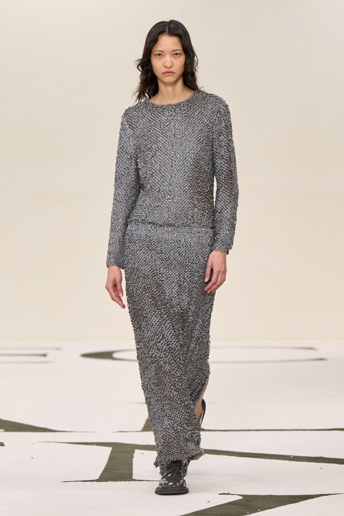 At that preview, Leoni was wearing a pair of antique gold embroidery scissors tied around her neck with kitchen string. It was no vestigial accessory, judging by the make of the clothes, which on close inspection looked thoughtful and exacting. The real measure, of course, will be taken in the stores, but Klein himself weighed in with his take. Speaking to a fellow reporter after the show, he said, “For a start, it’s pretty extraordinary.”