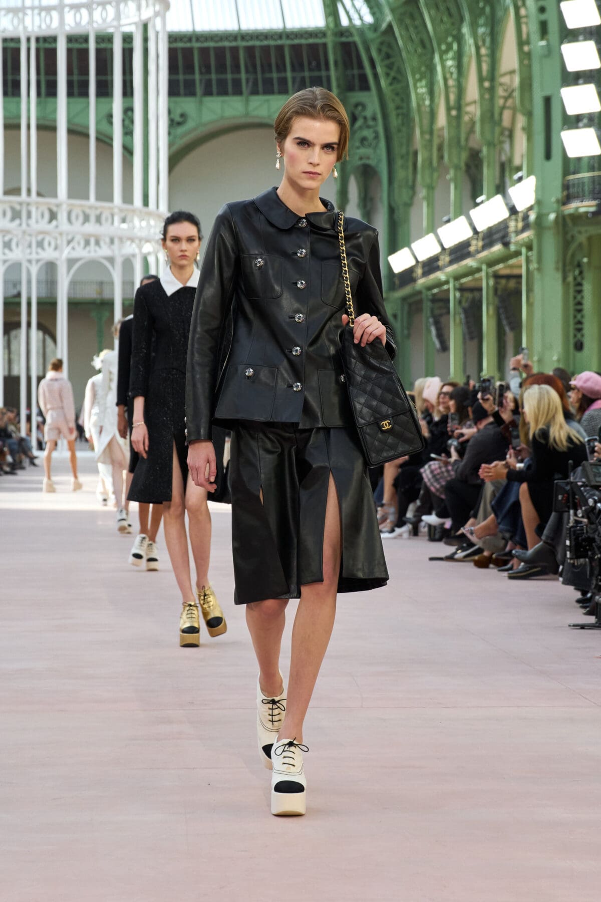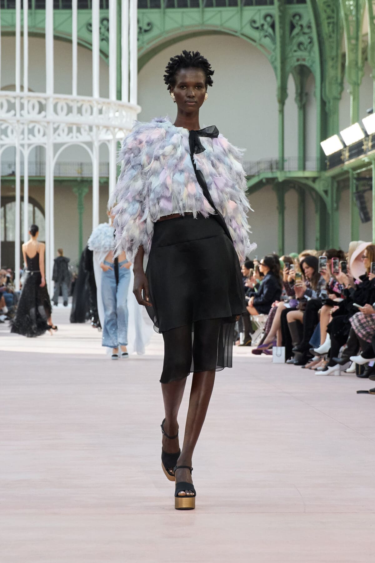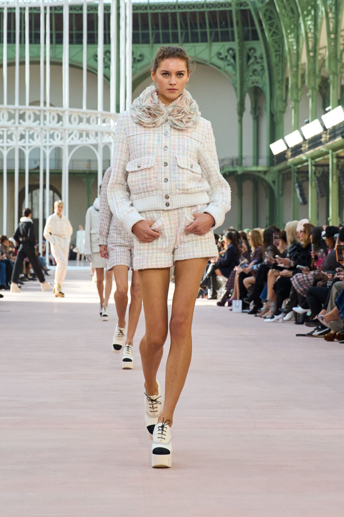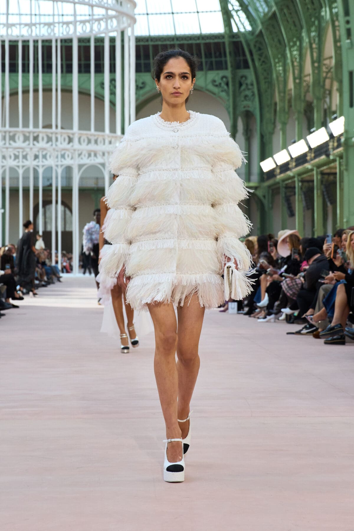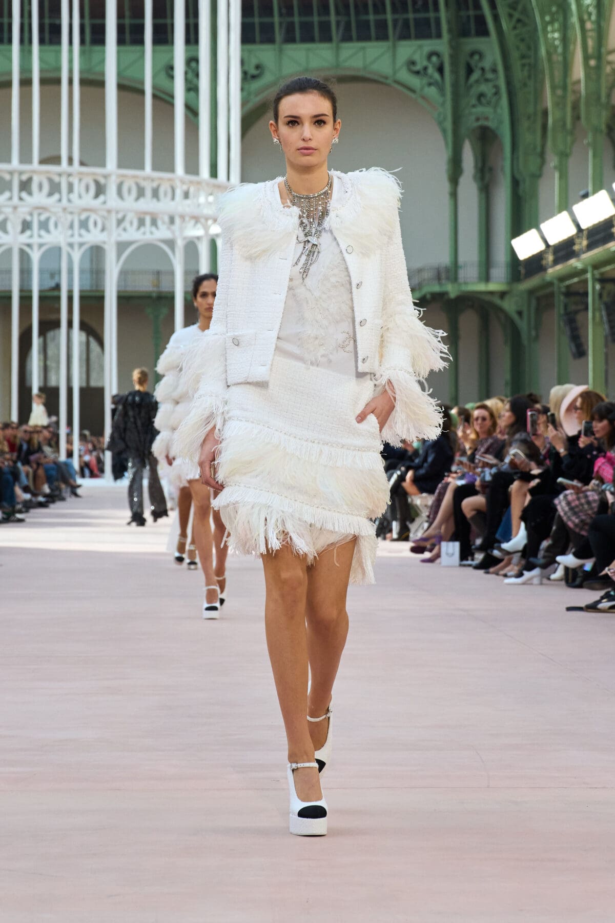 For spring, Chanel’s creative studio took the Grand Palais itself as a starting point. The show’s most remarkable pieces were hand-knit in the pattern of its soaring Art Deco iron and steel work. Lightness, airiness, and a whisper of ephemerality were the directives for the collection, which the studio team achieved in various ways: skirts with front slits that proffered glimpses of leg, collars made from layers of downy feathers, trailing chiffon capes, and platform shoes that added a feeling of youthfulness to the proceedings.