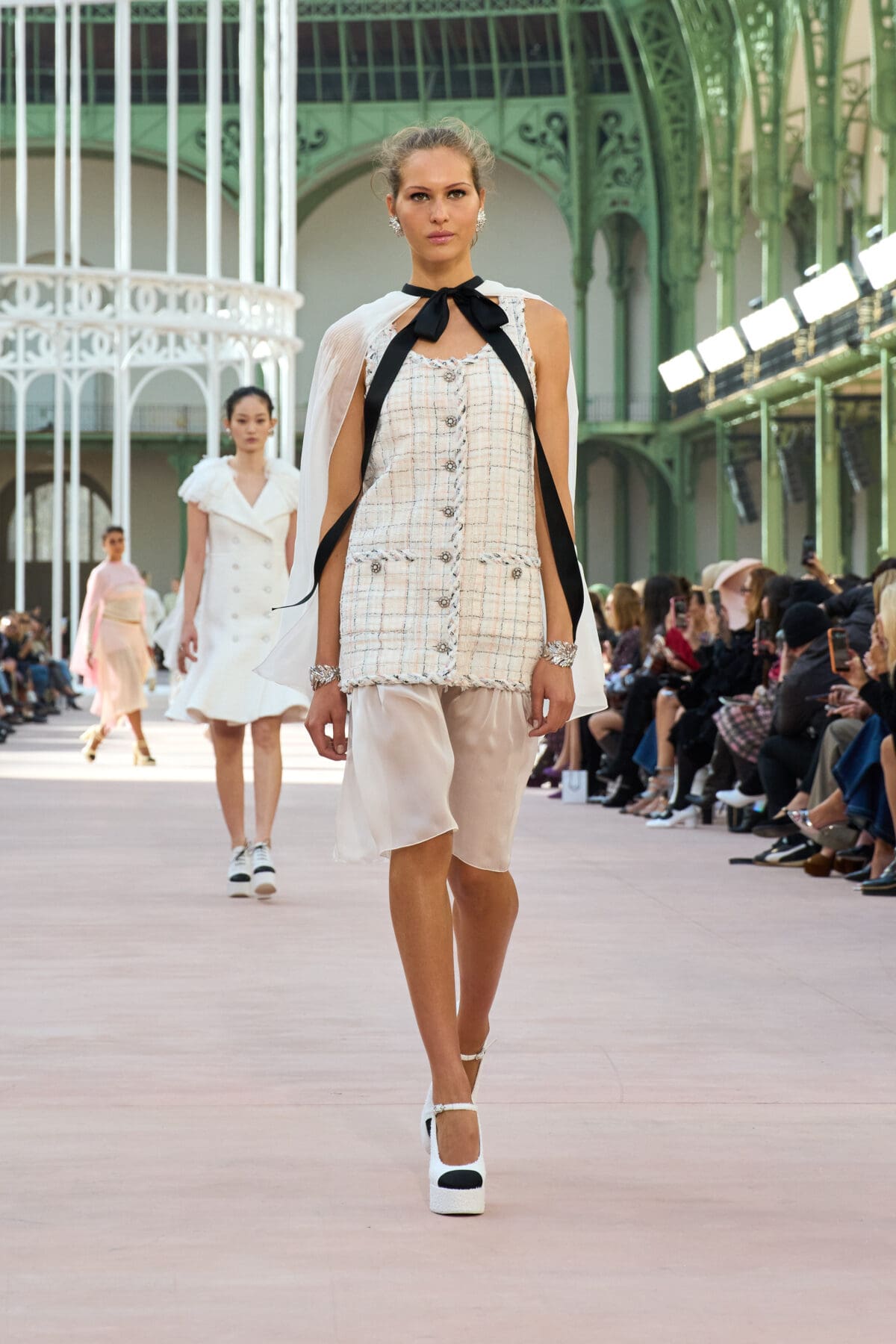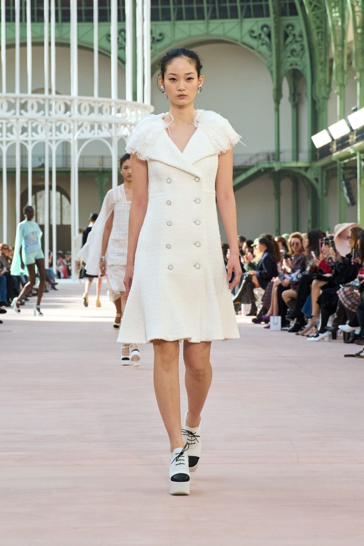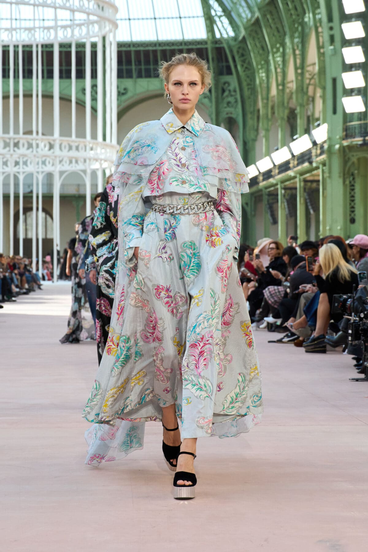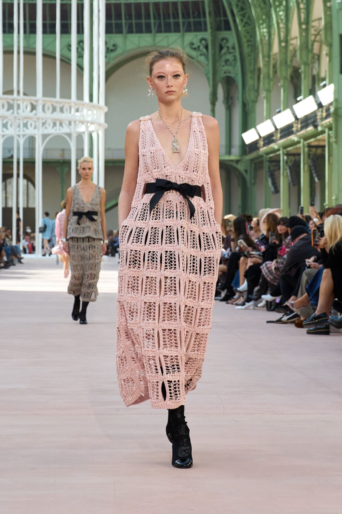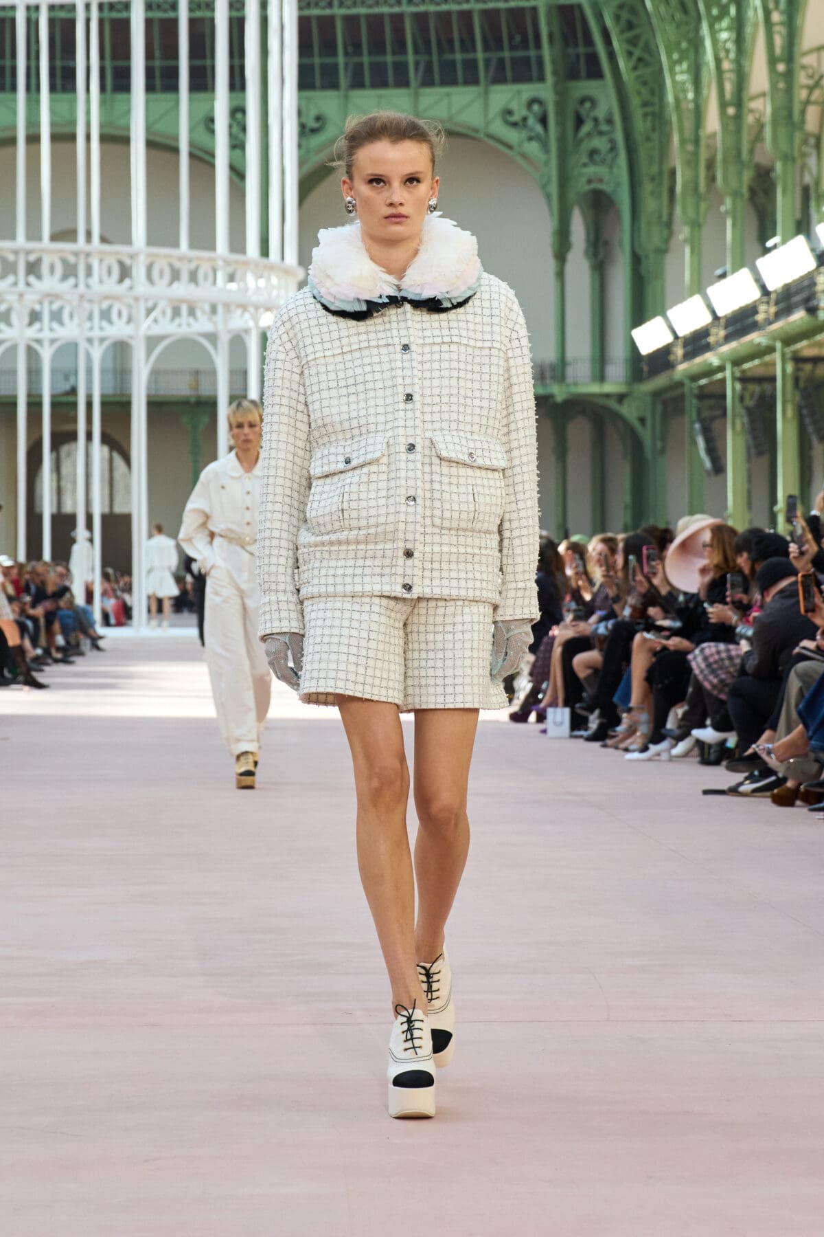 For spring, Chanel’s creative studio took the Grand Palais itself as a starting point. The show’s most remarkable pieces were hand-knit in the pattern of its soaring Art Deco iron and steel work. Lightness, airiness, and a whisper of ephemerality were the directives for the collection, which the studio team achieved in various ways: skirts with front slits that proffered glimpses of leg, collars made from layers of downy feathers, trailing chiffon capes, and platform shoes that added a feeling of youthfulness to the proceedings.