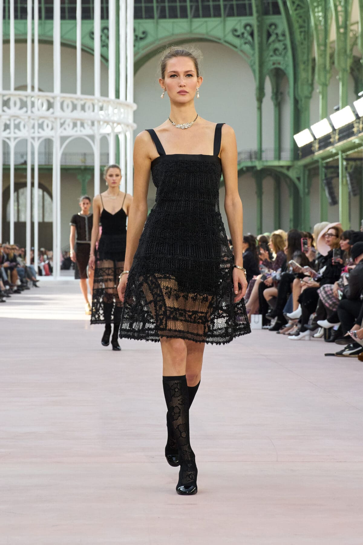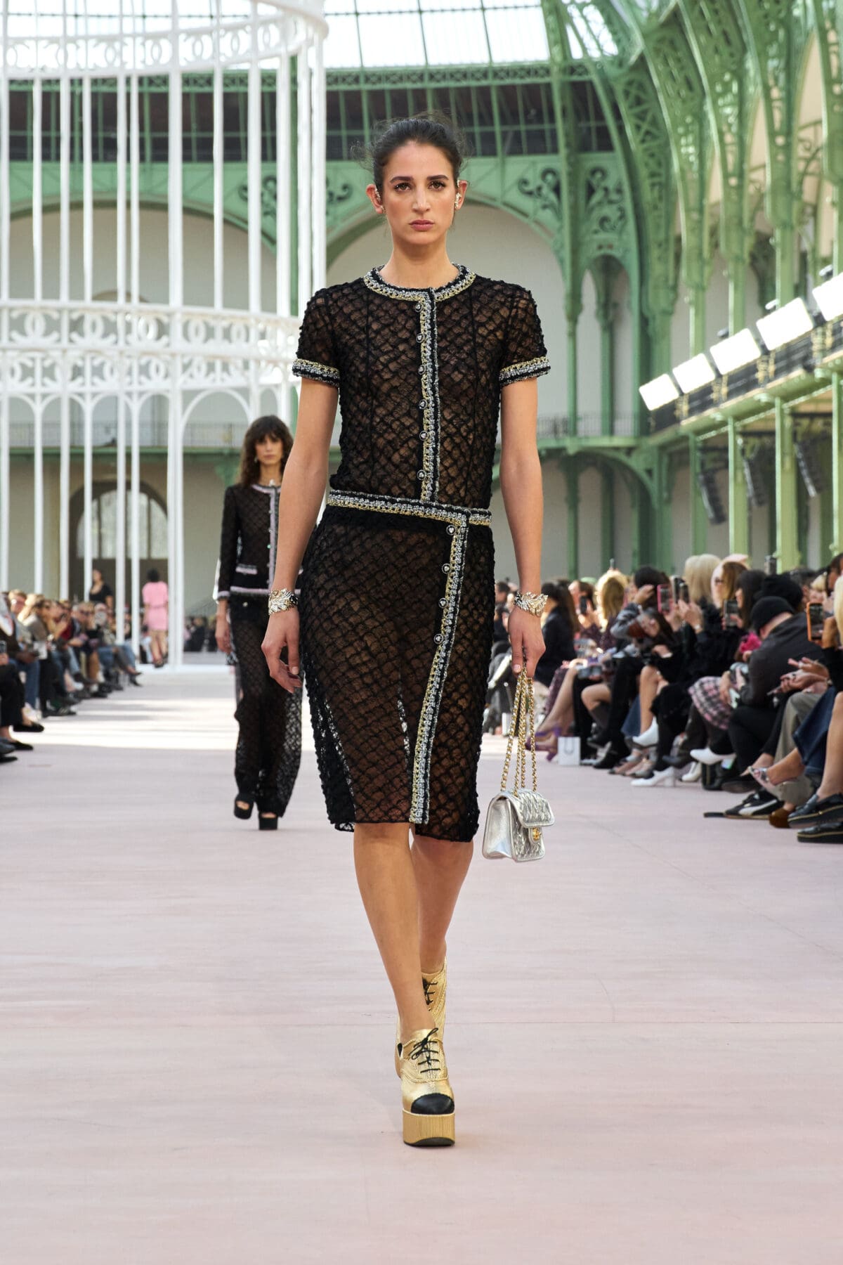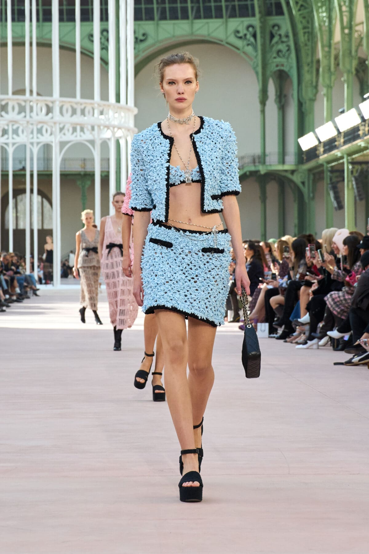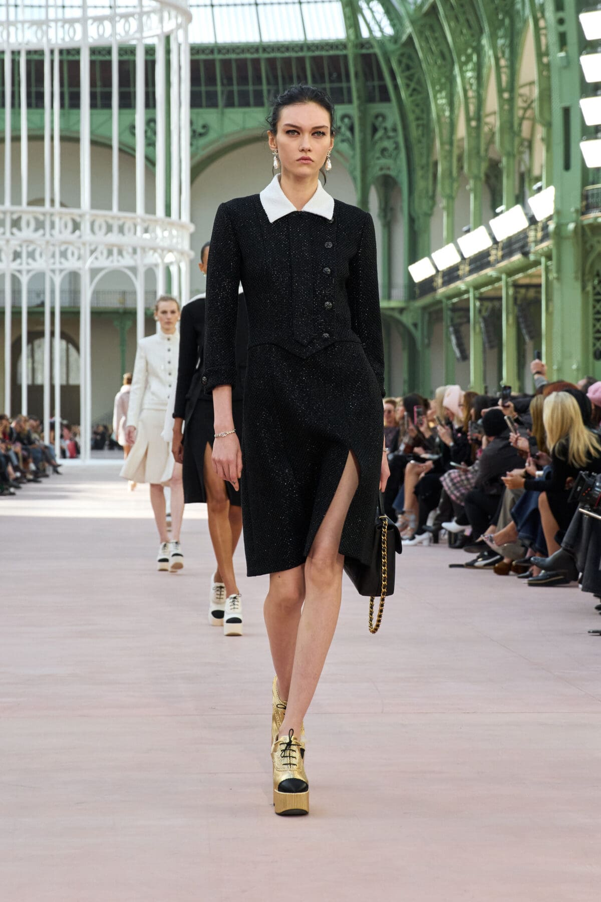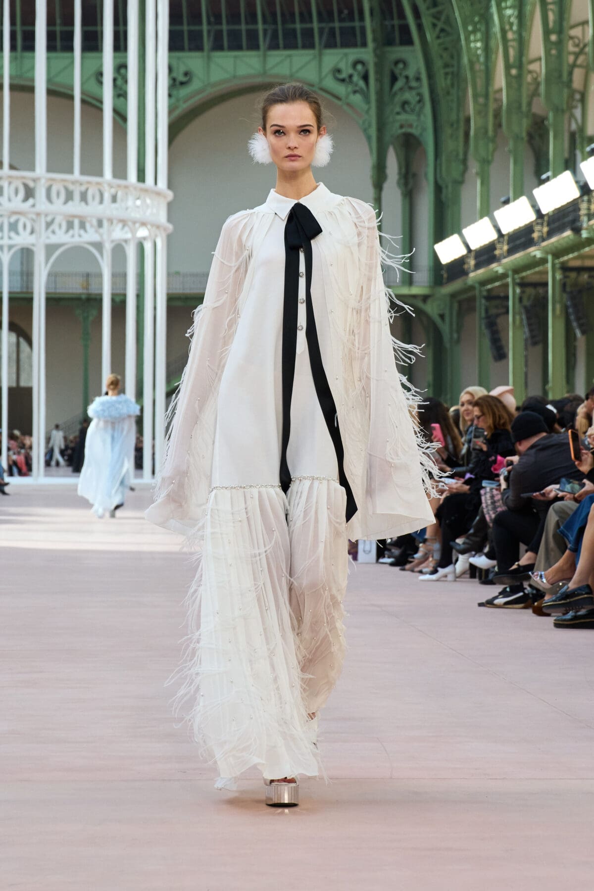 For spring, Chanel’s creative studio took the Grand Palais itself as a starting point. The show’s most remarkable pieces were hand-knit in the pattern of its soaring Art Deco iron and steel work. Lightness, airiness, and a whisper of ephemerality were the directives for the collection, which the studio team achieved in various ways: skirts with front slits that proffered glimpses of leg, collars made from layers of downy feathers, trailing chiffon capes, and platform shoes that added a feeling of youthfulness to the proceedings.