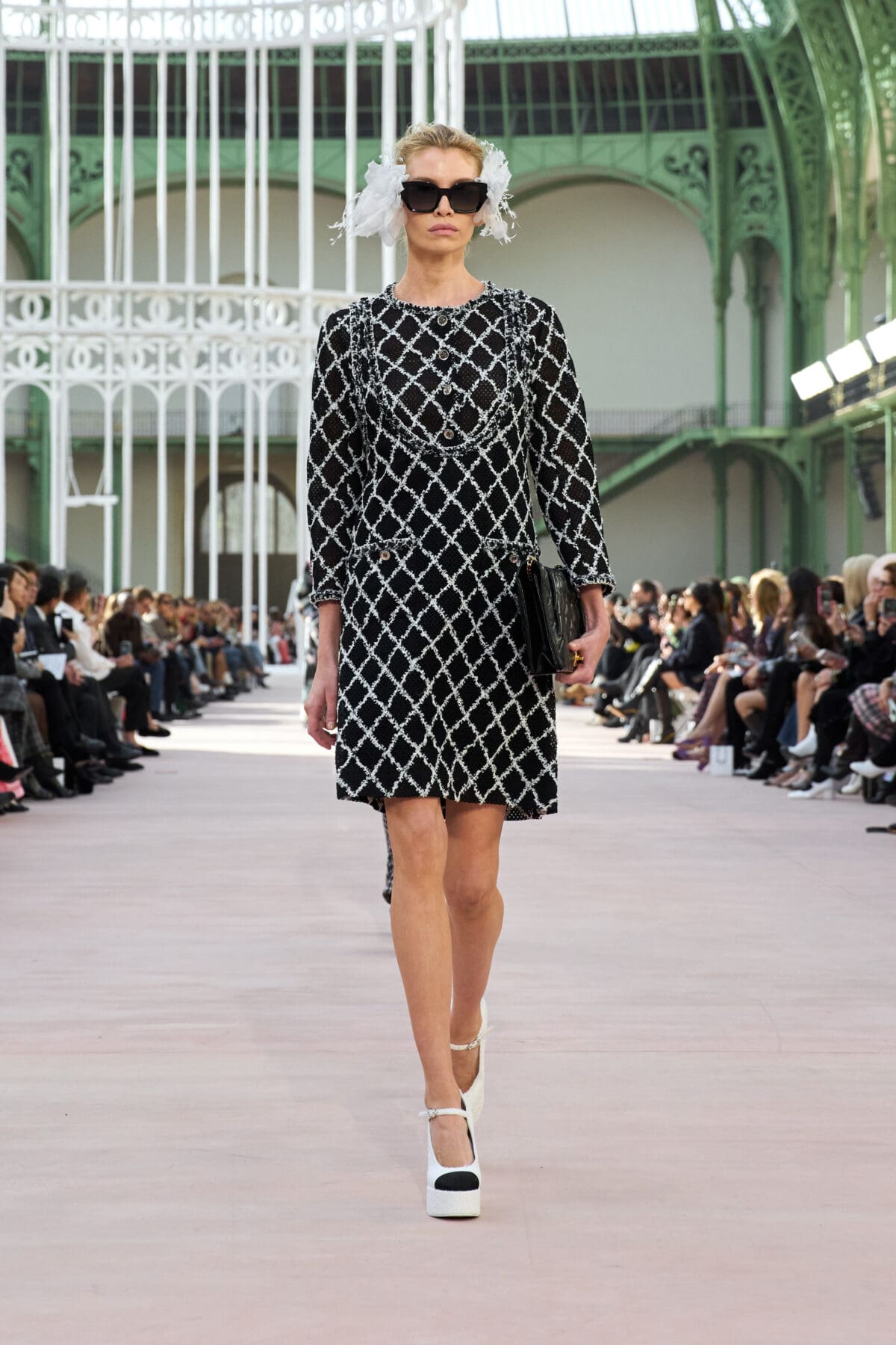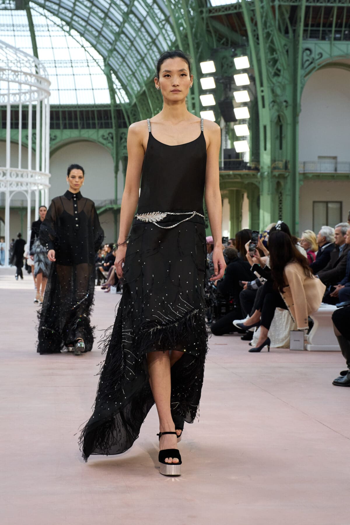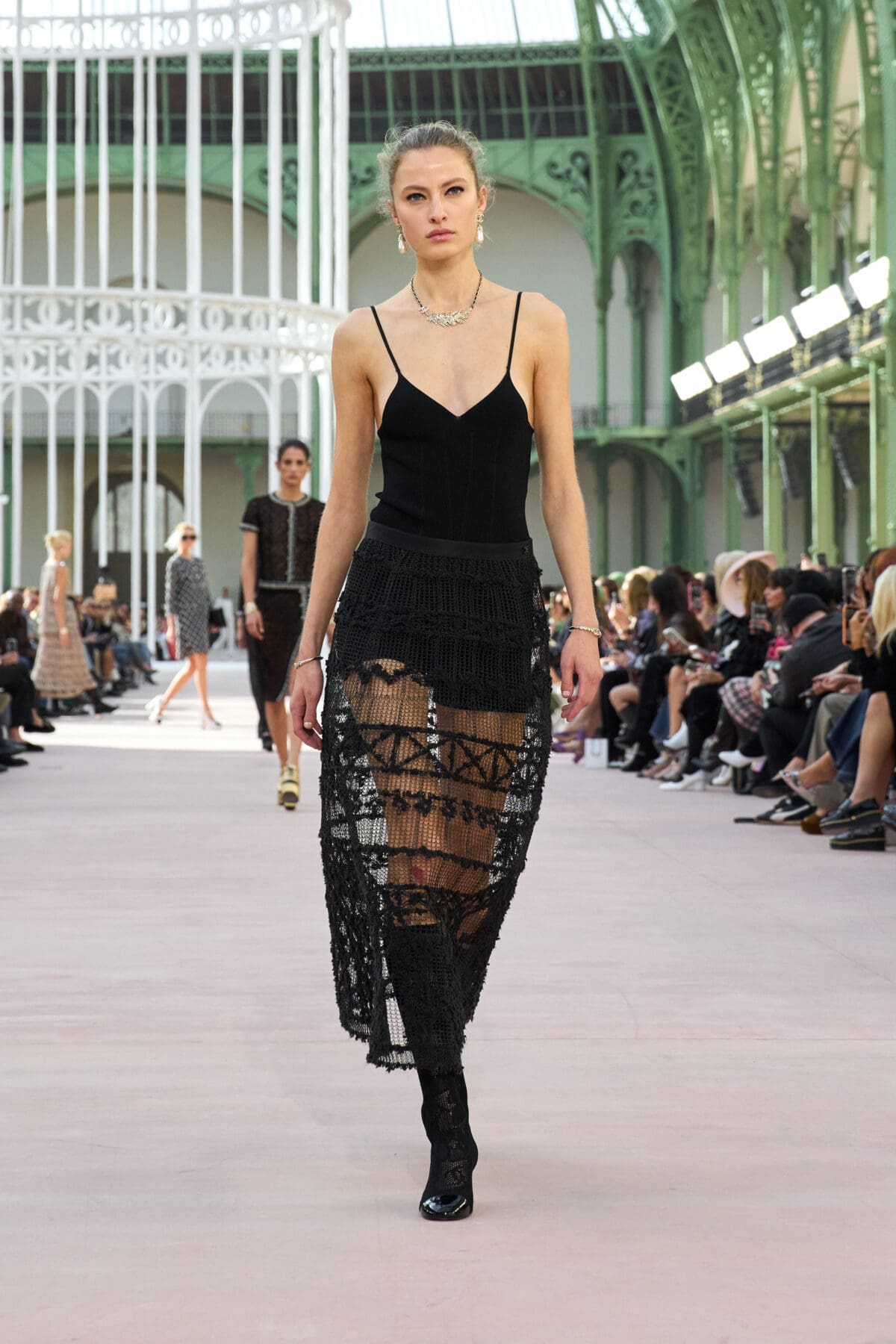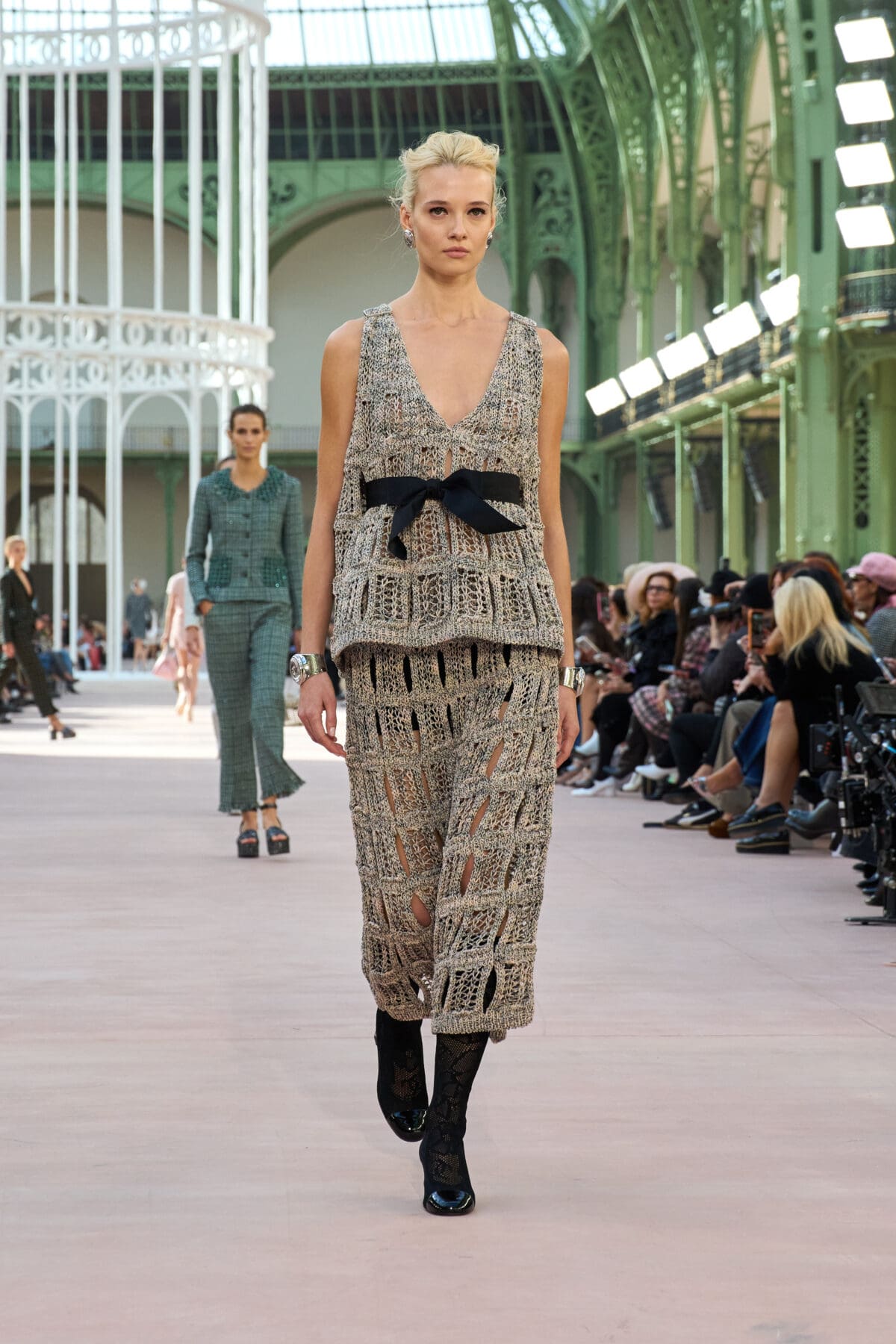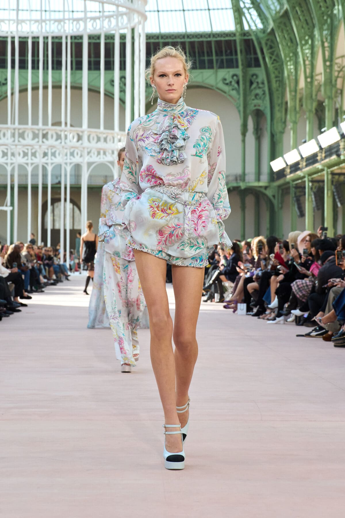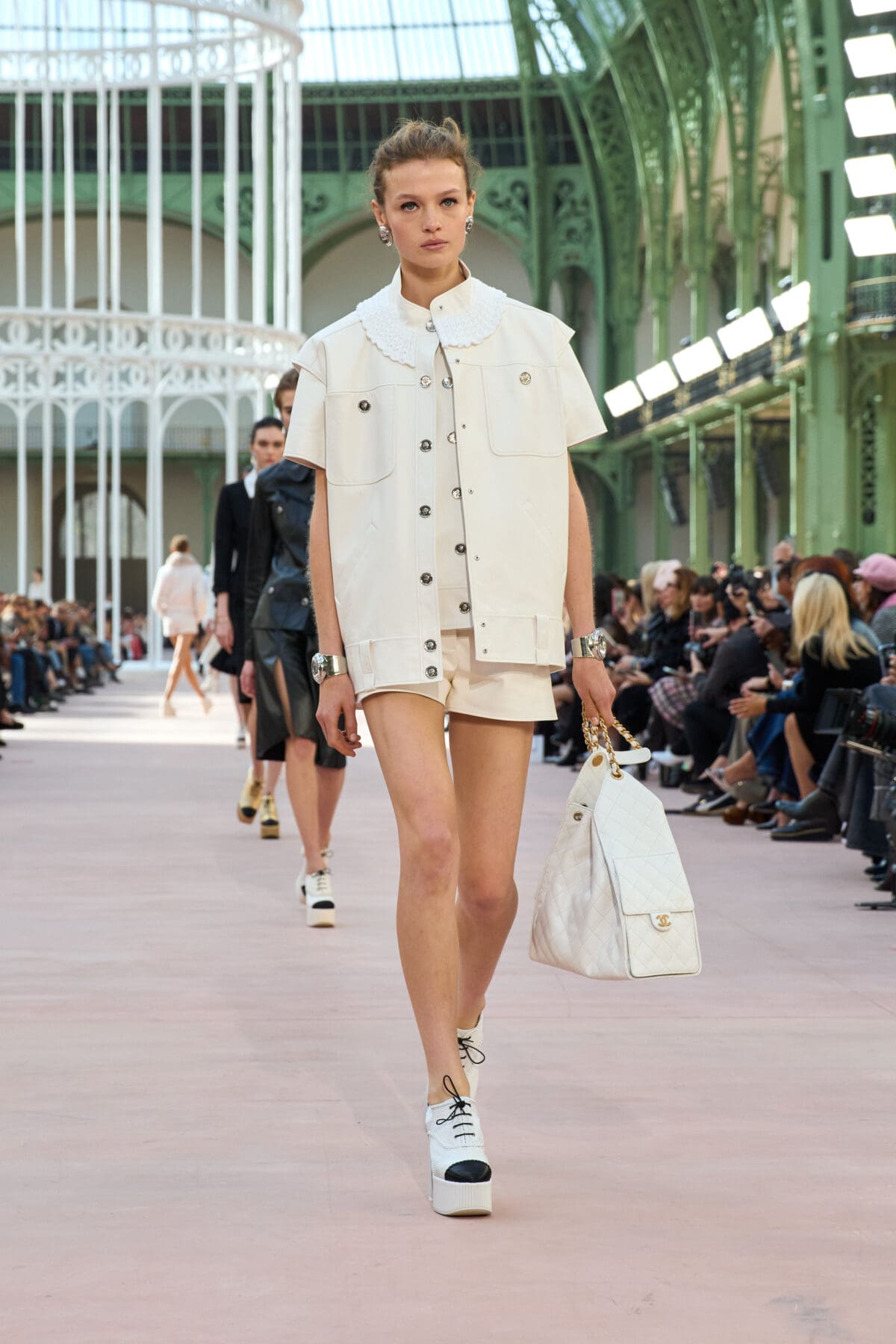 For spring, Chanel’s creative studio took the Grand Palais itself as a starting point. The show’s most remarkable pieces were hand-knit in the pattern of its soaring Art Deco iron and steel work. Lightness, airiness, and a whisper of ephemerality were the directives for the collection, which the studio team achieved in various ways: skirts with front slits that proffered glimpses of leg, collars made from layers of downy feathers, trailing chiffon capes, and platform shoes that added a feeling of youthfulness to the proceedings.