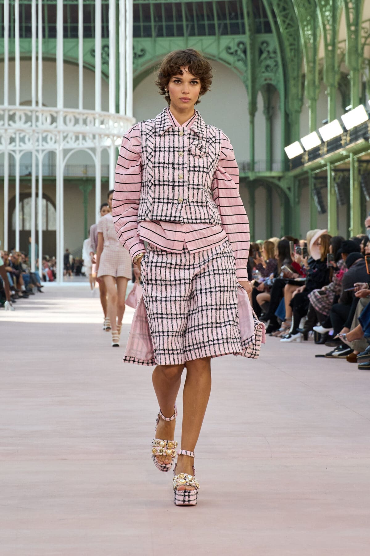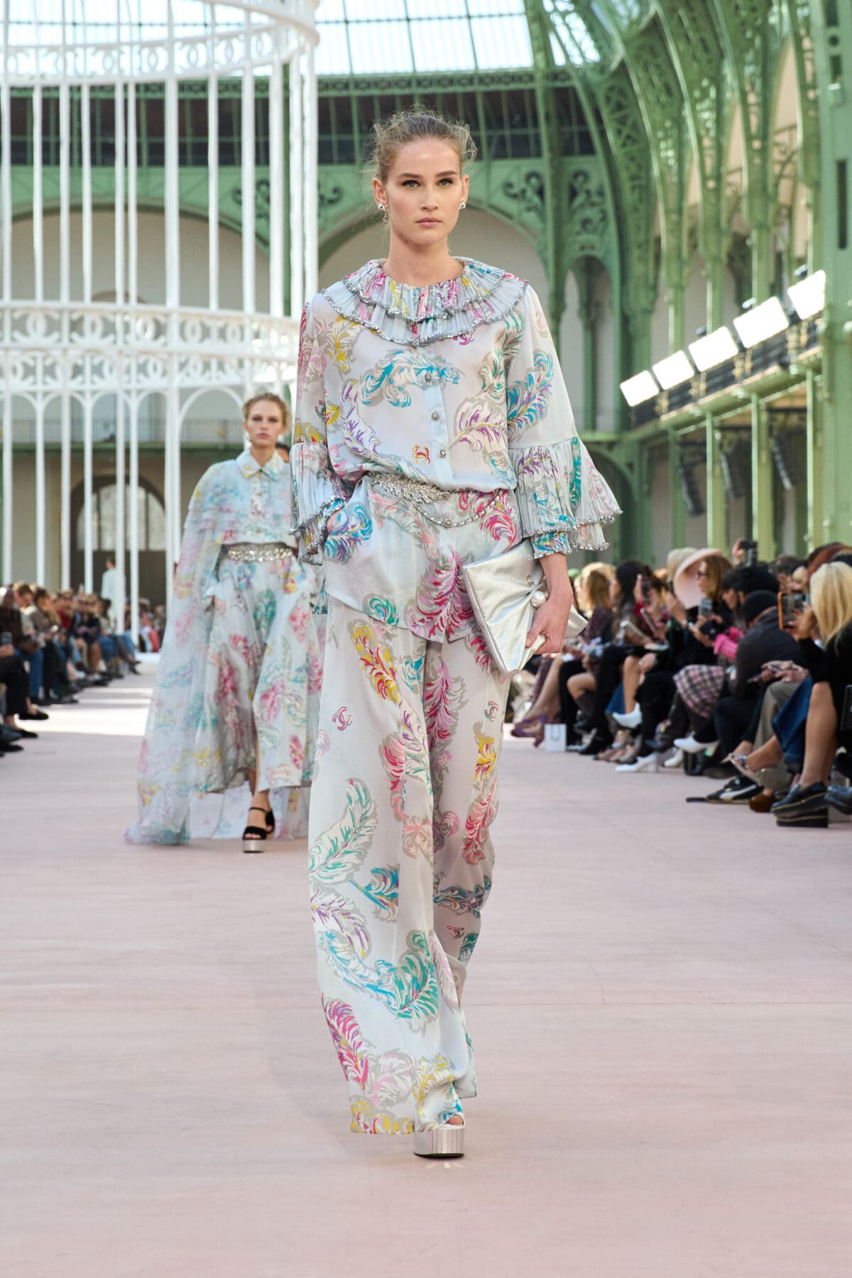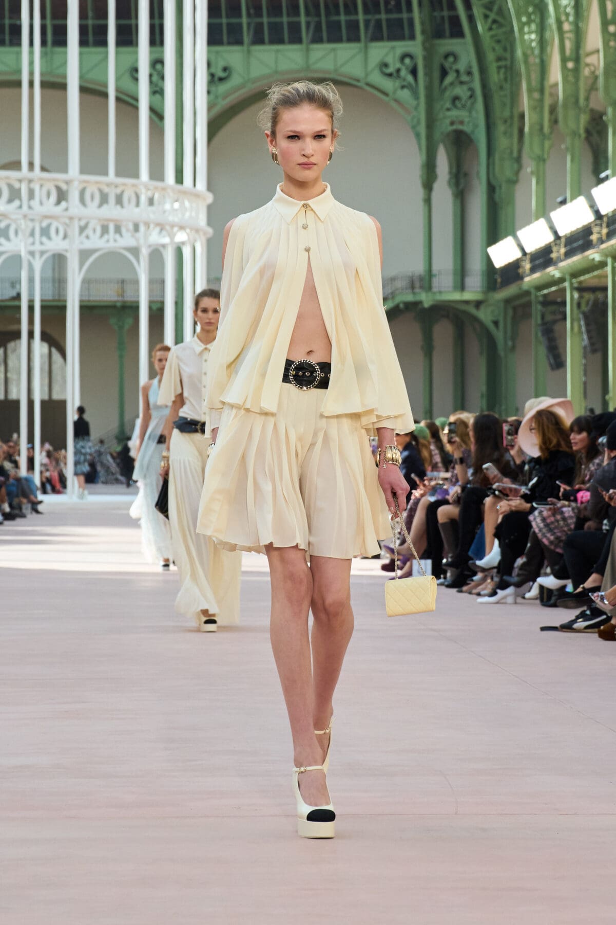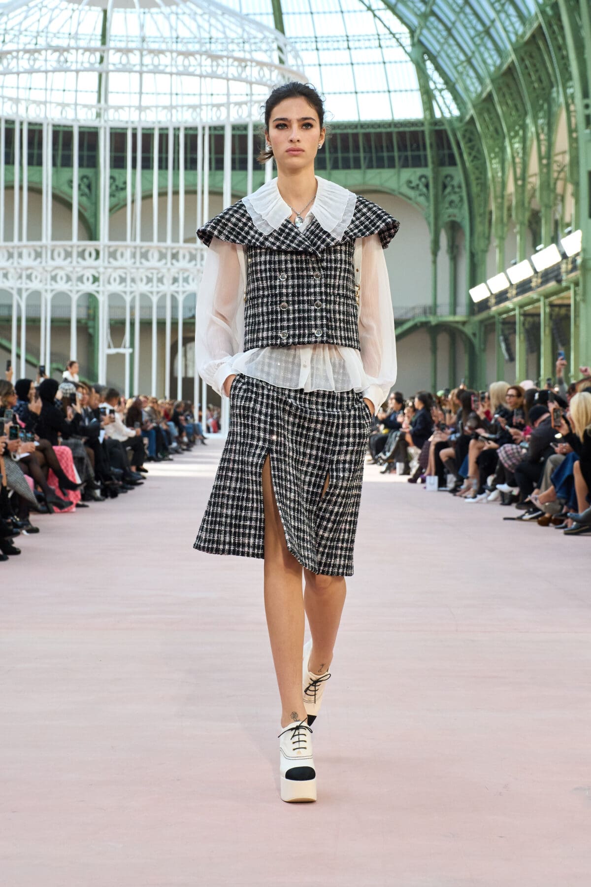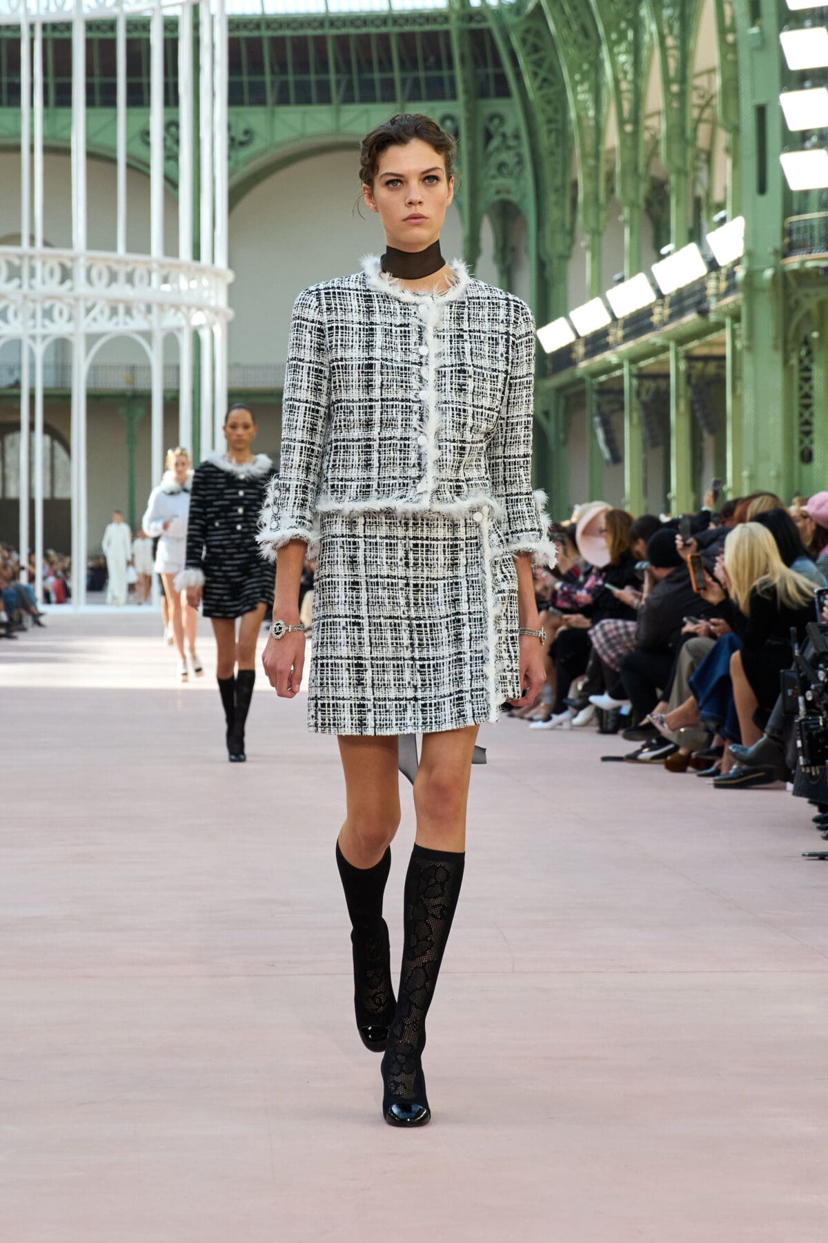 For spring, Chanel’s creative studio took the Grand Palais itself as a starting point. The show’s most remarkable pieces were hand-knit in the pattern of its soaring Art Deco iron and steel work. Lightness, airiness, and a whisper of ephemerality were the directives for the collection, which the studio team achieved in various ways: skirts with front slits that proffered glimpses of leg, collars made from layers of downy feathers, trailing chiffon capes, and platform shoes that added a feeling of youthfulness to the proceedings.