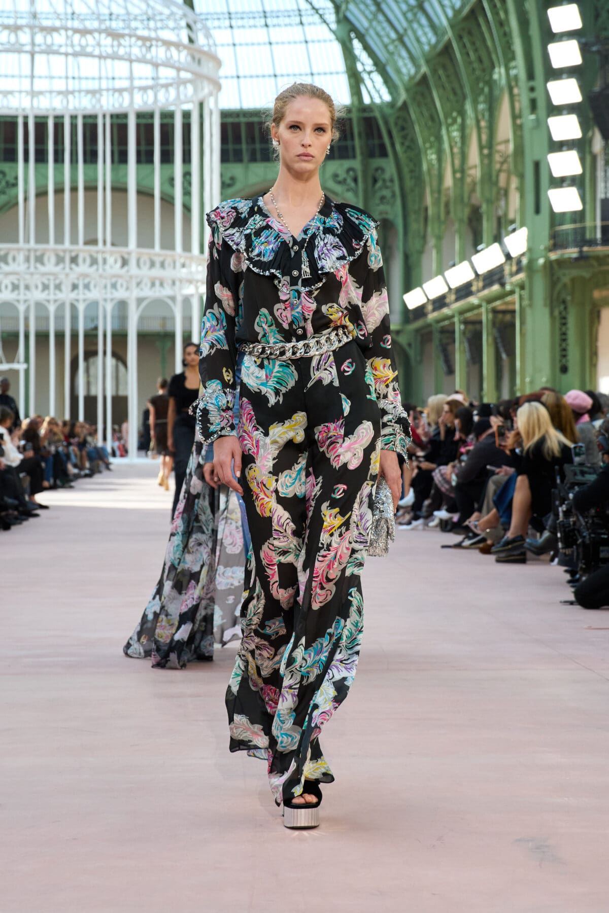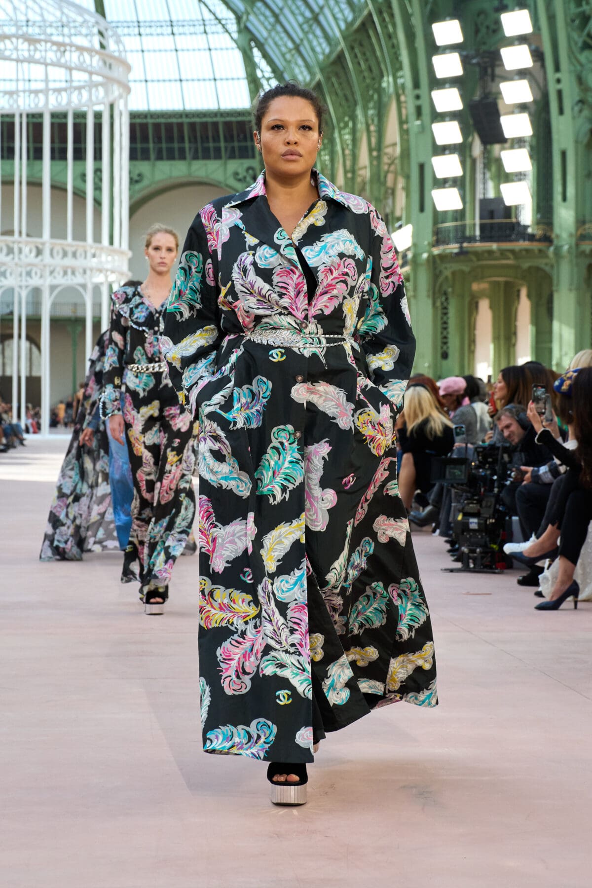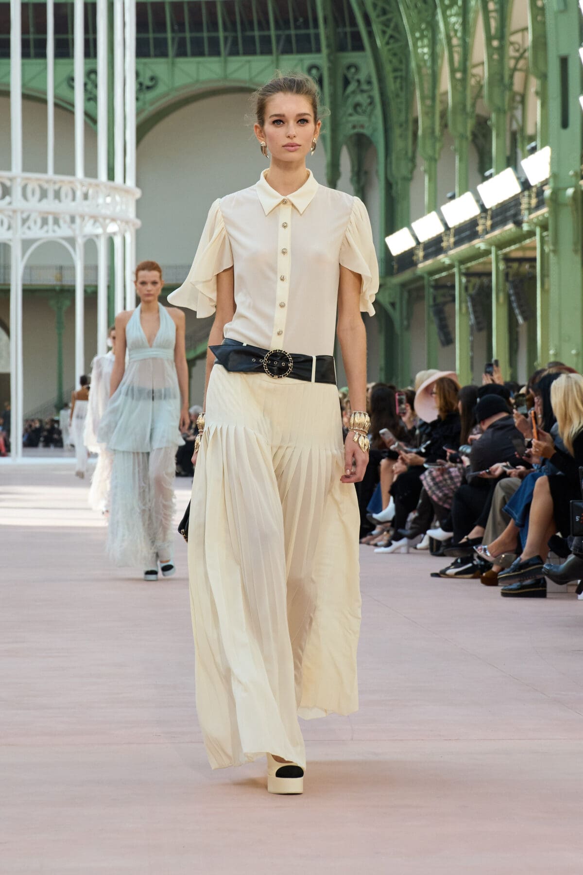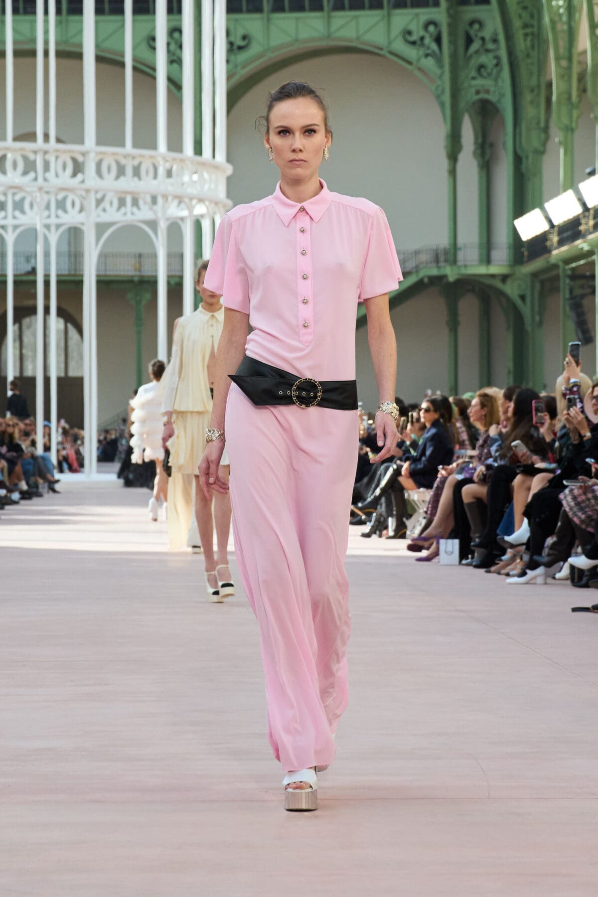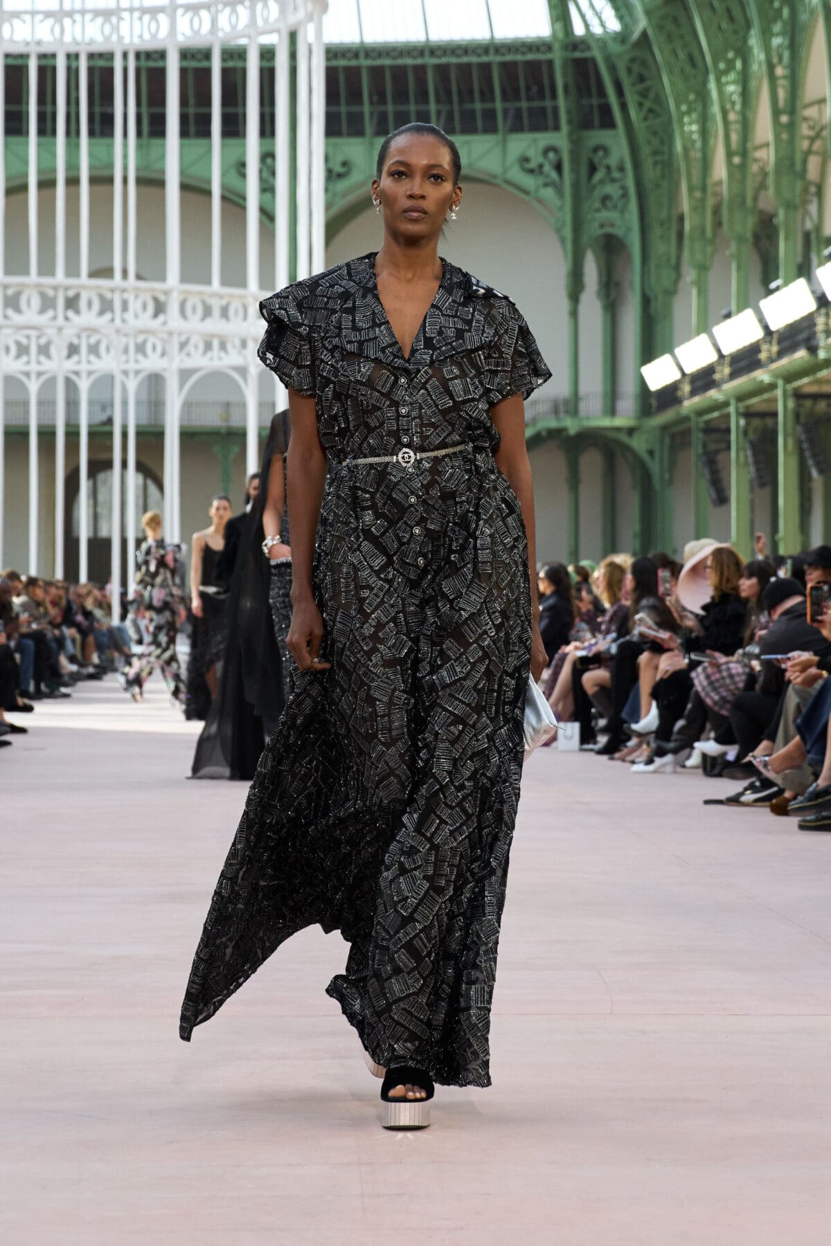 For spring, Chanel’s creative studio took the Grand Palais itself as a starting point. The show’s most remarkable pieces were hand-knit in the pattern of its soaring Art Deco iron and steel work. Lightness, airiness, and a whisper of ephemerality were the directives for the collection, which the studio team achieved in various ways: skirts with front slits that proffered glimpses of leg, collars made from layers of downy feathers, trailing chiffon capes, and platform shoes that added a feeling of youthfulness to the proceedings.