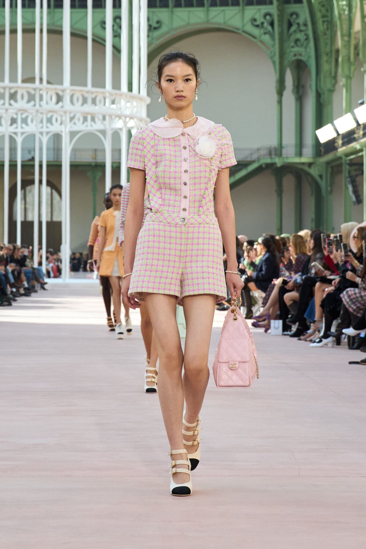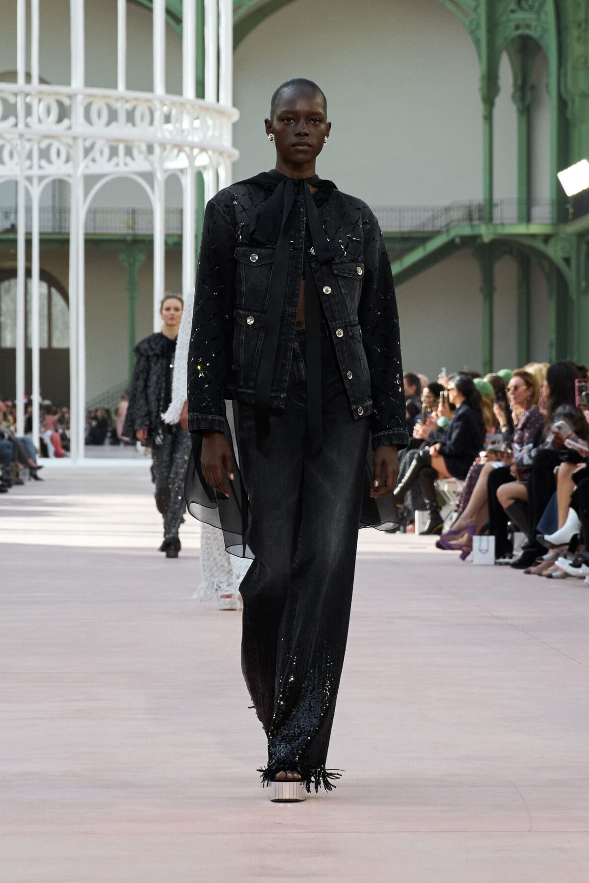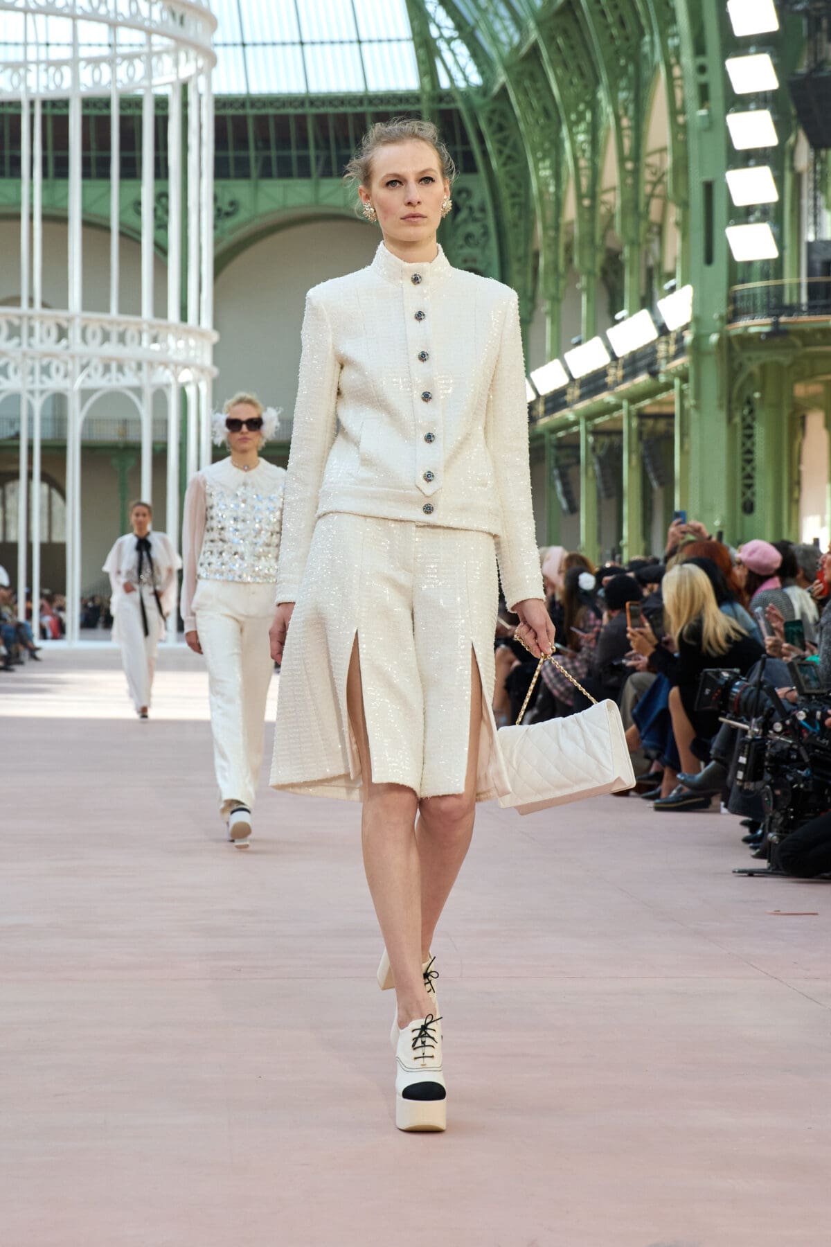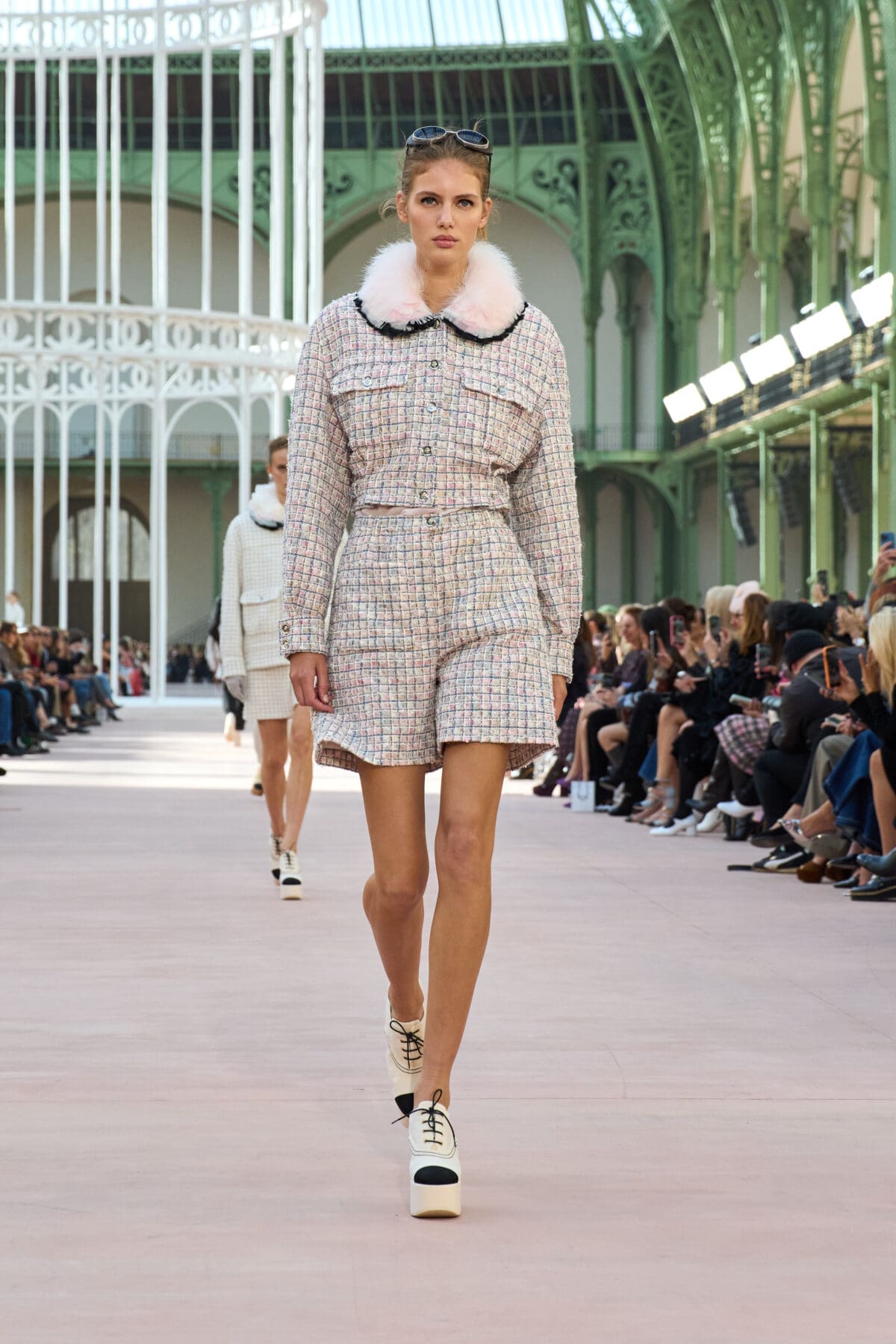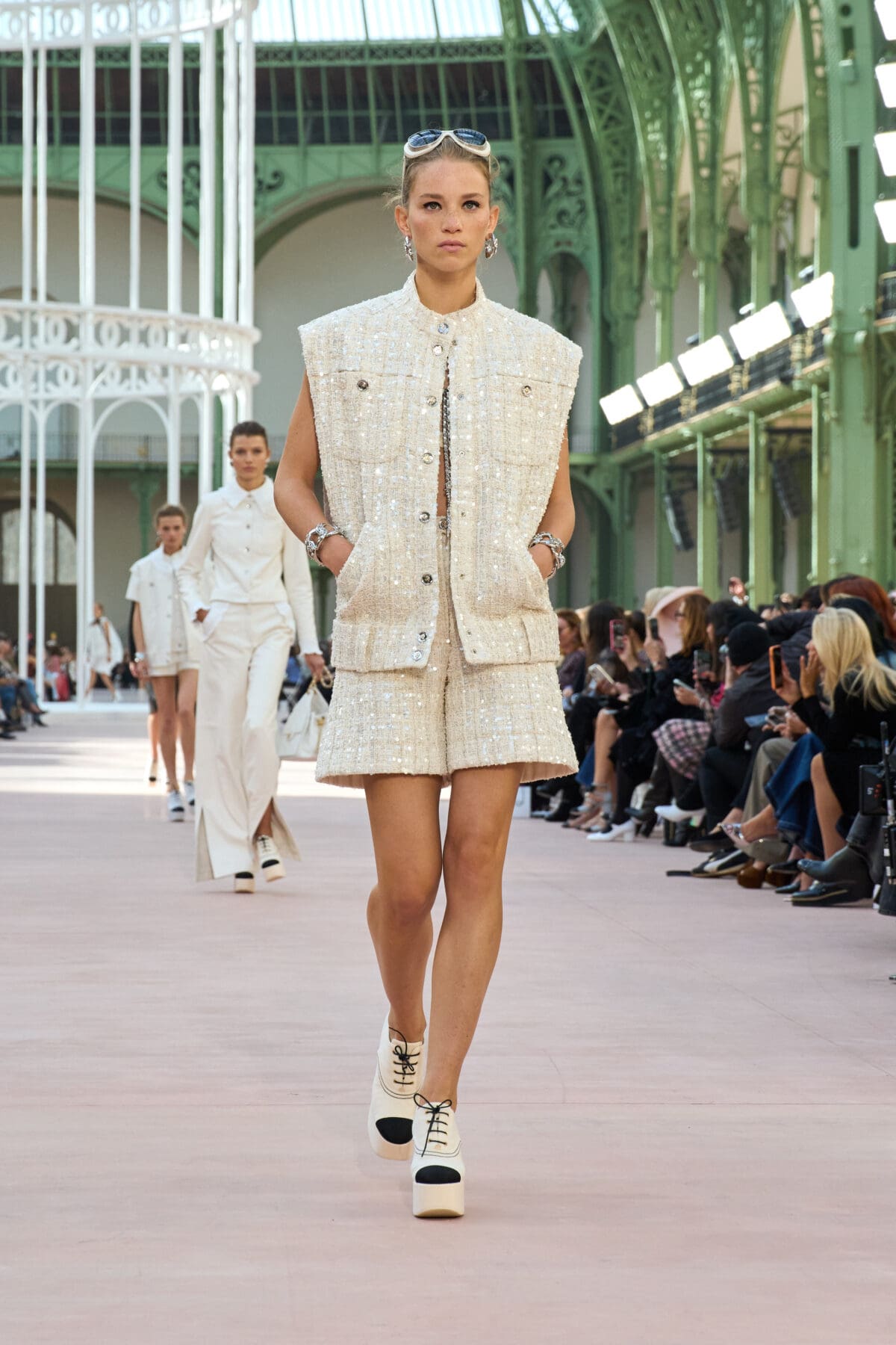 An enormous birdcage stood at the center of the Palais, a callback to a Jean-Paul Goude–directed, Vanessa Paradis–starring Chanel commercial circa 1991. The models crisscrossed the cage as they made their way back and forth around the nave, and the vast distances they walked were a visual reminder of the house’s long history. The creative team had ideas about how to keep its proprietary tweeds looking fresh: by using candy pastels or swapping the famous skirt suit for a shorts suit. There were surprises, too, like a black denim jacket and jeans, both embellished with shiny black sequins, which caught the casual way that the young women working at the “accessorization” in the atelier a couple of days before the show make Chanel every day and their own.