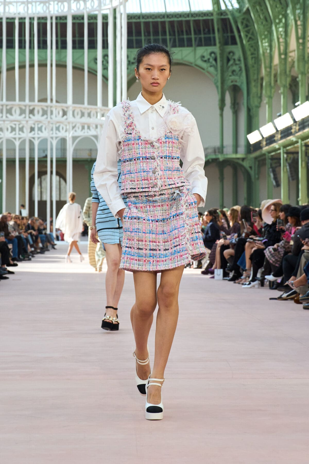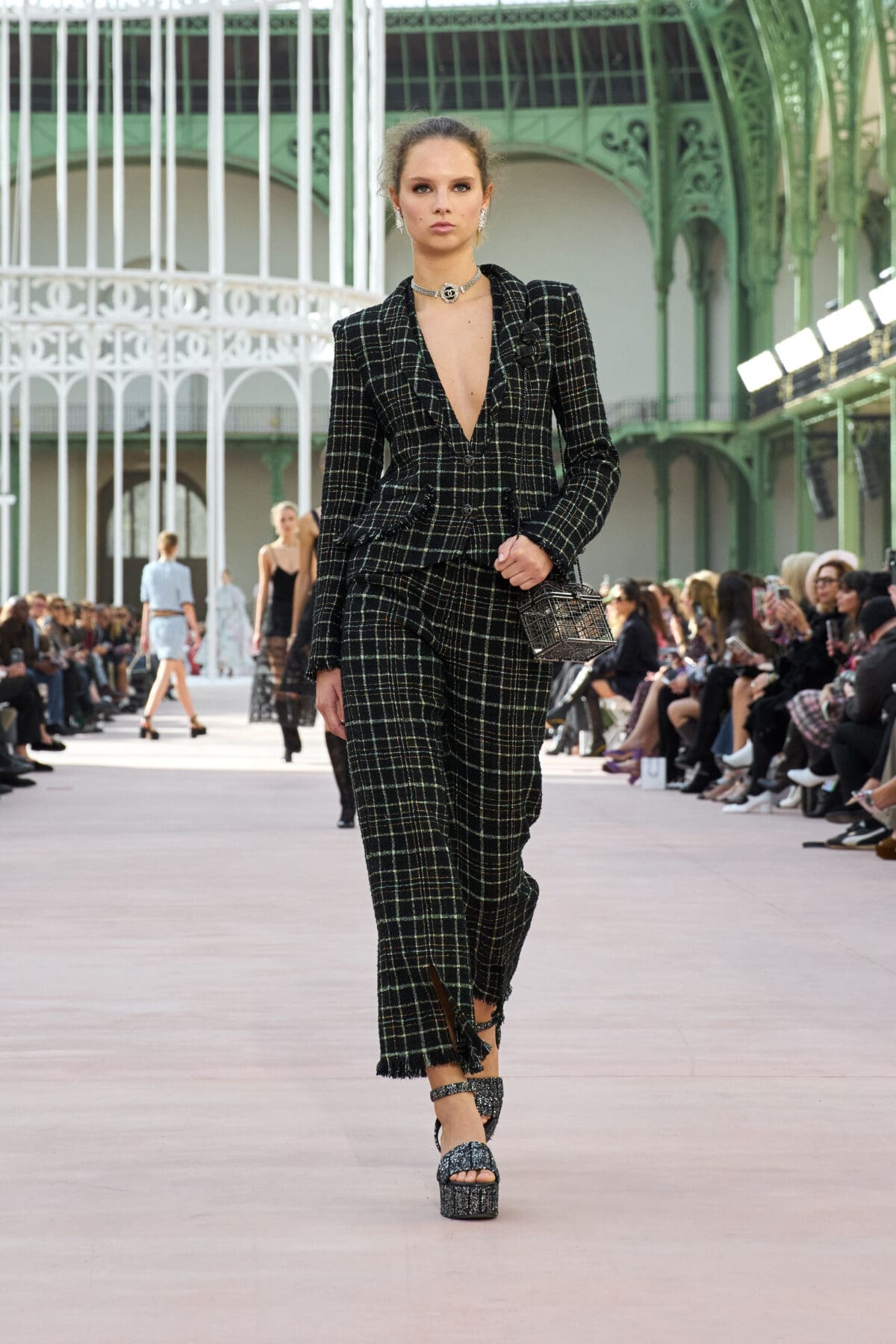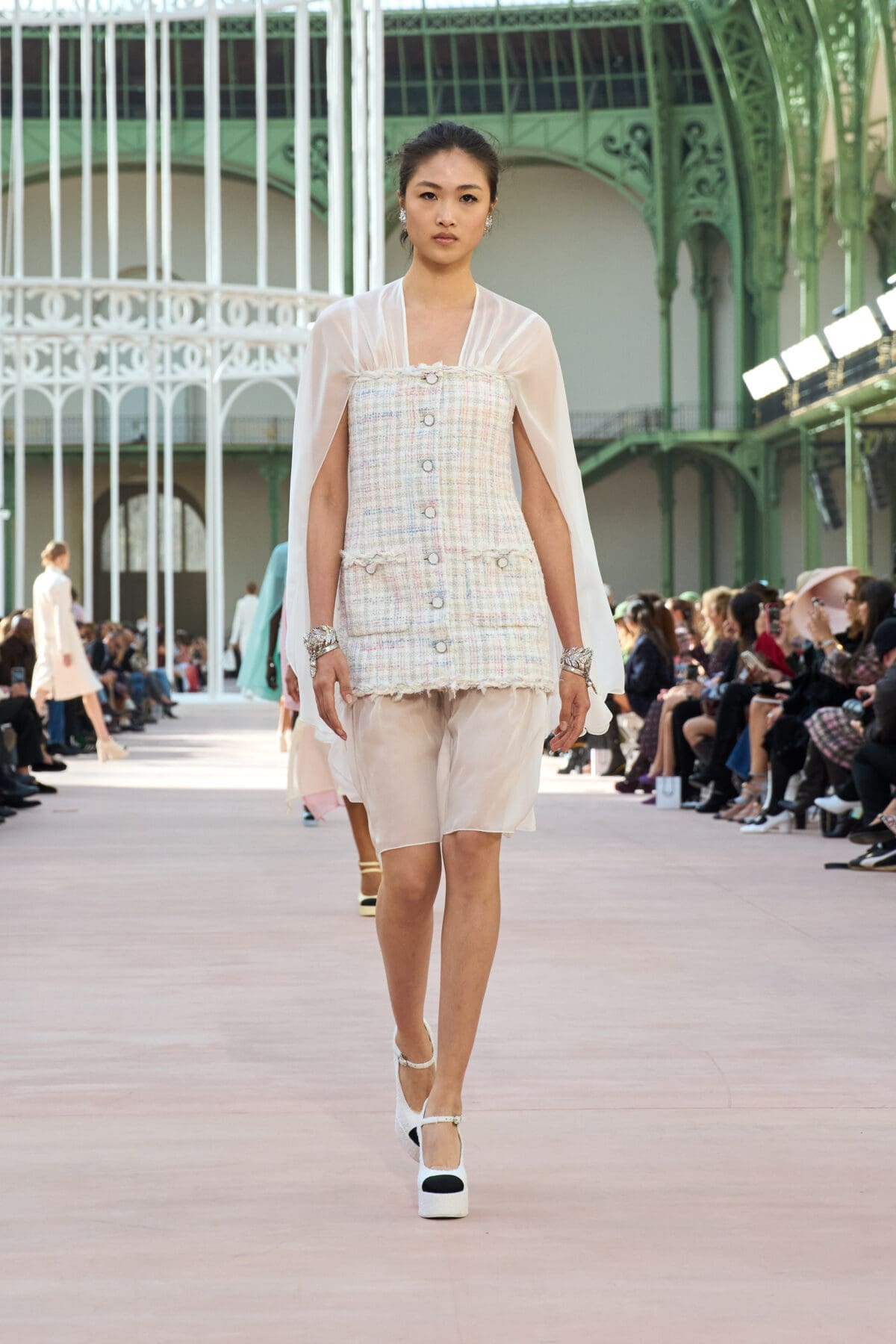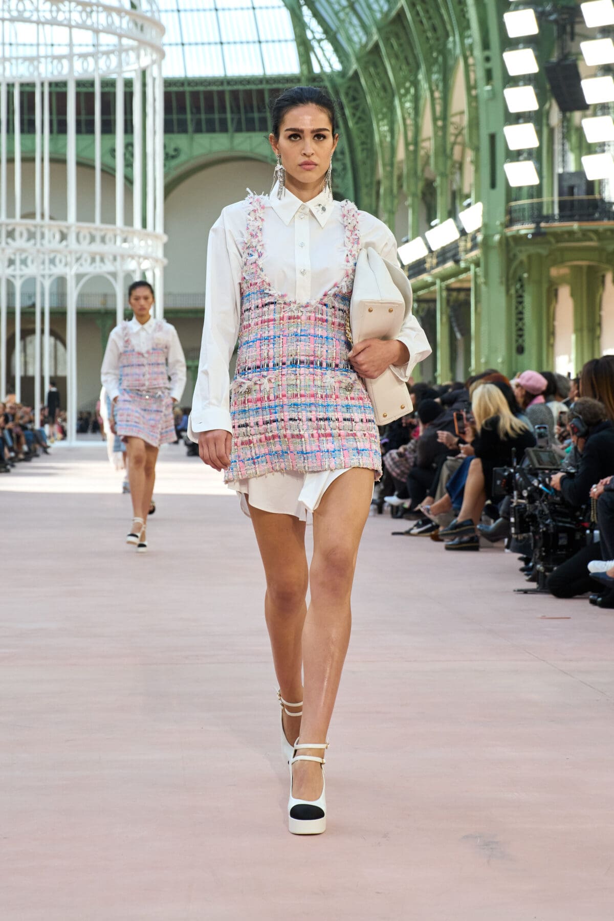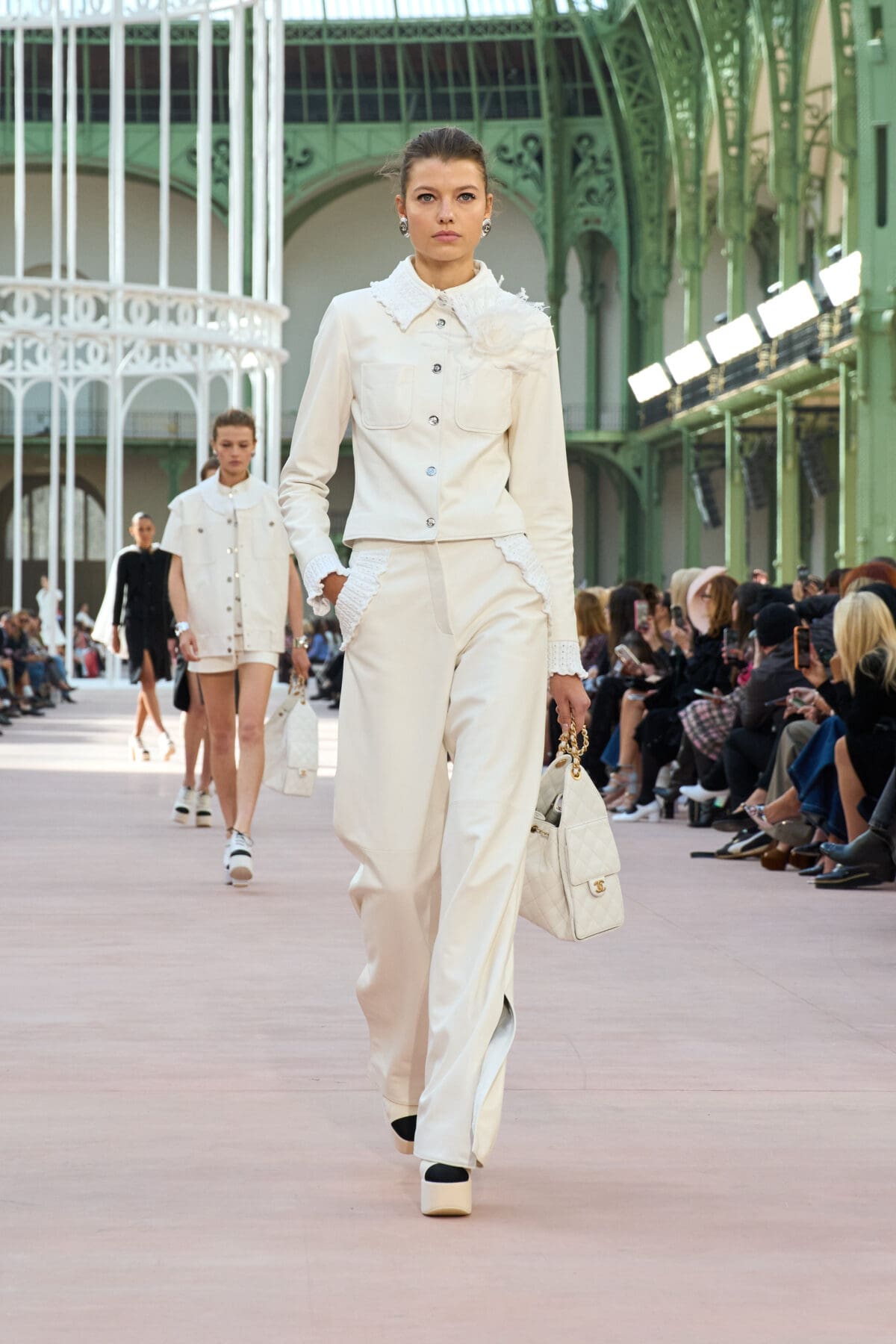 An enormous birdcage stood at the center of the Palais, a callback to a Jean-Paul Goude–directed, Vanessa Paradis–starring Chanel commercial circa 1991. The models crisscrossed the cage as they made their way back and forth around the nave, and the vast distances they walked were a visual reminder of the house’s long history. The creative team had ideas about how to keep its proprietary tweeds looking fresh: by using candy pastels or swapping the famous skirt suit for a shorts suit. There were surprises, too, like a black denim jacket and jeans, both embellished with shiny black sequins, which caught the casual way that the young women working at the “accessorization” in the atelier a couple of days before the show make Chanel every day and their own.