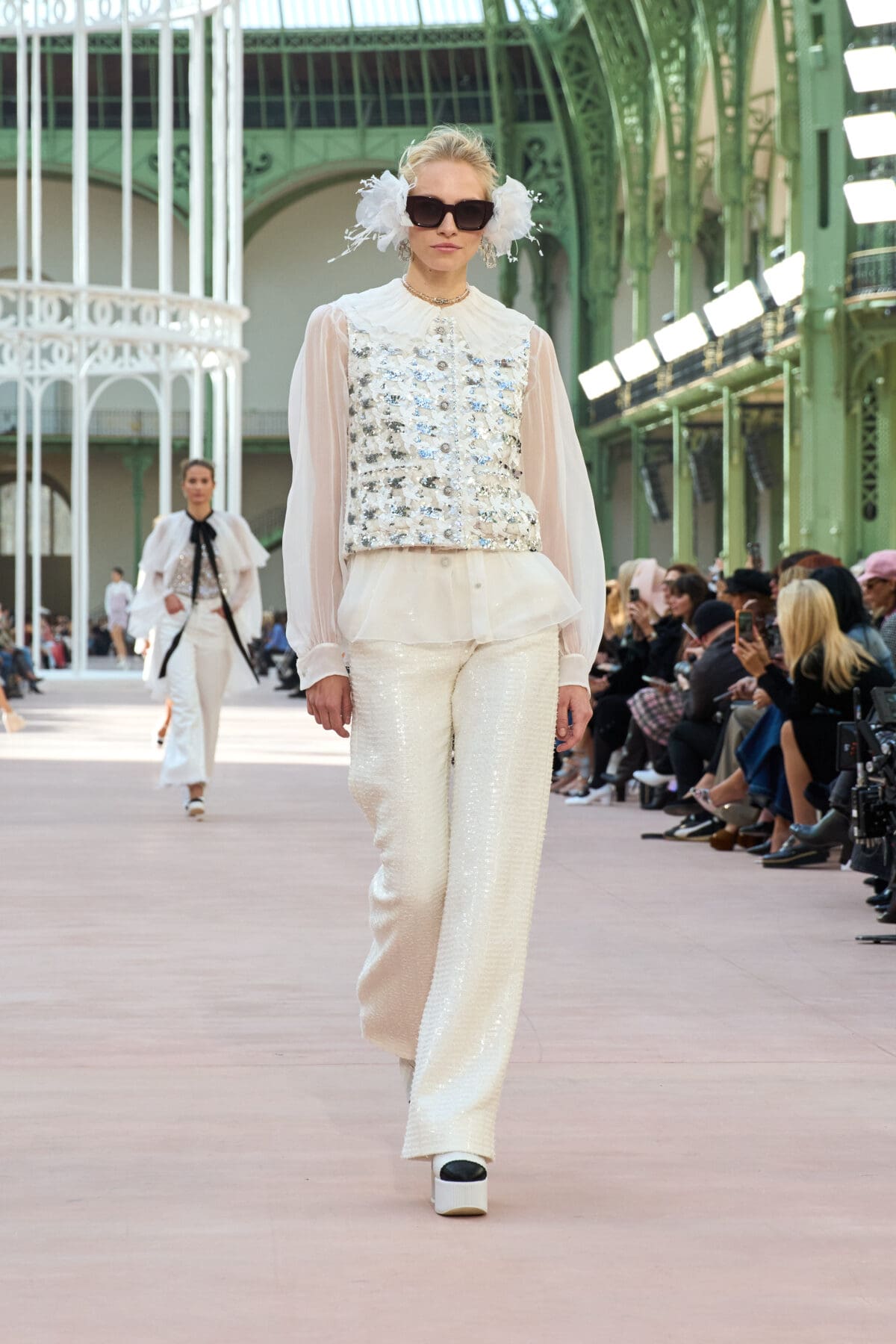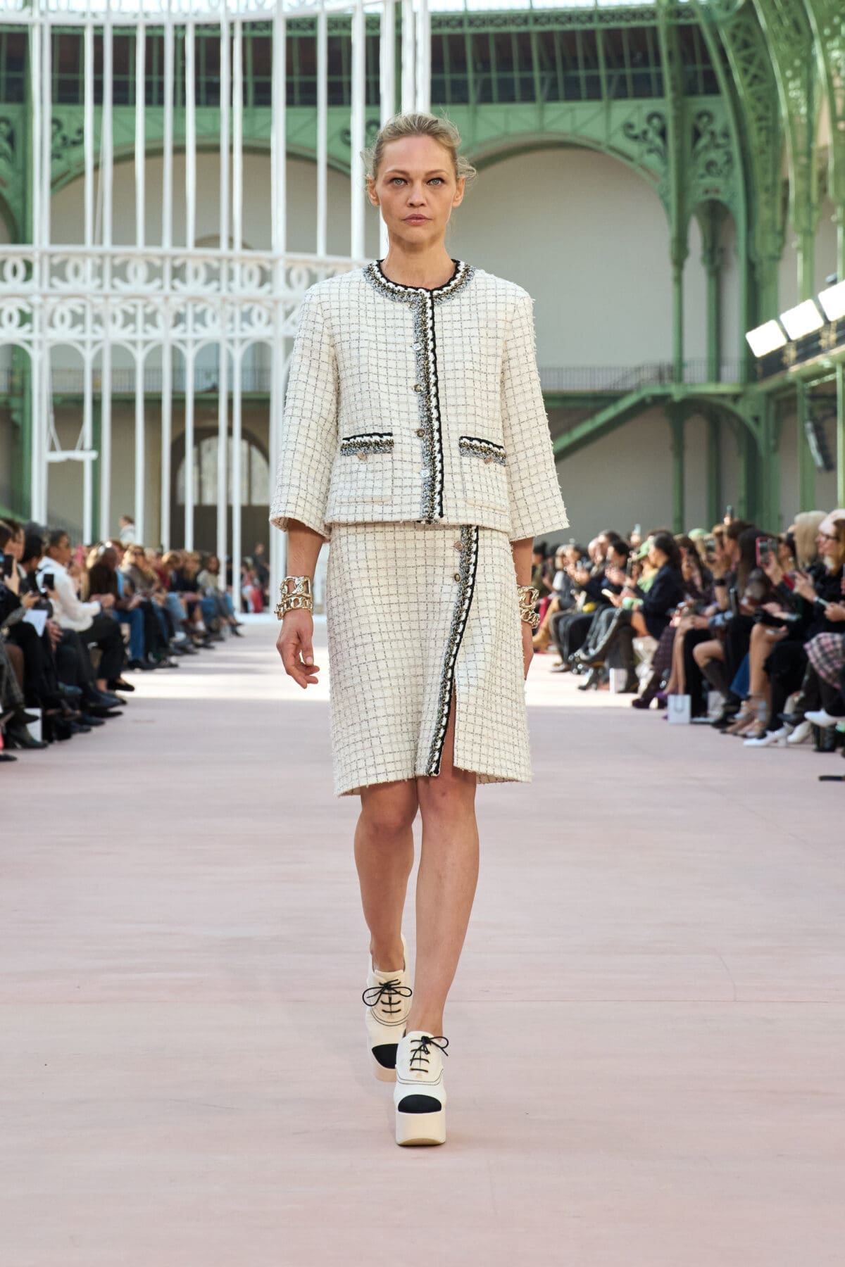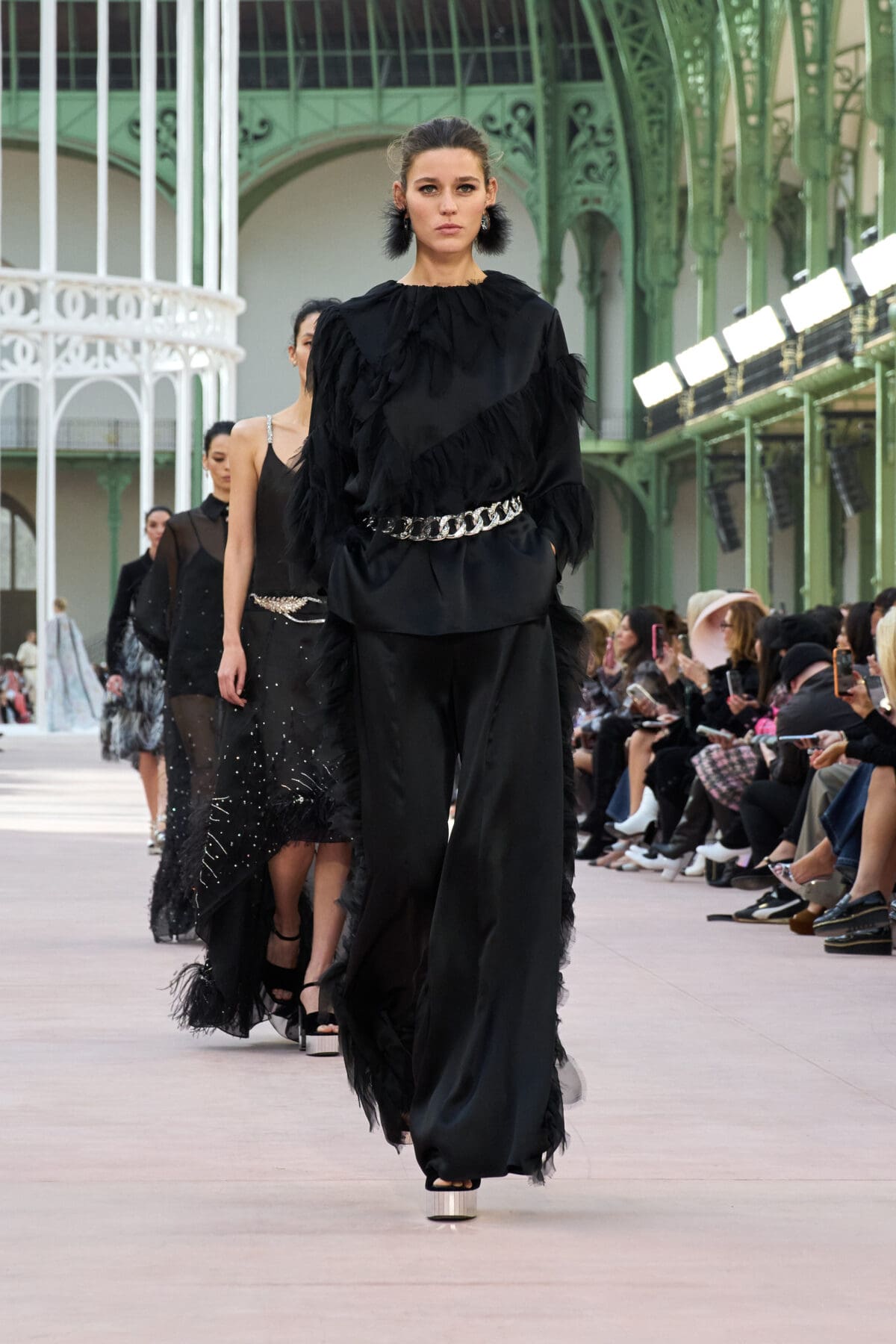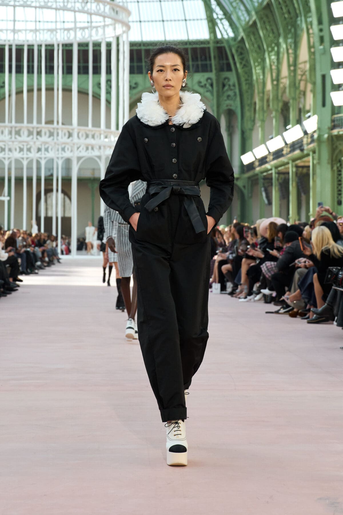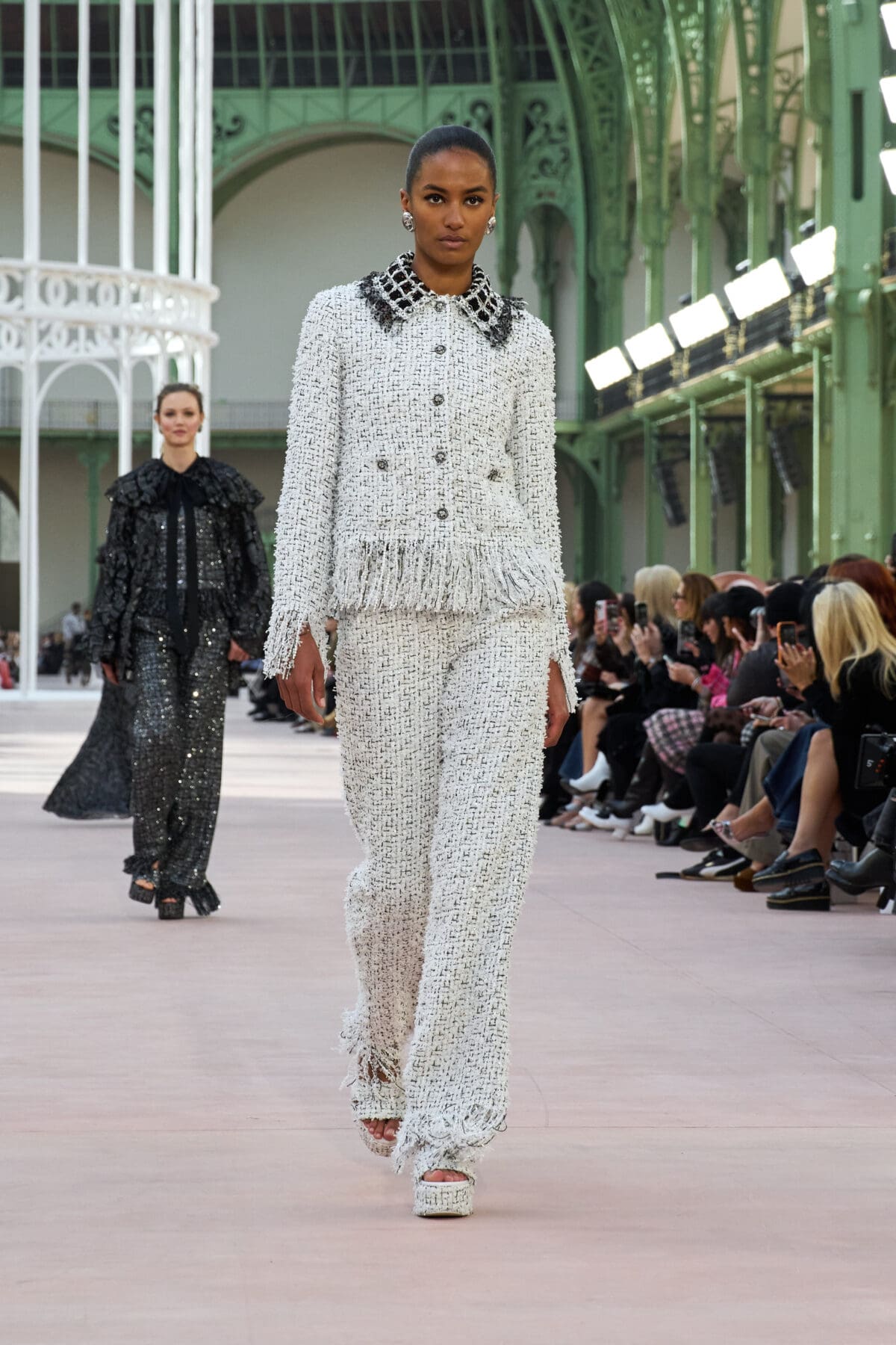 An enormous birdcage stood at the center of the Palais, a callback to a Jean-Paul Goude–directed, Vanessa Paradis–starring Chanel commercial circa 1991. The models crisscrossed the cage as they made their way back and forth around the nave, and the vast distances they walked were a visual reminder of the house’s long history. The creative team had ideas about how to keep its proprietary tweeds looking fresh: by using candy pastels or swapping the famous skirt suit for a shorts suit. There were surprises, too, like a black denim jacket and jeans, both embellished with shiny black sequins, which caught the casual way that the young women working at the “accessorization” in the atelier a couple of days before the show make Chanel every day and their own.