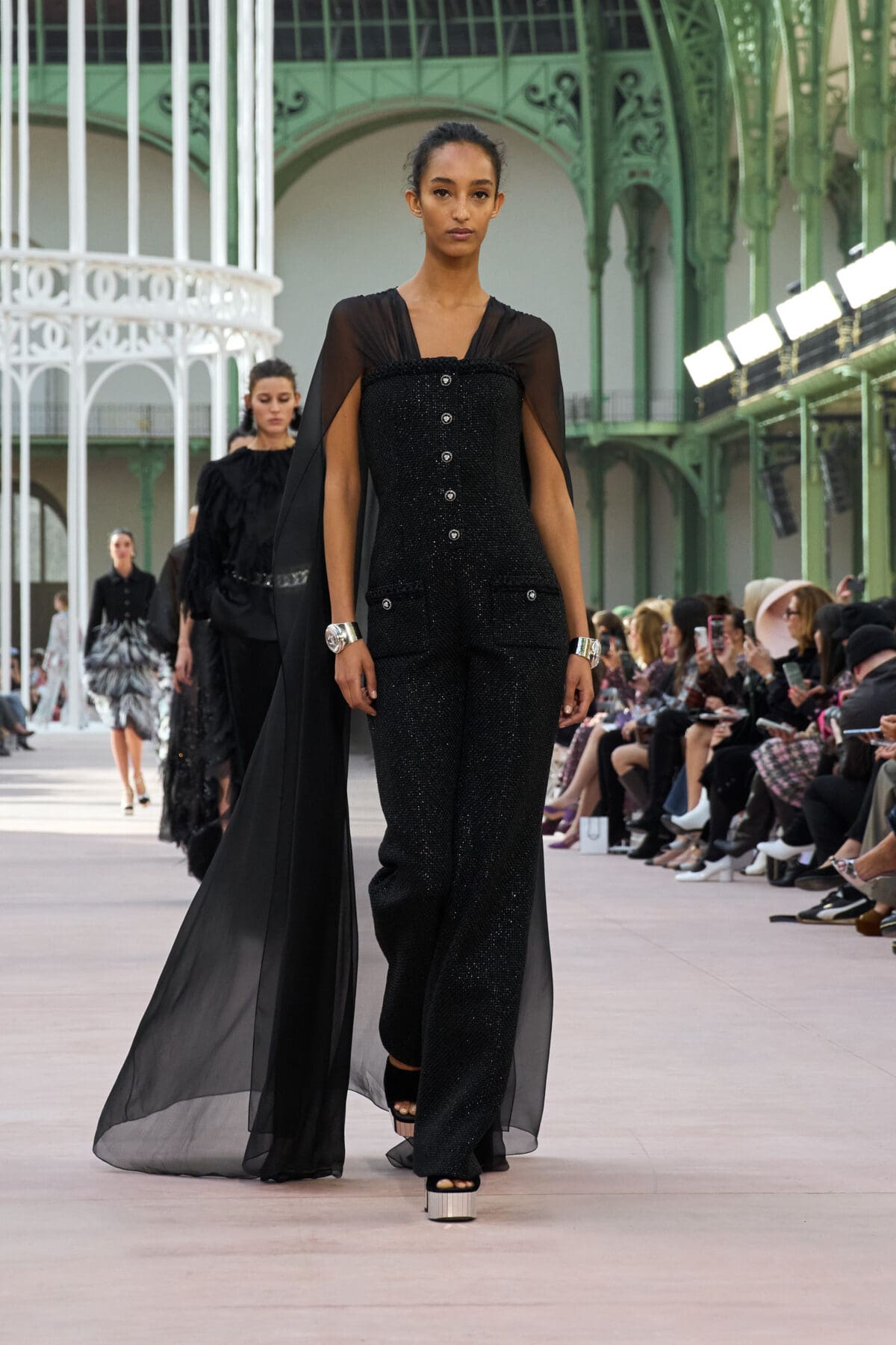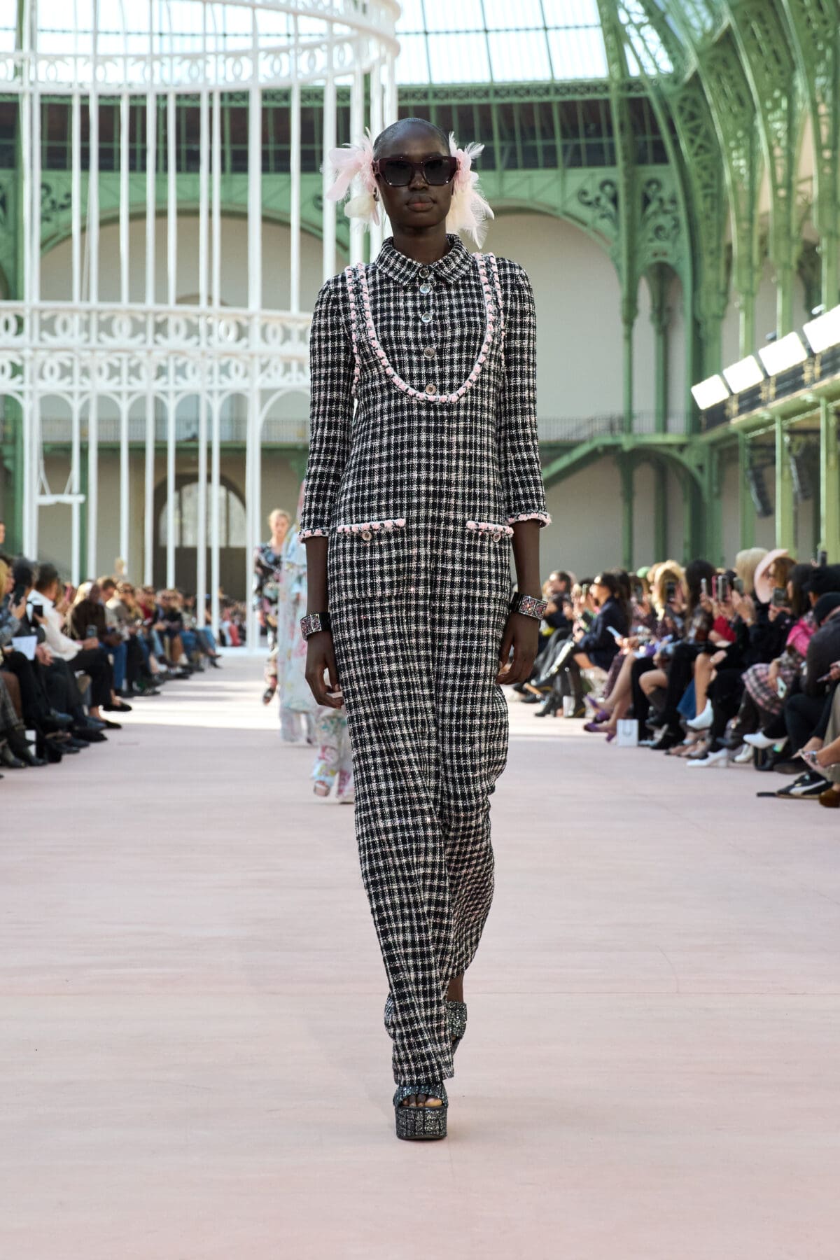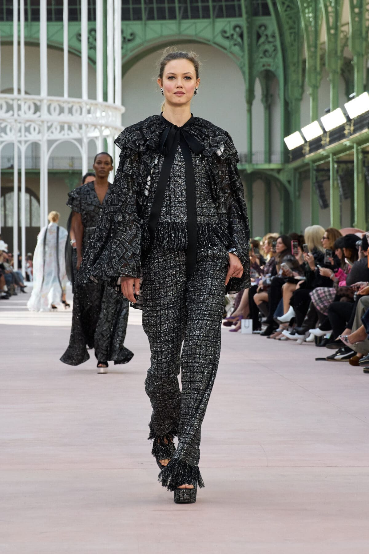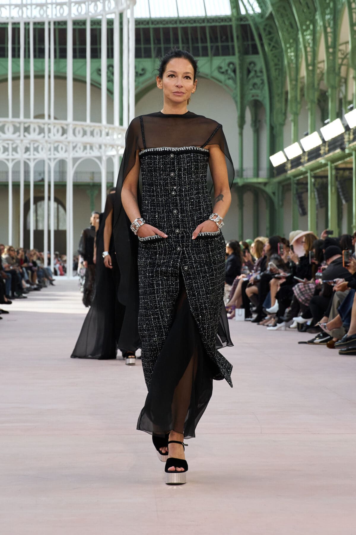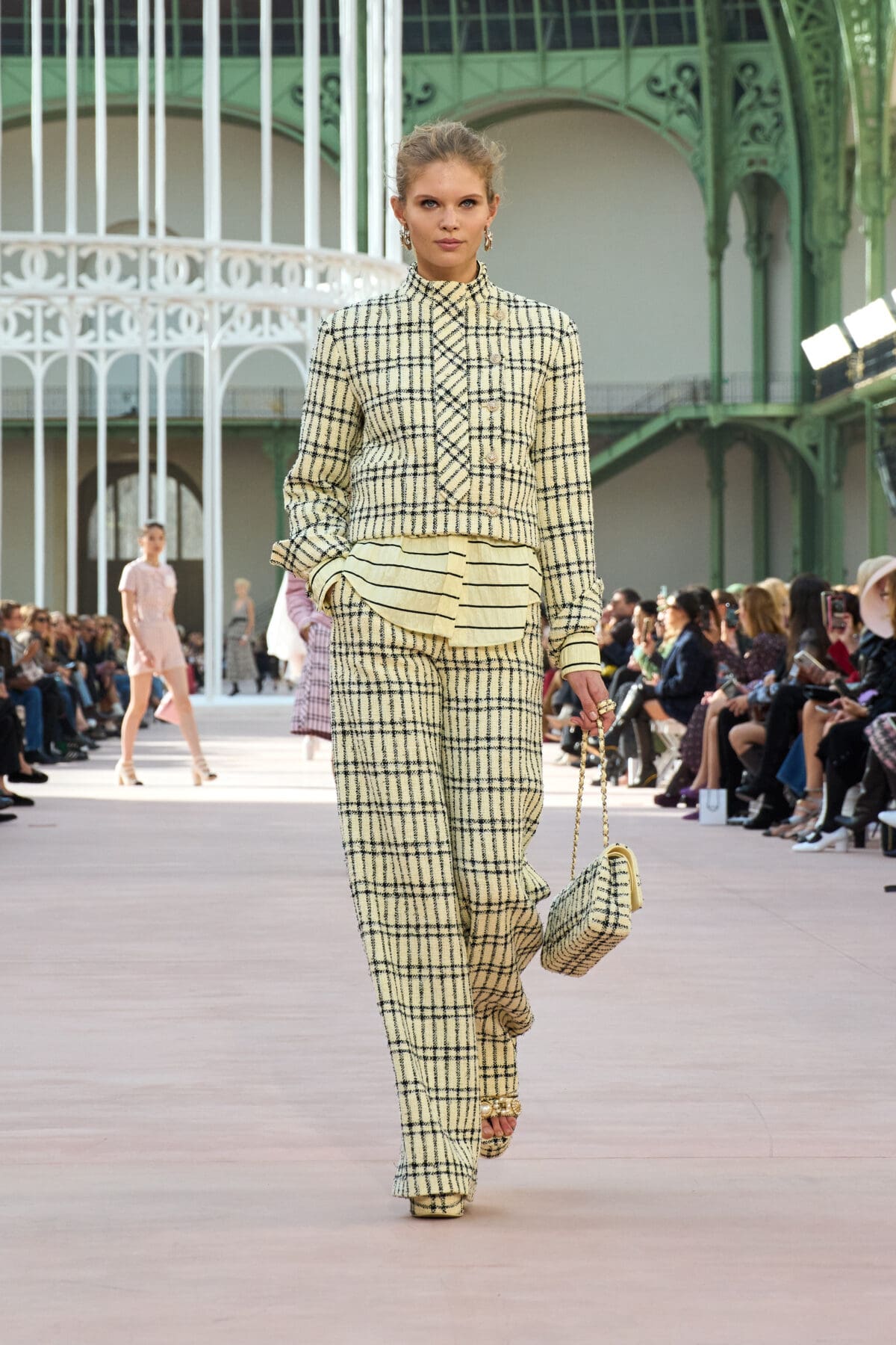An enormous birdcage stood at the center of the Palais, a callback to a Jean-Paul Goude–directed, Vanessa Paradis–starring Chanel commercial circa 1991. The models crisscrossed the cage as they made their way back and forth around the nave, and the vast distances they walked were a visual reminder of the house’s long history. The creative team had ideas about how to keep its proprietary tweeds looking fresh: by using candy pastels or swapping the famous skirt suit for a shorts suit. There were surprises, too, like a black denim jacket and jeans, both embellished with shiny black sequins, which caught the casual way that the young women working at the “accessorization” in the atelier a couple of days before the show make Chanel every day and their own.