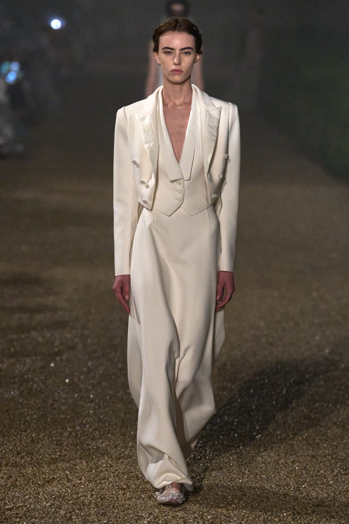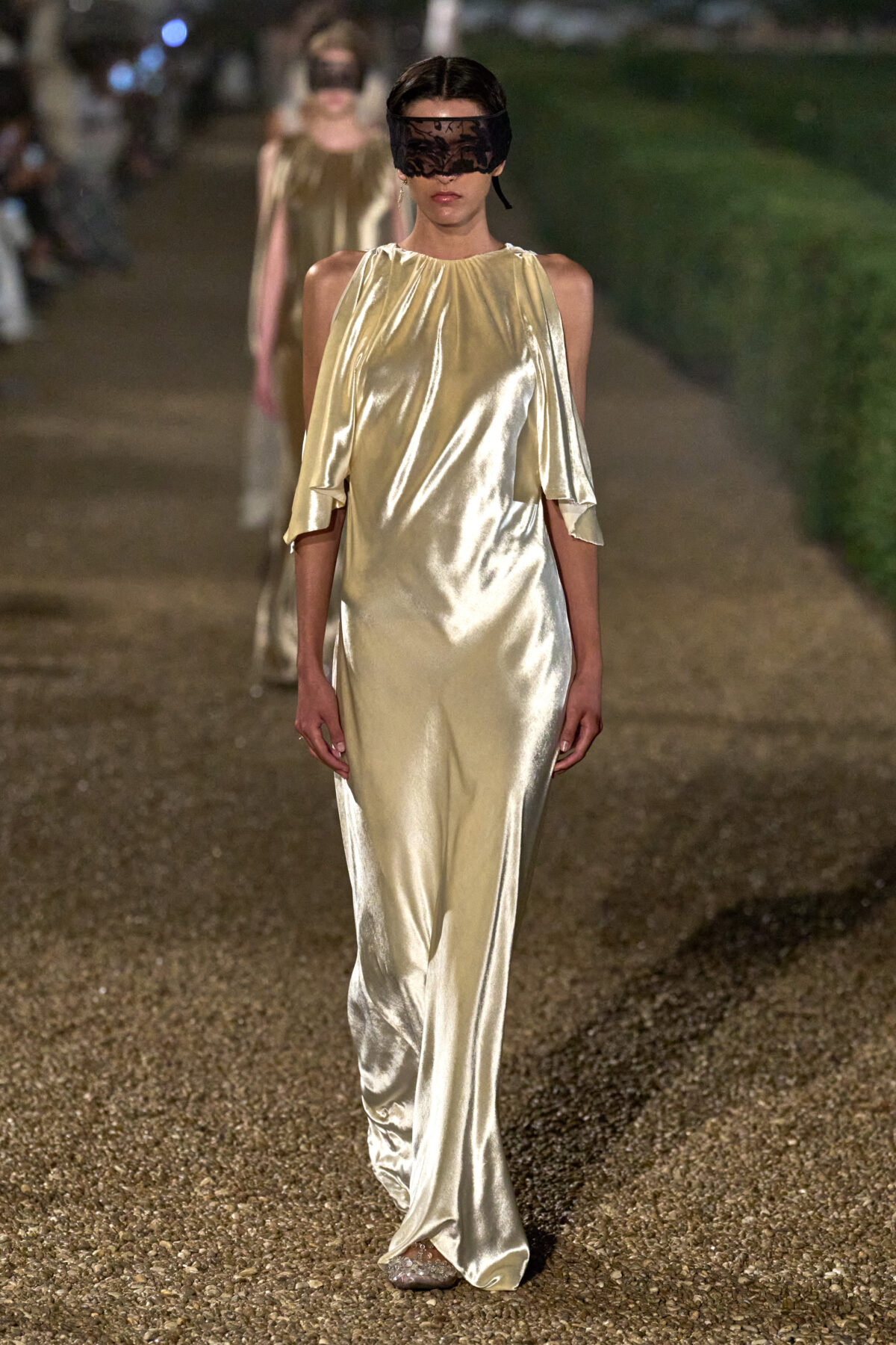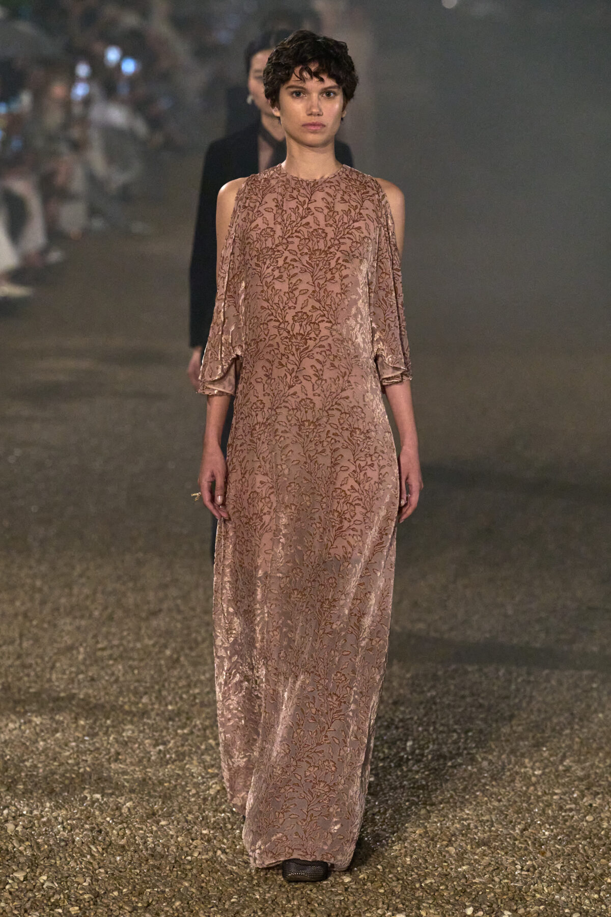 In fact, what we got from Chiuri was a resort show with a couture collection mixed in with it, for the most part wispily romantic and fragile-seeming. Emphasis on the ‘seeming,’ that is. To the designer, it was an enactment shot through with autobiographical meaning, cultural nuance—a bit of nonsense frivolity—and historical symbolism. And—she was laughing about this in the tented backstage area beforehand—it was deliberately intended to confuse. La Bella Confusione, a novel set in 1960s Rome was one starting point out of the many she infused into this show and its production. “A beautiful confusion,” she chuckled.