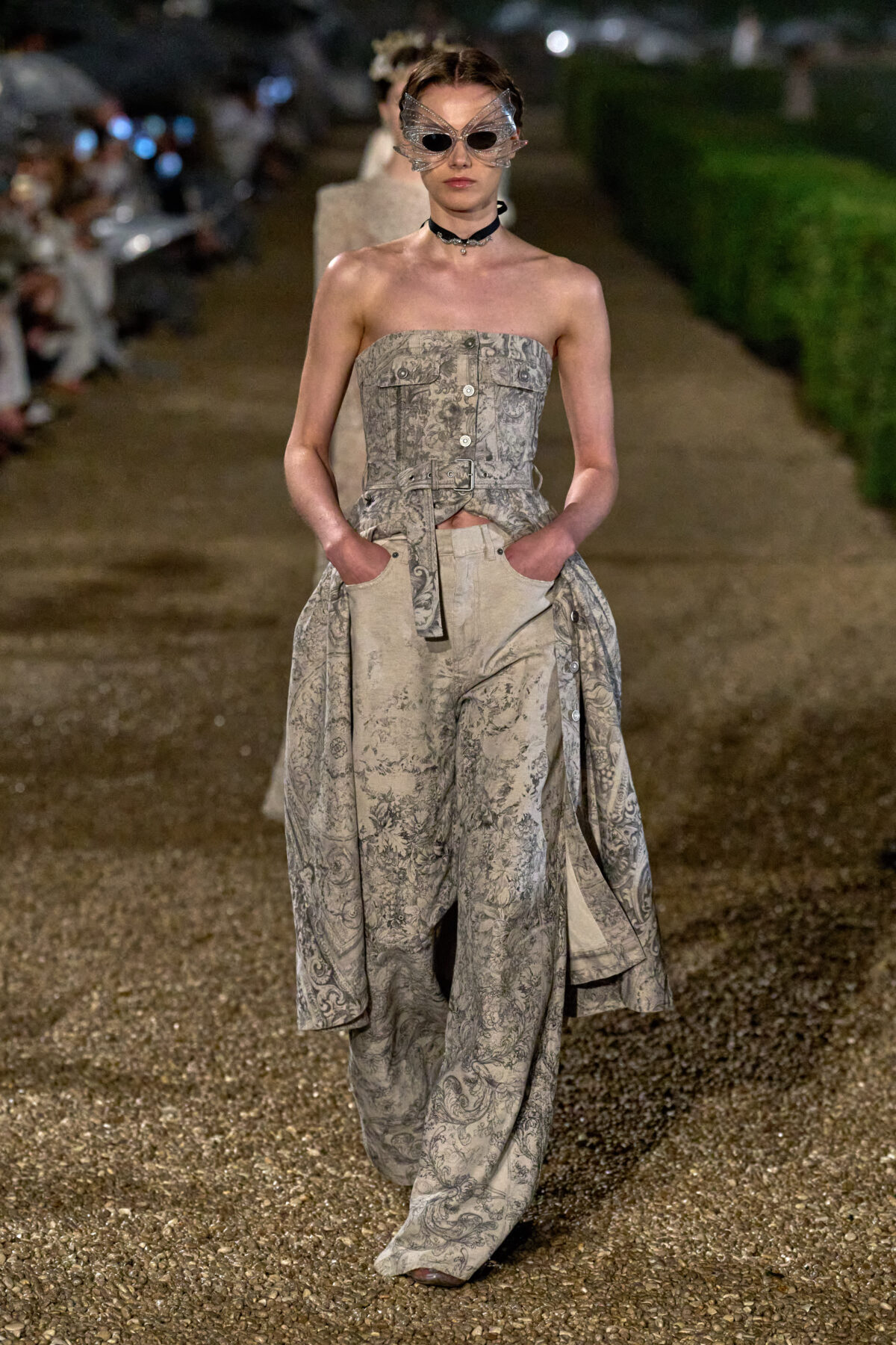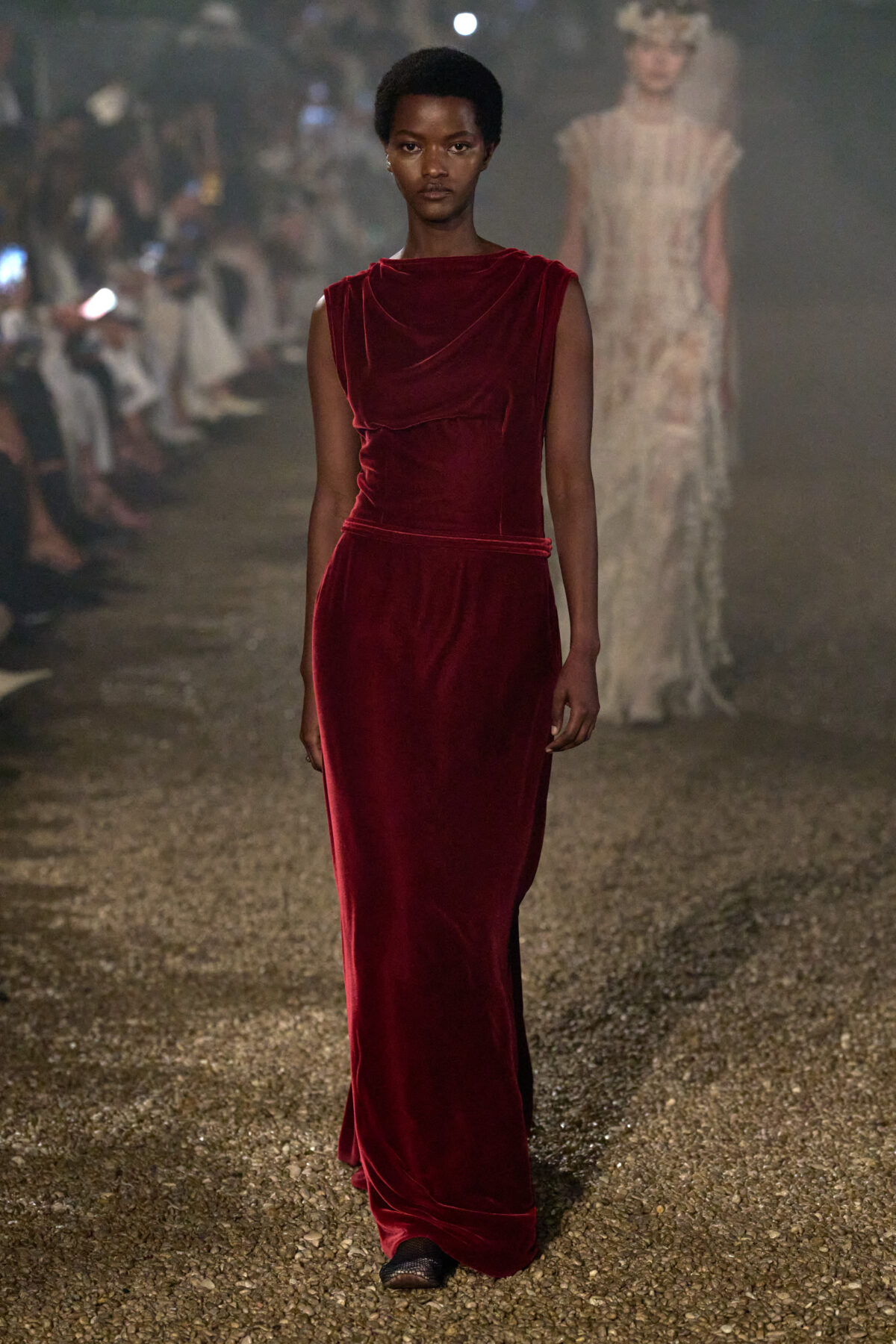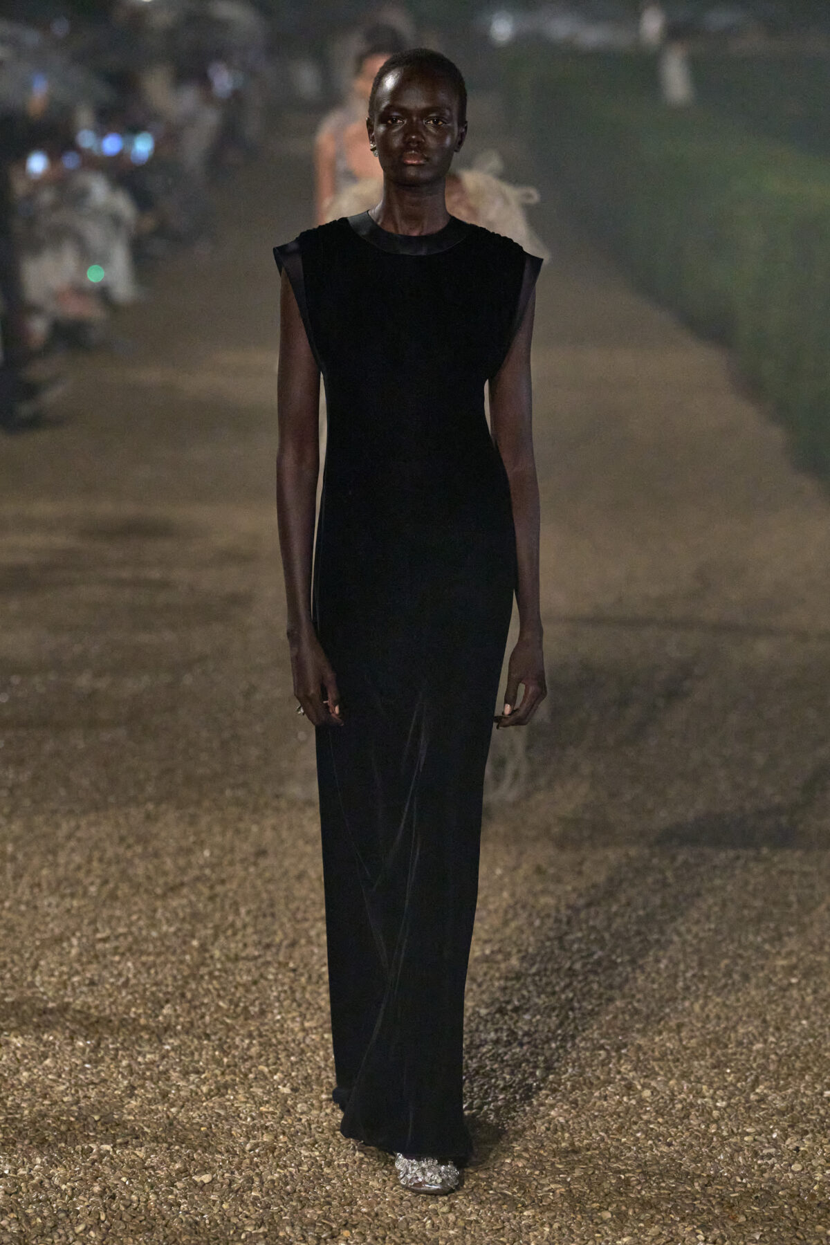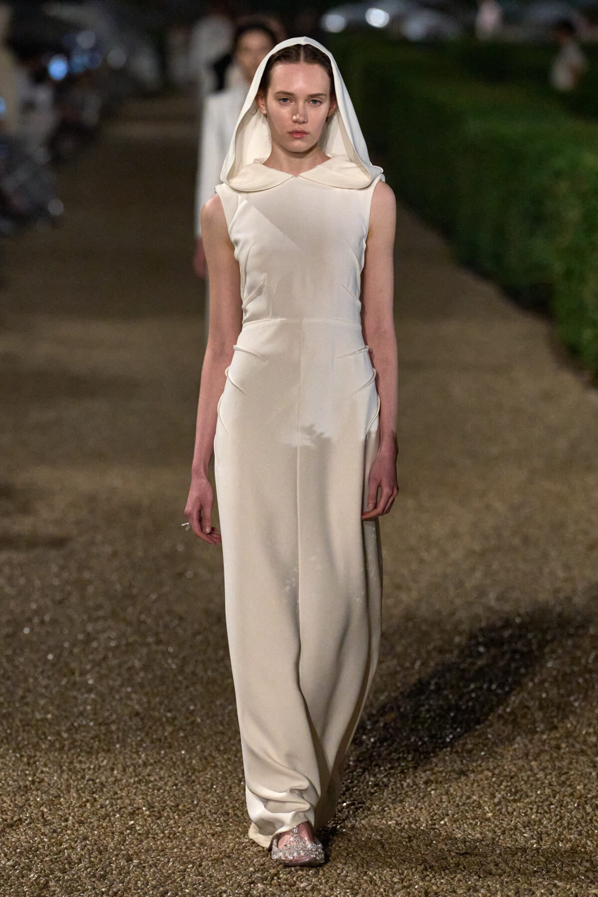 In fact, what we got from Chiuri was a resort show with a couture collection mixed in with it, for the most part wispily romantic and fragile-seeming. Emphasis on the ‘seeming,’ that is. To the designer, it was an enactment shot through with autobiographical meaning, cultural nuance—a bit of nonsense frivolity—and historical symbolism. And—she was laughing about this in the tented backstage area beforehand—it was deliberately intended to confuse. La Bella Confusione, a novel set in 1960s Rome was one starting point out of the many she infused into this show and its production. “A beautiful confusion,” she chuckled.