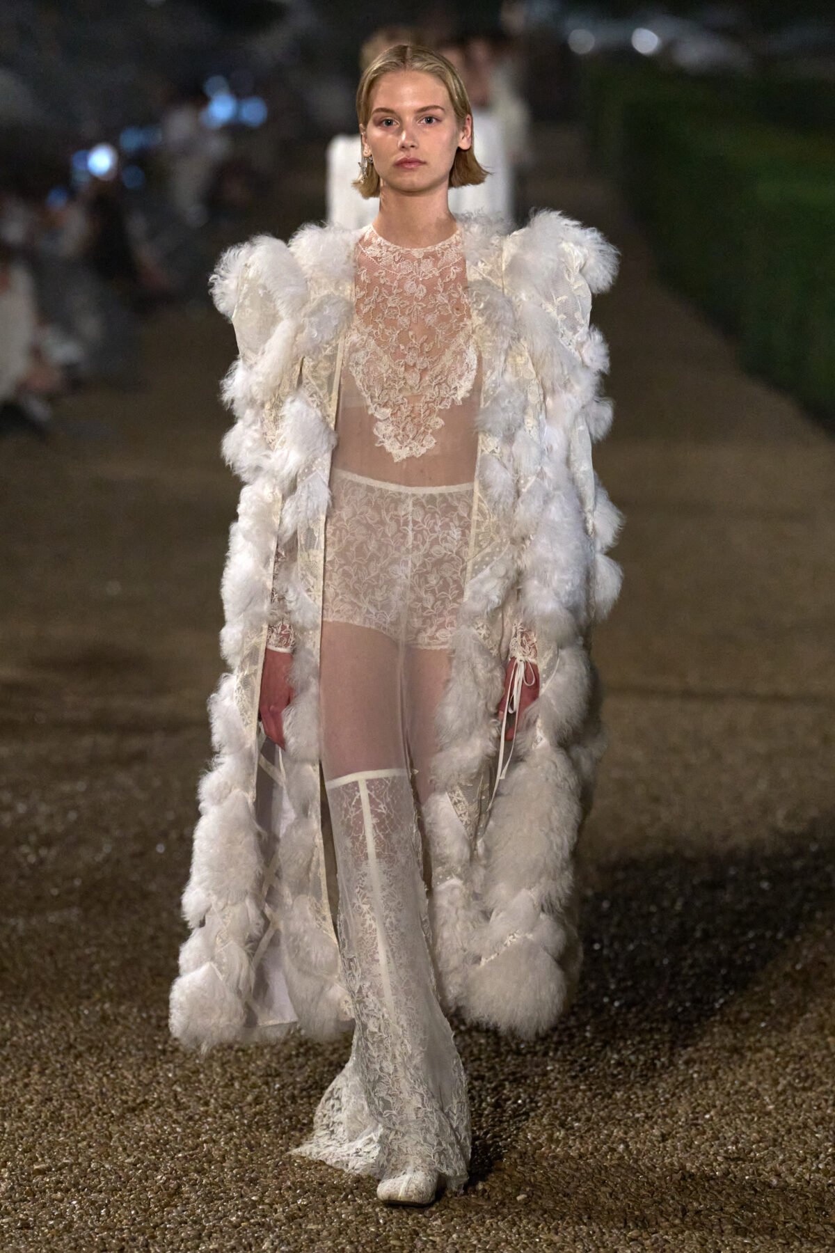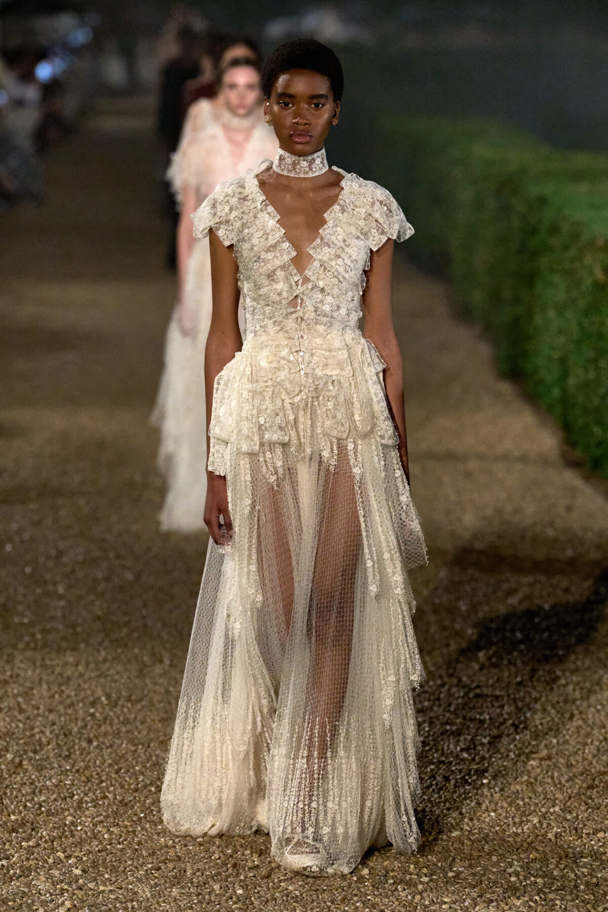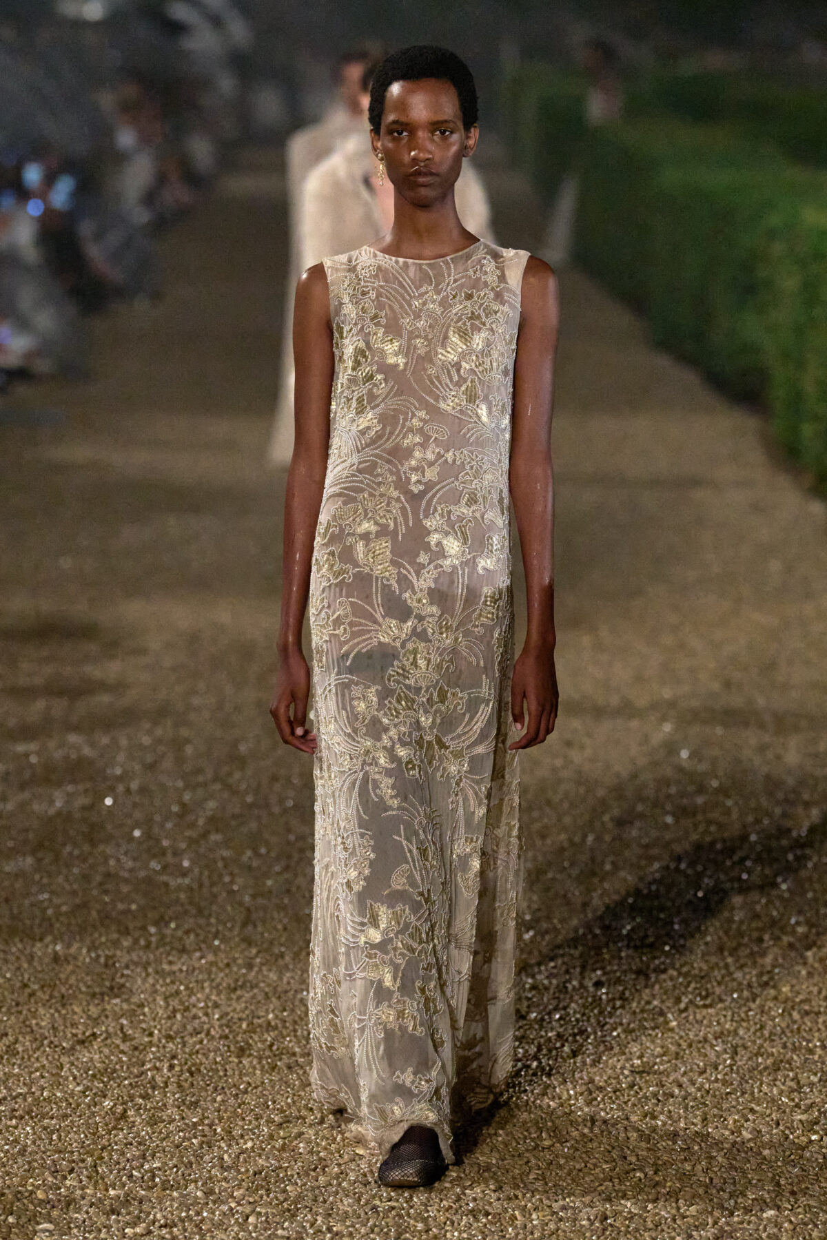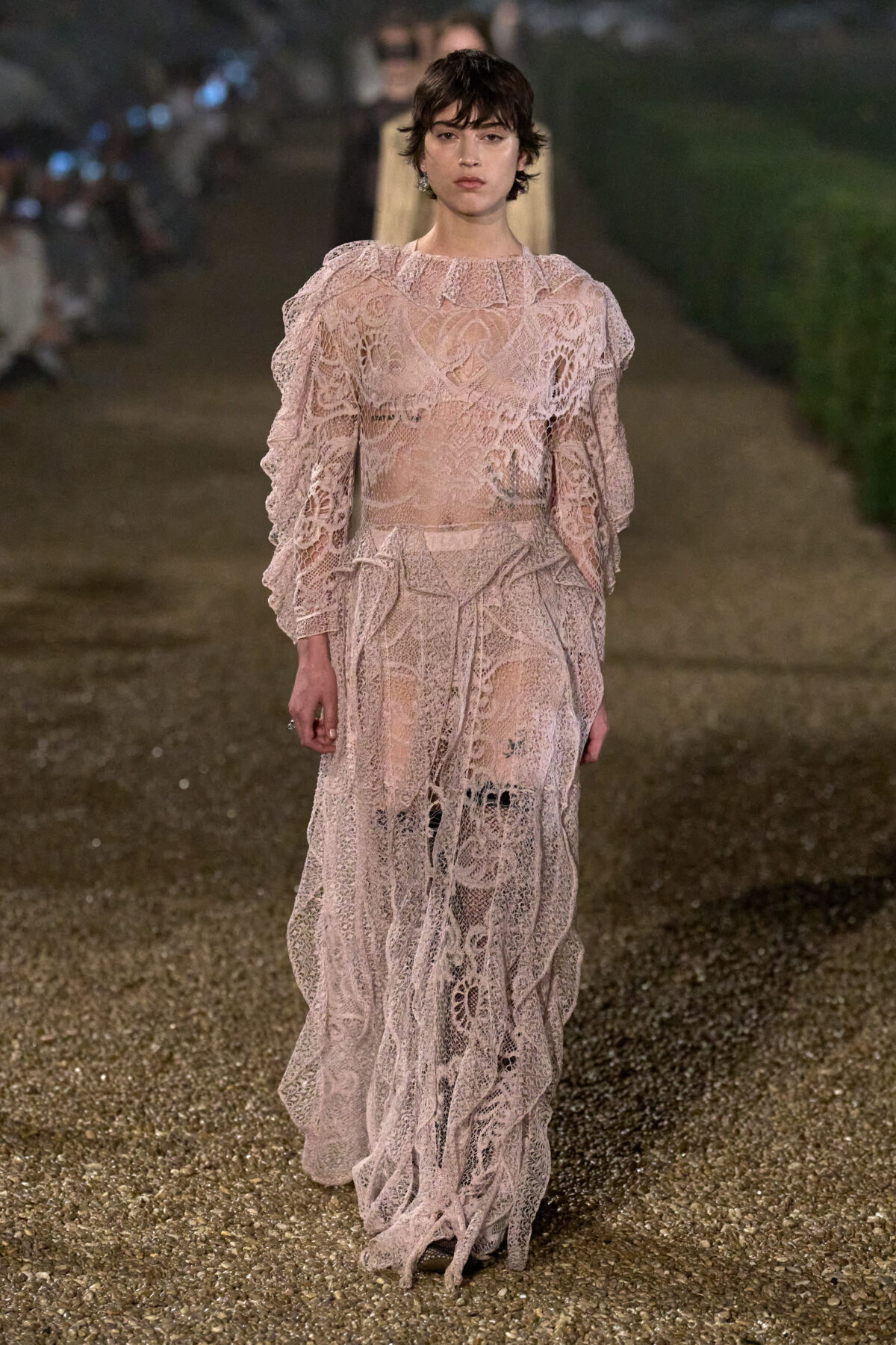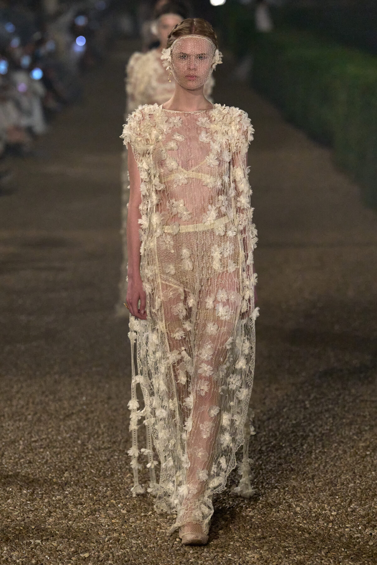 Which was why we began by looking at four long, slim, beautifully tailored double-faced cashmere ensembles—one of them a trouser suit and tailcoat. “These are haute couture,” she said. “You can only make these by hand. Some of the simplest things are the most difficult to make.” This ideal, minimalist yet sumptuous simplicity was followed by many variations on the theme of the long, slim, semi-sheer dress. The lace effects were almost countless—3D florals, rivulets of ruffles, leafy cut-outs, wavy art deco frills, gilded latticework covered with silken fringe—and more, and more. Underwear visible, shoes flat.