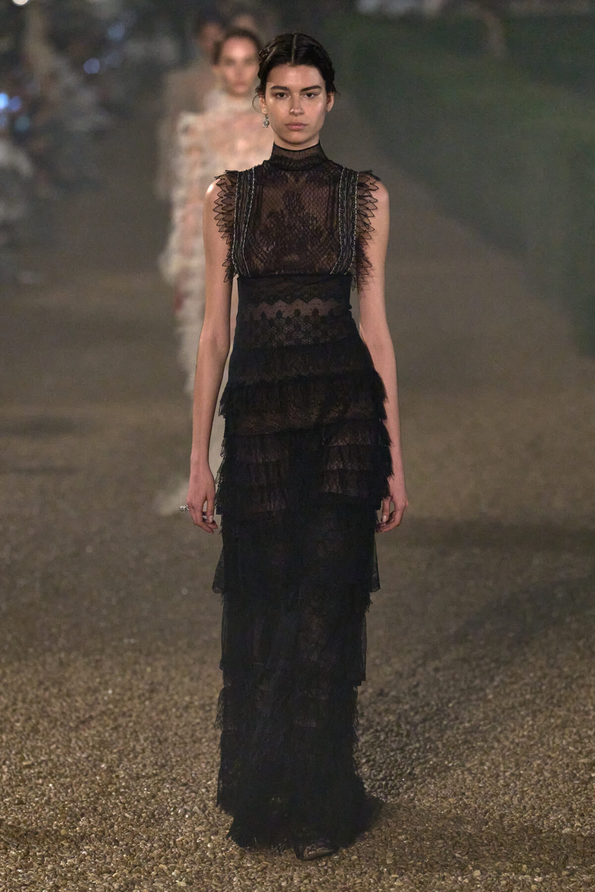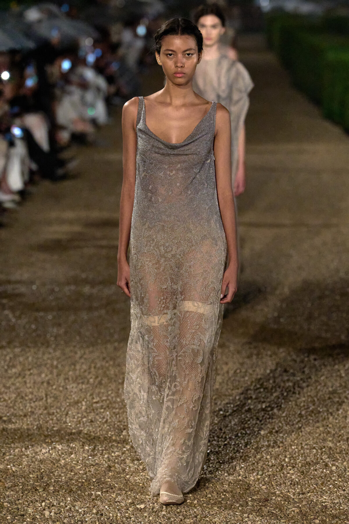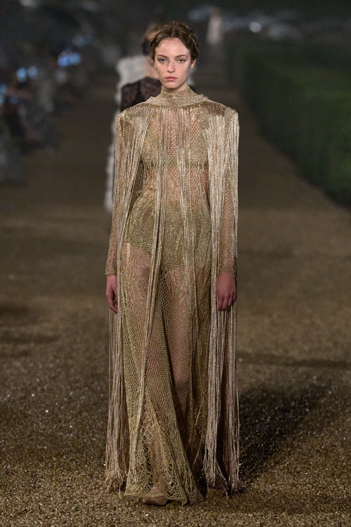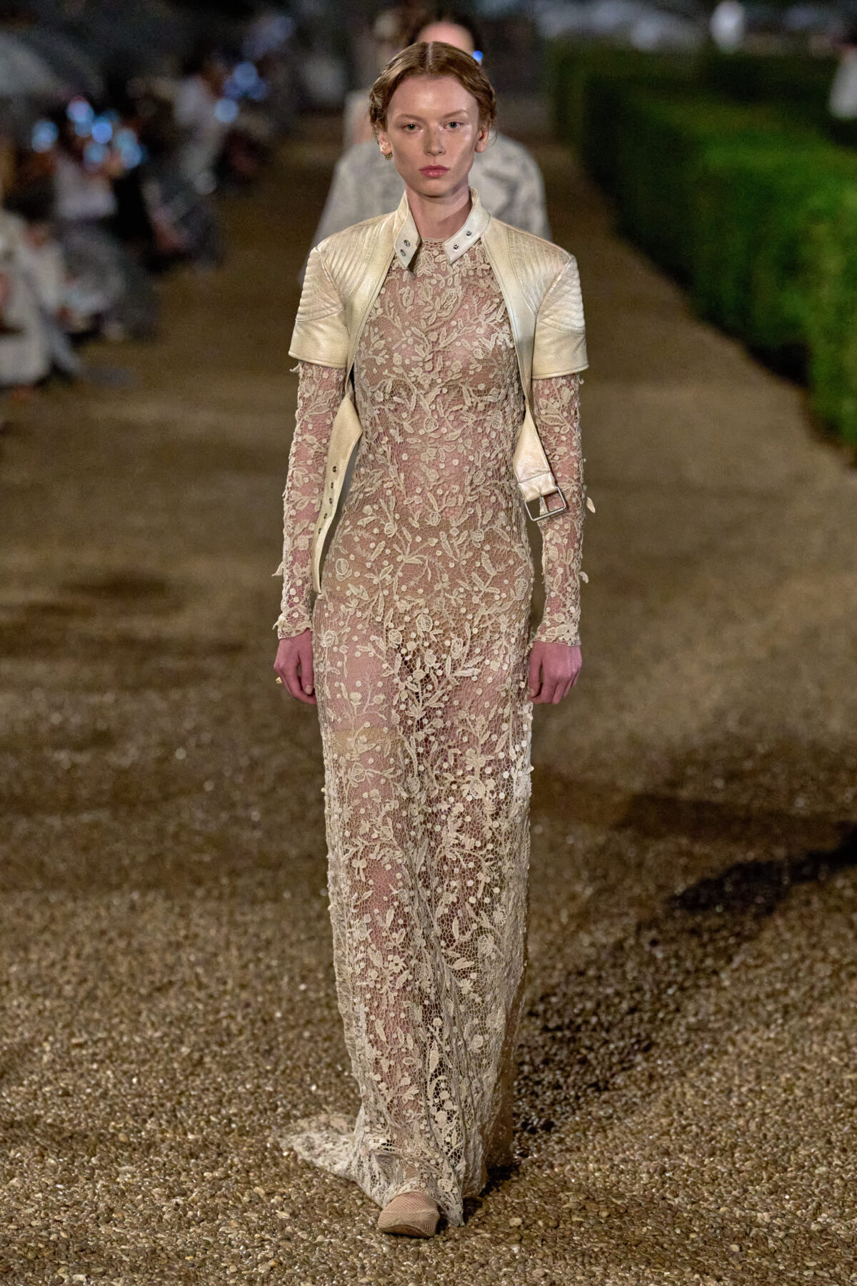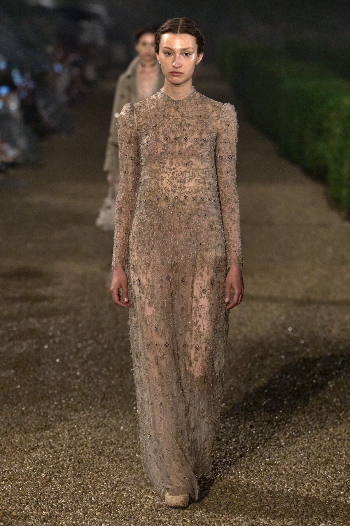 Which was why we began by looking at four long, slim, beautifully tailored double-faced cashmere ensembles—one of them a trouser suit and tailcoat. “These are haute couture,” she said. “You can only make these by hand. Some of the simplest things are the most difficult to make.” This ideal, minimalist yet sumptuous simplicity was followed by many variations on the theme of the long, slim, semi-sheer dress. The lace effects were almost countless—3D florals, rivulets of ruffles, leafy cut-outs, wavy art deco frills, gilded latticework covered with silken fringe—and more, and more. Underwear visible, shoes flat.