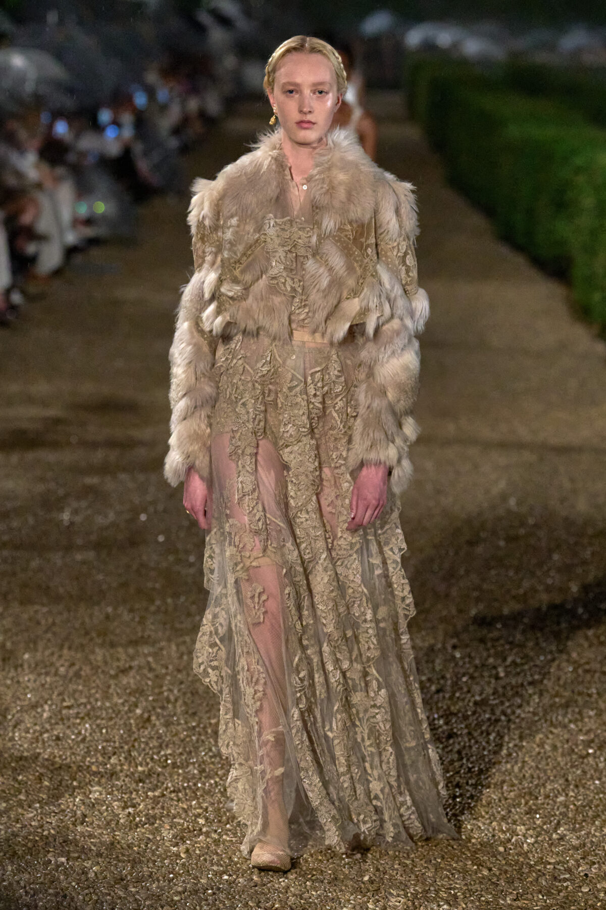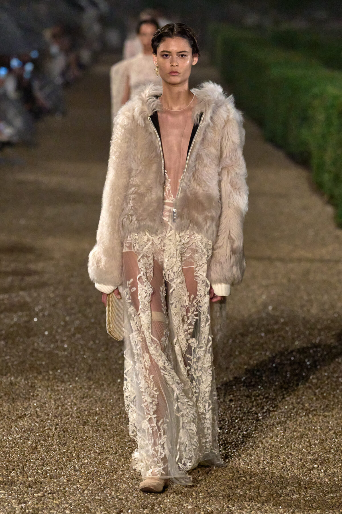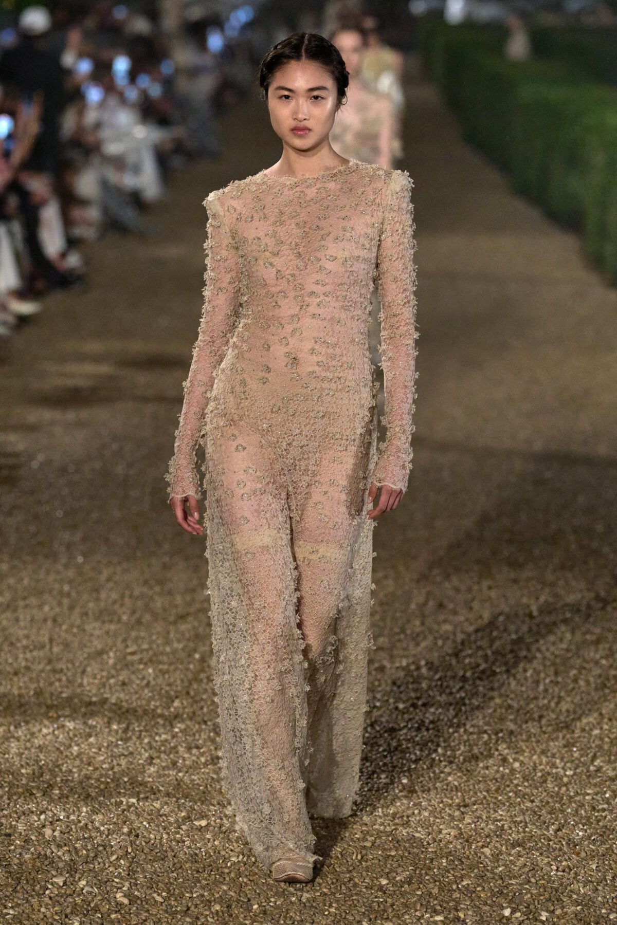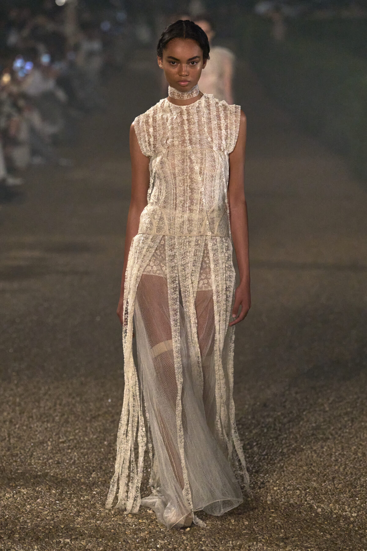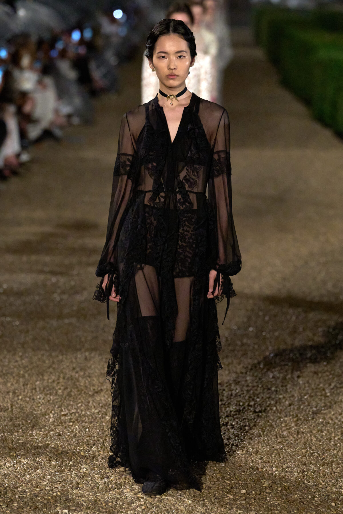 Which was why we began by looking at four long, slim, beautifully tailored double-faced cashmere ensembles—one of them a trouser suit and tailcoat. “These are haute couture,” she said. “You can only make these by hand. Some of the simplest things are the most difficult to make.” This ideal, minimalist yet sumptuous simplicity was followed by many variations on the theme of the long, slim, semi-sheer dress. The lace effects were almost countless—3D florals, rivulets of ruffles, leafy cut-outs, wavy art deco frills, gilded latticework covered with silken fringe—and more, and more. Underwear visible, shoes flat.