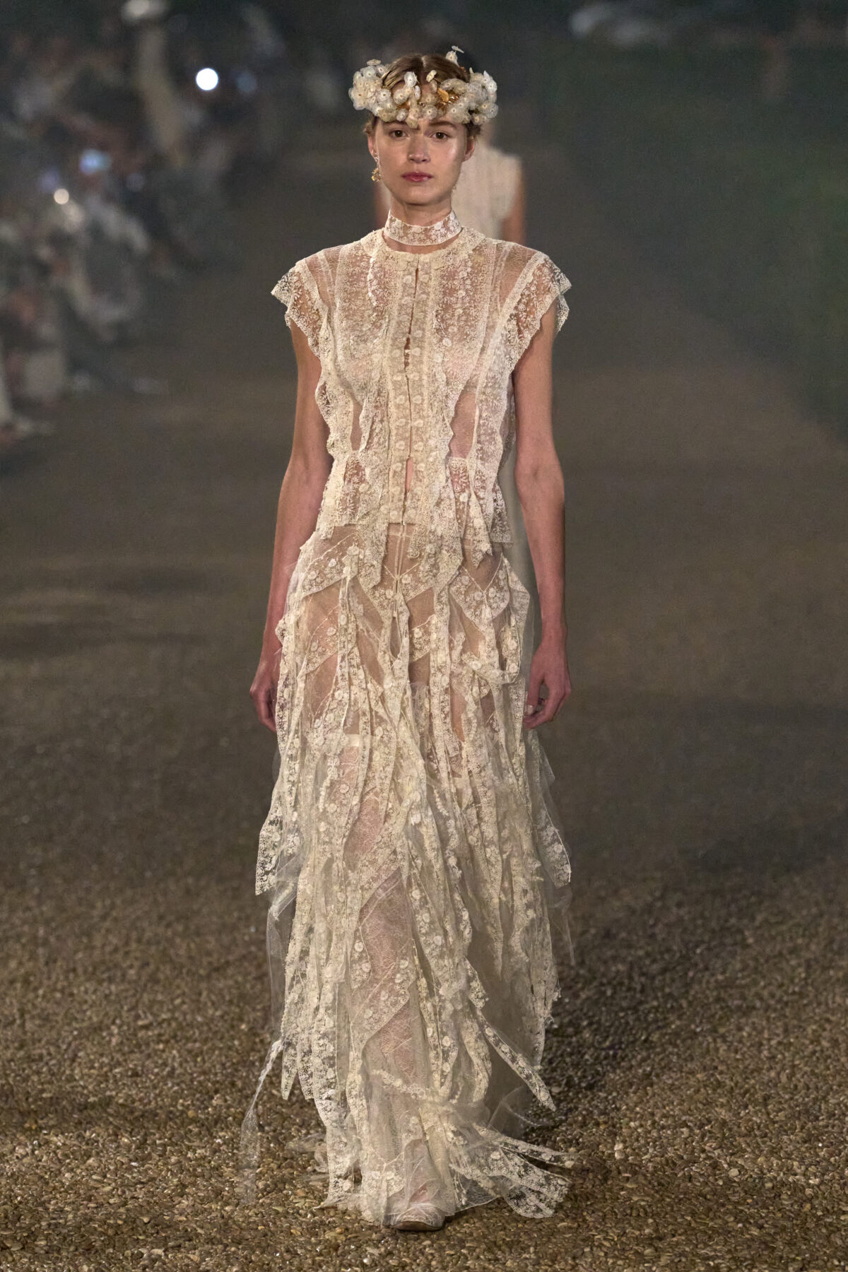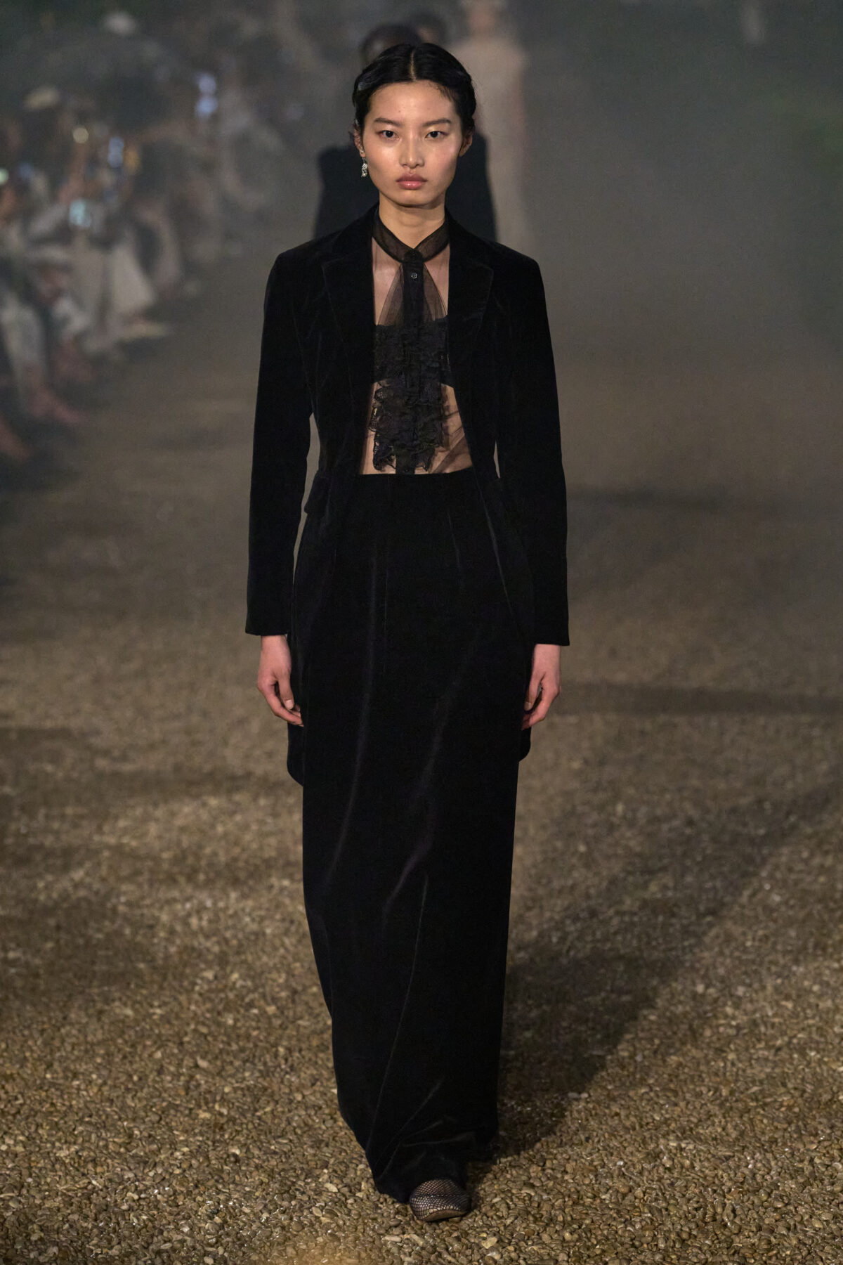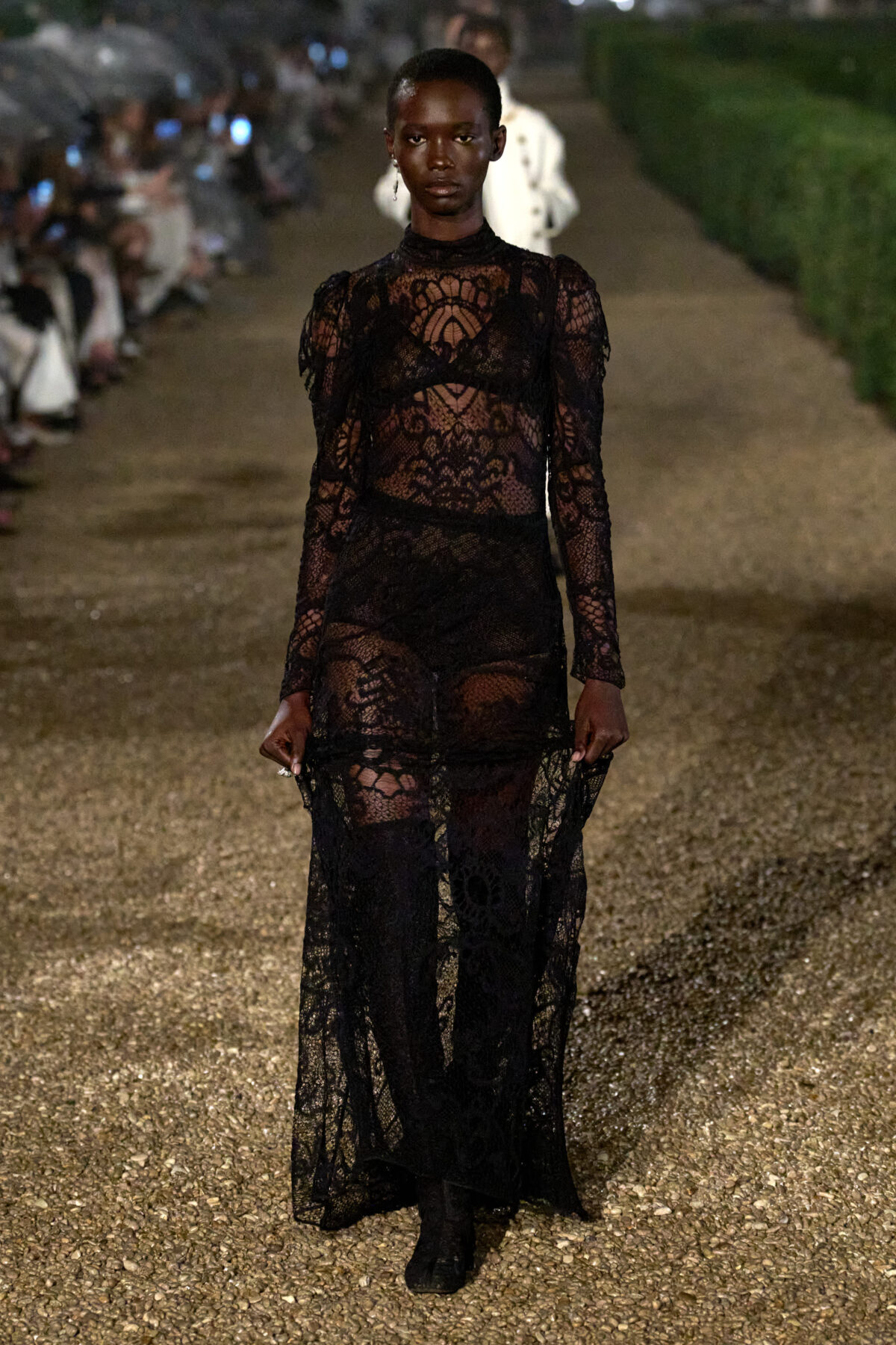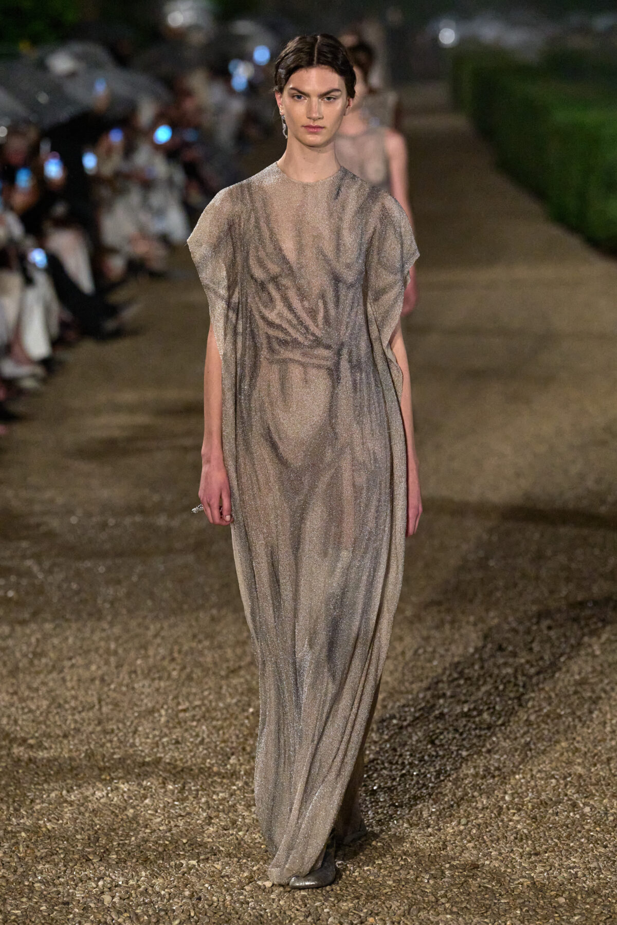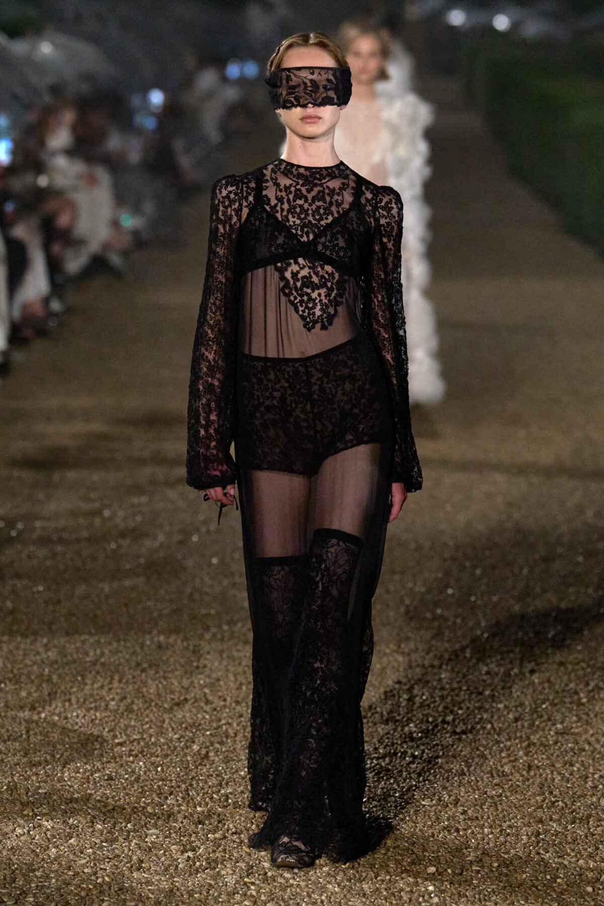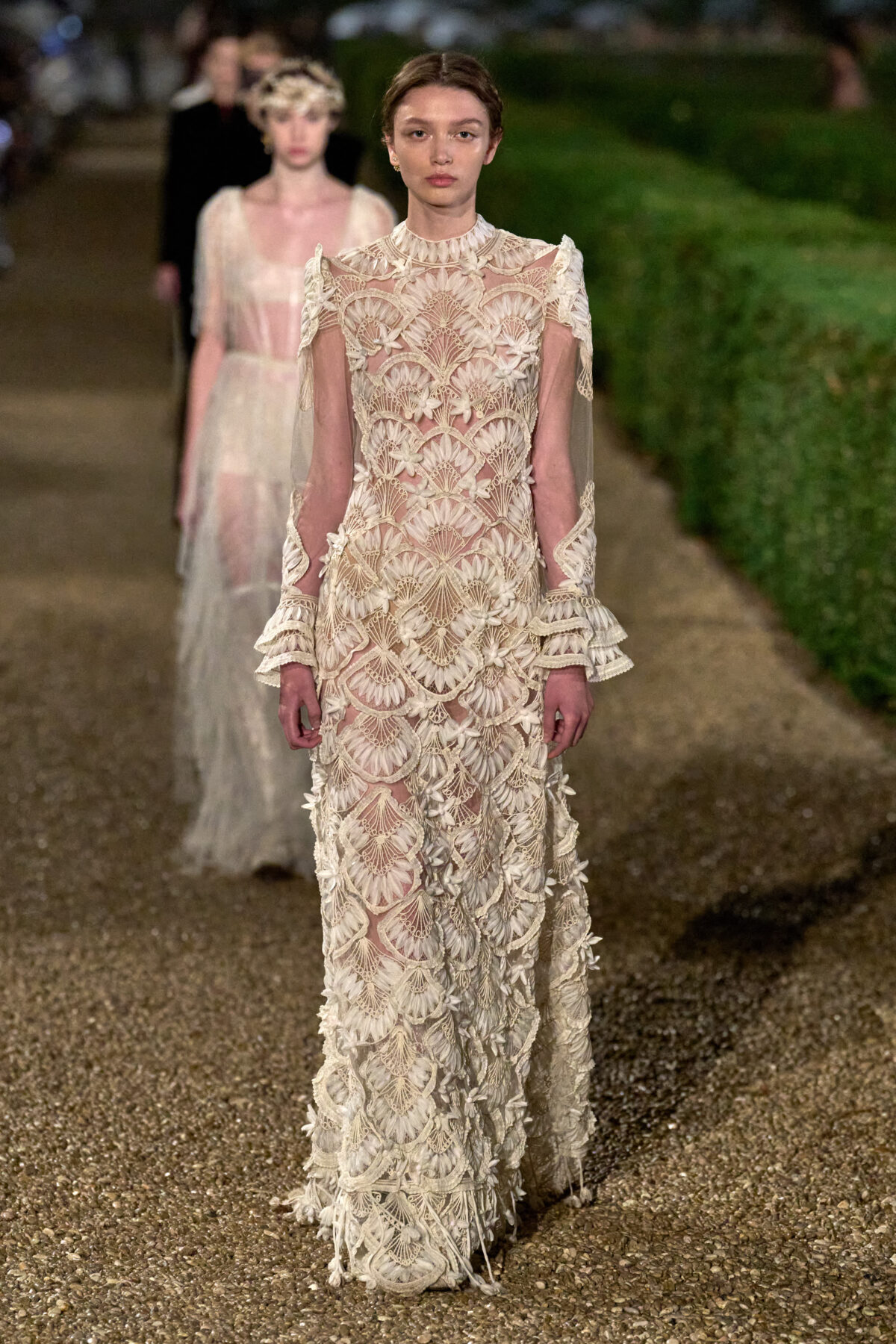 Which was why we began by looking at four long, slim, beautifully tailored double-faced cashmere ensembles—one of them a trouser suit and tailcoat. “These are haute couture,” she said. “You can only make these by hand. Some of the simplest things are the most difficult to make.” This ideal, minimalist yet sumptuous simplicity was followed by many variations on the theme of the long, slim, semi-sheer dress. The lace effects were almost countless—3D florals, rivulets of ruffles, leafy cut-outs, wavy art deco frills, gilded latticework covered with silken fringe—and more, and more. Underwear visible, shoes flat.