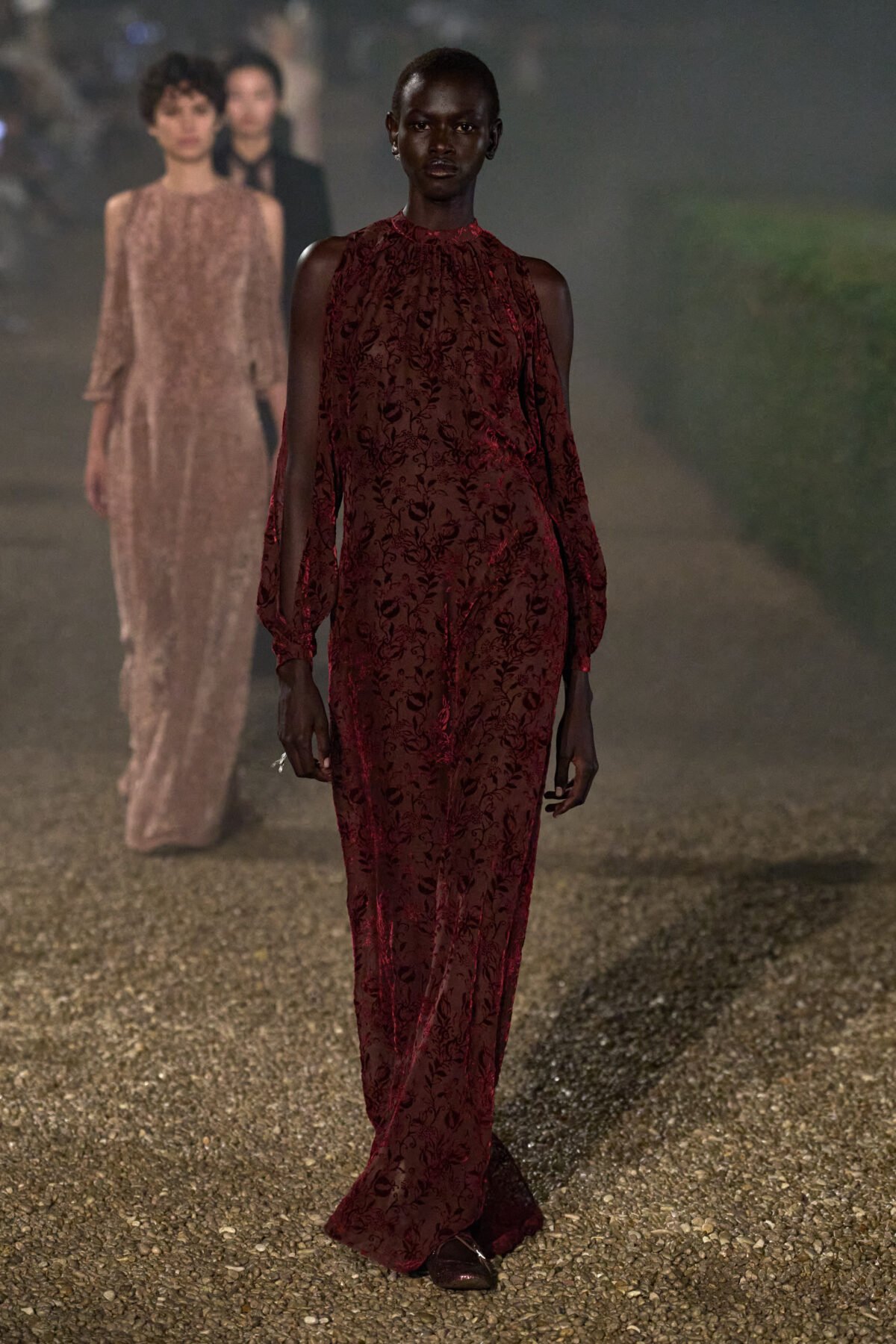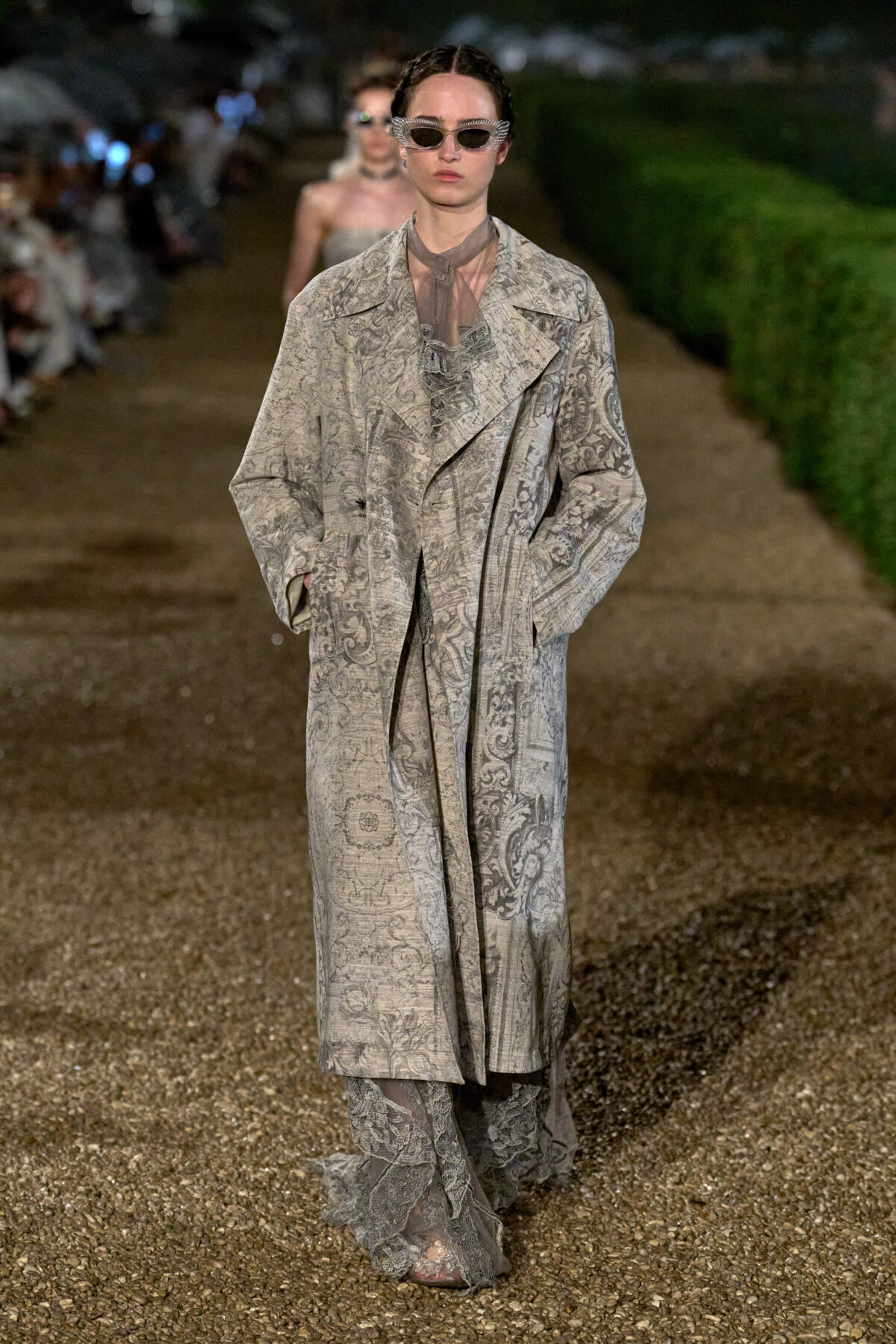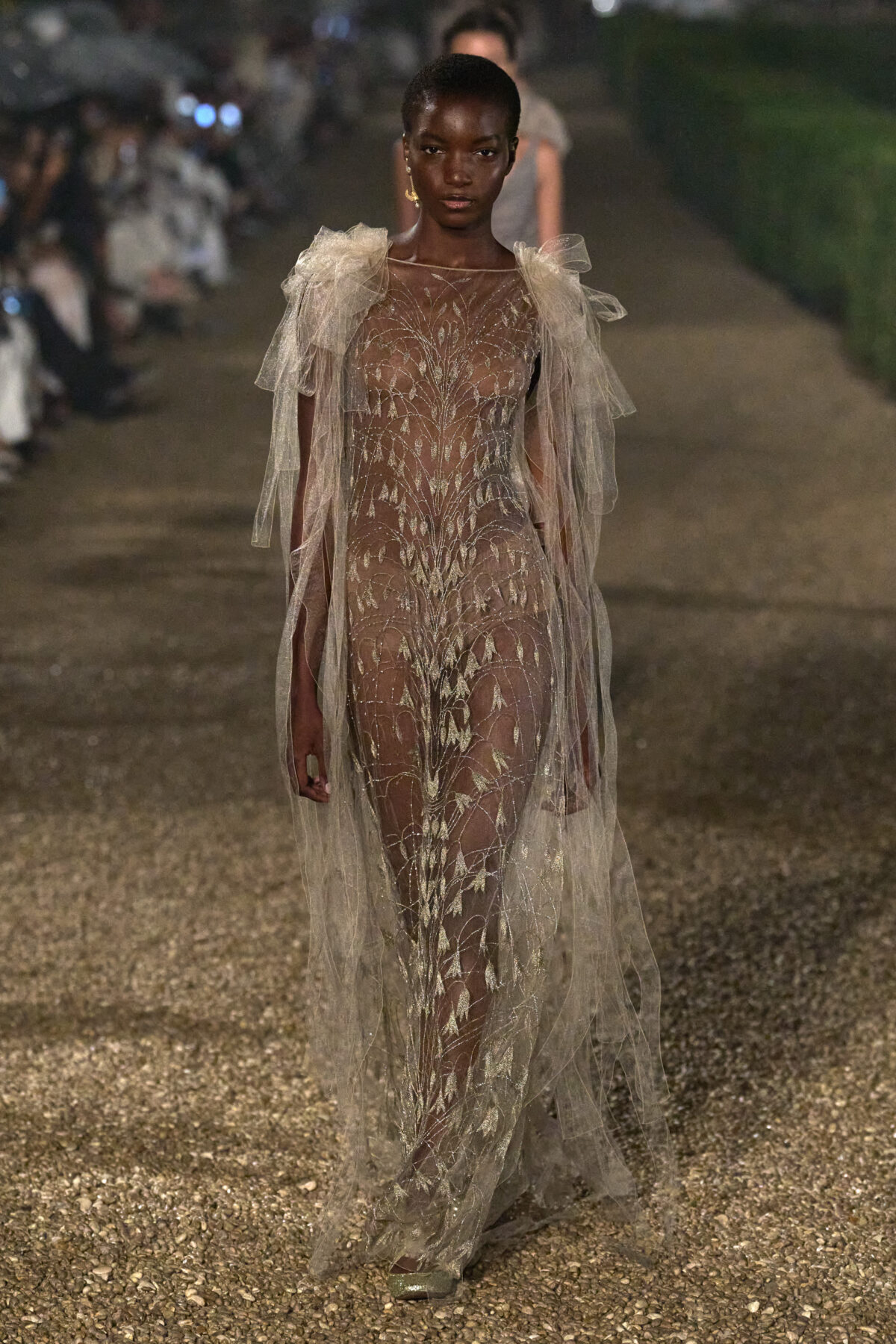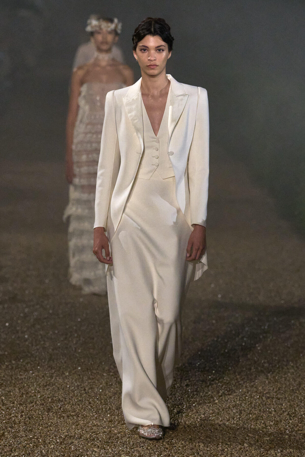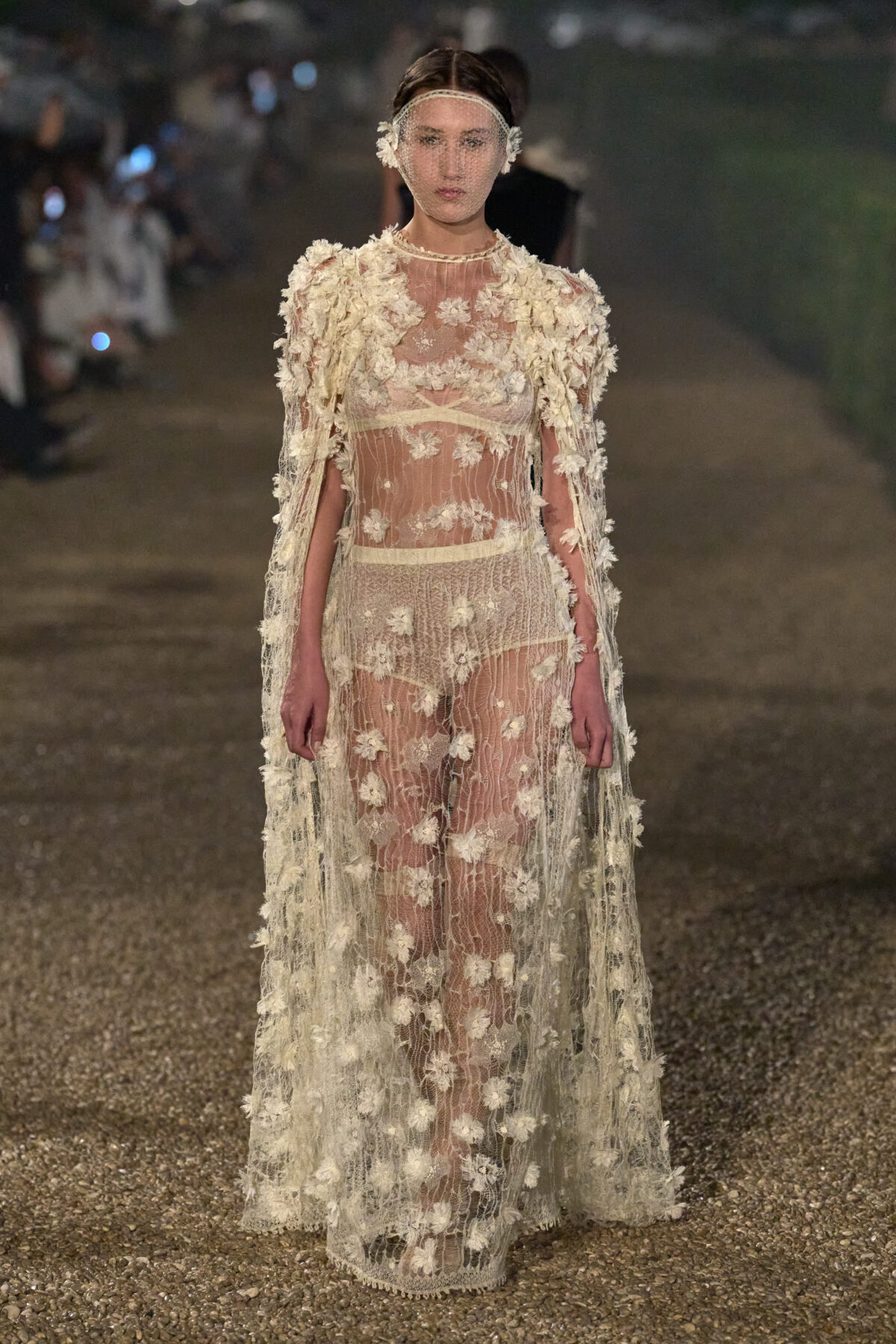 Which was why we began by looking at four long, slim, beautifully tailored double-faced cashmere ensembles—one of them a trouser suit and tailcoat. “These are haute couture,” she said. “You can only make these by hand. Some of the simplest things are the most difficult to make.” This ideal, minimalist yet sumptuous simplicity was followed by many variations on the theme of the long, slim, semi-sheer dress. The lace effects were almost countless—3D florals, rivulets of ruffles, leafy cut-outs, wavy art deco frills, gilded latticework covered with silken fringe—and more, and more. Underwear visible, shoes flat.