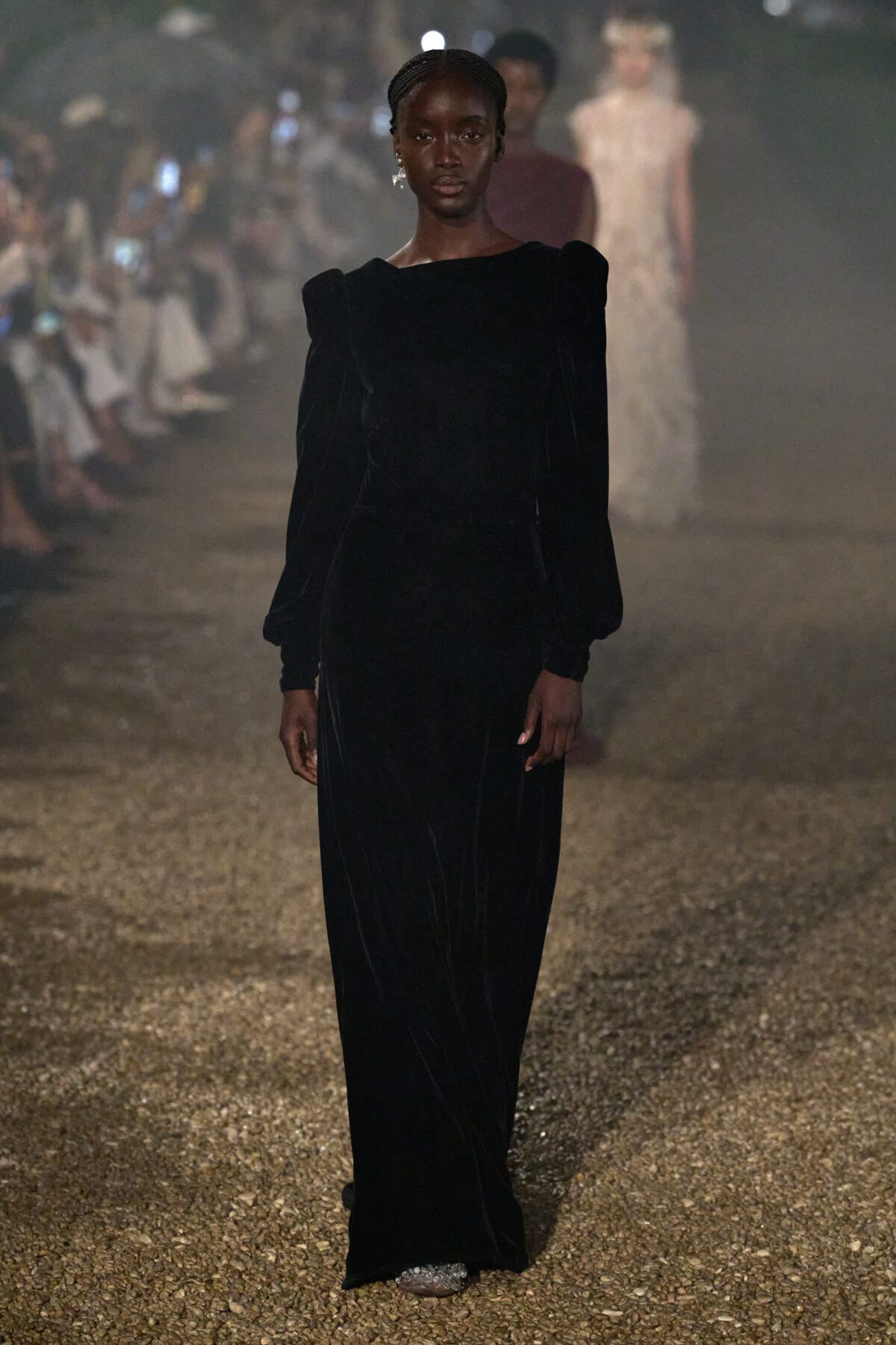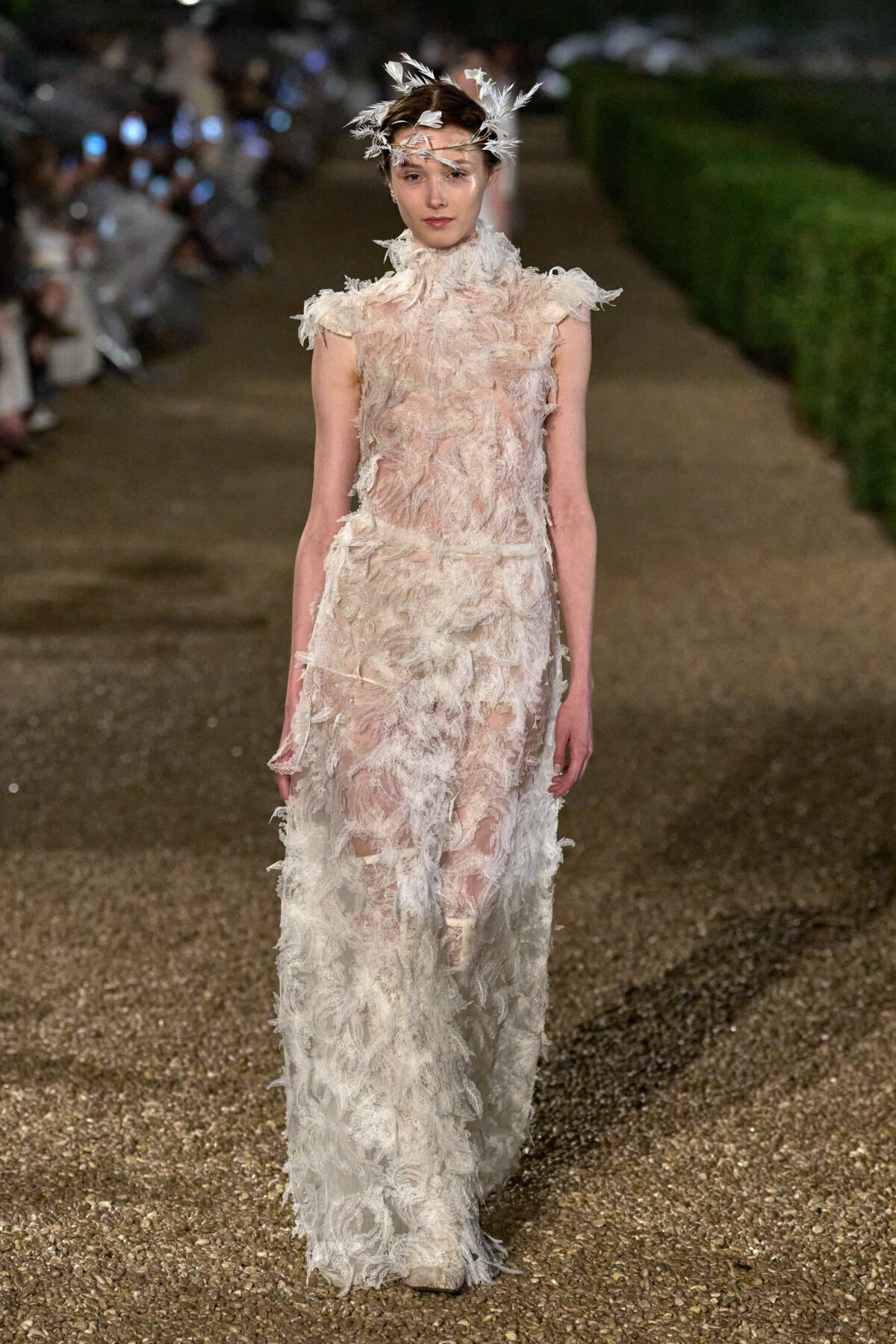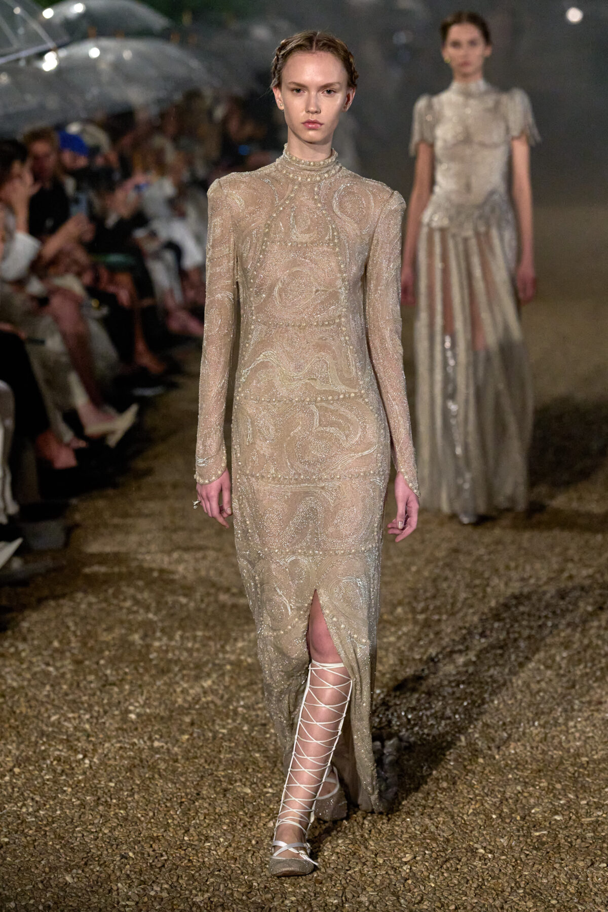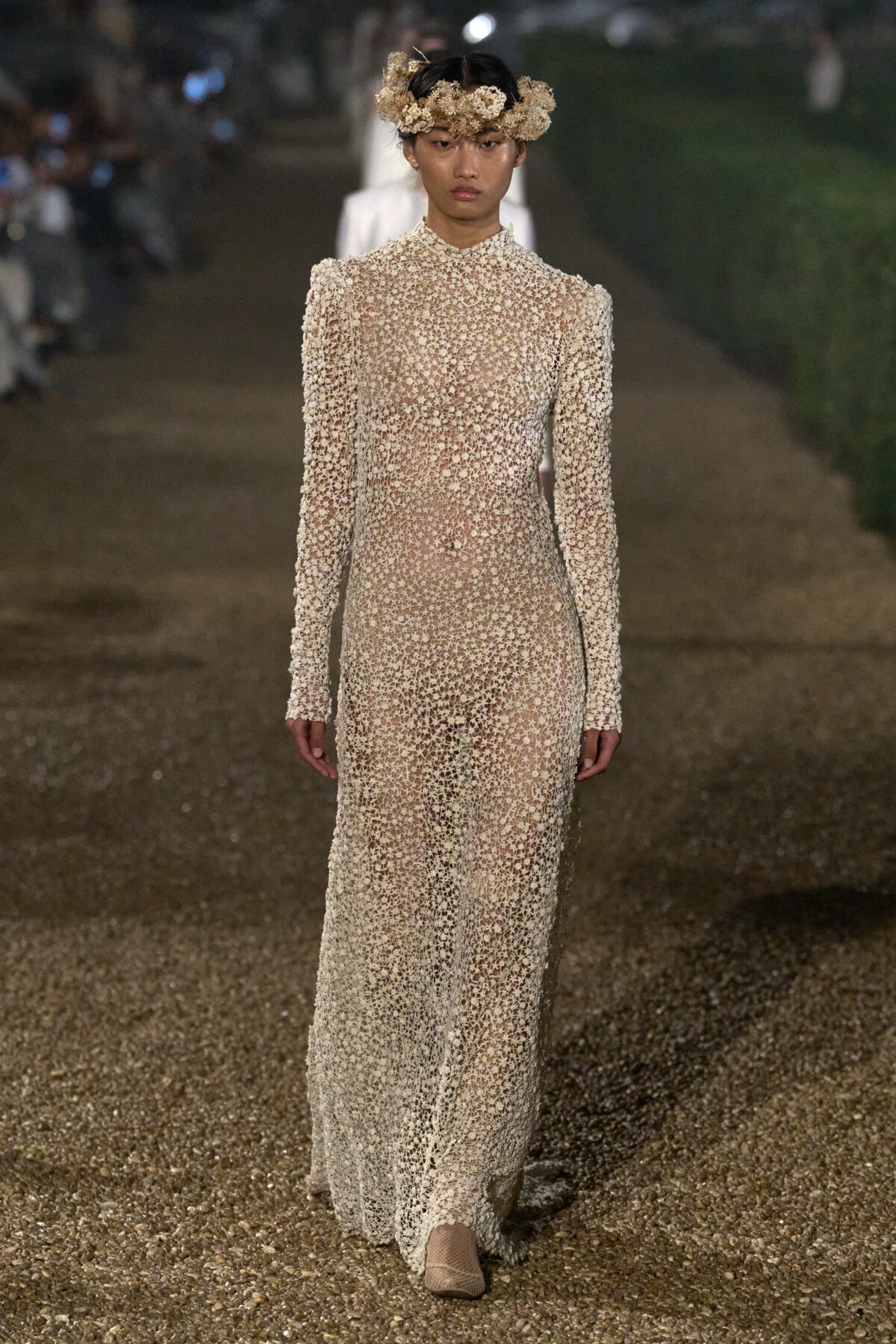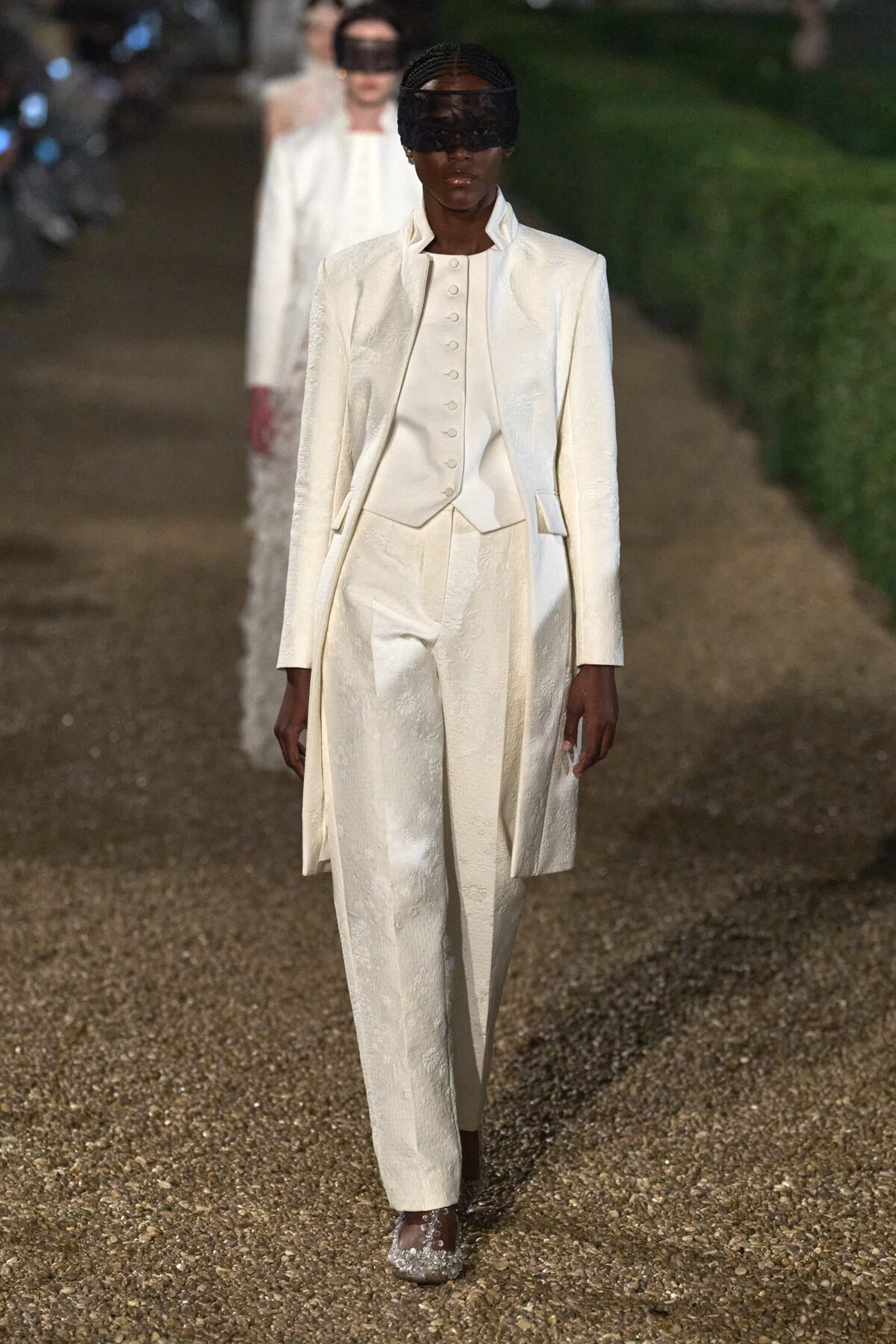 Which was why we began by looking at four long, slim, beautifully tailored double-faced cashmere ensembles—one of them a trouser suit and tailcoat. “These are haute couture,” she said. “You can only make these by hand. Some of the simplest things are the most difficult to make.” This ideal, minimalist yet sumptuous simplicity was followed by many variations on the theme of the long, slim, semi-sheer dress. The lace effects were almost countless—3D florals, rivulets of ruffles, leafy cut-outs, wavy art deco frills, gilded latticework covered with silken fringe—and more, and more. Underwear visible, shoes flat.