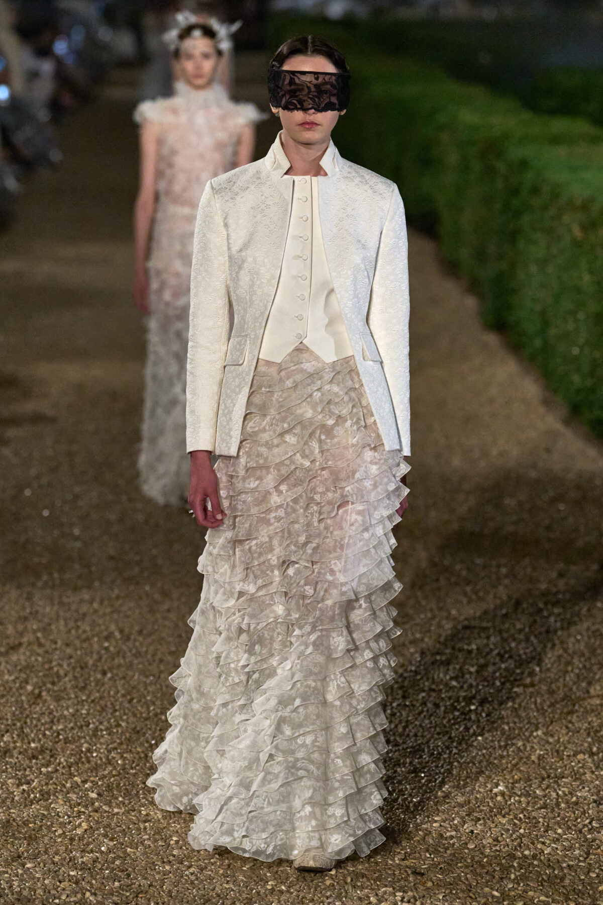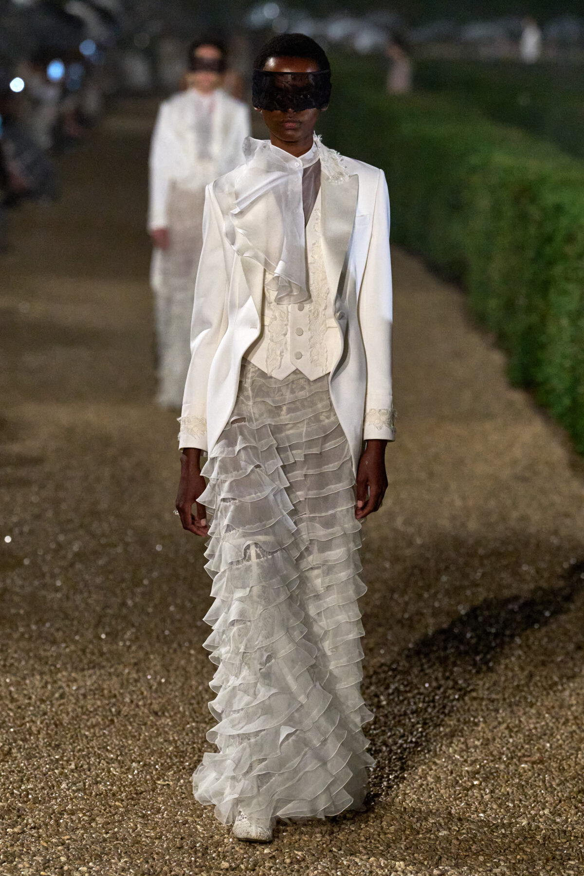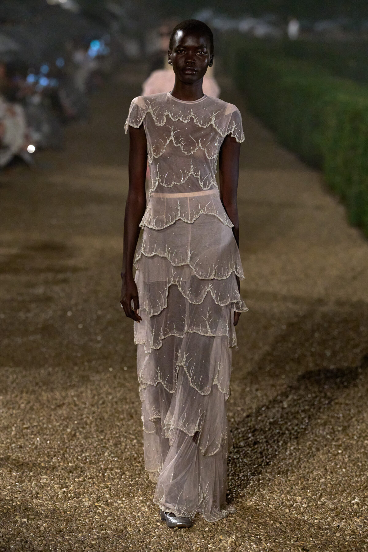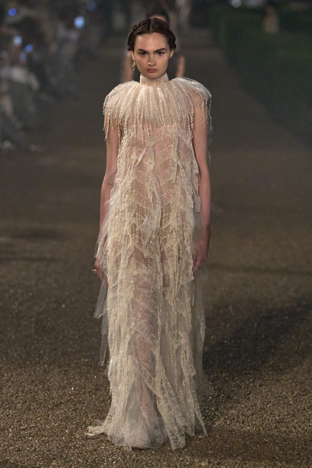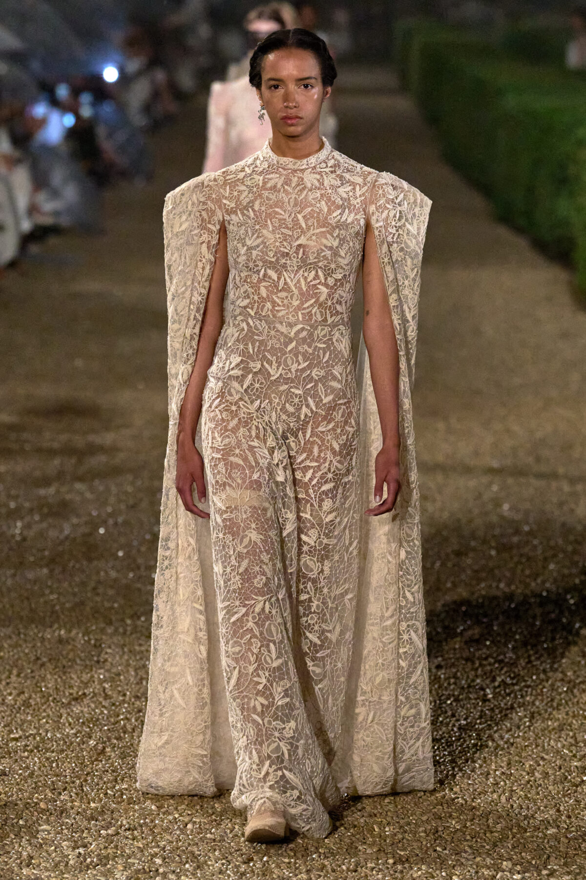 This, surely, was Chiuri staking claim to the look she has coined at Dior; her contribution over nearly a decade to the history of the house. But within this, there was yet more to be drawn out. One dress in particular, number 63, used an almost transparent curly ruffled technique that looked like a salute to her old employer Valentino Garavani—and his breakthrough White Collection from 1968.