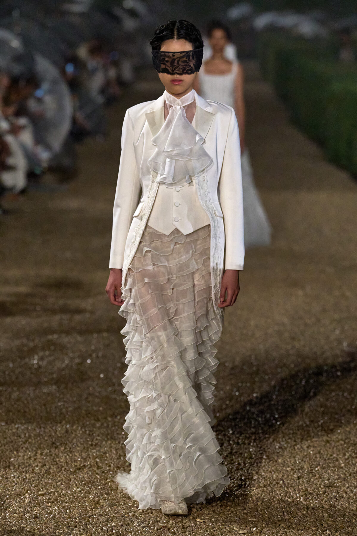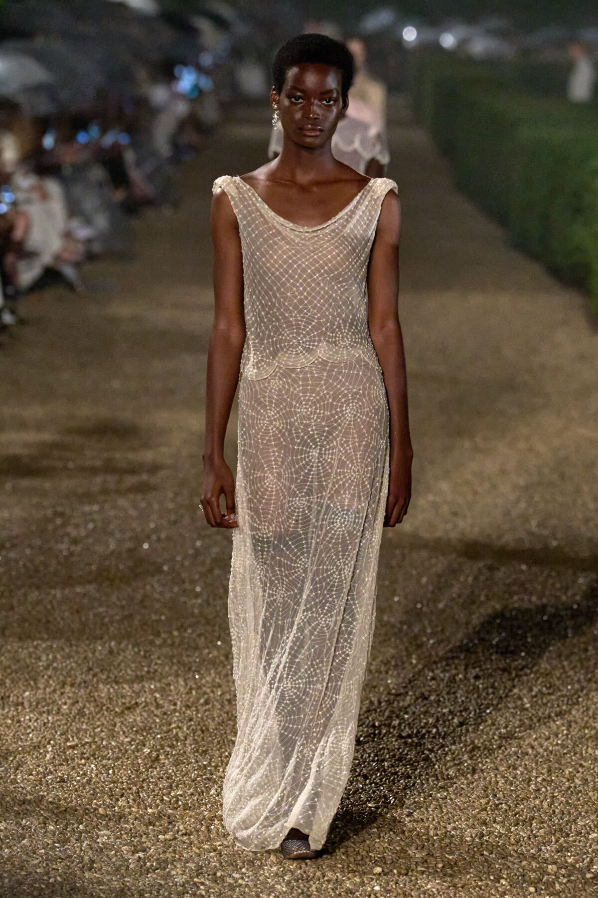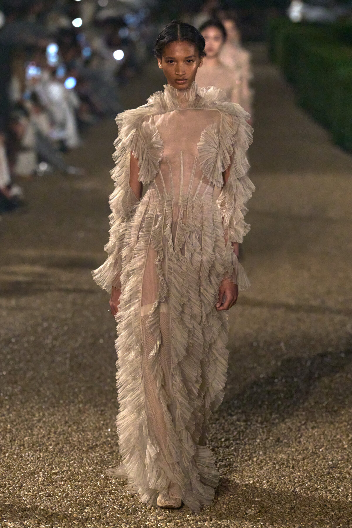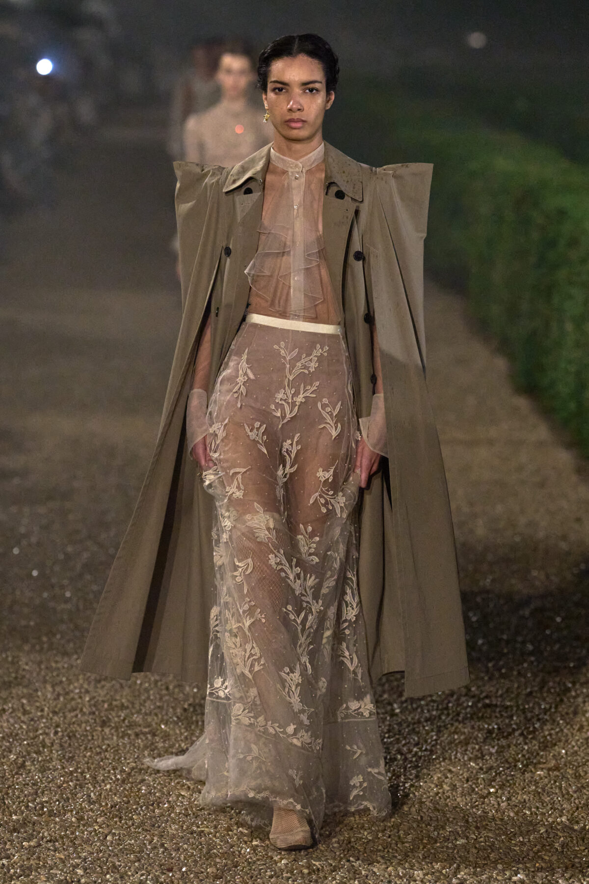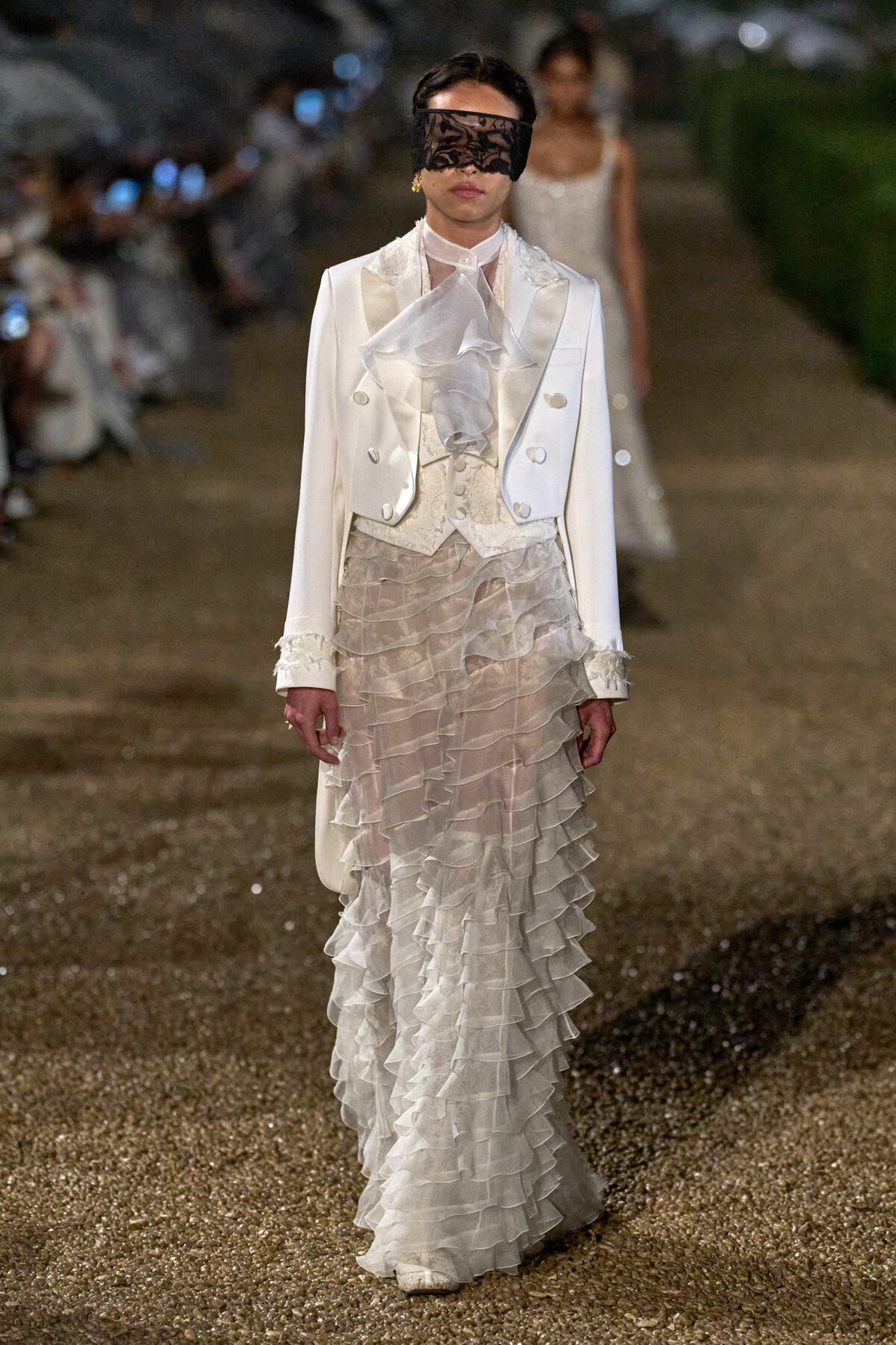This, surely, was Chiuri staking claim to the look she has coined at Dior; her contribution over nearly a decade to the history of the house. But within this, there was yet more to be drawn out. One dress in particular, number 63, used an almost transparent curly ruffled technique that looked like a salute to her old employer Valentino Garavani—and his breakthrough White Collection from 1968.