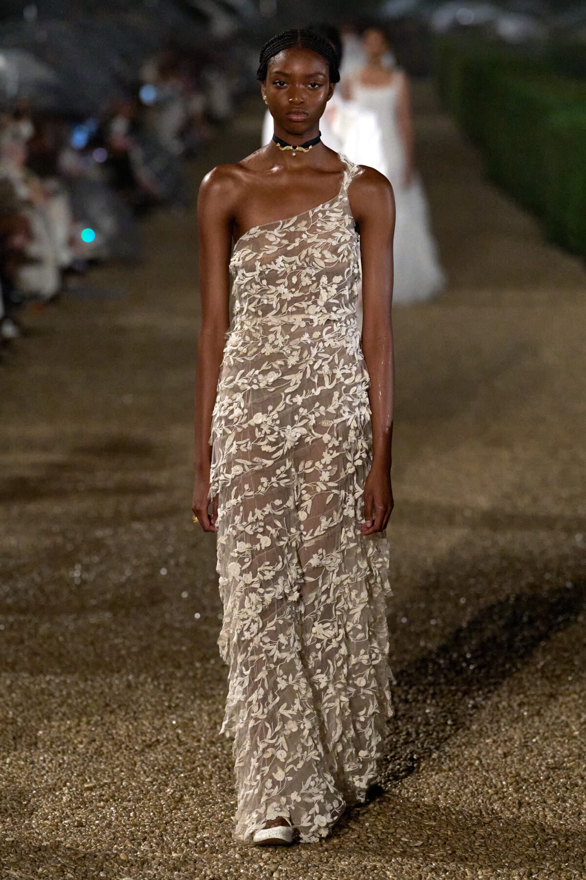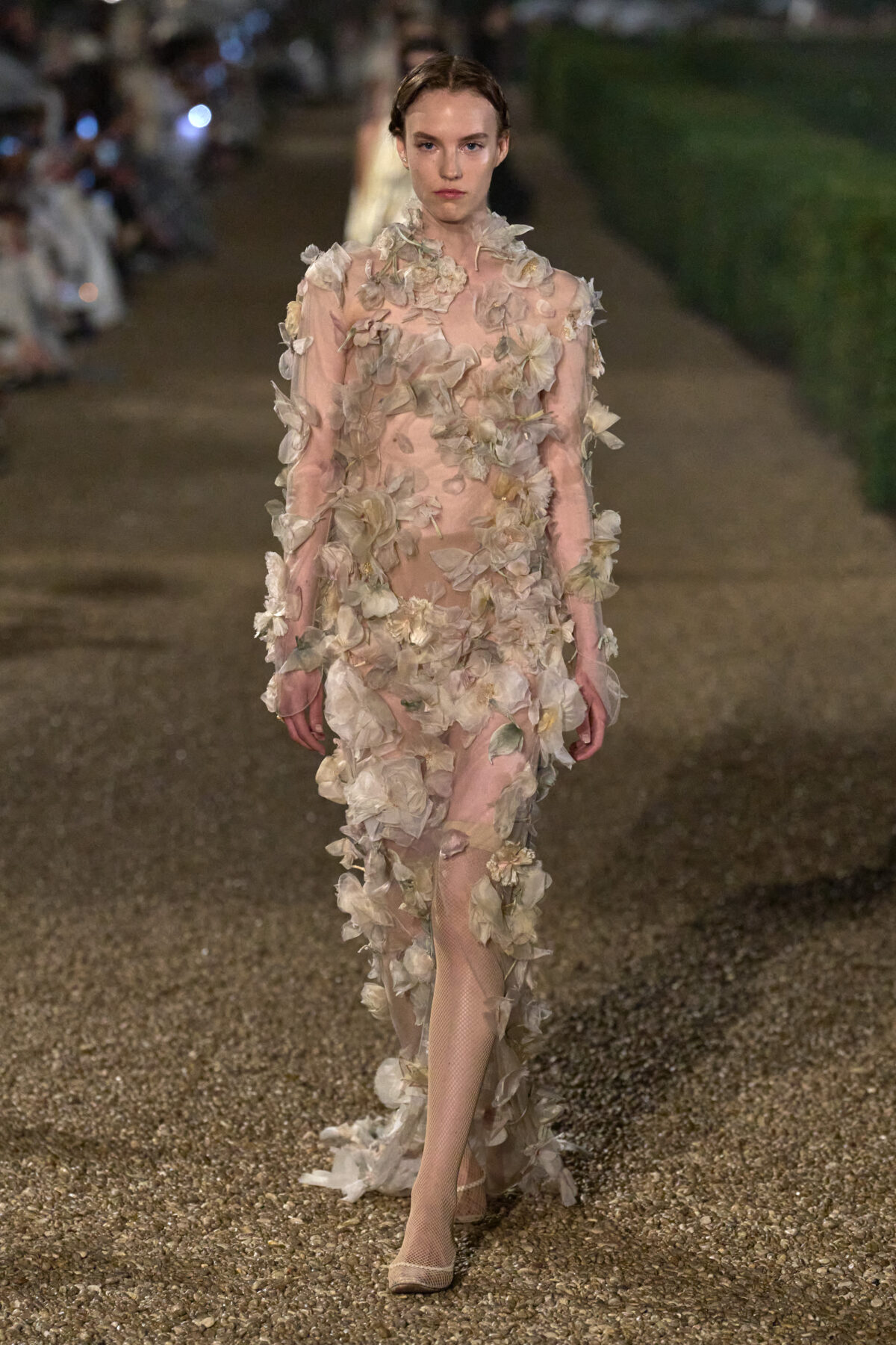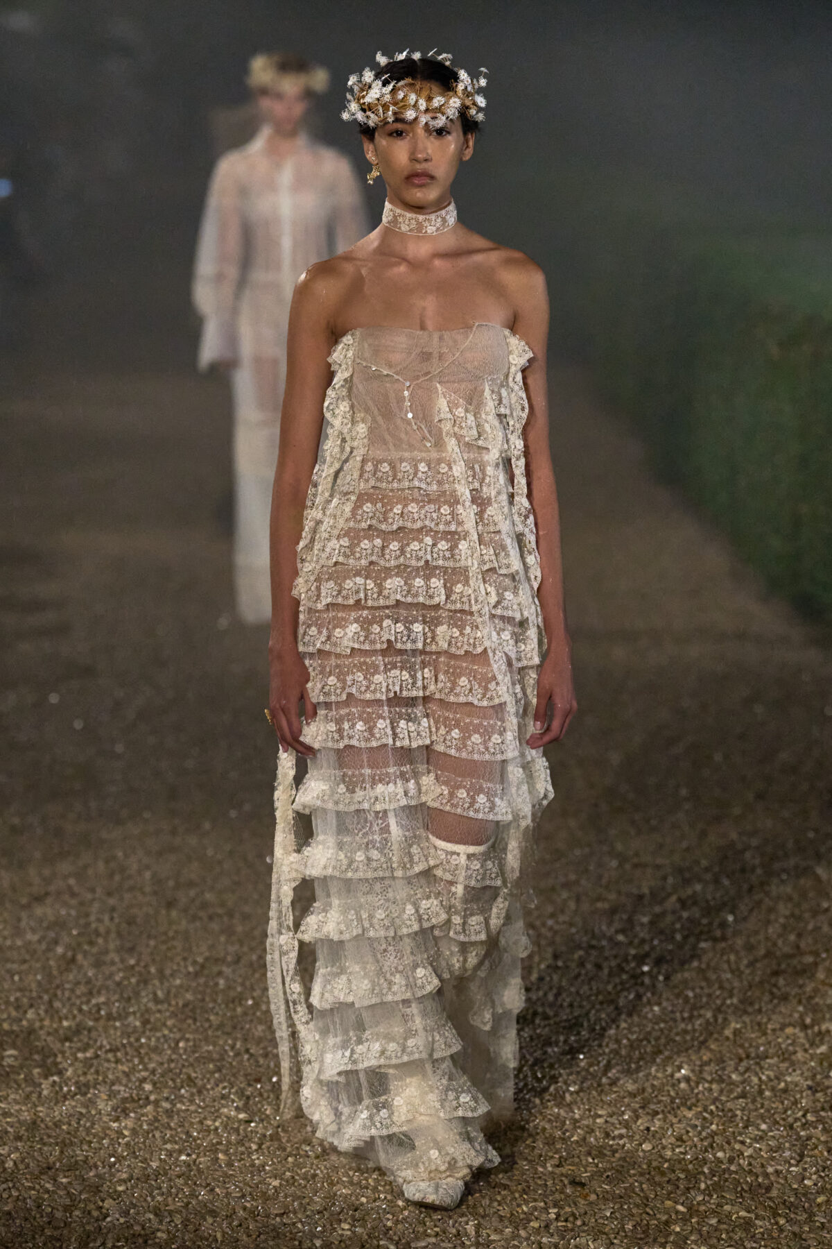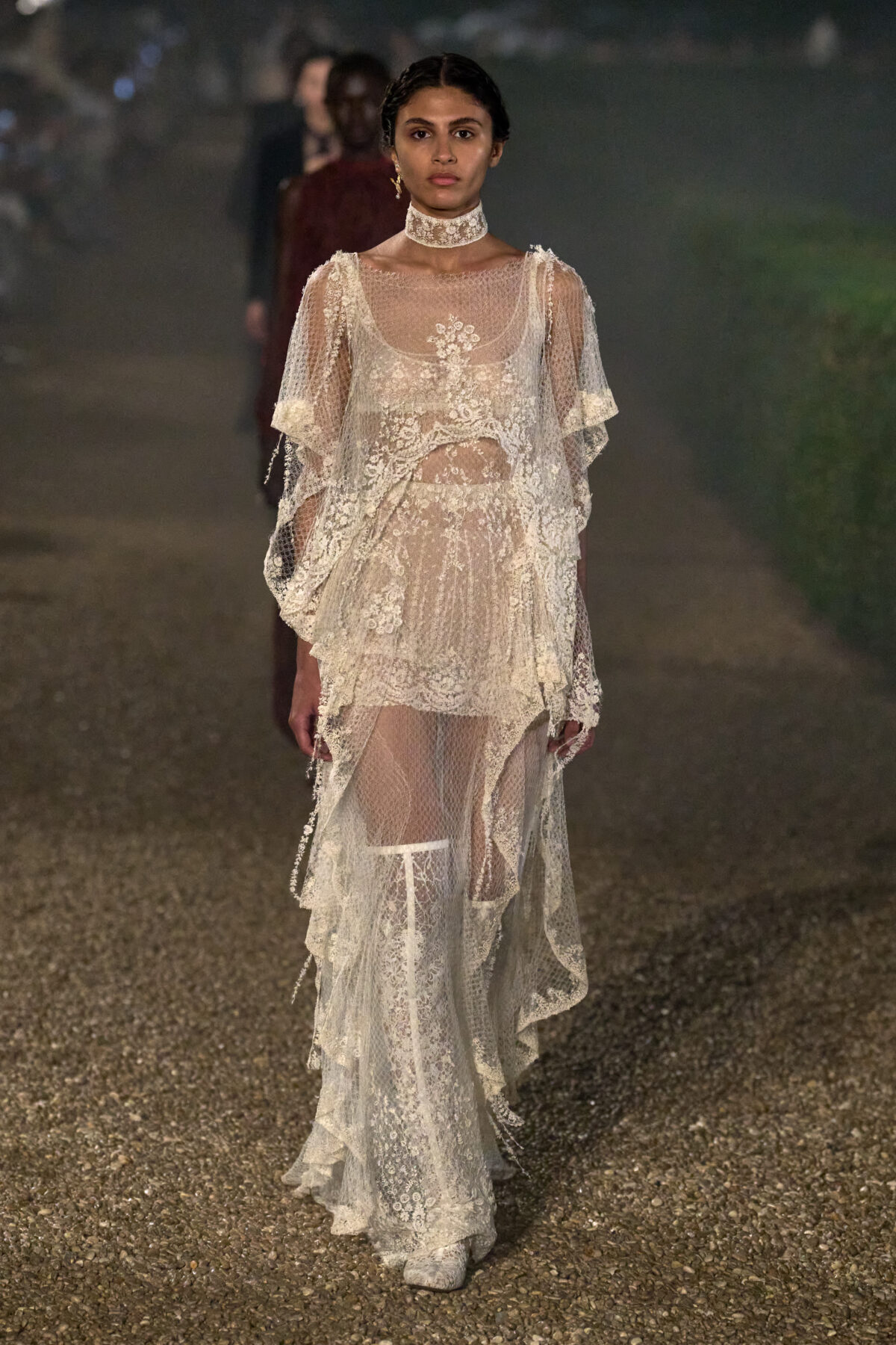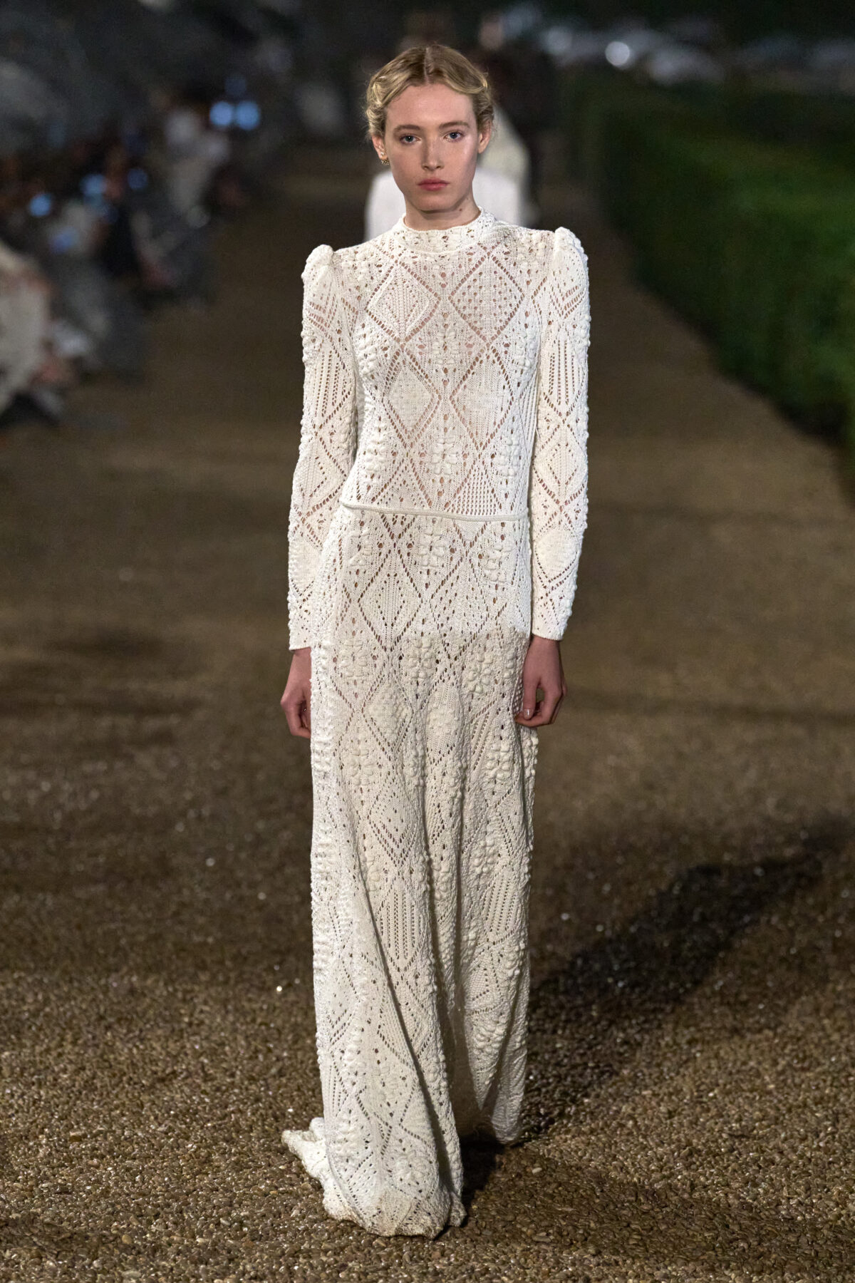 This, surely, was Chiuri staking claim to the look she has coined at Dior; her contribution over nearly a decade to the history of the house. But within this, there was yet more to be drawn out. One dress in particular, number 63, used an almost transparent curly ruffled technique that looked like a salute to her old employer Valentino Garavani—and his breakthrough White Collection from 1968.