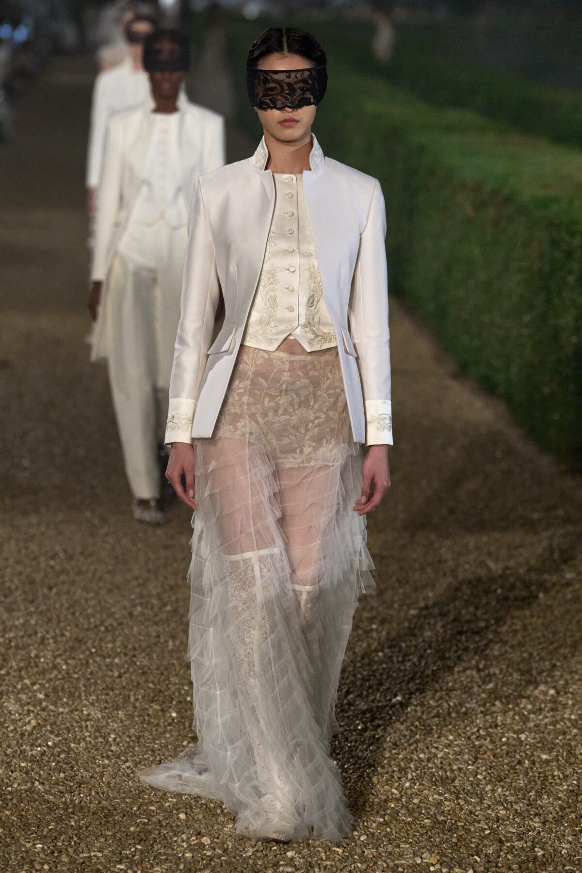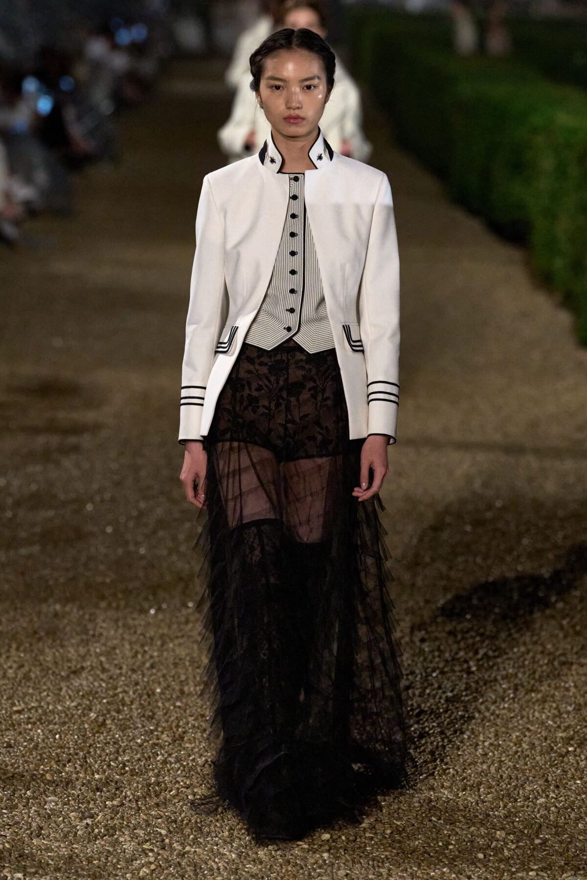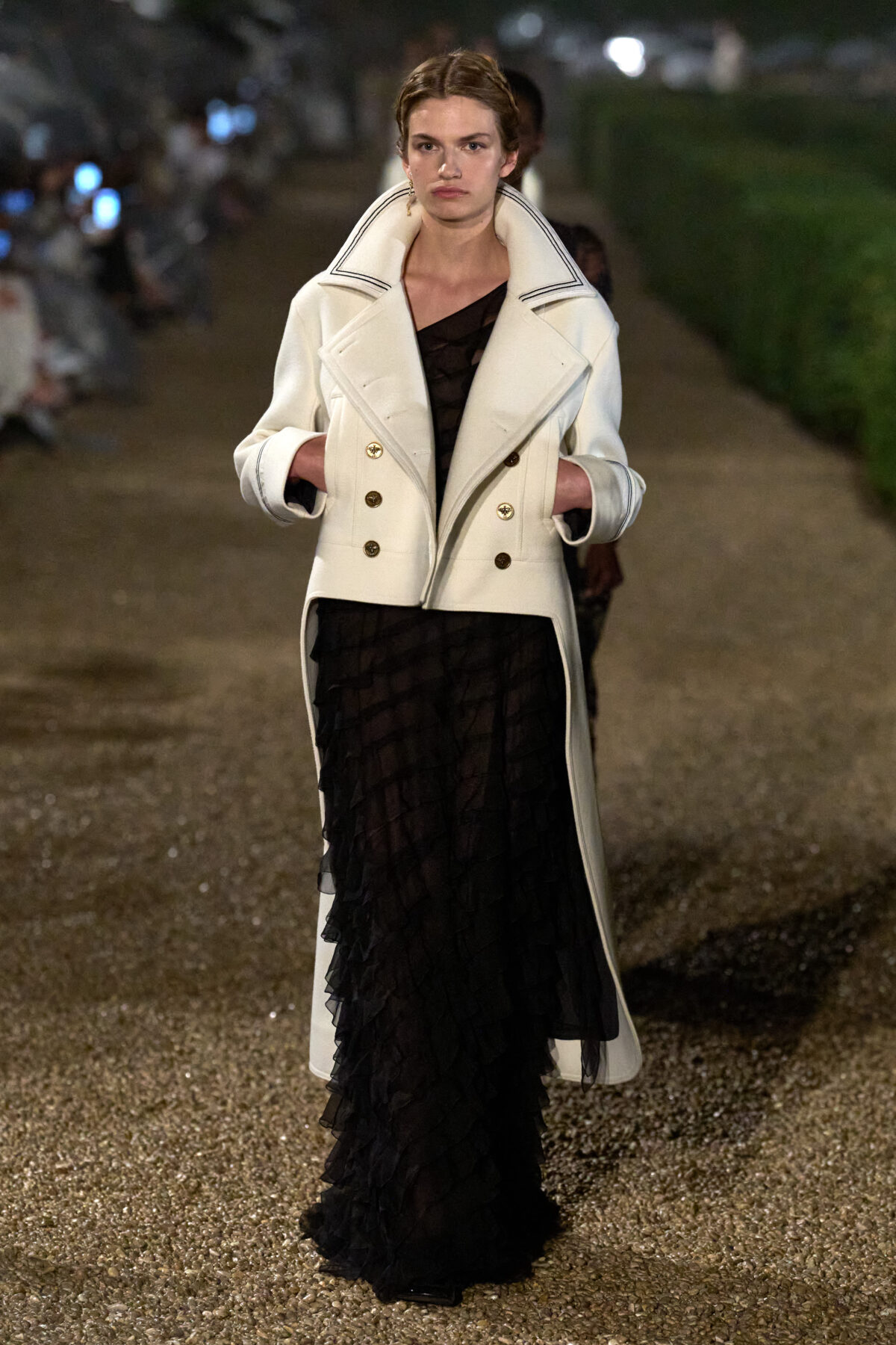 And then, there was her Vatican Conclave moment. It came very obviously in a short, black, red-buttoned cardinal’s coat; and maybe not so obviously, but definitely when you look twice—in the vestment-like white shirts with deep lace hems. As it happens, Chiuri added, her heroine Mimi had a Pope as an uncle. More strange, blurry connections.