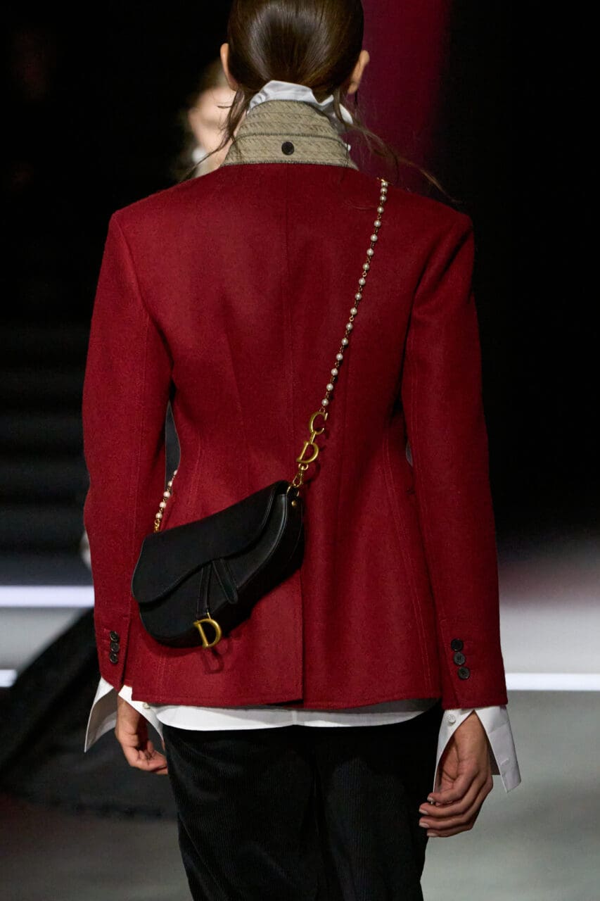 Now we were around to the subject of corsets—the classic fulcrum of the Christian Dior silhouette since 1947. And then it began to occur that this was in fact Chiuri’s least Dior collection to date, and was perhaps all the better for not sticking to the letter of the Bar jacket and circle skirt. Where there were Dior-isms, they were nods to John Galliano’s saddle bags (dinkily desirable in evening mini-form, on a pearl chain), his J’Adore Dior T-shirts, grungily aged, and Gianfranco Ferré’s thing for white shirts (although the originals were five times blousier). Chiuri also pointed out that she exploded the 1990s Lady Di bag to turn it into a capacious tote.