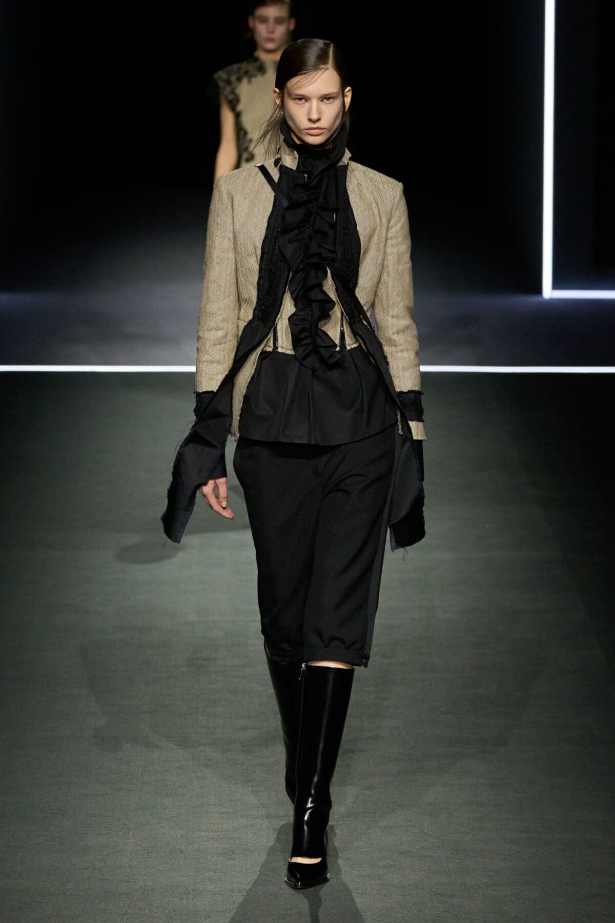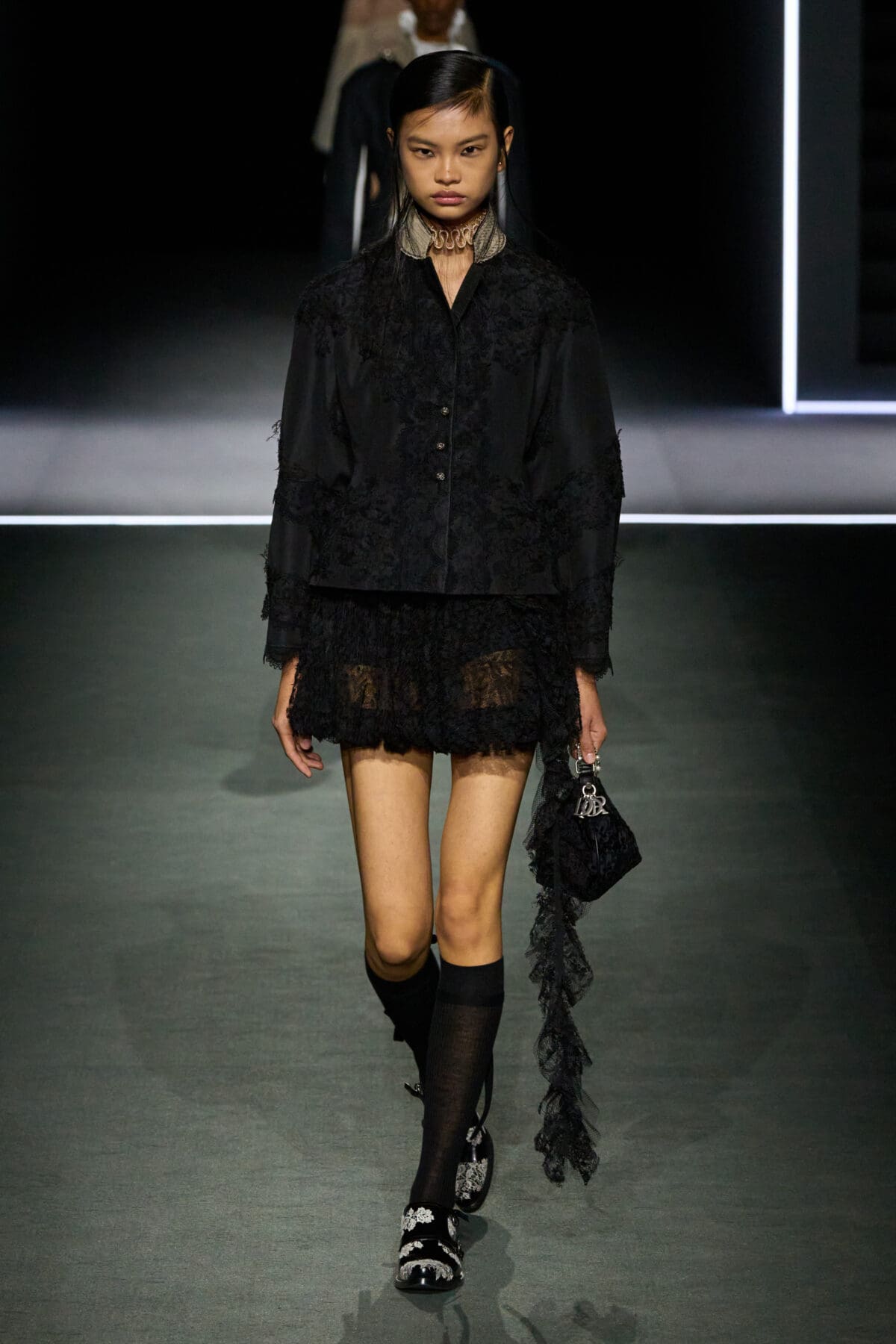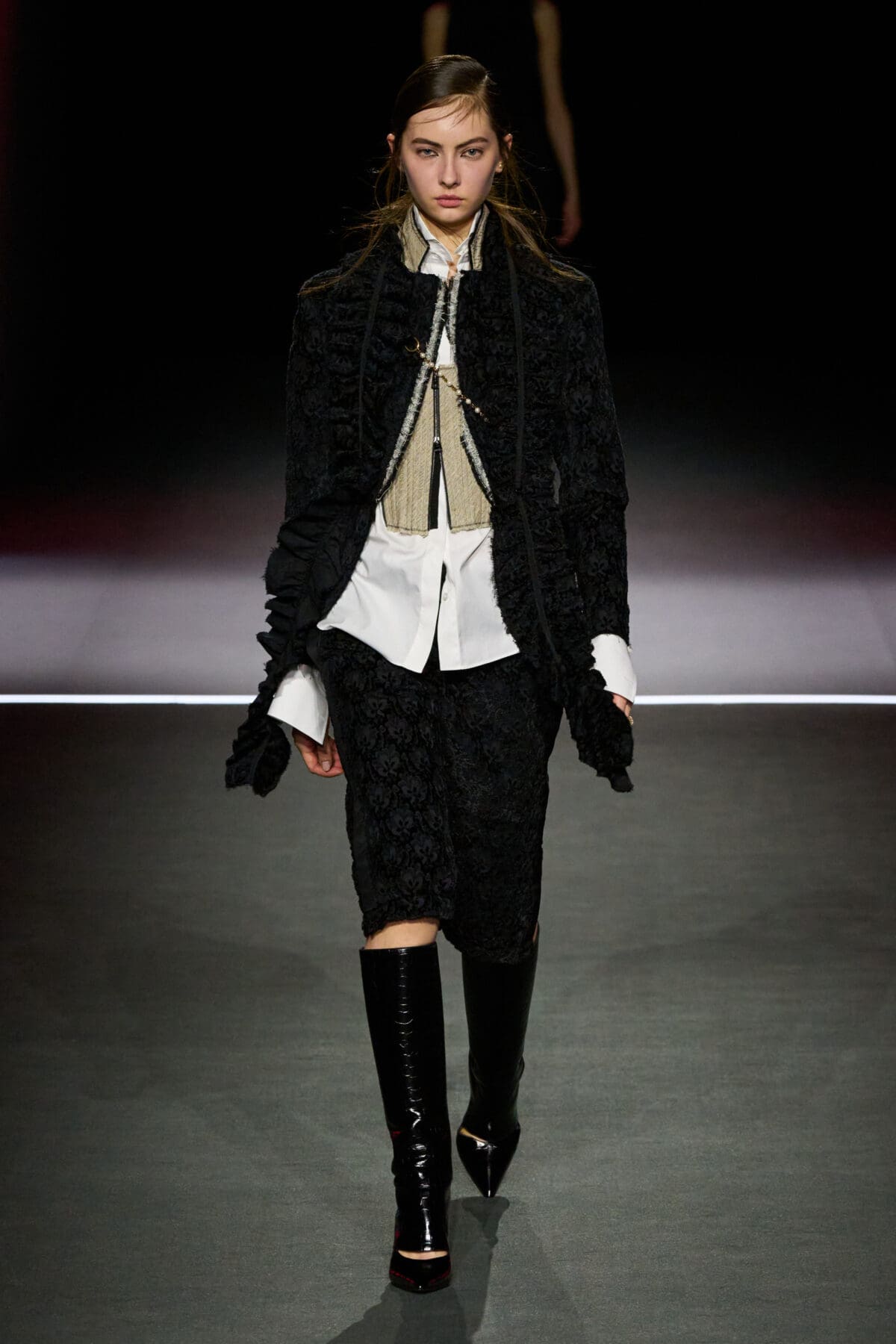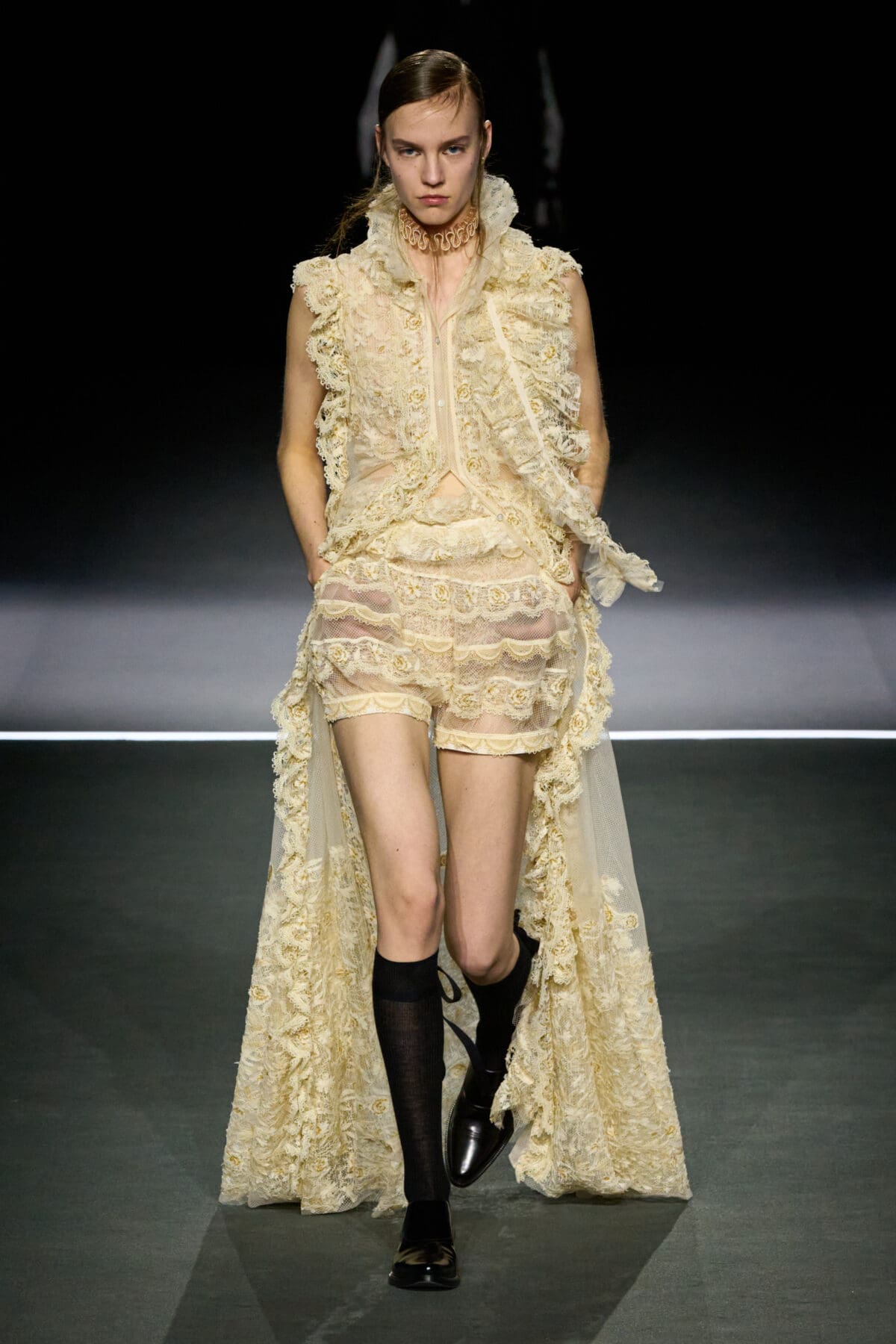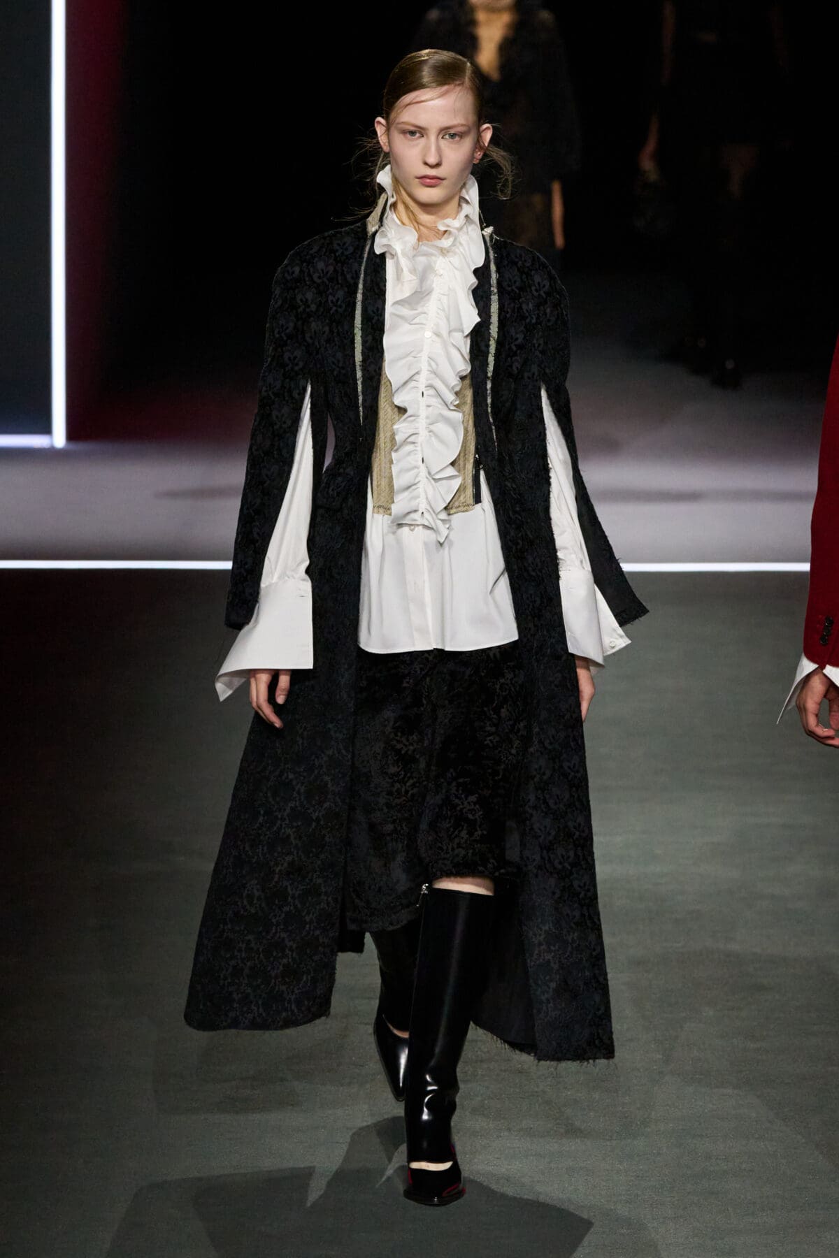 That’s quite a thing to say when you’re ostensibly looking at Tudor doublets and knickerbockers, Elizabethan stomachers, ruffs, redingotes, medieval suits of armor and (pretend) royal ermine. But Chiuri dealt with all of this in a largely believable way from the first look: a quasi-antique men’s jacket with the internal tailoring basting on the outside with a black frilled blouse spilling from its neck, Bermuda-y knickers and a kind of spat-kneeboot.