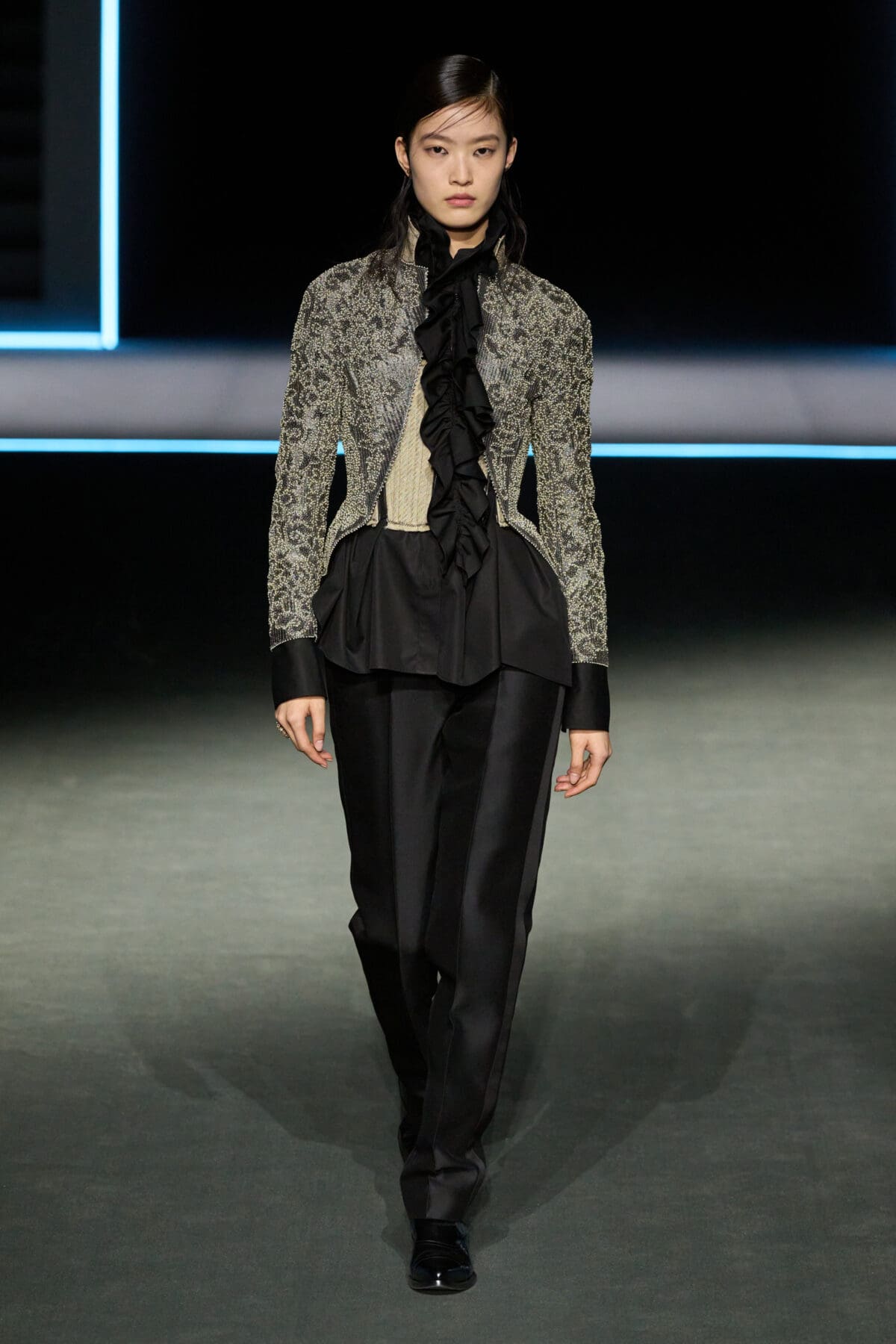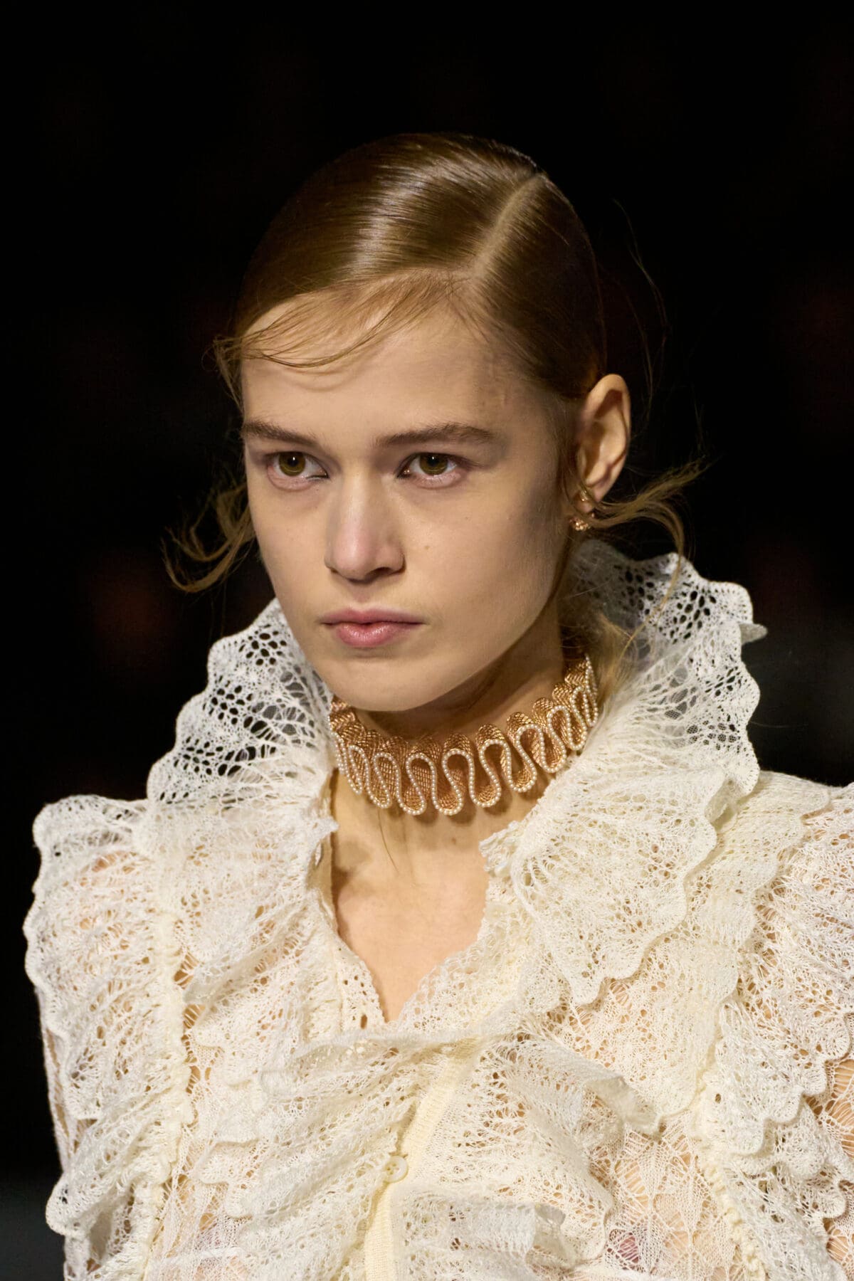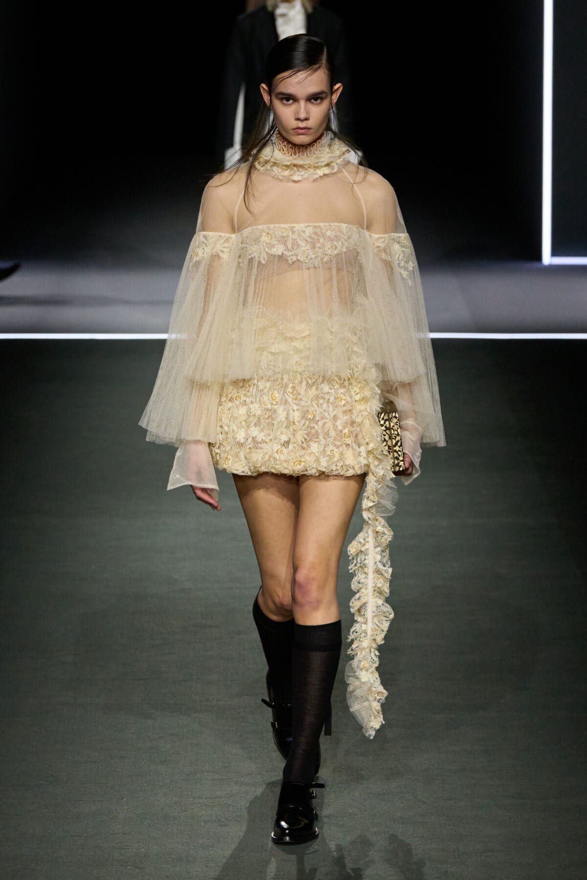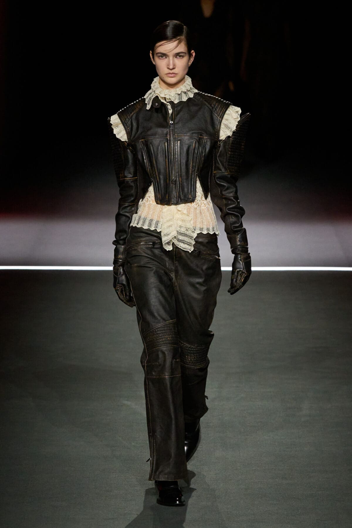 That’s quite a thing to say when you’re ostensibly looking at Tudor doublets and knickerbockers, Elizabethan stomachers, ruffs, redingotes, medieval suits of armor and (pretend) royal ermine. But Chiuri dealt with all of this in a largely believable way from the first look: a quasi-antique men’s jacket with the internal tailoring basting on the outside with a black frilled blouse spilling from its neck, Bermuda-y knickers and a kind of spat-kneeboot.
