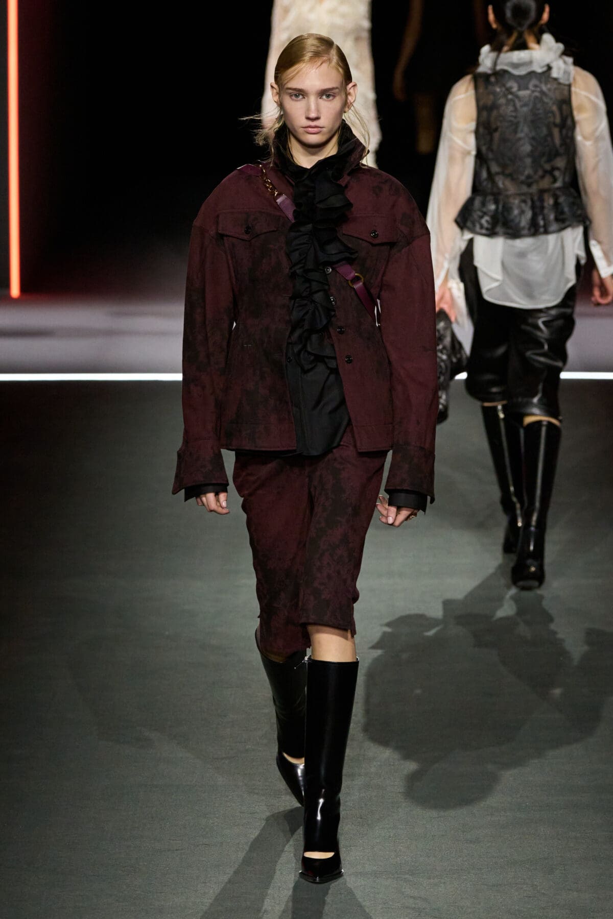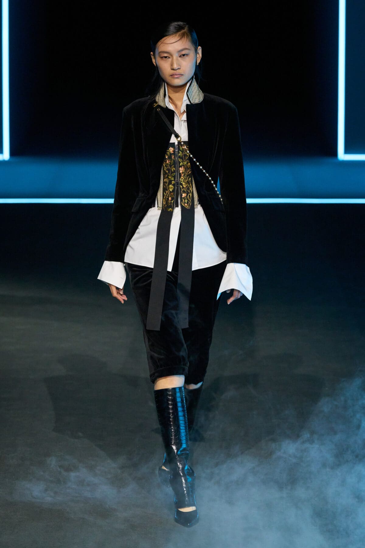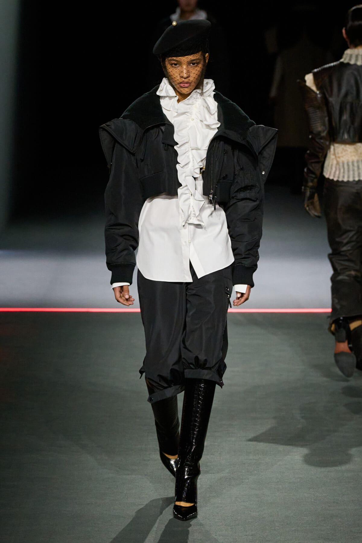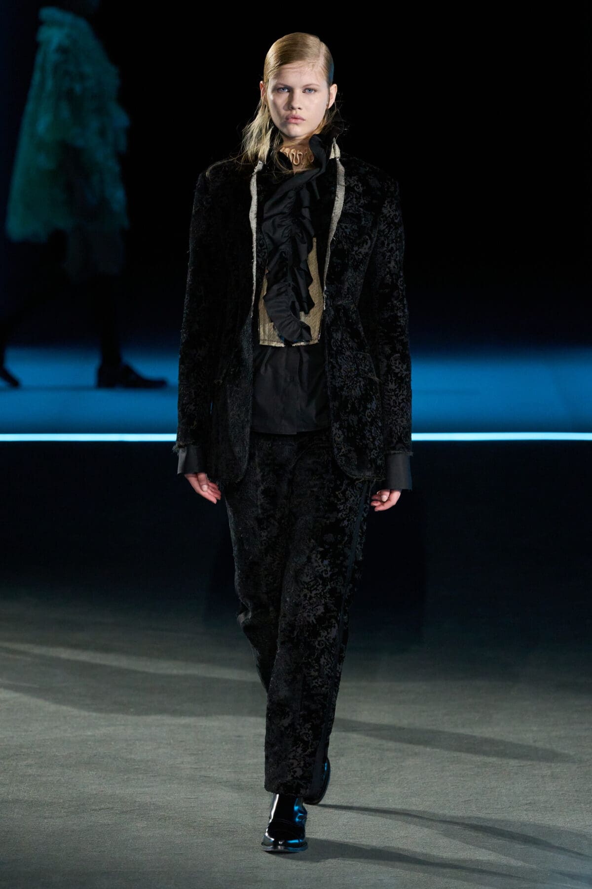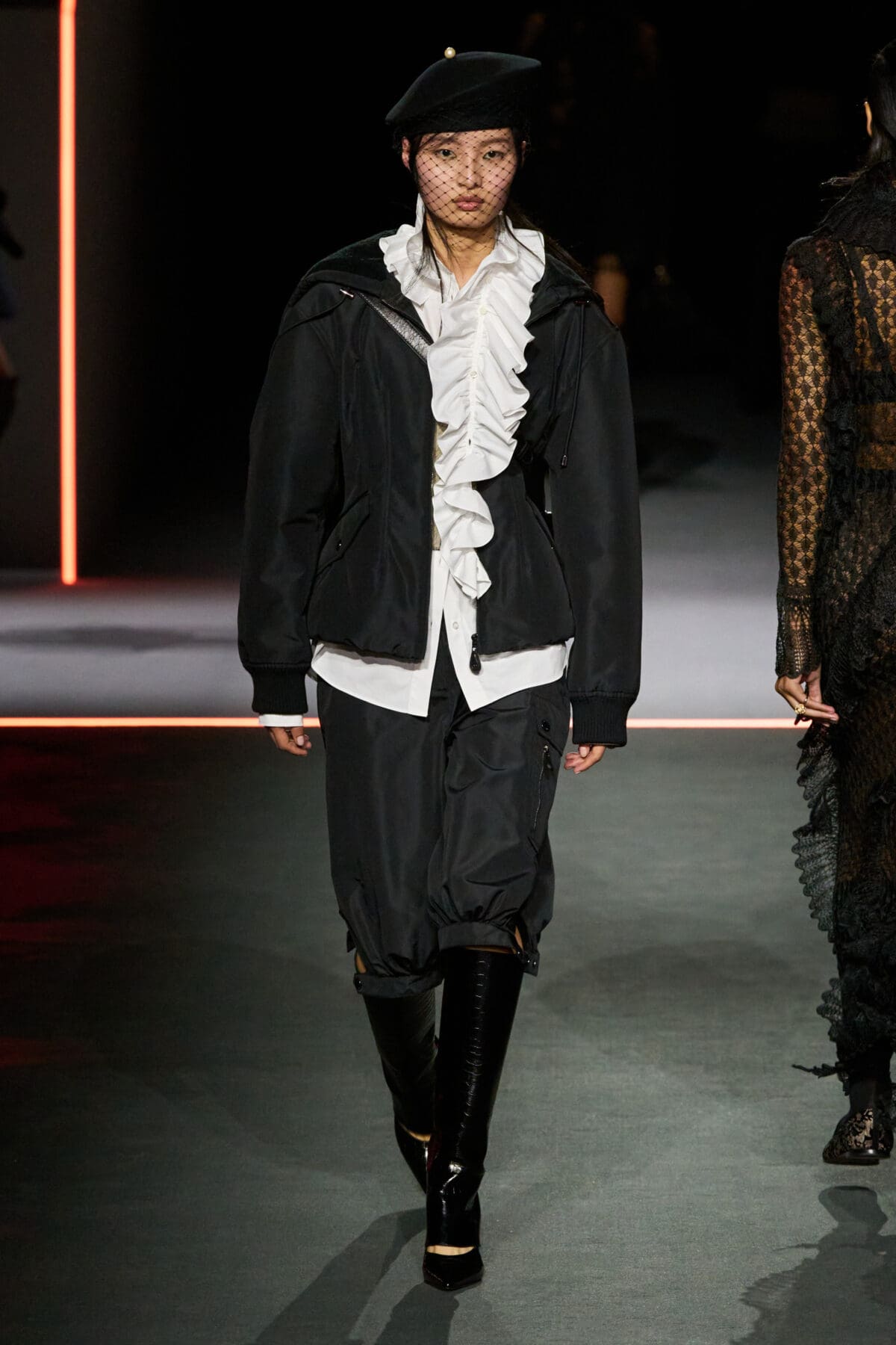 That’s quite a thing to say when you’re ostensibly looking at Tudor doublets and knickerbockers, Elizabethan stomachers, ruffs, redingotes, medieval suits of armor and (pretend) royal ermine. But Chiuri dealt with all of this in a largely believable way from the first look: a quasi-antique men’s jacket with the internal tailoring basting on the outside with a black frilled blouse spilling from its neck, Bermuda-y knickers and a kind of spat-kneeboot.