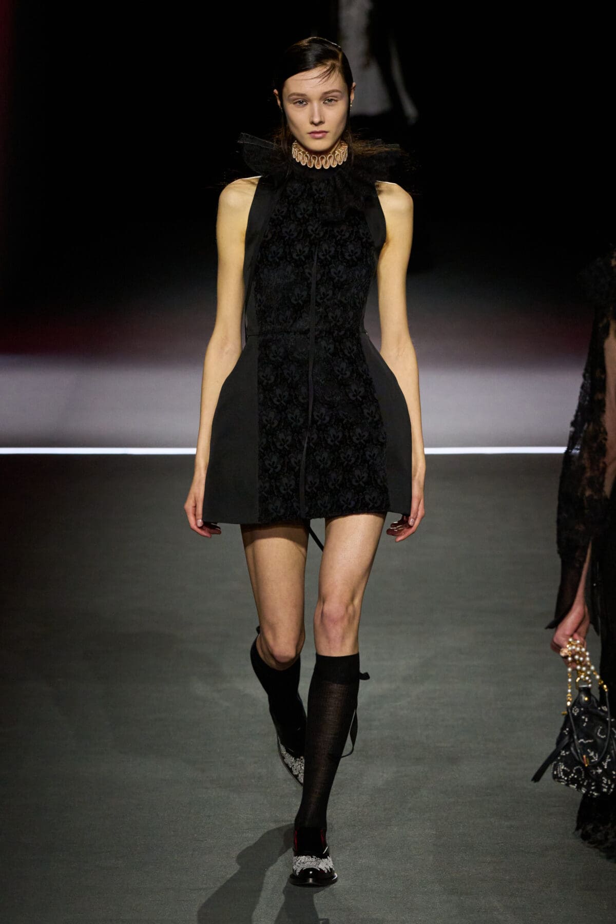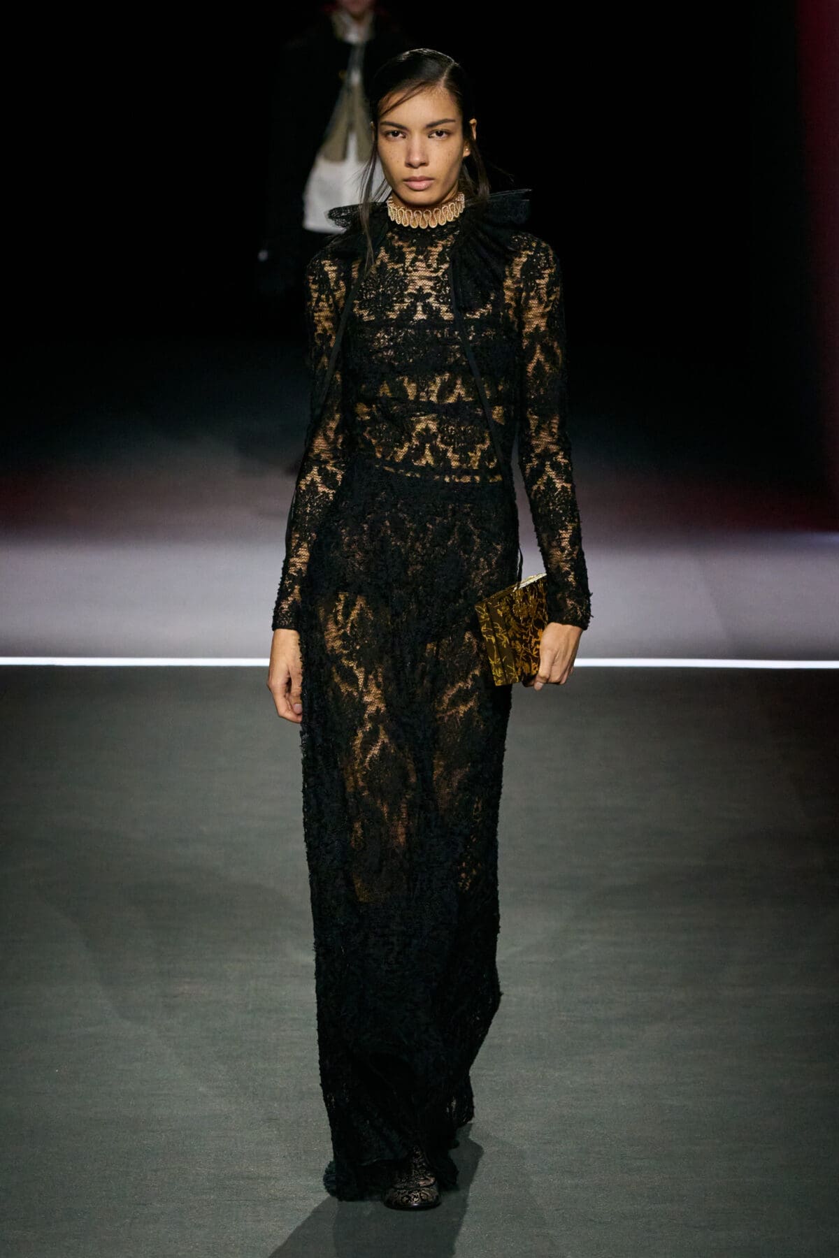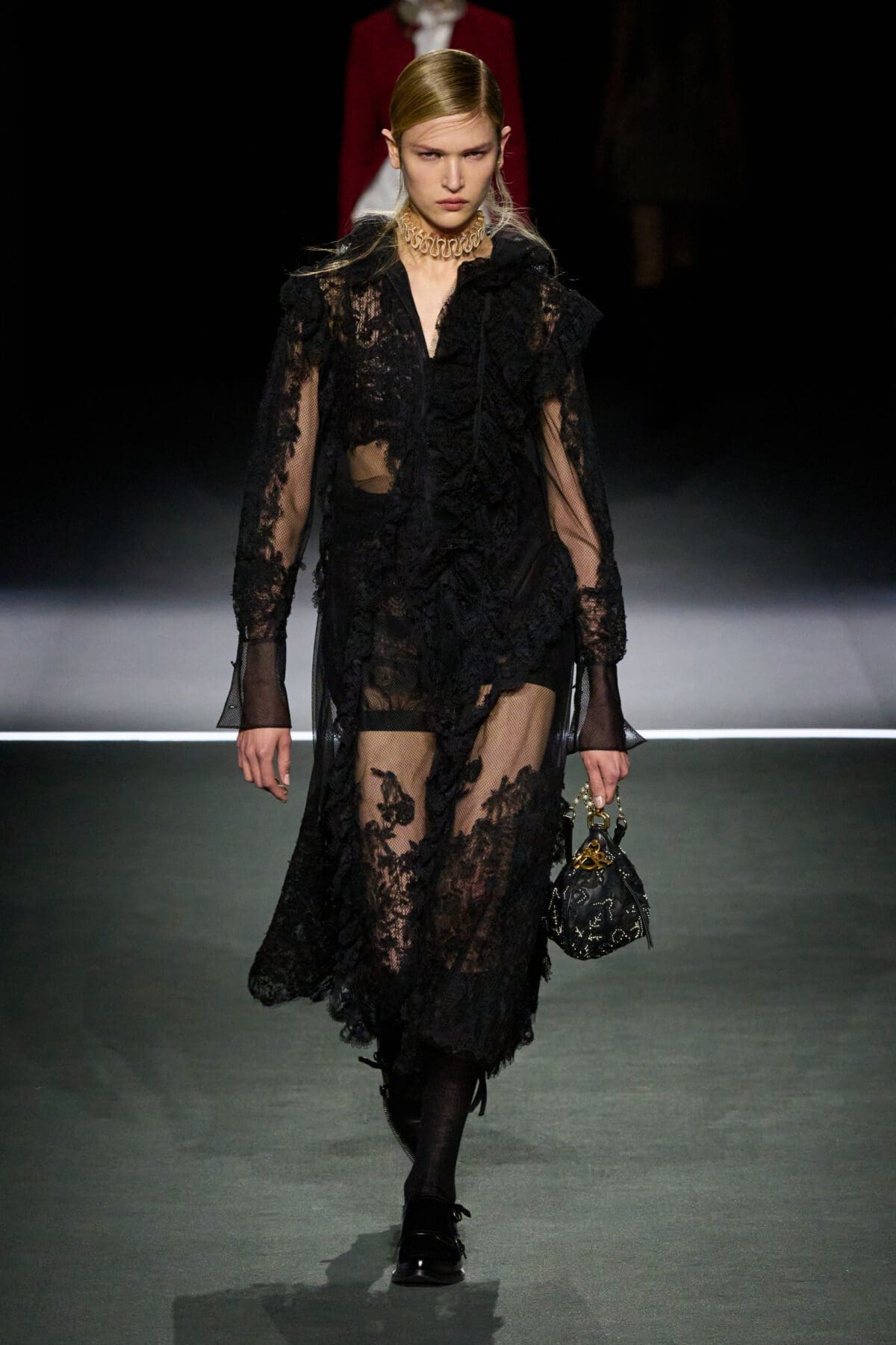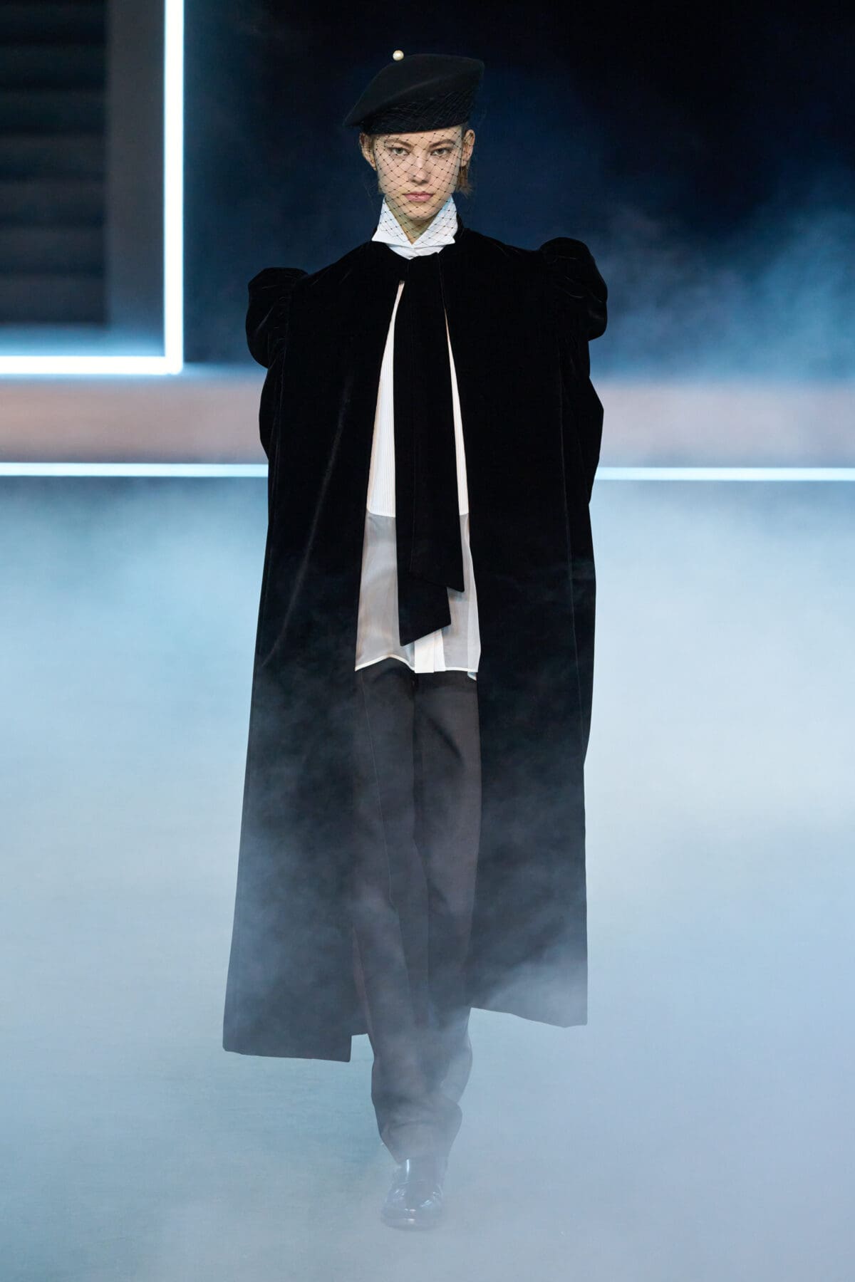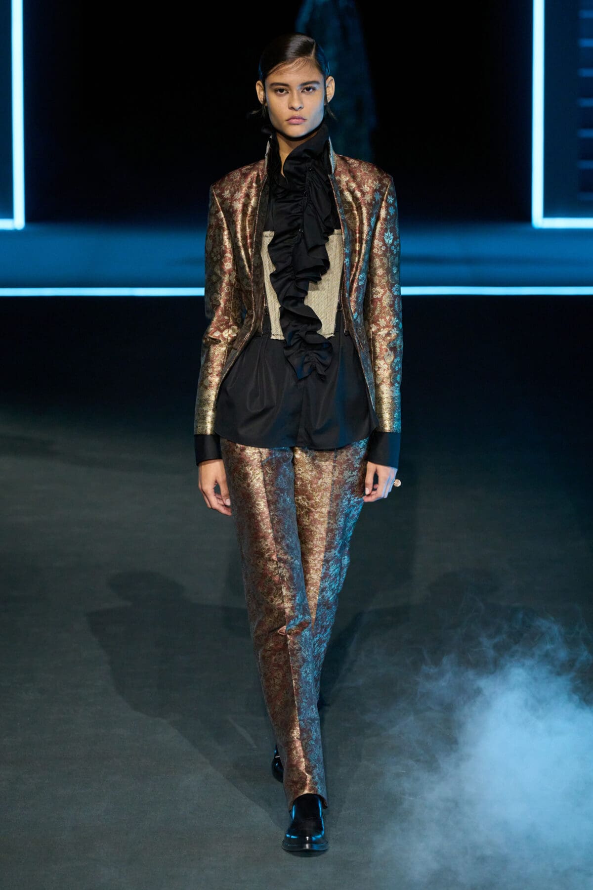 That’s quite a thing to say when you’re ostensibly looking at Tudor doublets and knickerbockers, Elizabethan stomachers, ruffs, redingotes, medieval suits of armor and (pretend) royal ermine. But Chiuri dealt with all of this in a largely believable way from the first look: a quasi-antique men’s jacket with the internal tailoring basting on the outside with a black frilled blouse spilling from its neck, Bermuda-y knickers and a kind of spat-kneeboot.