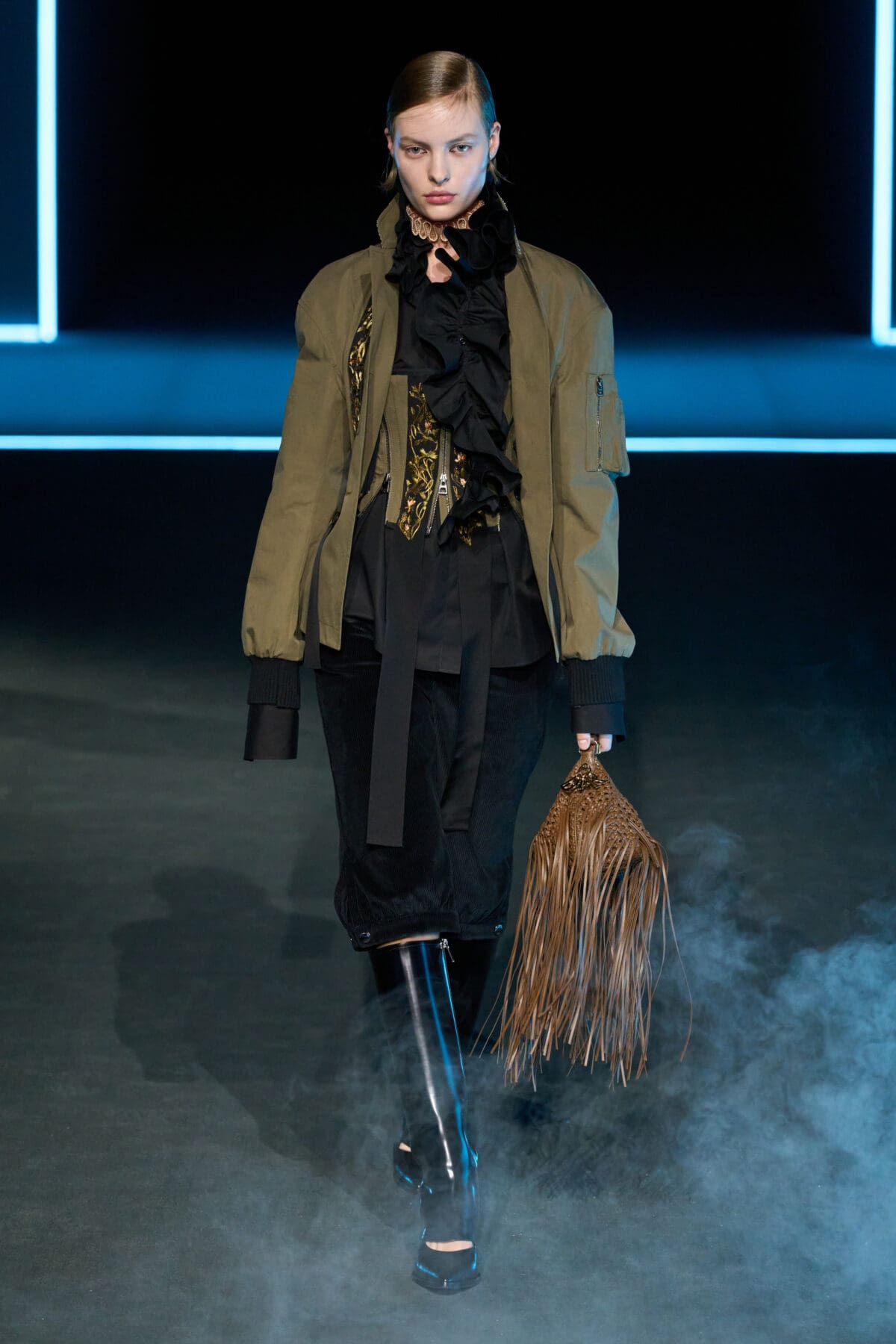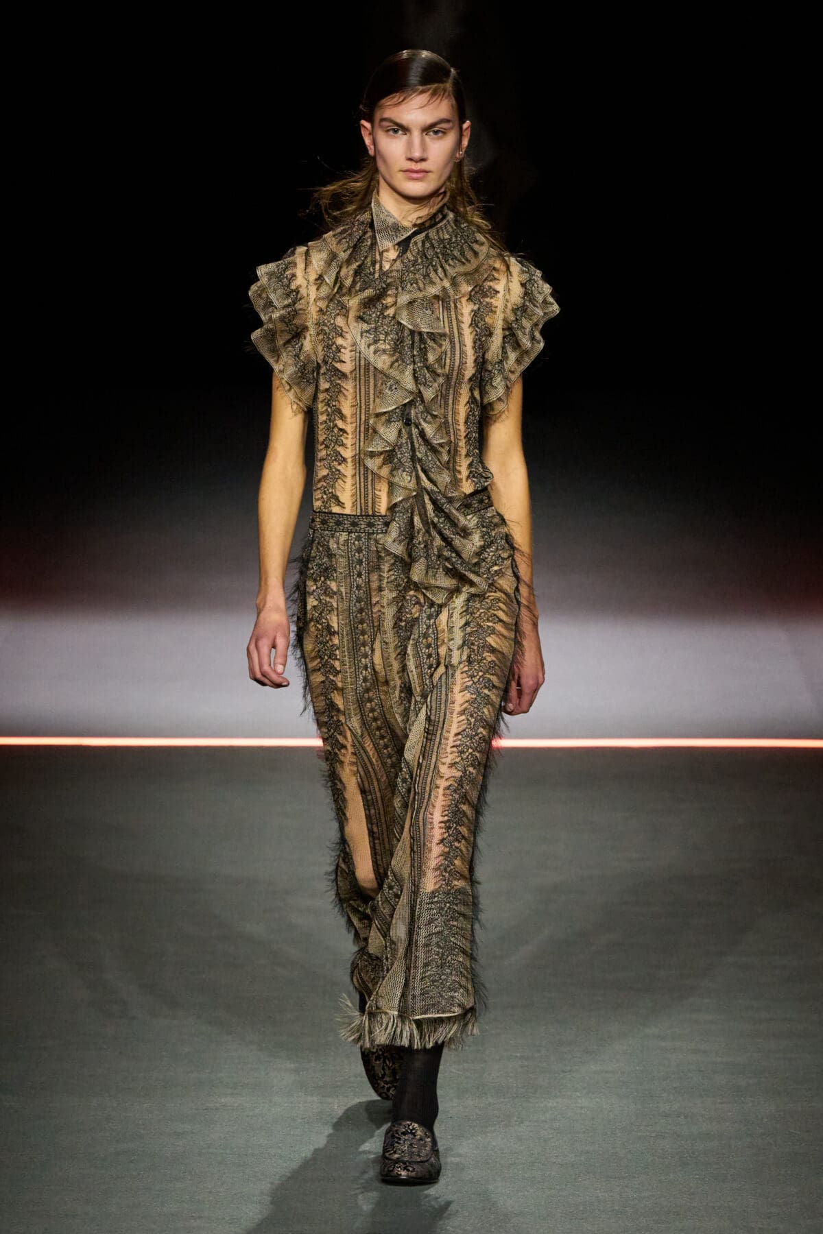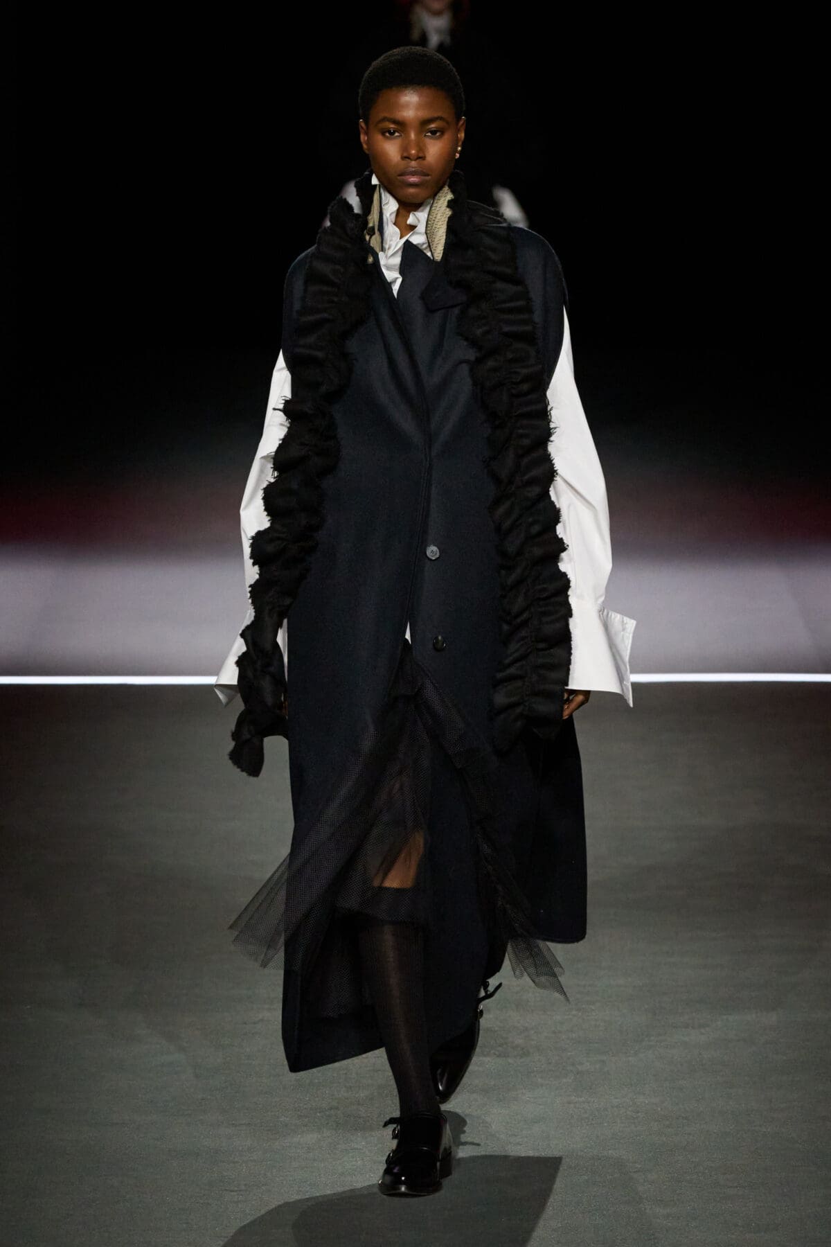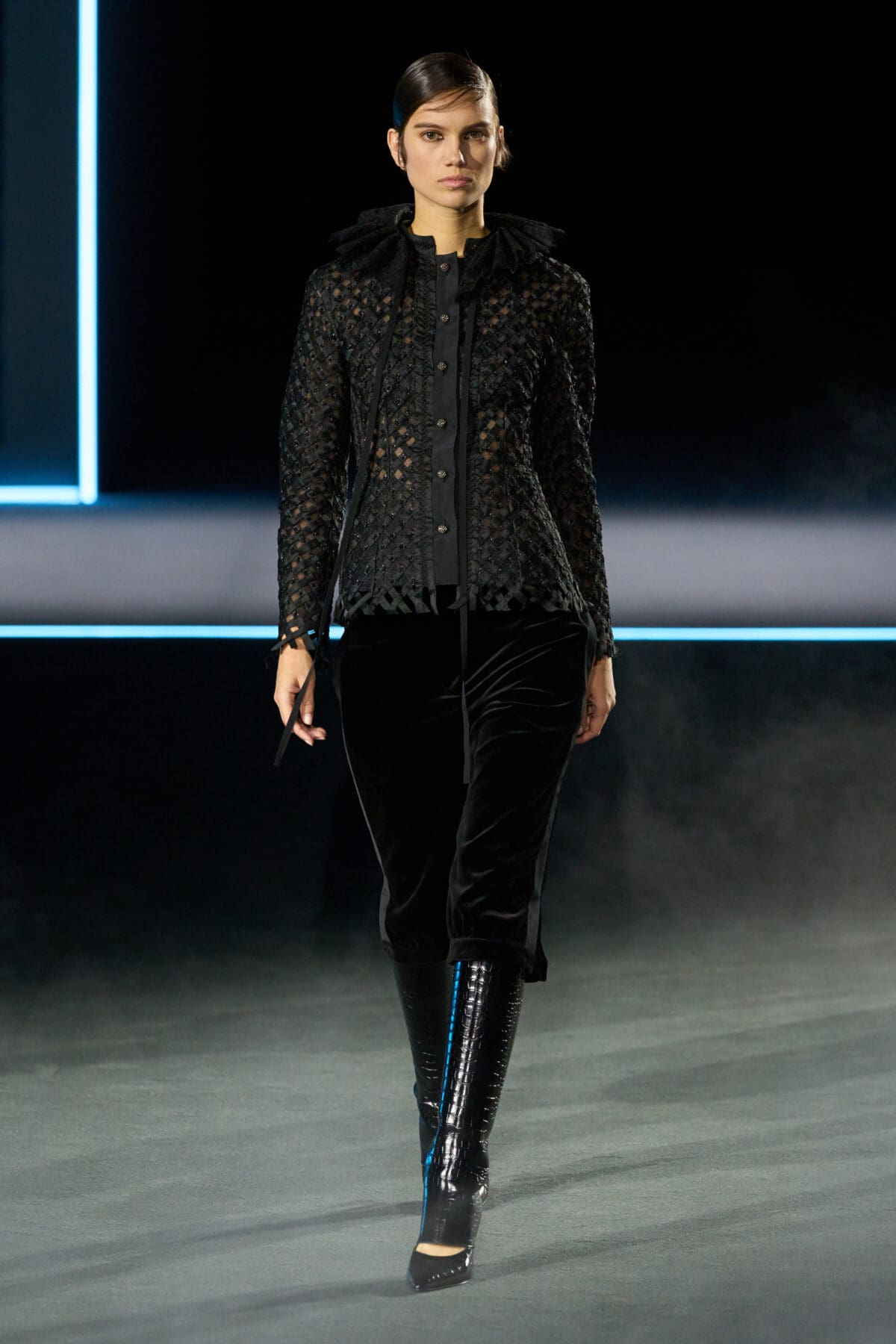 That’s quite a thing to say when you’re ostensibly looking at Tudor doublets and knickerbockers, Elizabethan stomachers, ruffs, redingotes, medieval suits of armor and (pretend) royal ermine. But Chiuri dealt with all of this in a largely believable way from the first look: a quasi-antique men’s jacket with the internal tailoring basting on the outside with a black frilled blouse spilling from its neck, Bermuda-y knickers and a kind of spat-kneeboot.