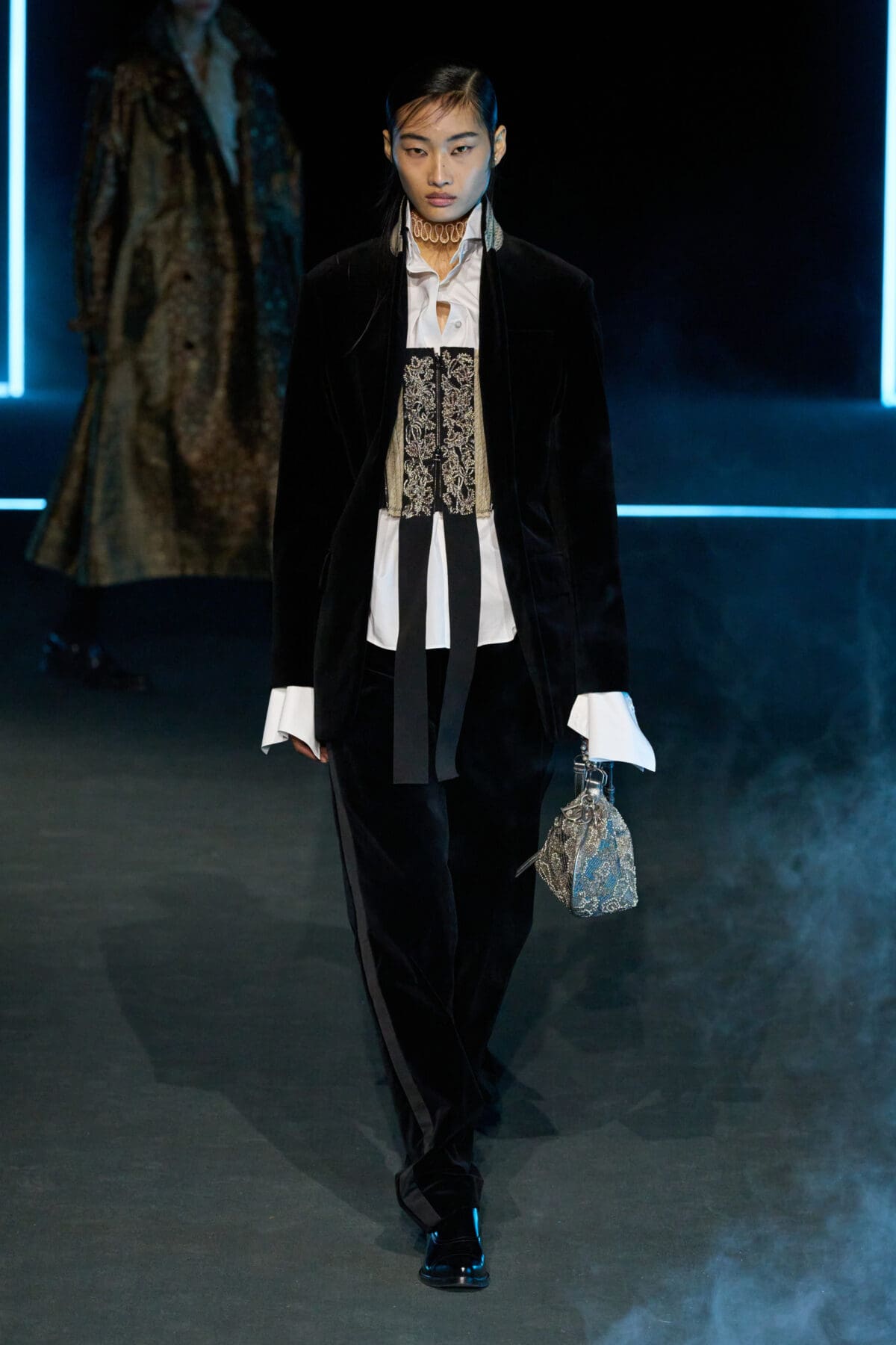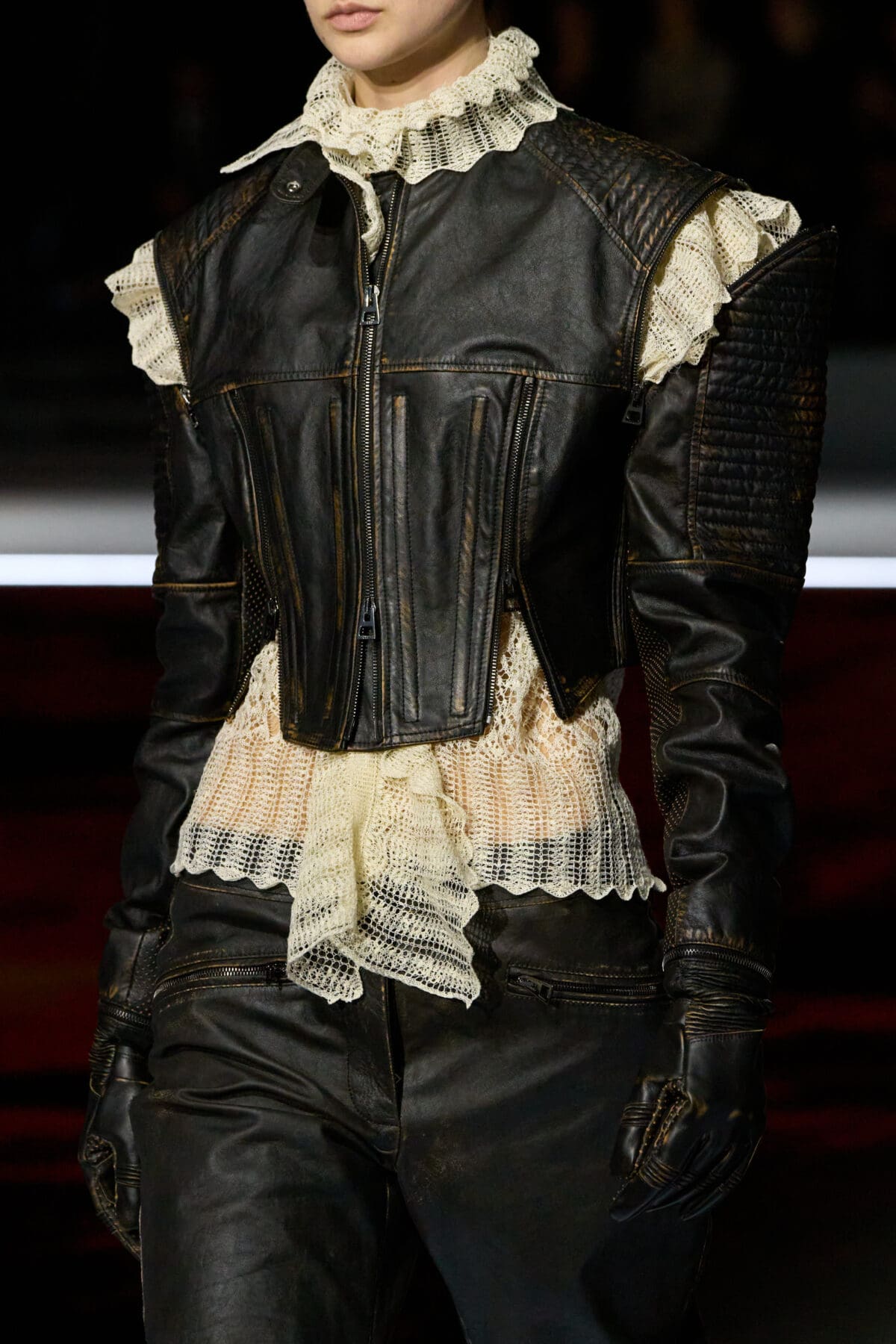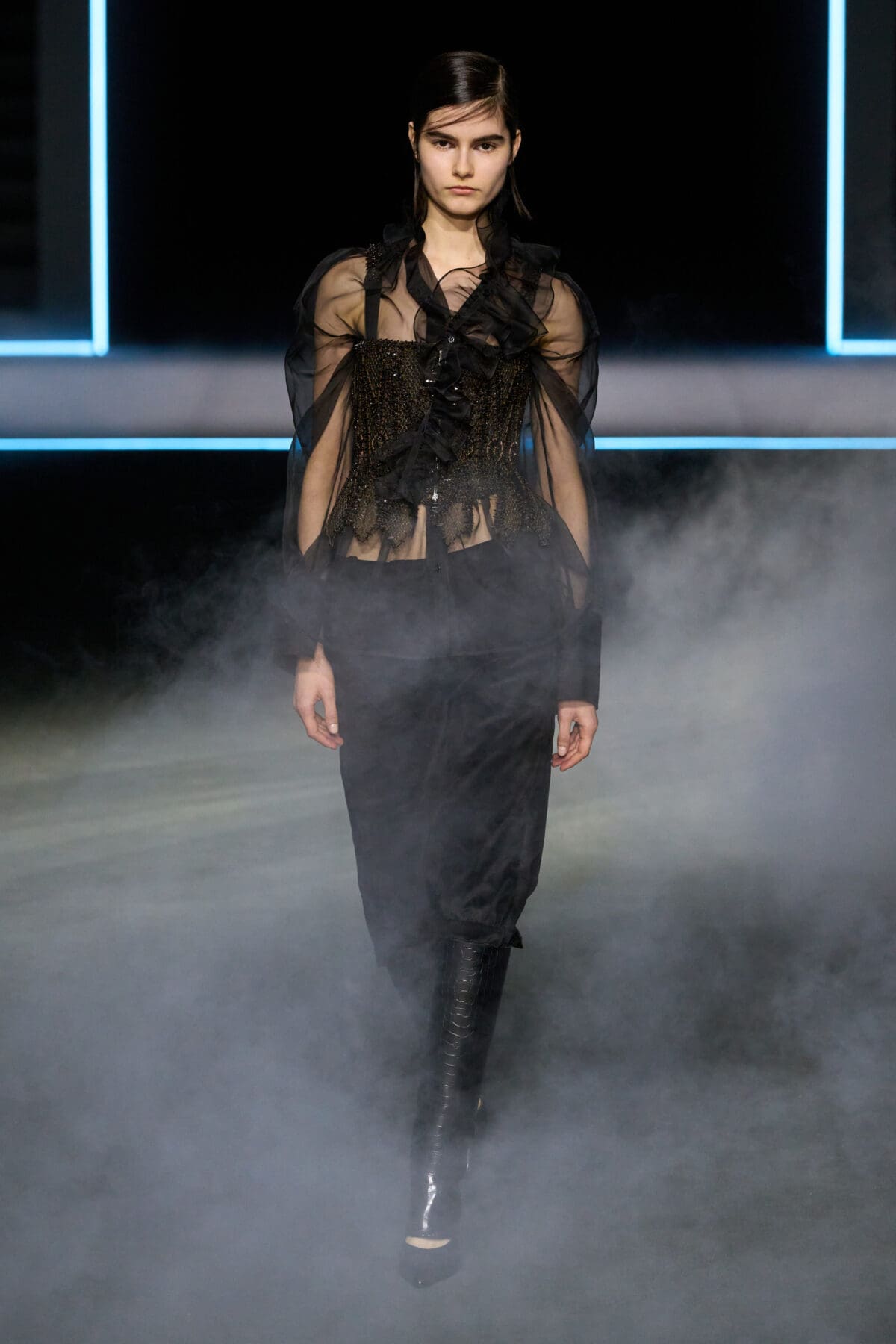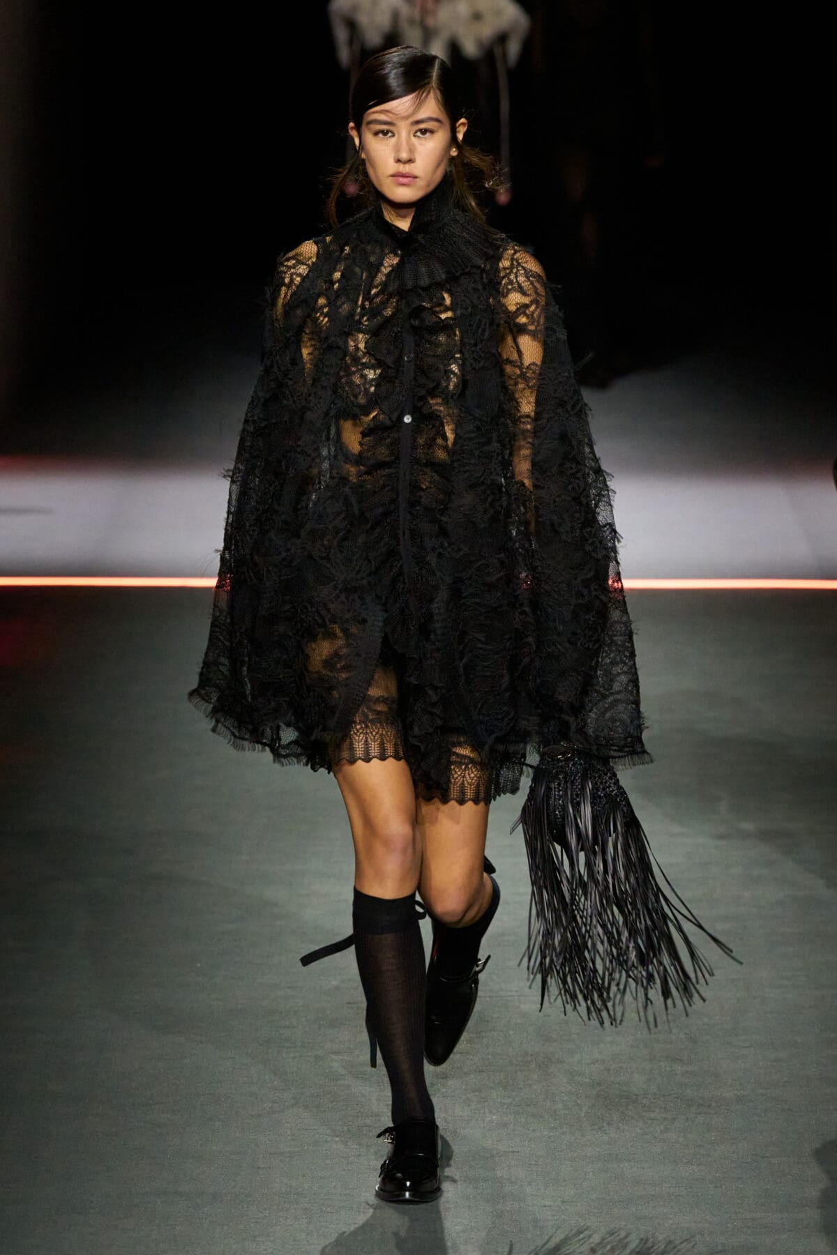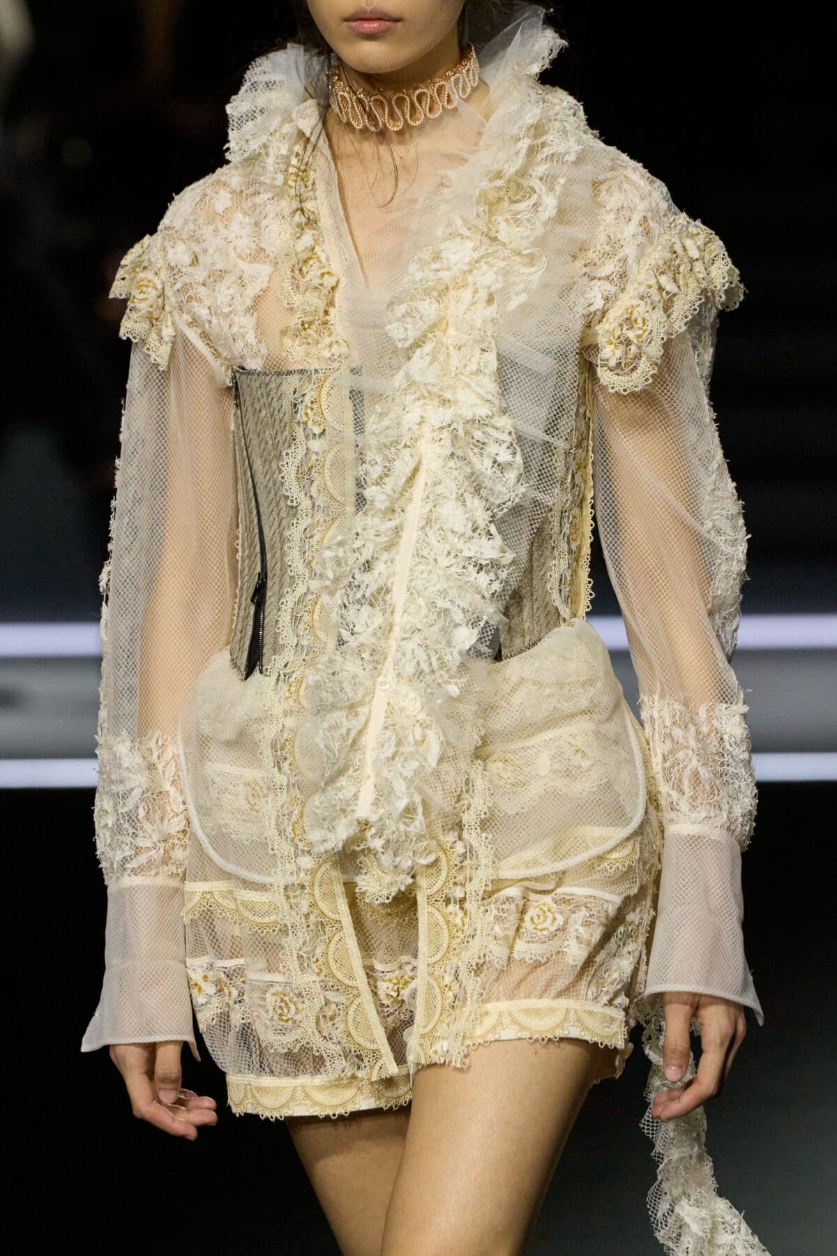 That’s quite a thing to say when you’re ostensibly looking at Tudor doublets and knickerbockers, Elizabethan stomachers, ruffs, redingotes, medieval suits of armor and (pretend) royal ermine. But Chiuri dealt with all of this in a largely believable way from the first look: a quasi-antique men’s jacket with the internal tailoring basting on the outside with a black frilled blouse spilling from its neck, Bermuda-y knickers and a kind of spat-kneeboot.