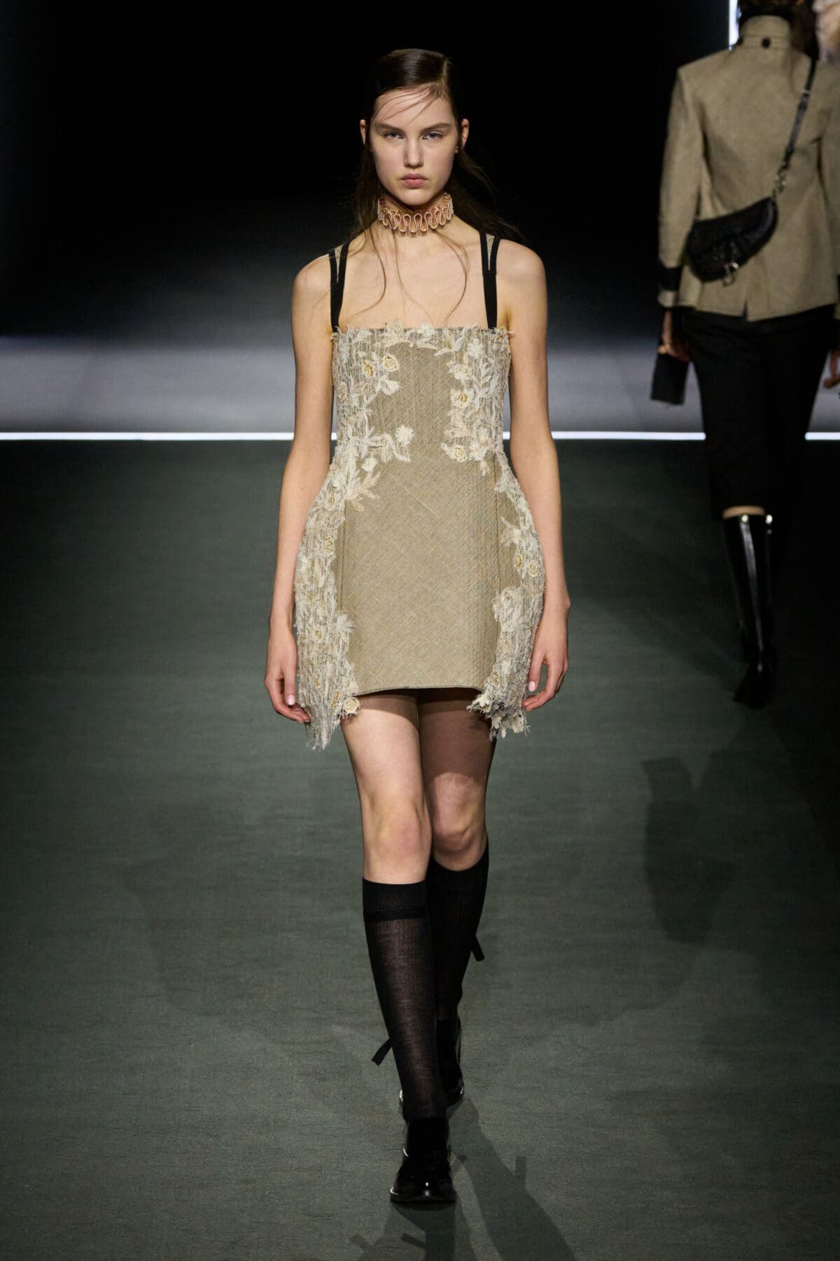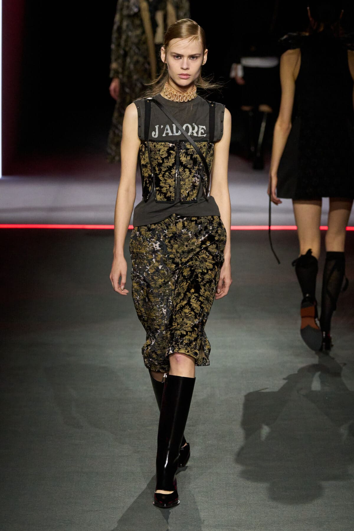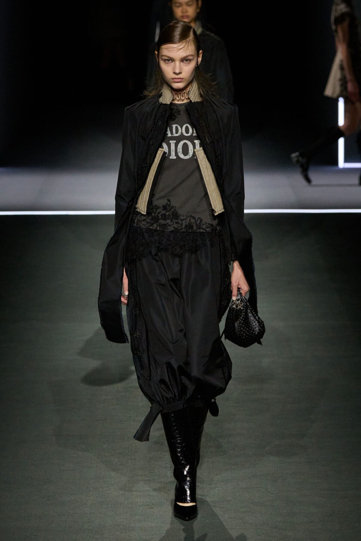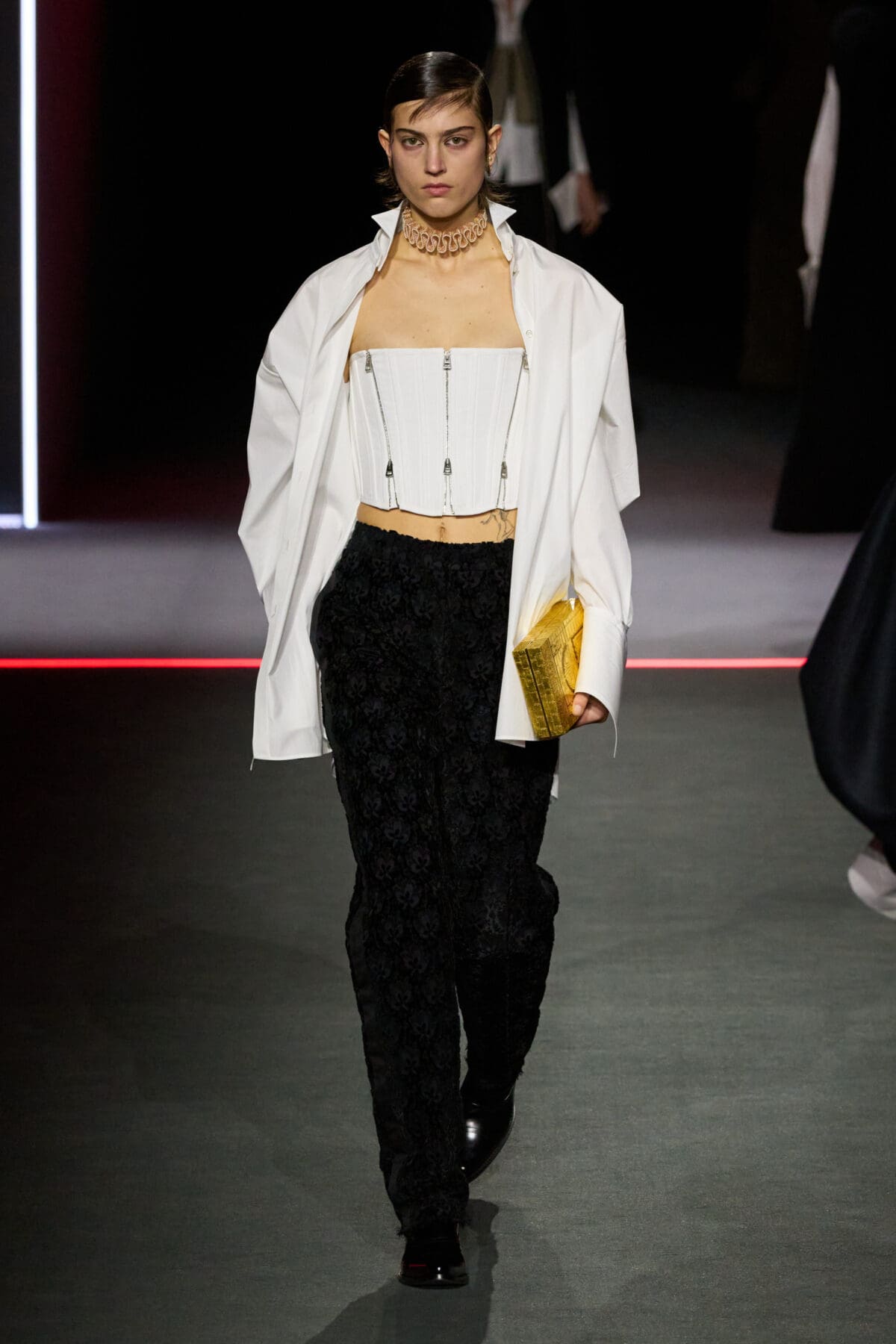 Now we were around to the subject of corsets—the classic fulcrum of the Christian Dior silhouette since 1947. And then it began to occur that this was in fact Chiuri’s least Dior collection to date, and was perhaps all the better for not sticking to the letter of the Bar jacket and circle skirt. Where there were Dior-isms, they were nods to John Galliano’s saddle bags (dinkily desirable in evening mini-form, on a pearl chain), his J’Adore Dior T-shirts, grungily aged, and Gianfranco Ferré’s thing for white shirts (although the originals were five times blousier). Chiuri also pointed out that she exploded the 1990s Lady Di bag to turn it into a capacious tote.