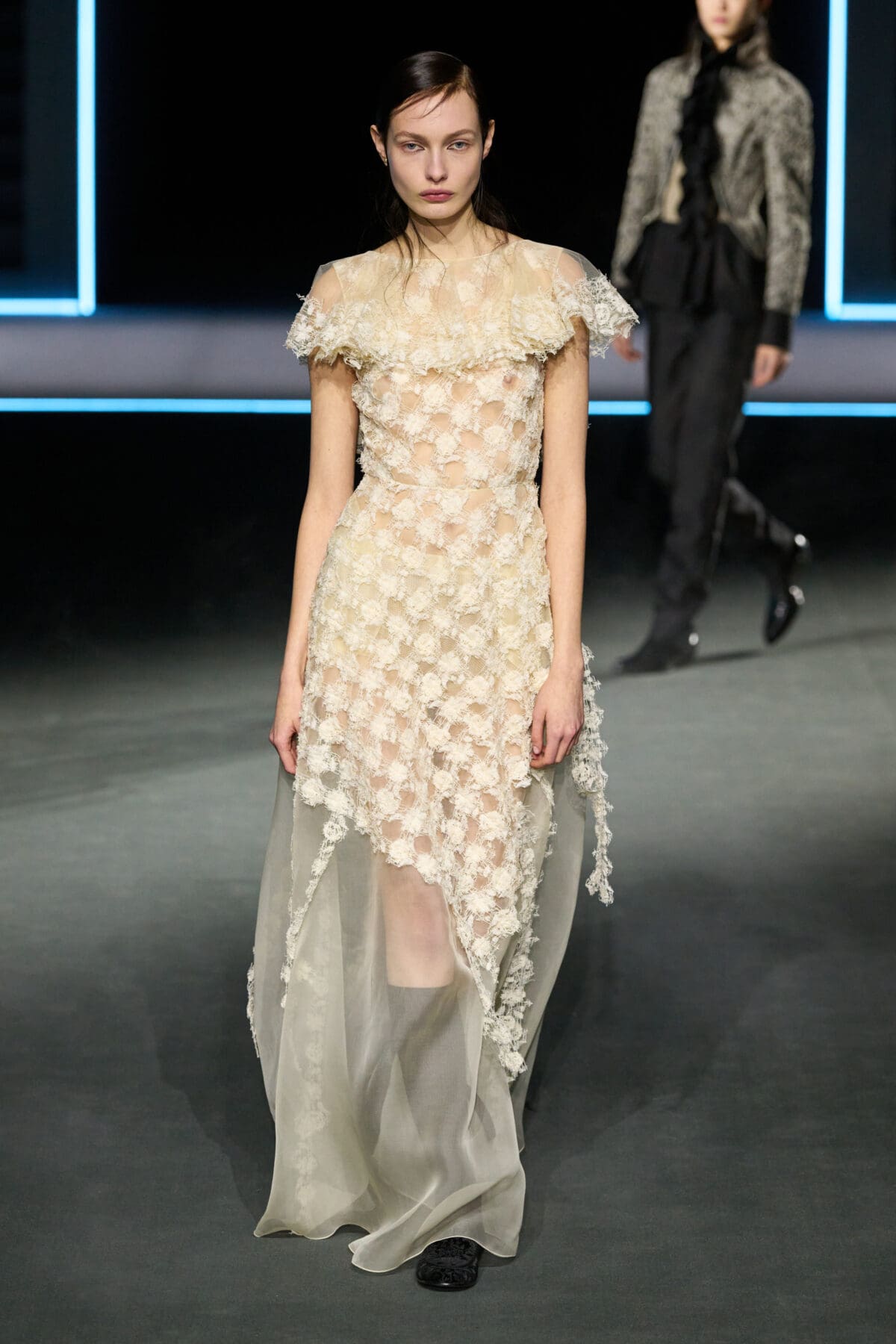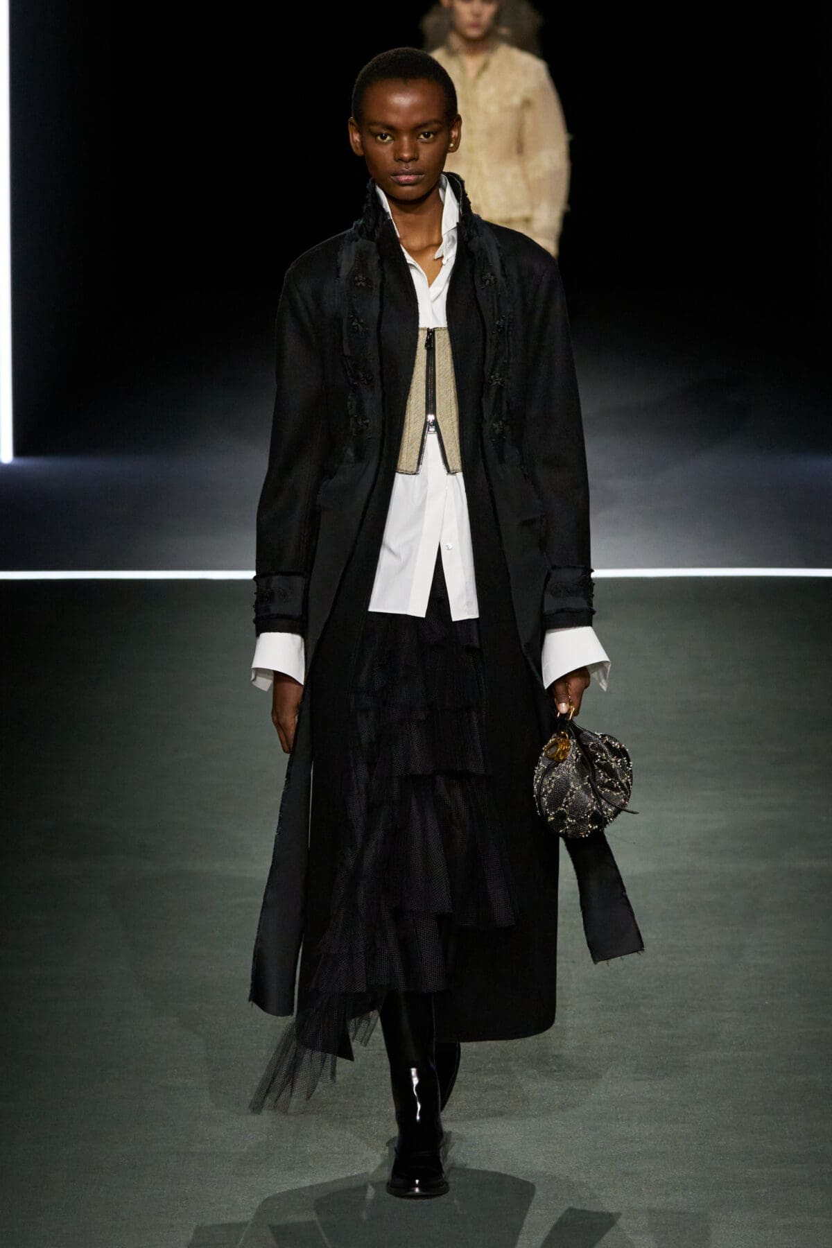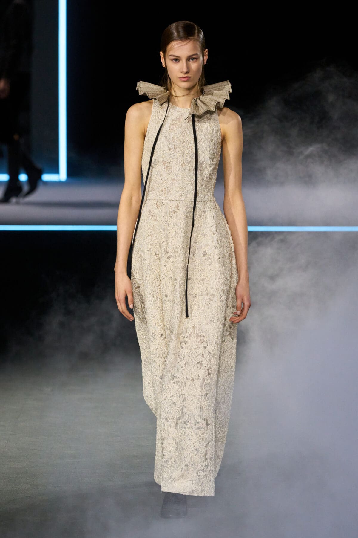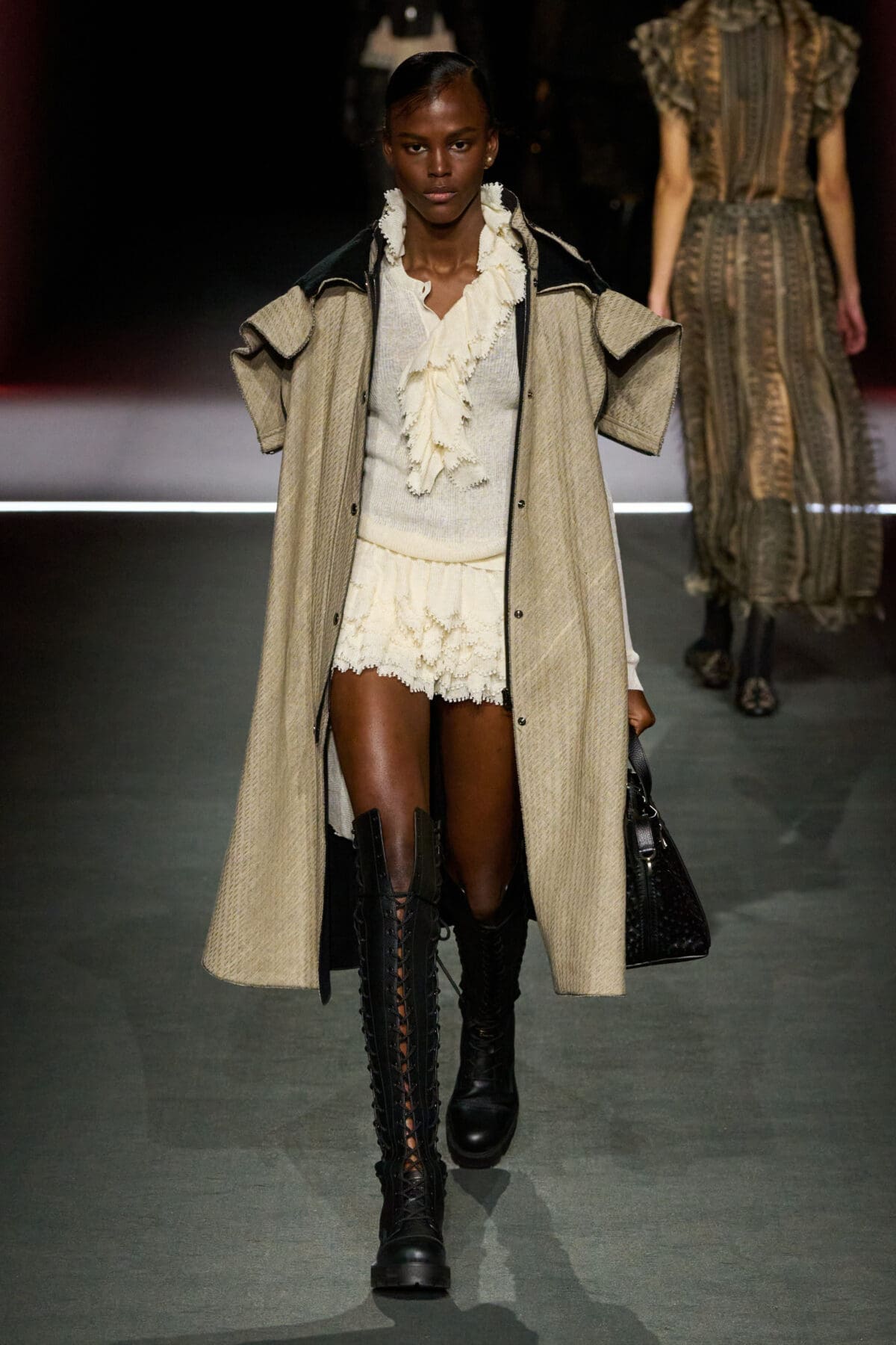 Now we were around to the subject of corsets—the classic fulcrum of the Christian Dior silhouette since 1947. And then it began to occur that this was in fact Chiuri’s least Dior collection to date, and was perhaps all the better for not sticking to the letter of the Bar jacket and circle skirt. Where there were Dior-isms, they were nods to John Galliano’s saddle bags (dinkily desirable in evening mini-form, on a pearl chain), his J’Adore Dior T-shirts, grungily aged, and Gianfranco Ferré’s thing for white shirts (although the originals were five times blousier). Chiuri also pointed out that she exploded the 1990s Lady Di bag to turn it into a capacious tote.