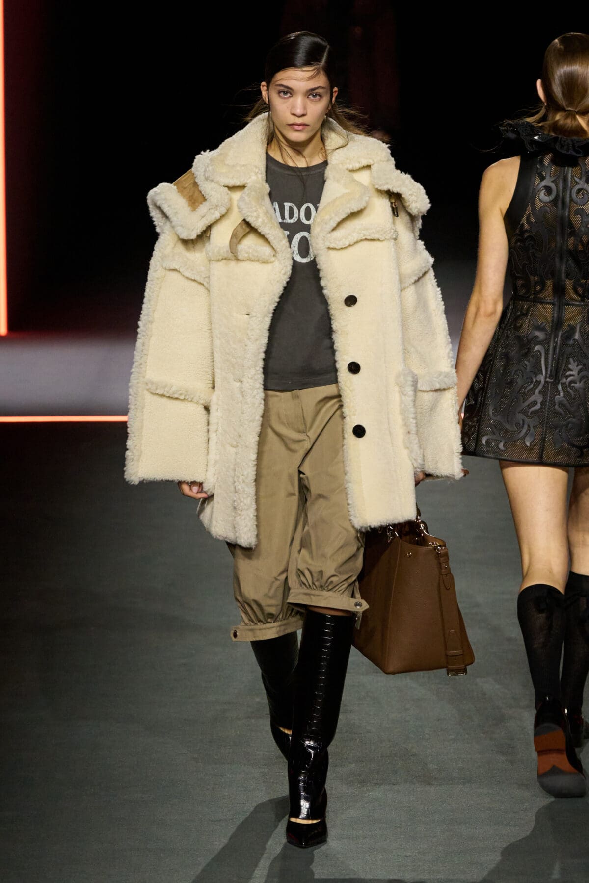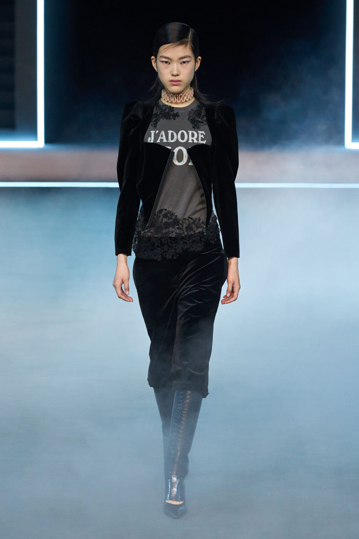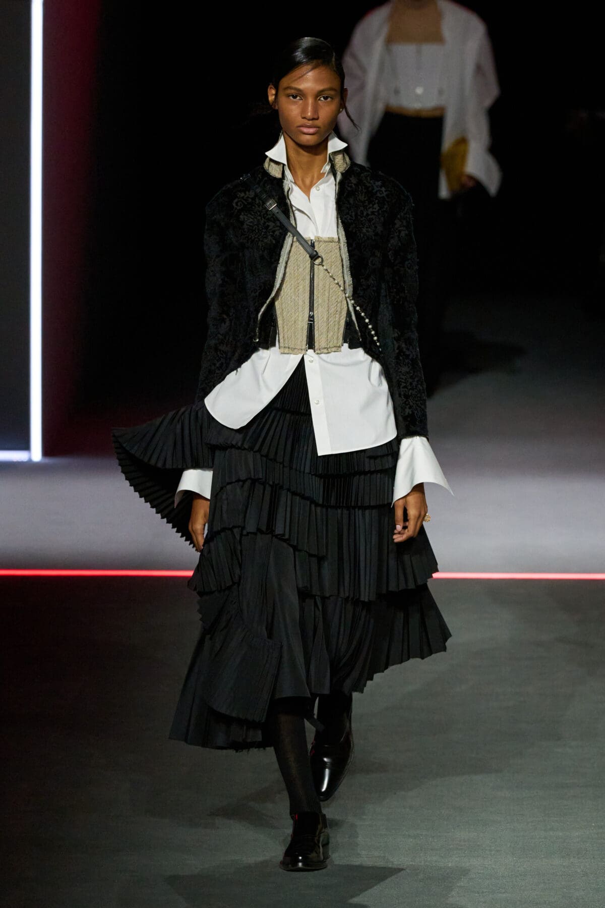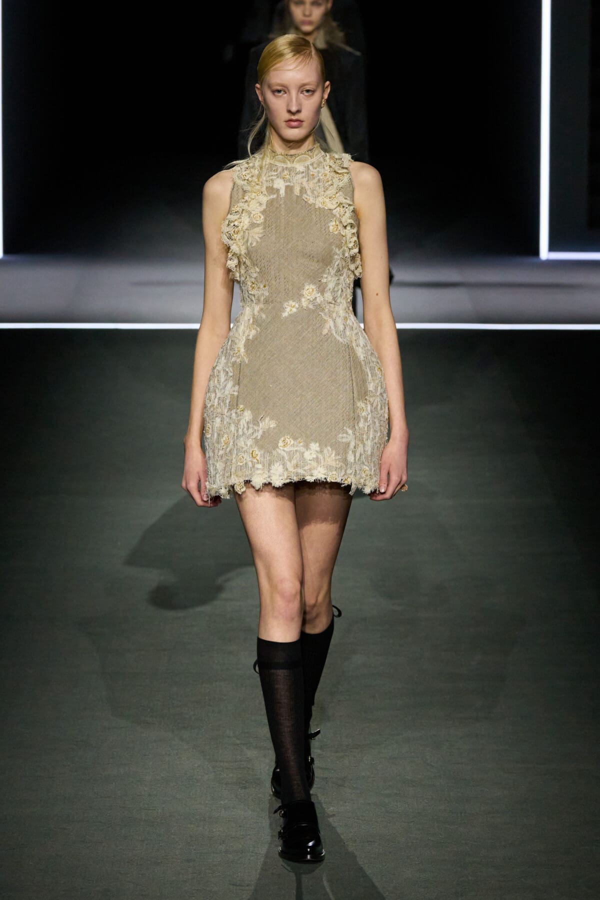 Now we were around to the subject of corsets—the classic fulcrum of the Christian Dior silhouette since 1947. And then it began to occur that this was in fact Chiuri’s least Dior collection to date, and was perhaps all the better for not sticking to the letter of the Bar jacket and circle skirt. Where there were Dior-isms, they were nods to John Galliano’s saddle bags (dinkily desirable in evening mini-form, on a pearl chain), his J’Adore Dior T-shirts, grungily aged, and Gianfranco Ferré’s thing for white shirts (although the originals were five times blousier). Chiuri also pointed out that she exploded the 1990s Lady Di bag to turn it into a capacious tote.