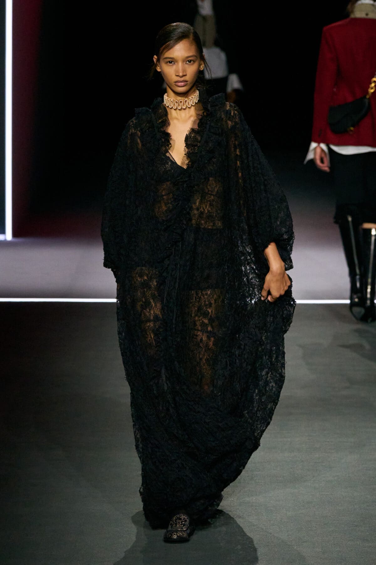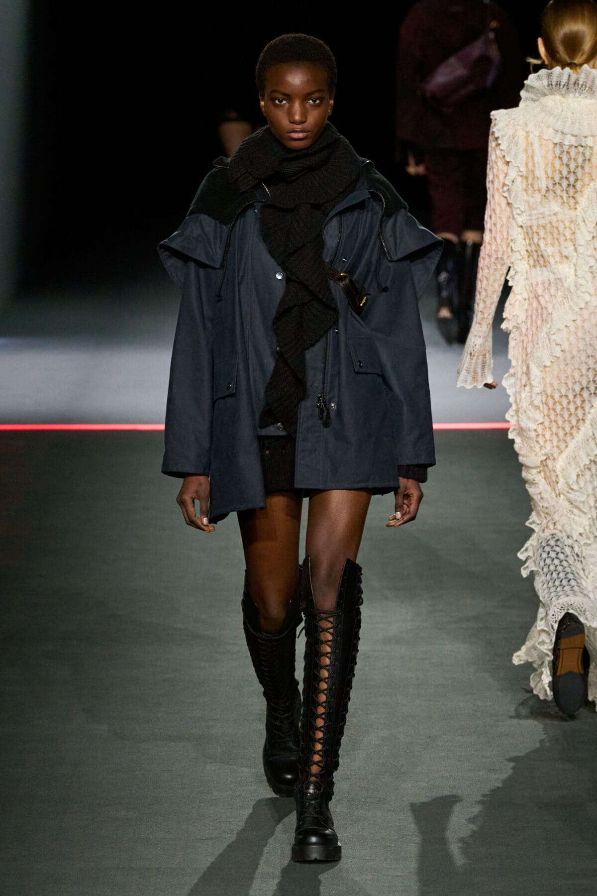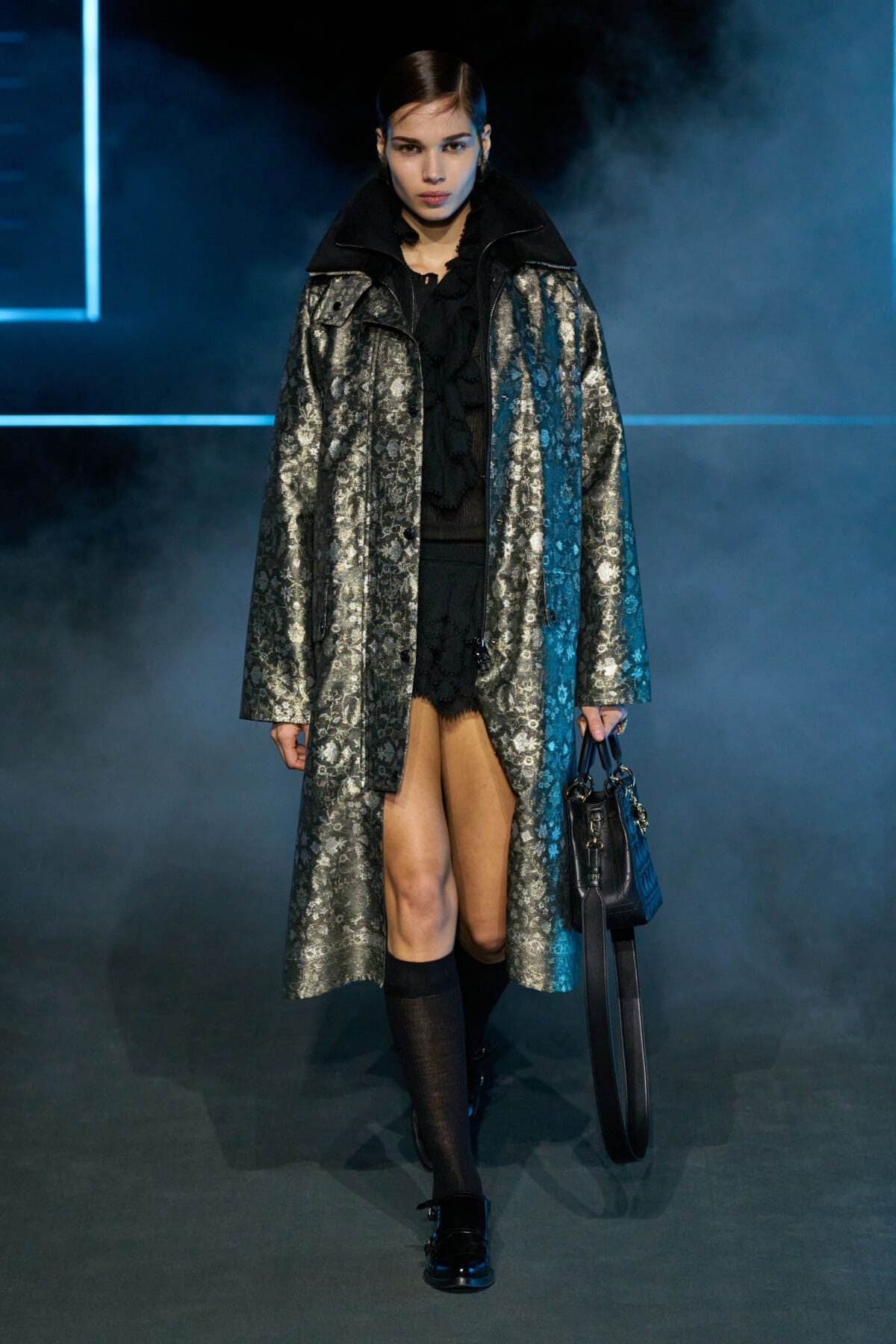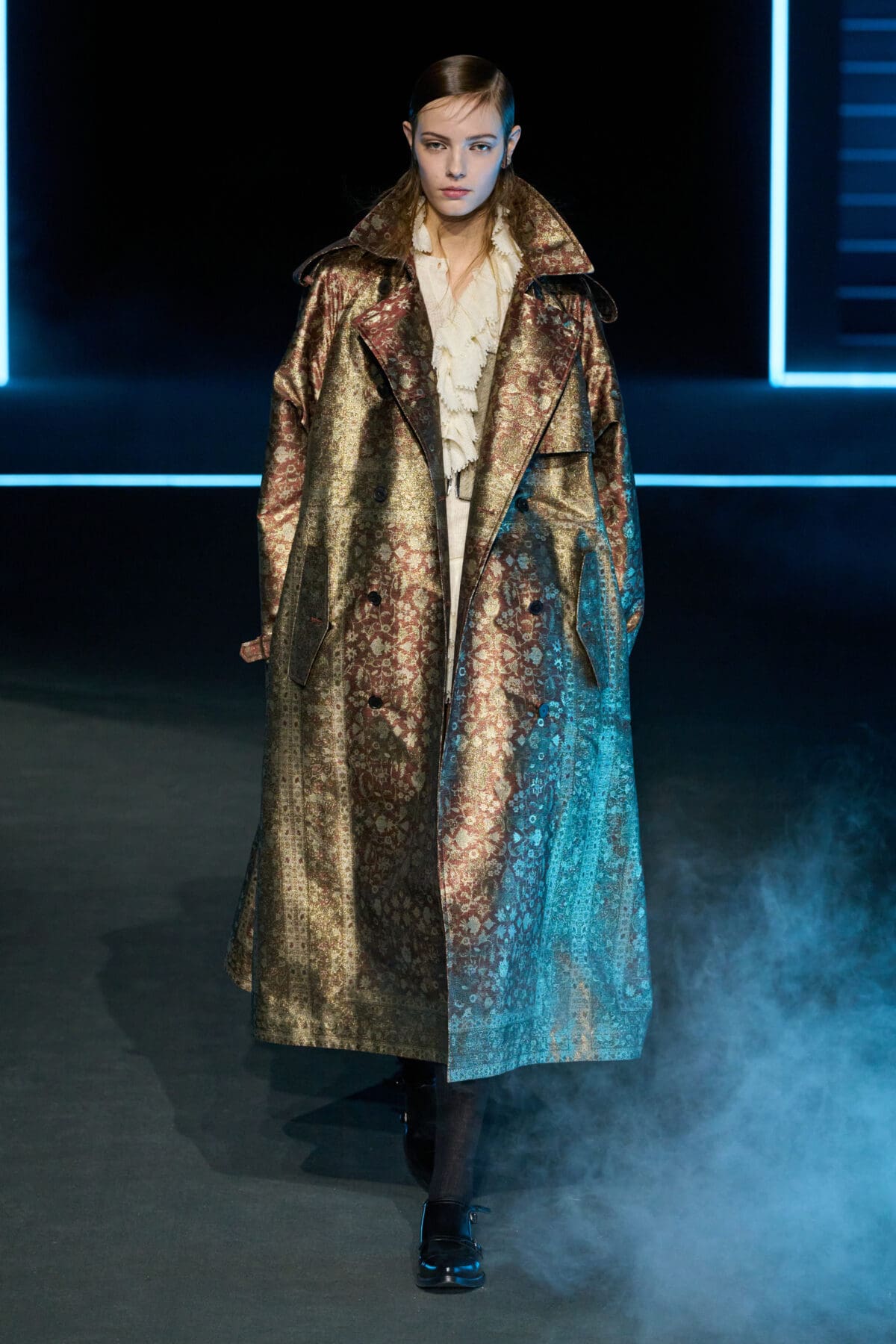 But really, what Chiuri was very good at this season was transforming rainwear and parkas into utility luxury garments via blurry prints of antique textiles on, say, riding macs or denim suits. The truth for most humans is that you can’t tell what you’re looking at any more: what appears unwearably hot and chunky turns out to be light; what seems to be lace (that overabundance of sheer dresses) is actually knitted.