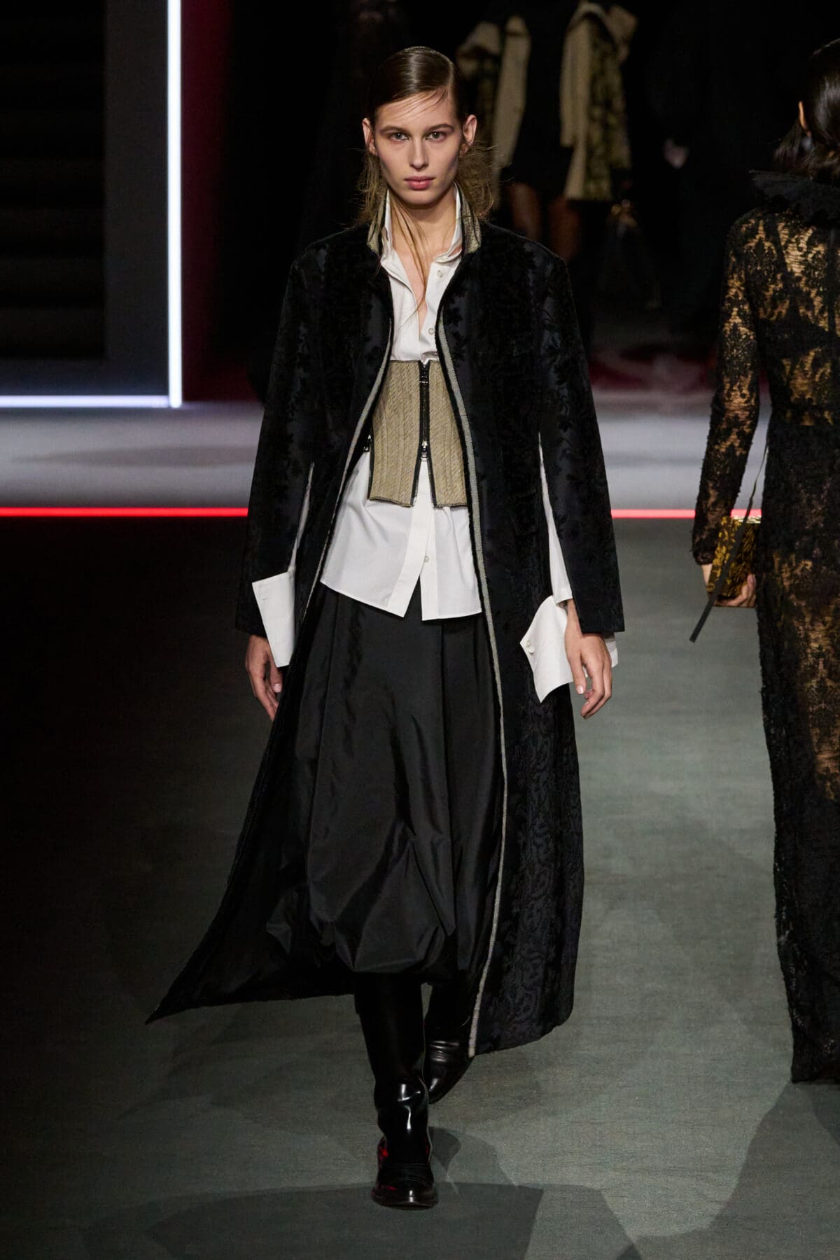 That put a promising foot forward for more tailoring to come: raw-edged black velvet brocaded coats and capes worn with copious crisp white foulard shirts with dangling cuffs, and particularly, a near red hacking jacket and black taffeta shorts. The smart part amongst all this was the masculine-feminine detail: corsets, or rather parts of them, designed to zipper in or out of the front of jackets, coats, parkas. Chiuri demonstrated how they could pull in a waistline should you be in the mood, or leave it undone, or off, when not.