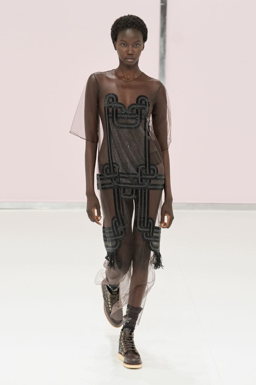 Between these foundational bookends, Jones roamed freely, mixing beige shearling robes, white crocodile suede T-shirts and skirts, and a mesh vest edged and waisted with house-ochre Cuoio Romano. The collection included an extremely fine (and hopefully menswear-encompassing) collaboration with heritage U.S. boot maker Red Wing. The resulting Selleria-stitched moccasin work boots emphasized the history of family feminine industry Jones was celebrating, but also, when worn with ruffled floral socks and clematis- and jasmine-pattern tea dresses, delivered unmissable grunge overtones.