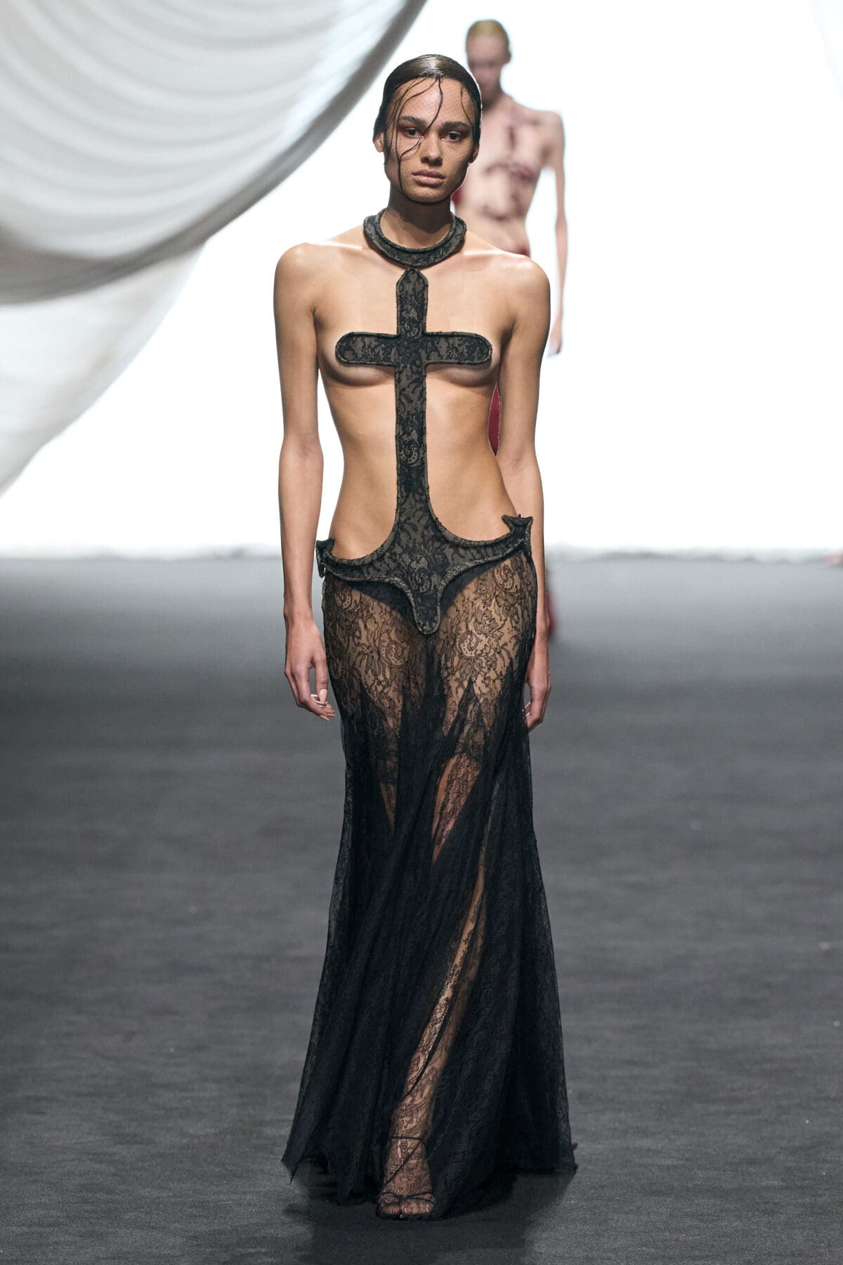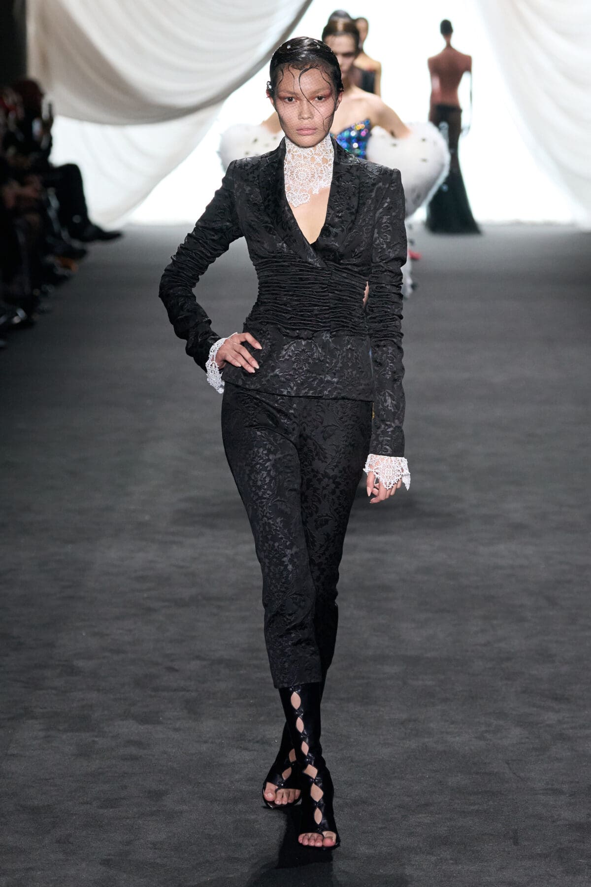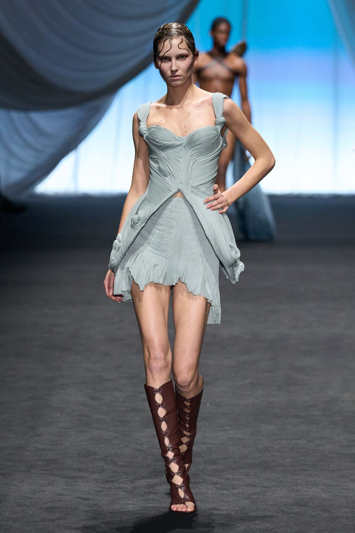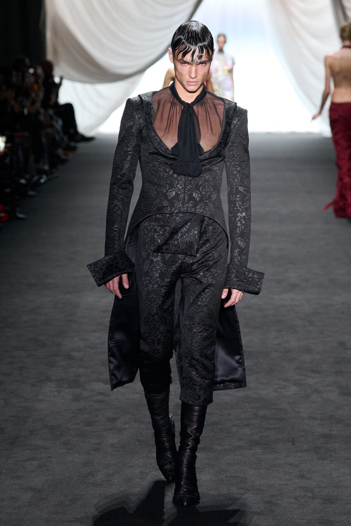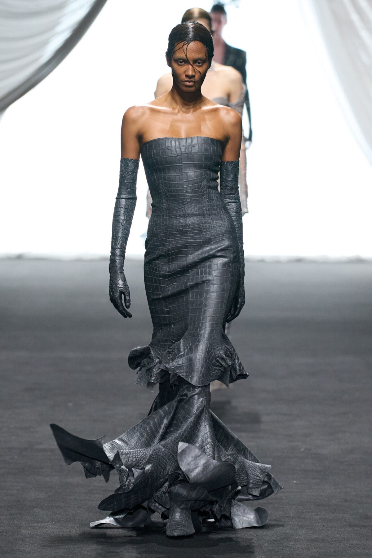 In the dimmed show space within the Gaultier HQ, where we initially waited and waited like in the olden days of Gaultier, de Saint Sernin delivered on all of this and more as the eighth—and youngest—designer invited into the ateliers for a single season. He dove straight in, starting with a theme, “Le Naufrage,” which translates as Shipwreck. (After Daniel Roseberry’s “Icarus” at Schiaparelli and Alessandro Michele’s “Vertigineux” or Dizzying at Valentino, designers this week have been courting risk with their titles, never mind their creations).