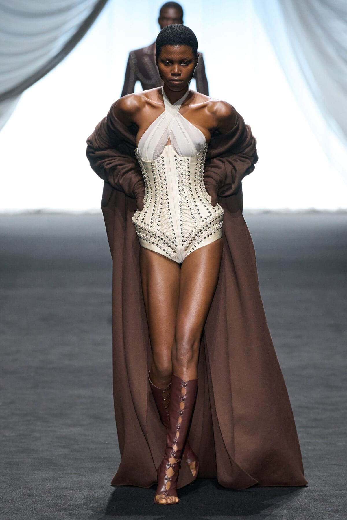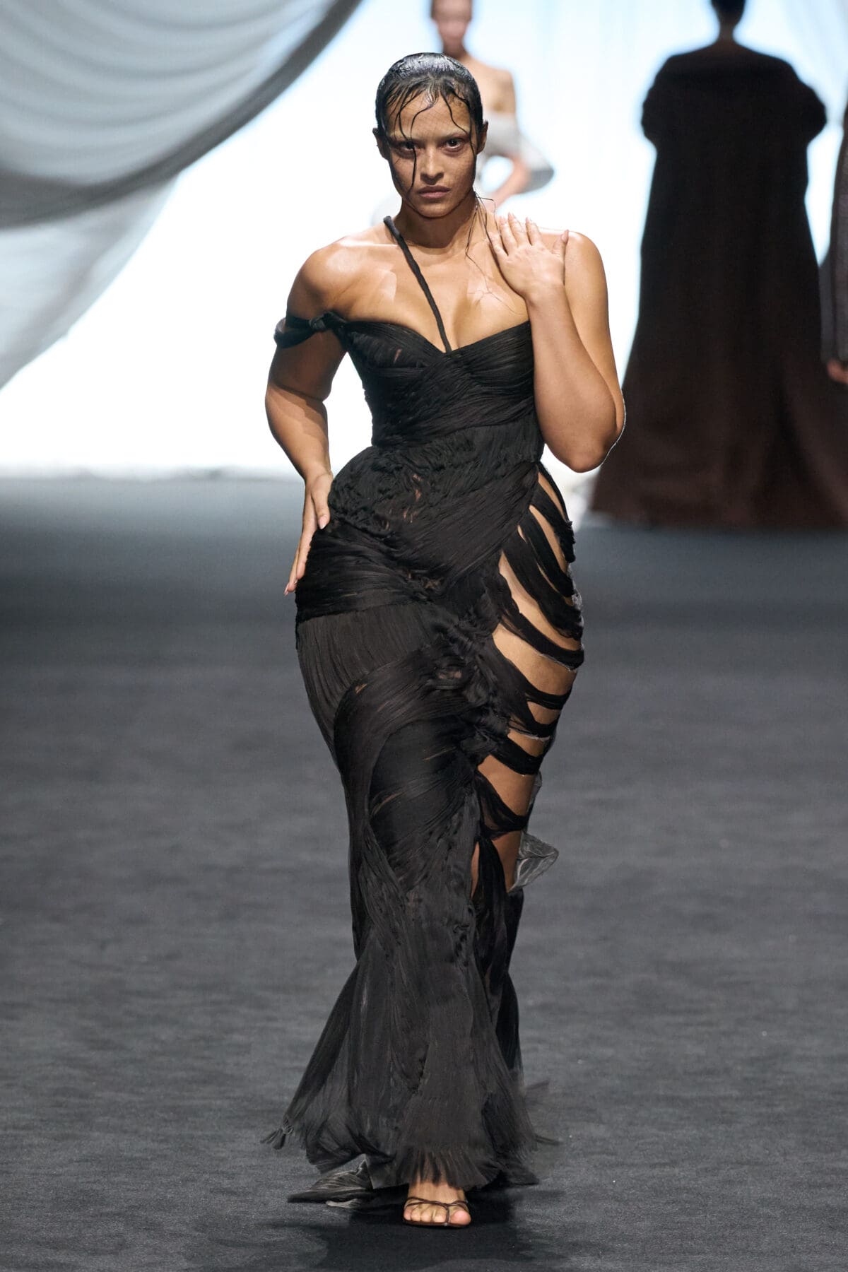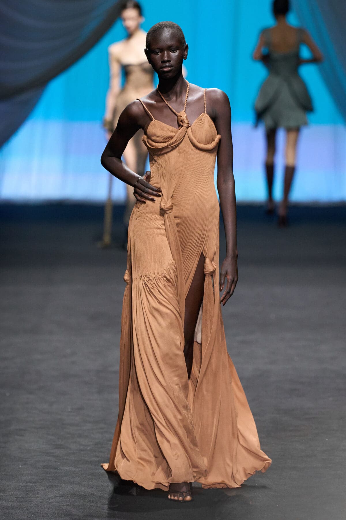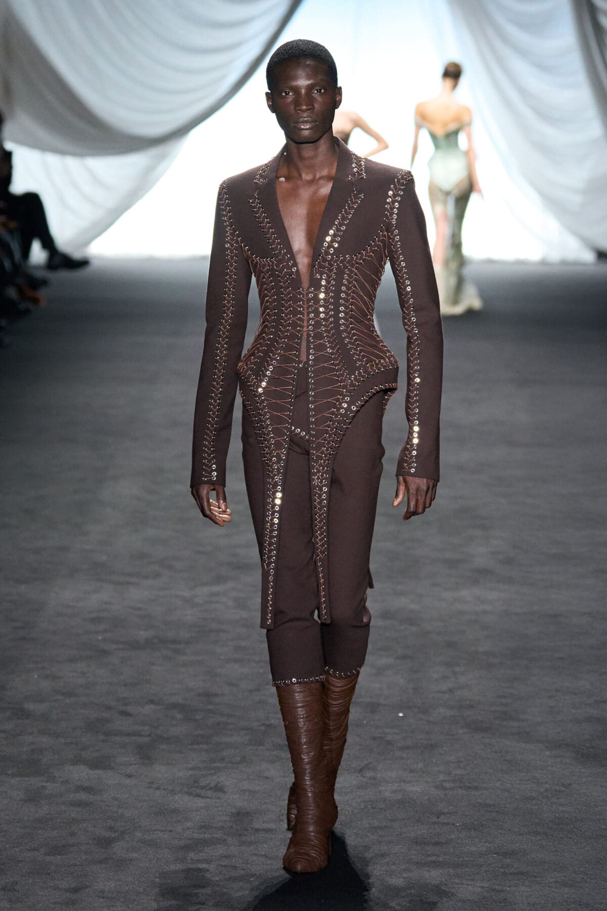In the dimmed show space within the Gaultier HQ, where we initially waited and waited like in the olden days of Gaultier, de Saint Sernin delivered on all of this and more as the eighth—and youngest—designer invited into the ateliers for a single season. He dove straight in, starting with a theme, “Le Naufrage,” which translates as Shipwreck. (After Daniel Roseberry’s “Icarus” at Schiaparelli and Alessandro Michele’s “Vertigineux” or Dizzying at Valentino, designers this week have been courting risk with their titles, never mind their creations).