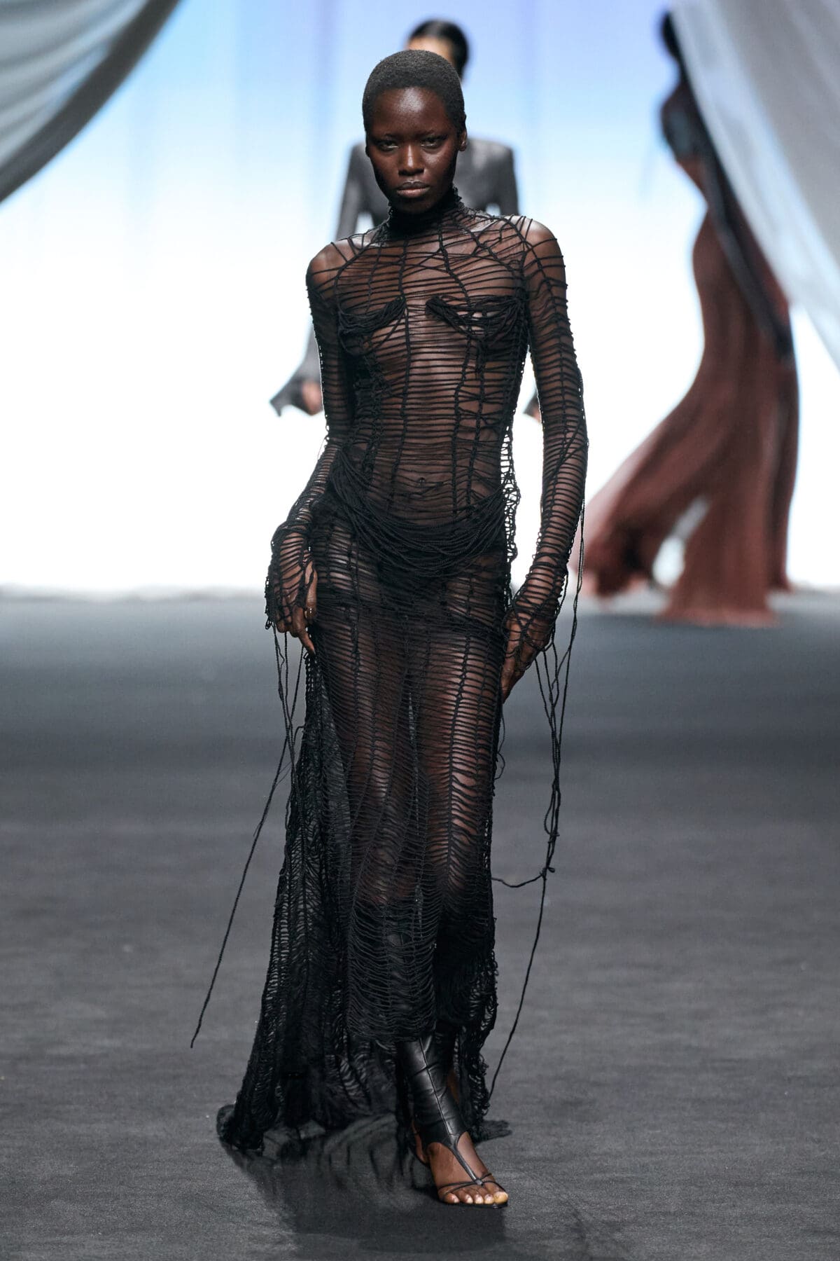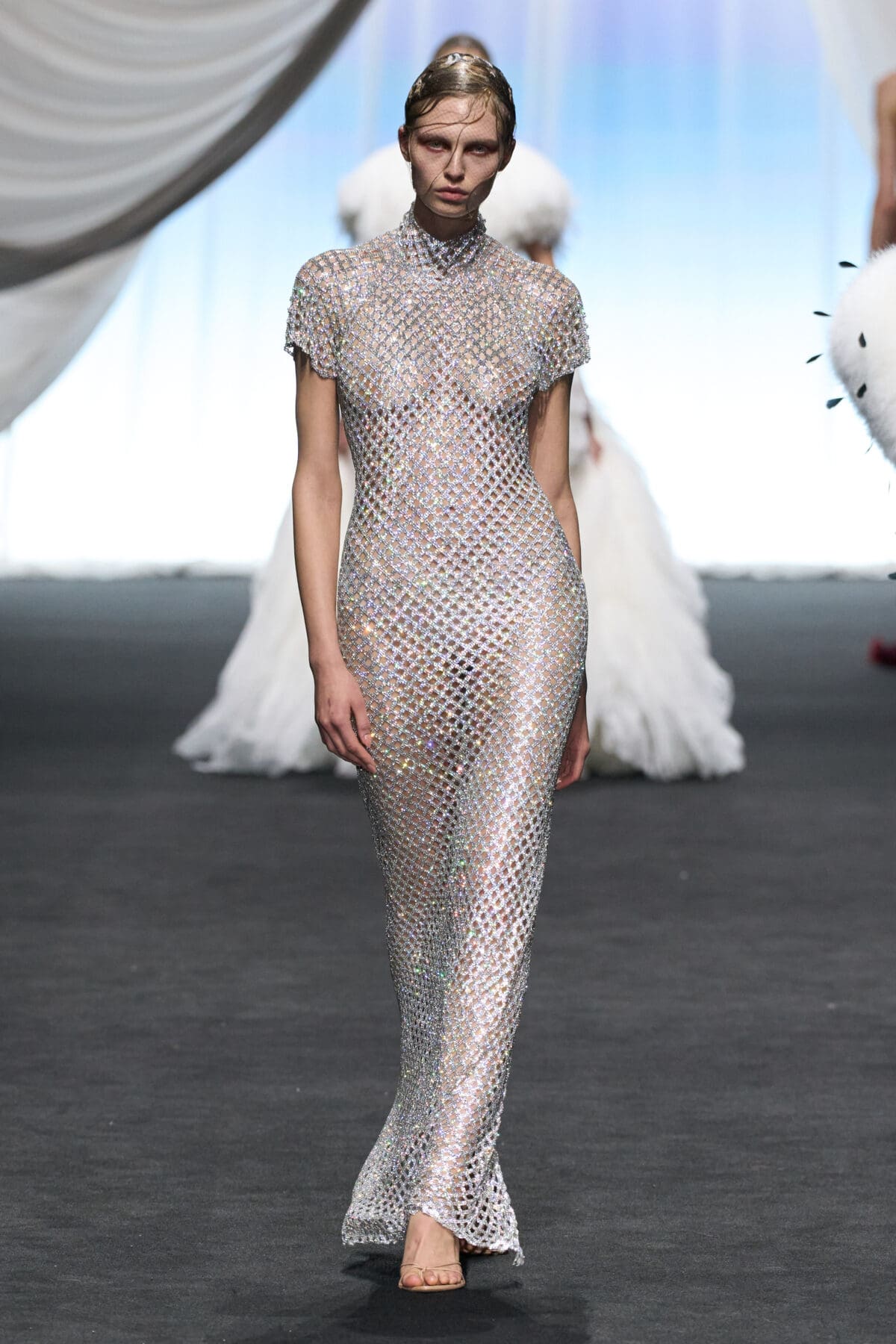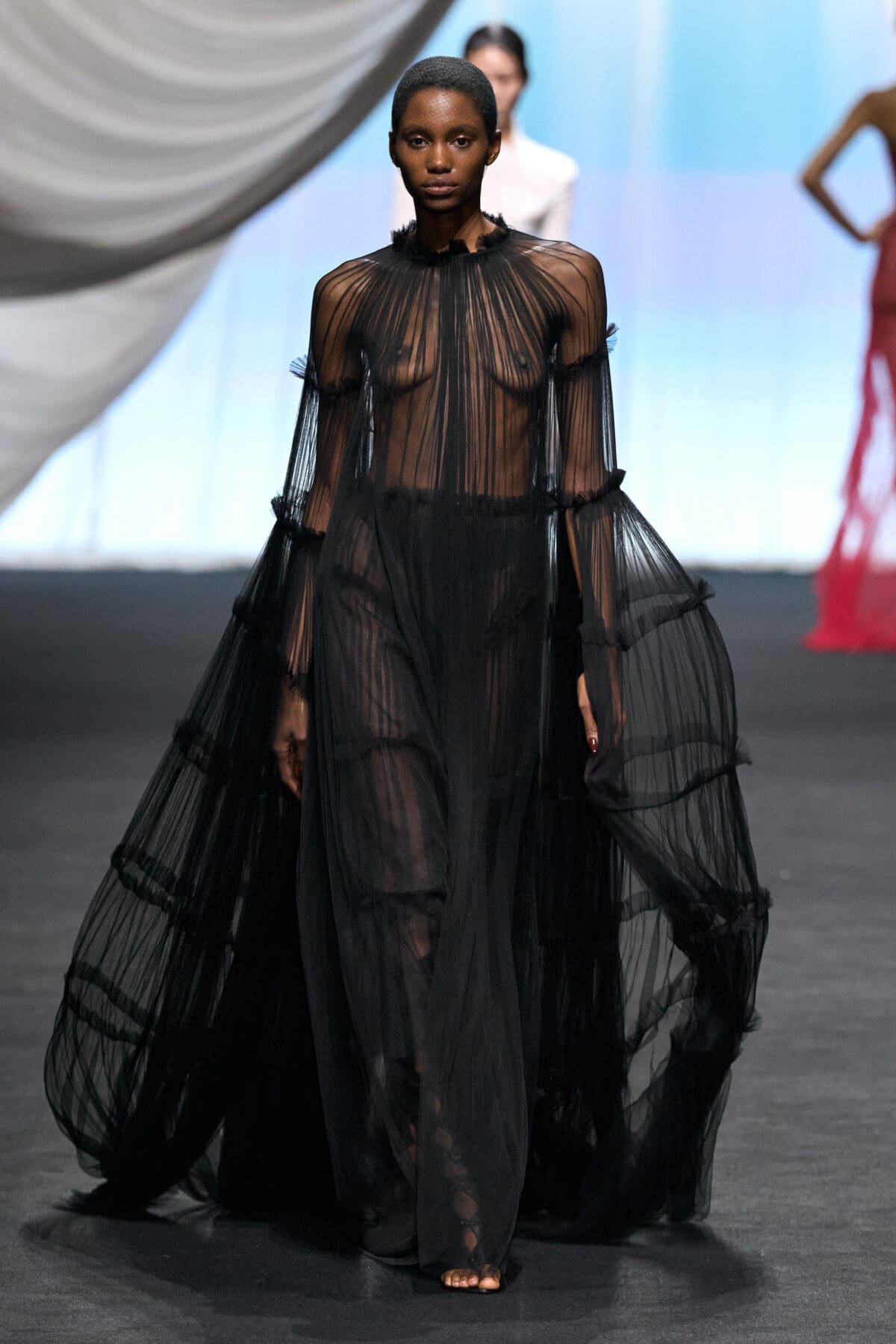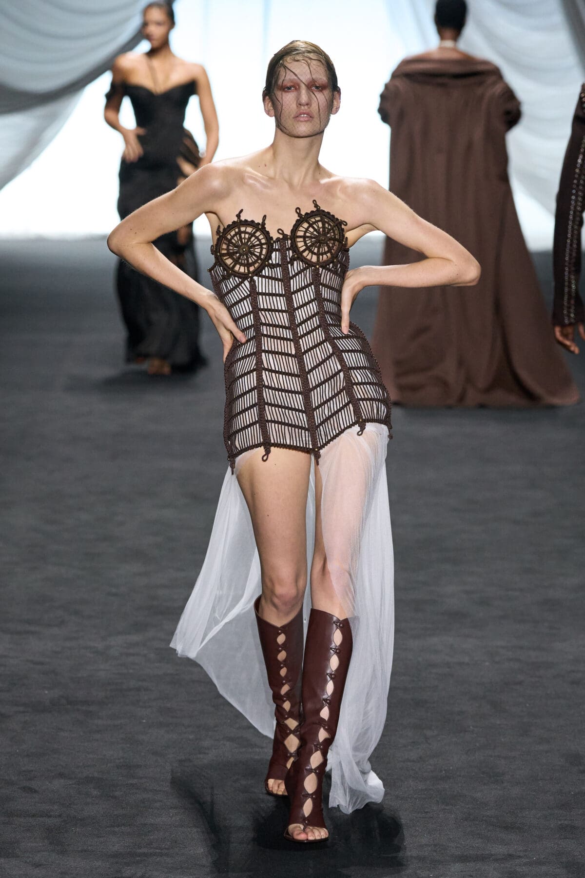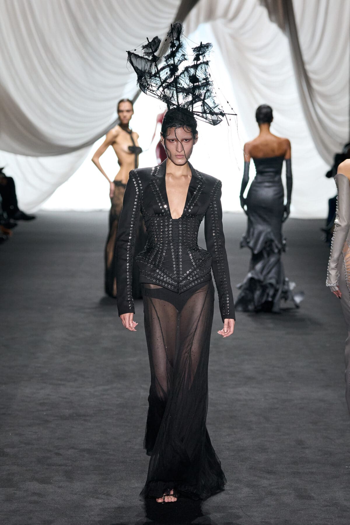 In the dimmed show space within the Gaultier HQ, where we initially waited and waited like in the olden days of Gaultier, de Saint Sernin delivered on all of this and more as the eighth—and youngest—designer invited into the ateliers for a single season. He dove straight in, starting with a theme, “Le Naufrage,” which translates as Shipwreck. (After Daniel Roseberry’s “Icarus” at Schiaparelli and Alessandro Michele’s “Vertigineux” or Dizzying at Valentino, designers this week have been courting risk with their titles, never mind their creations).