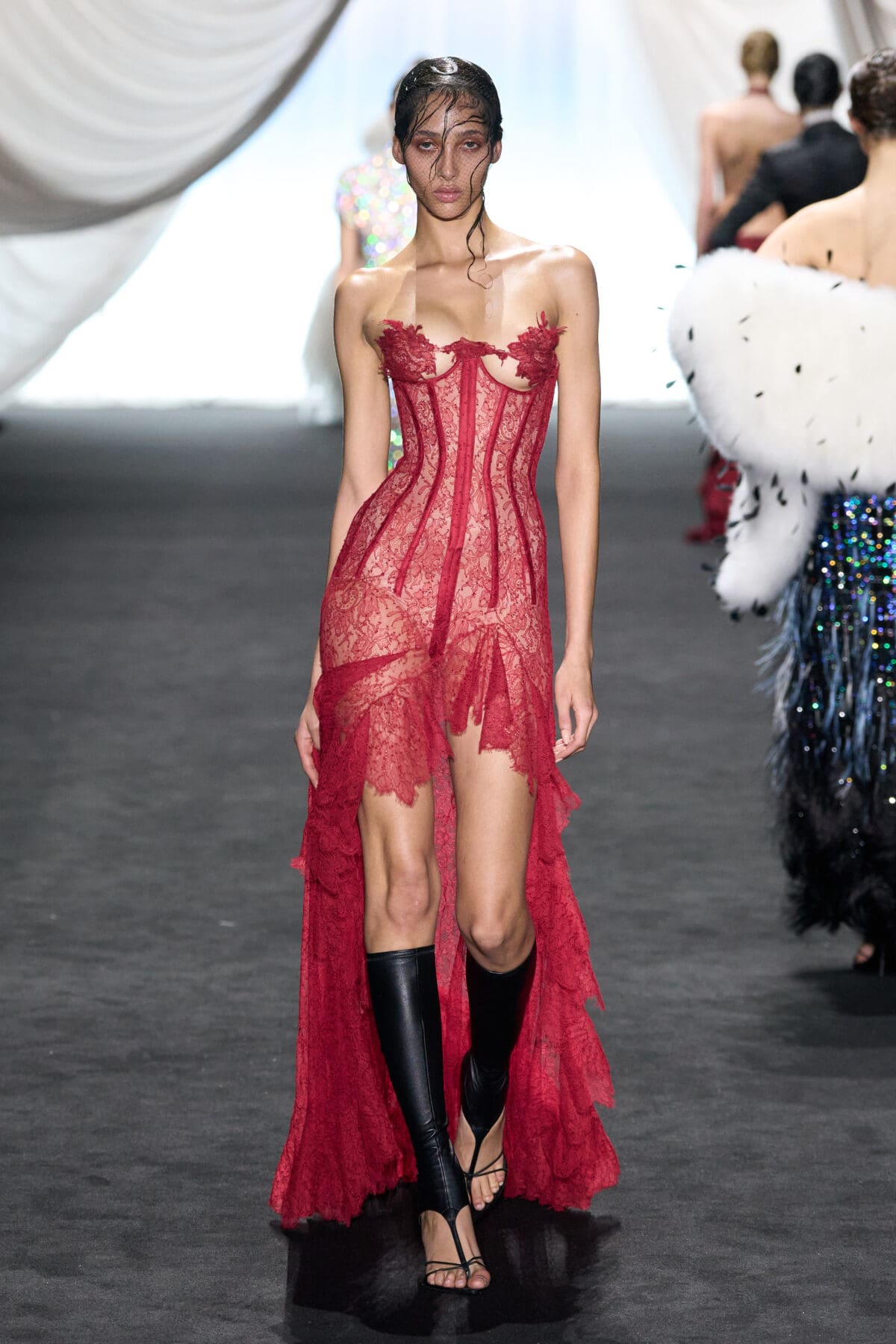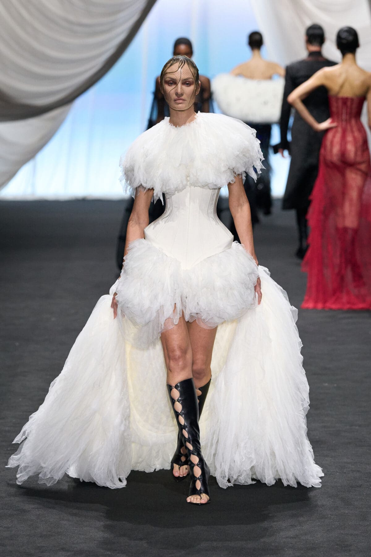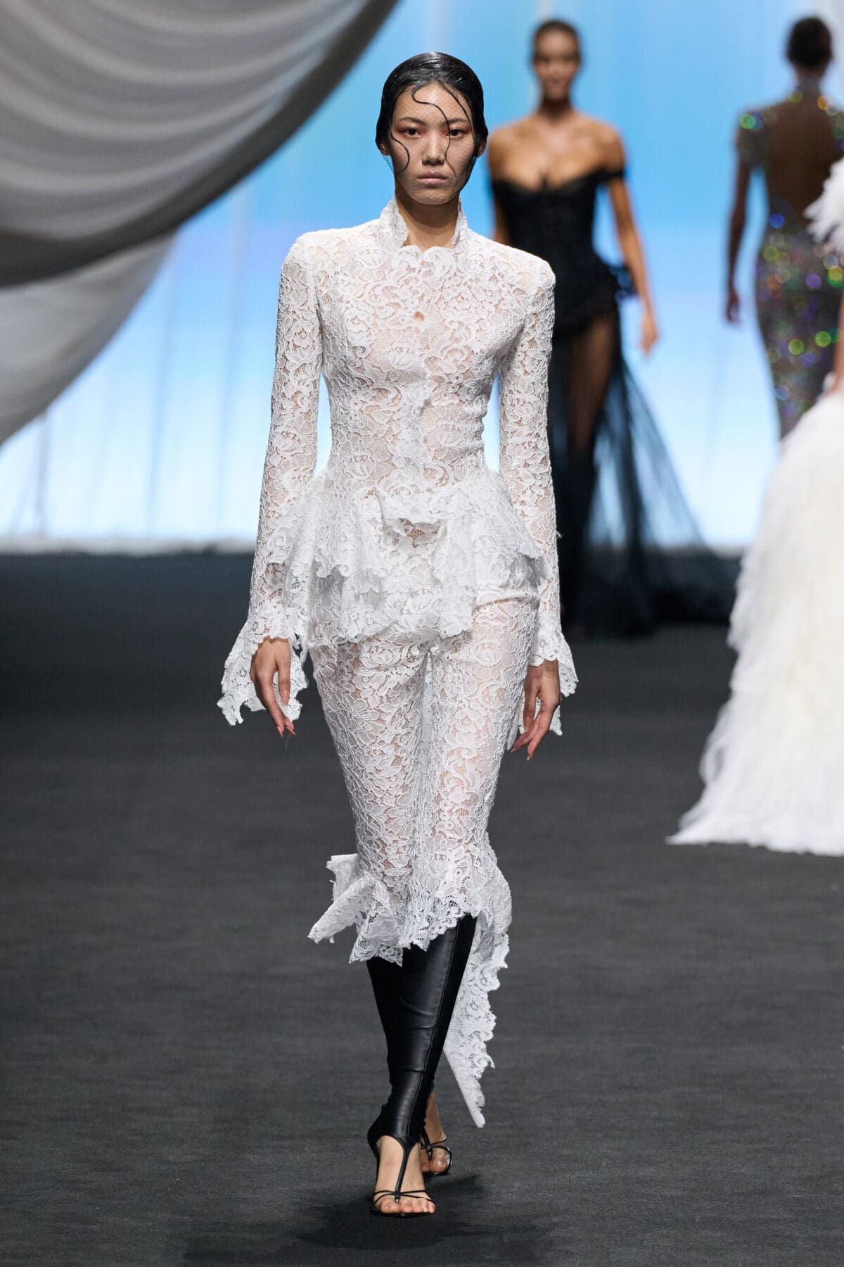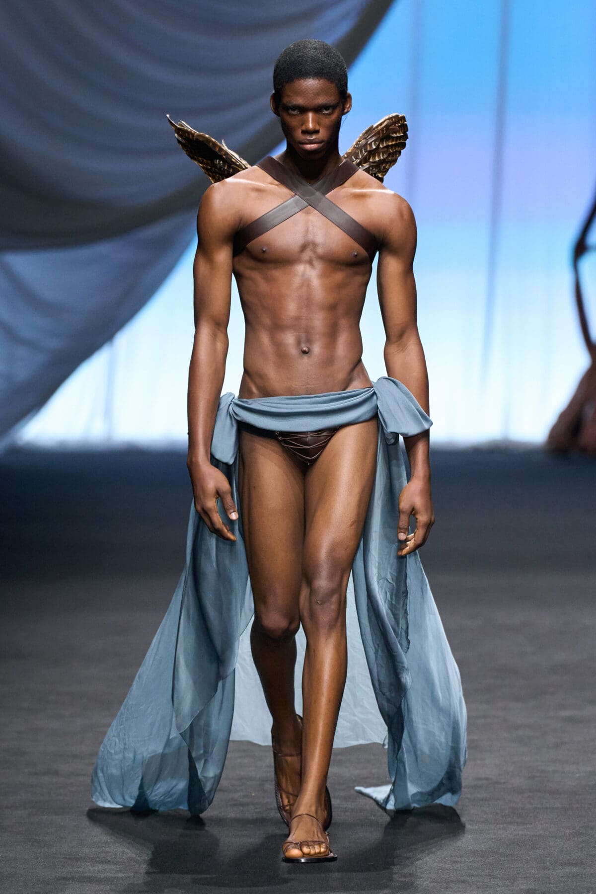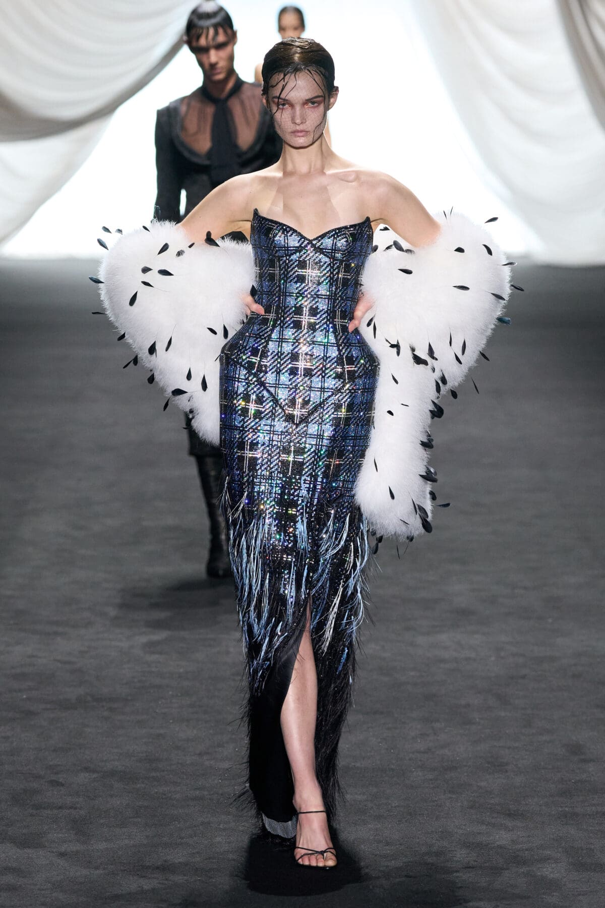 Starting with a pale seafoam, off-the-shoulder corset laced LdSS-style and a sequin-scaled skirt—let’s call her a mermaid provocateur—the suggestive line-up spanned mythological (Cupid wearing little more than a harness of pheasant feather wings and the designer’s leather briefs, his modesty draped with blue silk); figurative (a nearly-nude bodice defined by an anchor motif attached to a delicate lace skirt); and caricature (a ghostly bride and groom in revisited period dress elaborately embellished with feathers and beading). From a thirst-trap pirate to a woman seemingly draped in sails, these couture character studies attested to de Saint Sernin’s imagination (each beginning with a hand-drawn sketch) while also justifying a wide range of otherwise unrelated ideas.