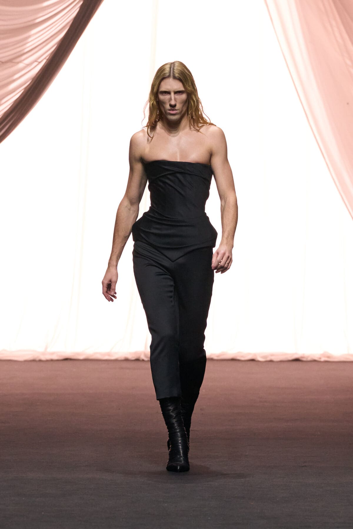 There is talk that LdSS might be the last in this experimental run of guest designers. If so, this show provided a lusty romp that closed with the 34-year-old designer appearing in an angular corset and britches. It wasn’t the Gaultier run down the catwalk, but that snatched waist felt true to them both.