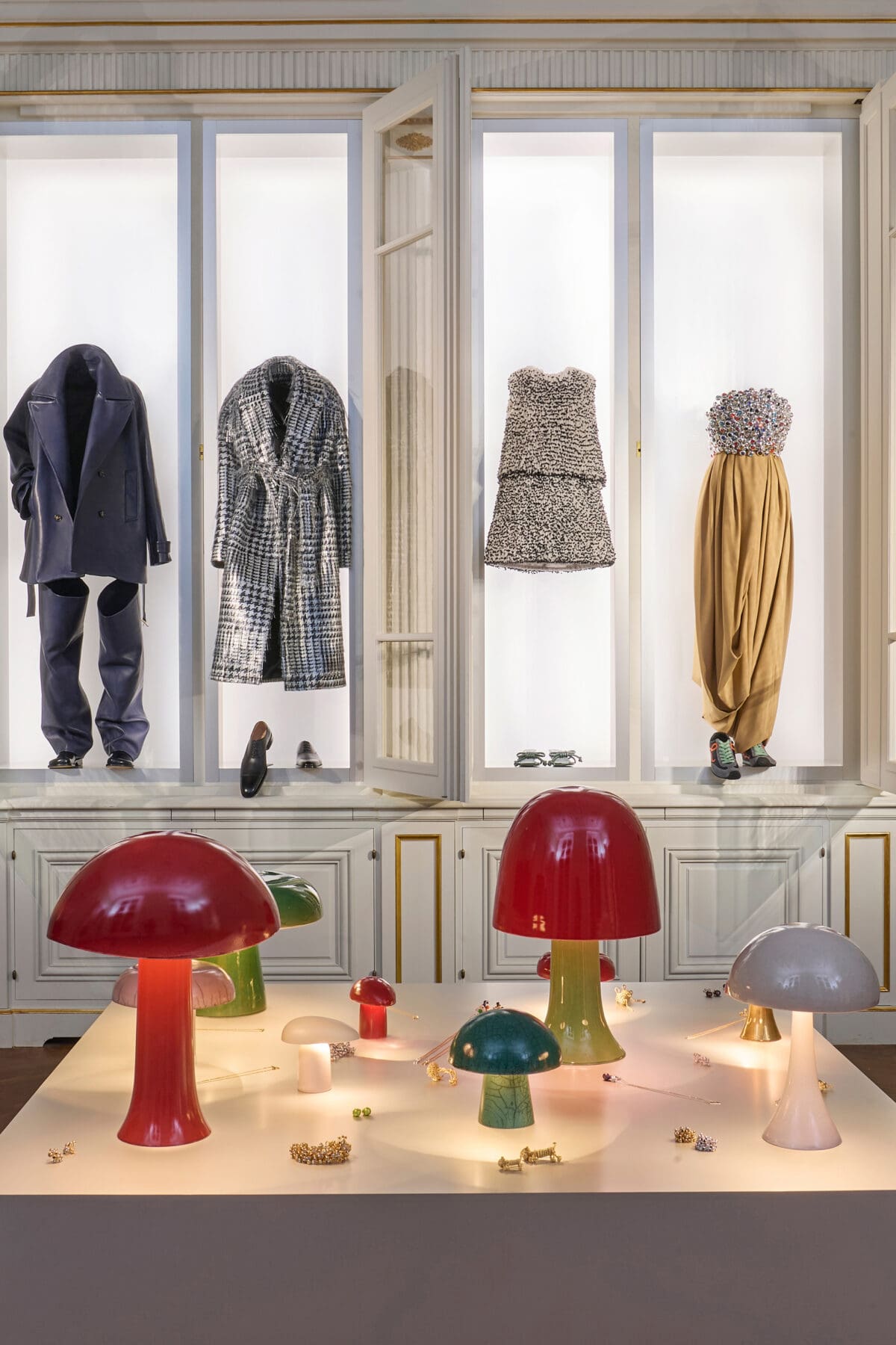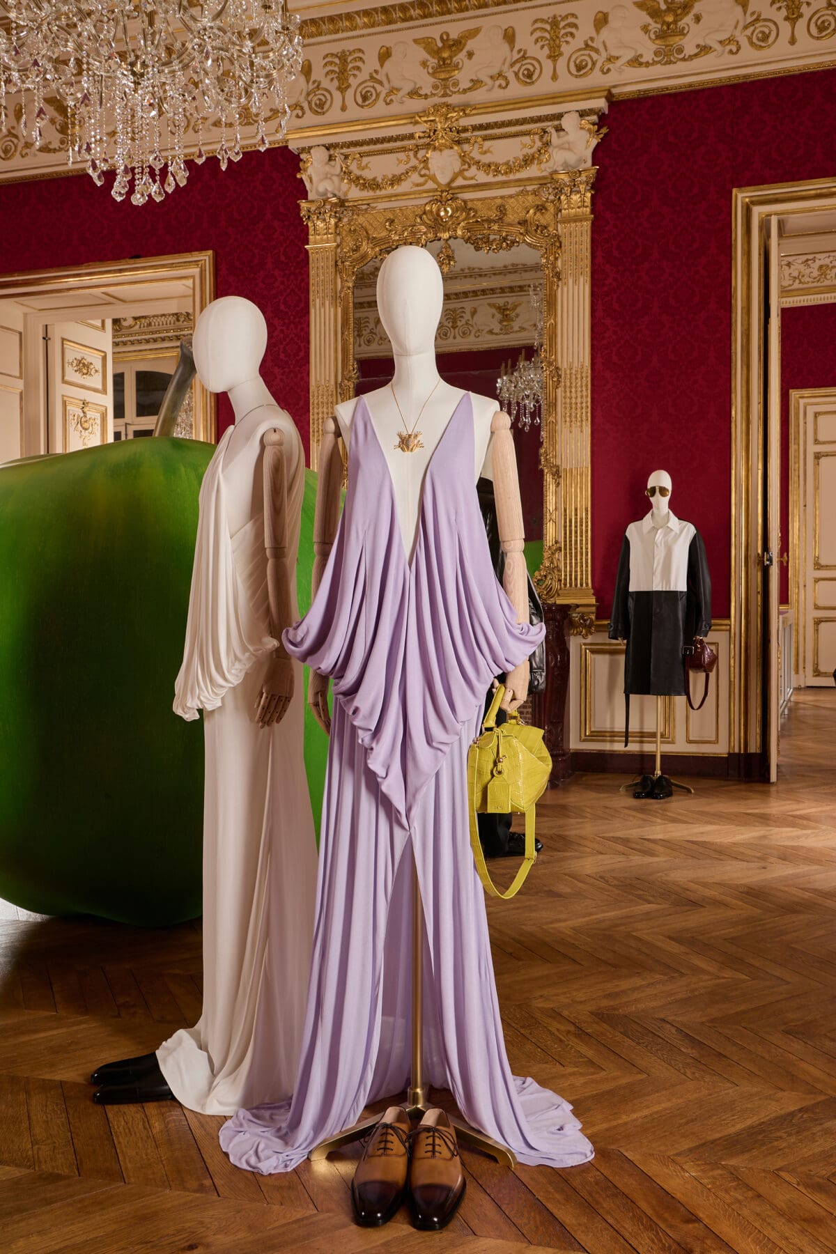 As you walked in, cartoon-y characters blown up from Loewe trinkets were sliding down the banisters, while a giant leather pumpkin by Anthea Hamilton (who collaborated with Anderson in 2022) squatted in the foyer. On the womenswear floor, clusters of mannequins displayed the latest suspended, draped evening dresses, paired with ridiculously elongated men’s leather dress shoes. A wunderkammer of footwear held a delightful pair of crystallized jelly shoes, the commonplace but affectionately remembered sandals every British child wore to the beach once upon a time. Gold-wire pendants in the dinky shapes of a bee and perhaps a donkey were glimpsed in cabinets.