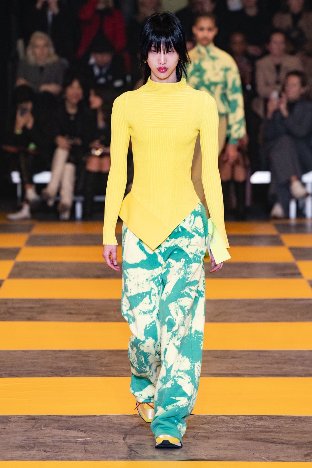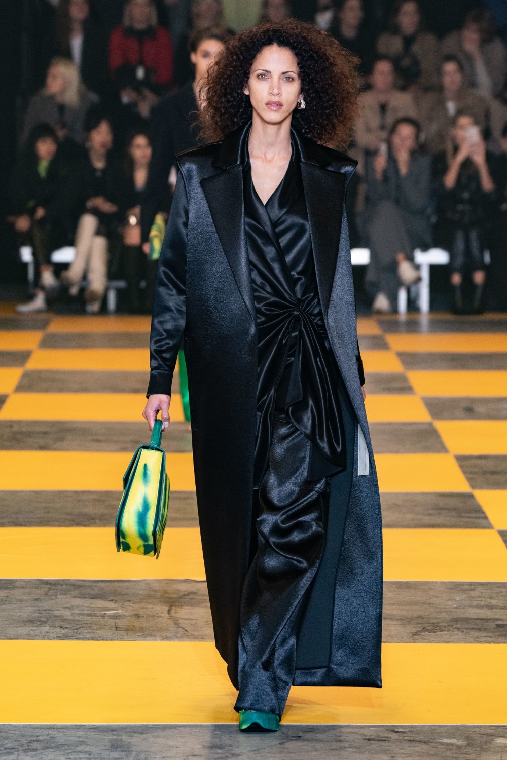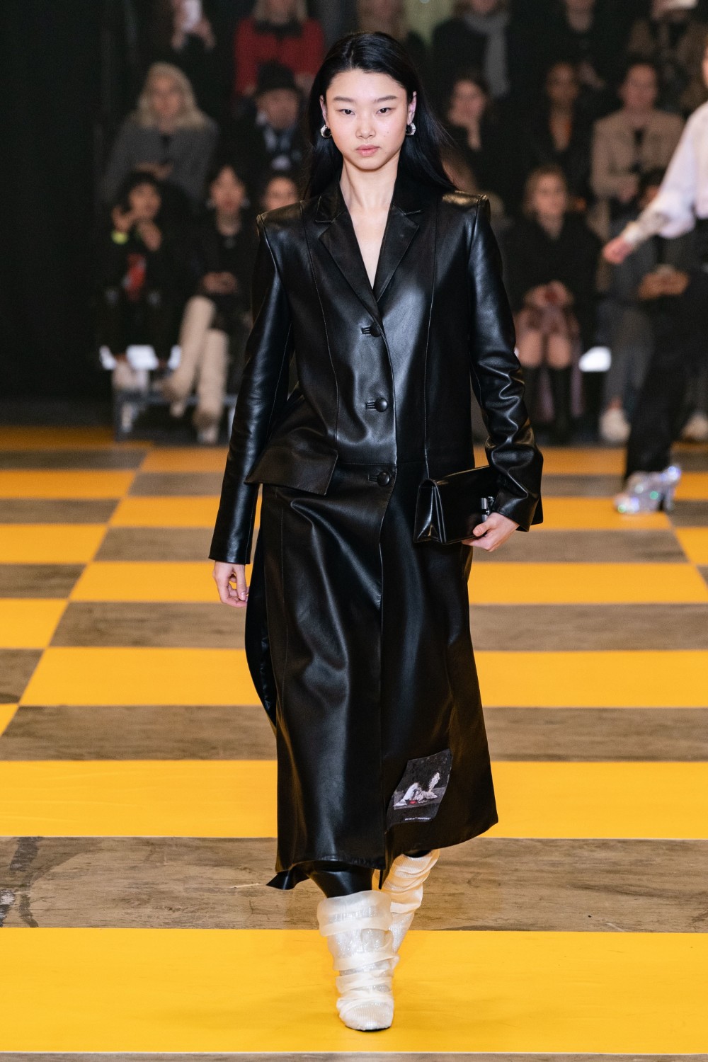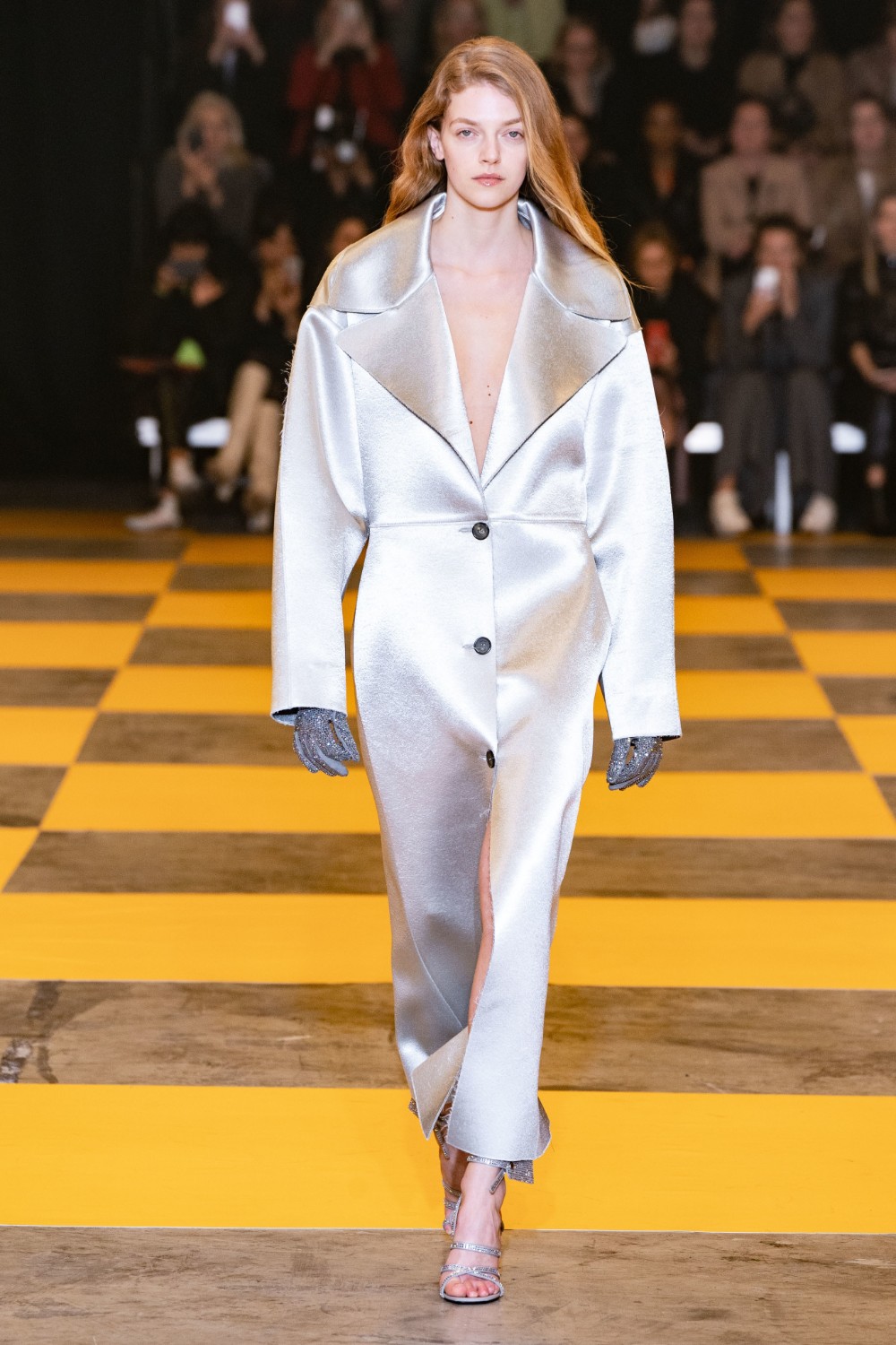 For a brand founded on its utility belts and audacious stripe logo, Off-White’s movement into suiting is more of an entrance than a return. The show opened with a strong sequence of tailoring: a sleek ankle-grazing silver satin coat, a quilted shearling number, and then a brilliantly-cut black leather suit. Off-White’s usually-potent branding was delivered in small doses, keeping the emphasis on the silhouettes, and the fabrics native to the brand — jersey and fleece — were draped, wrapped and cut into more feminine, couture-like shapes.